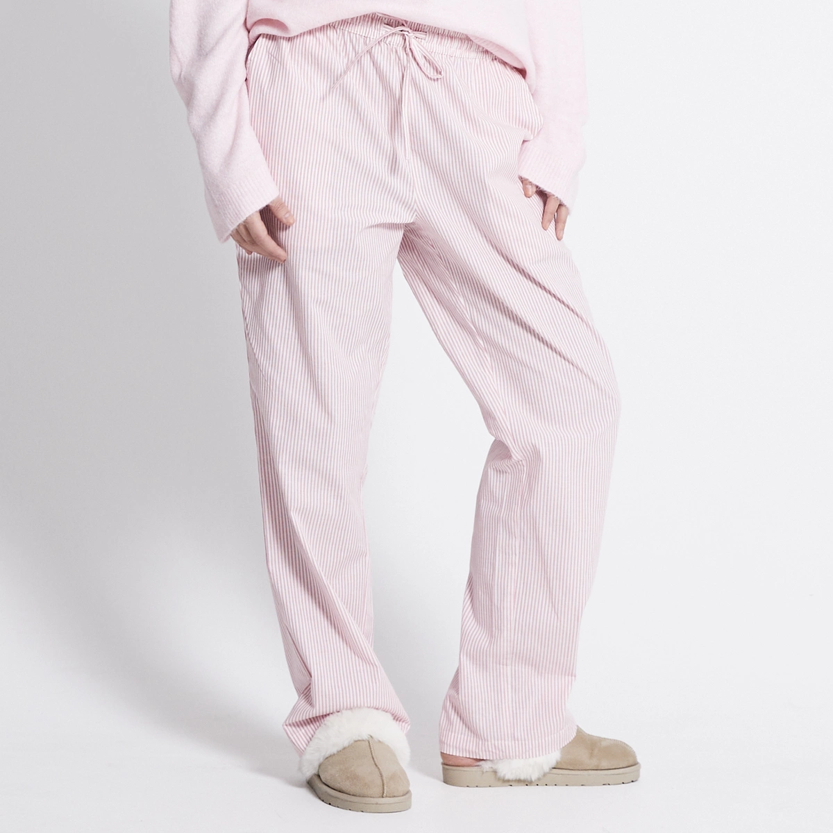 Spodnie o luźnym kroju z bawełnianej popeliny. Elastyczna talia ze sznurkiem. Ukośne kieszenie. Biało - różowe paski.