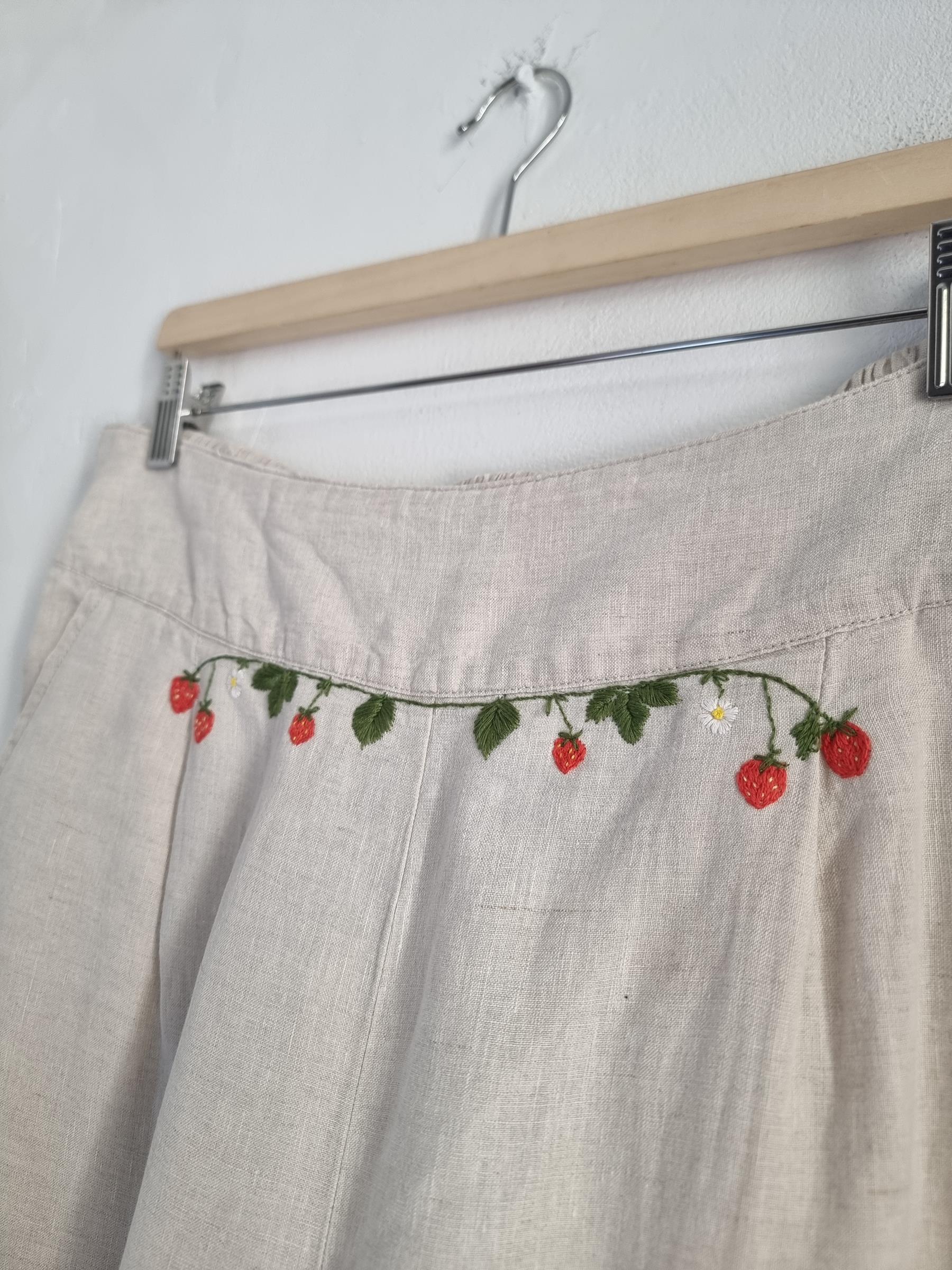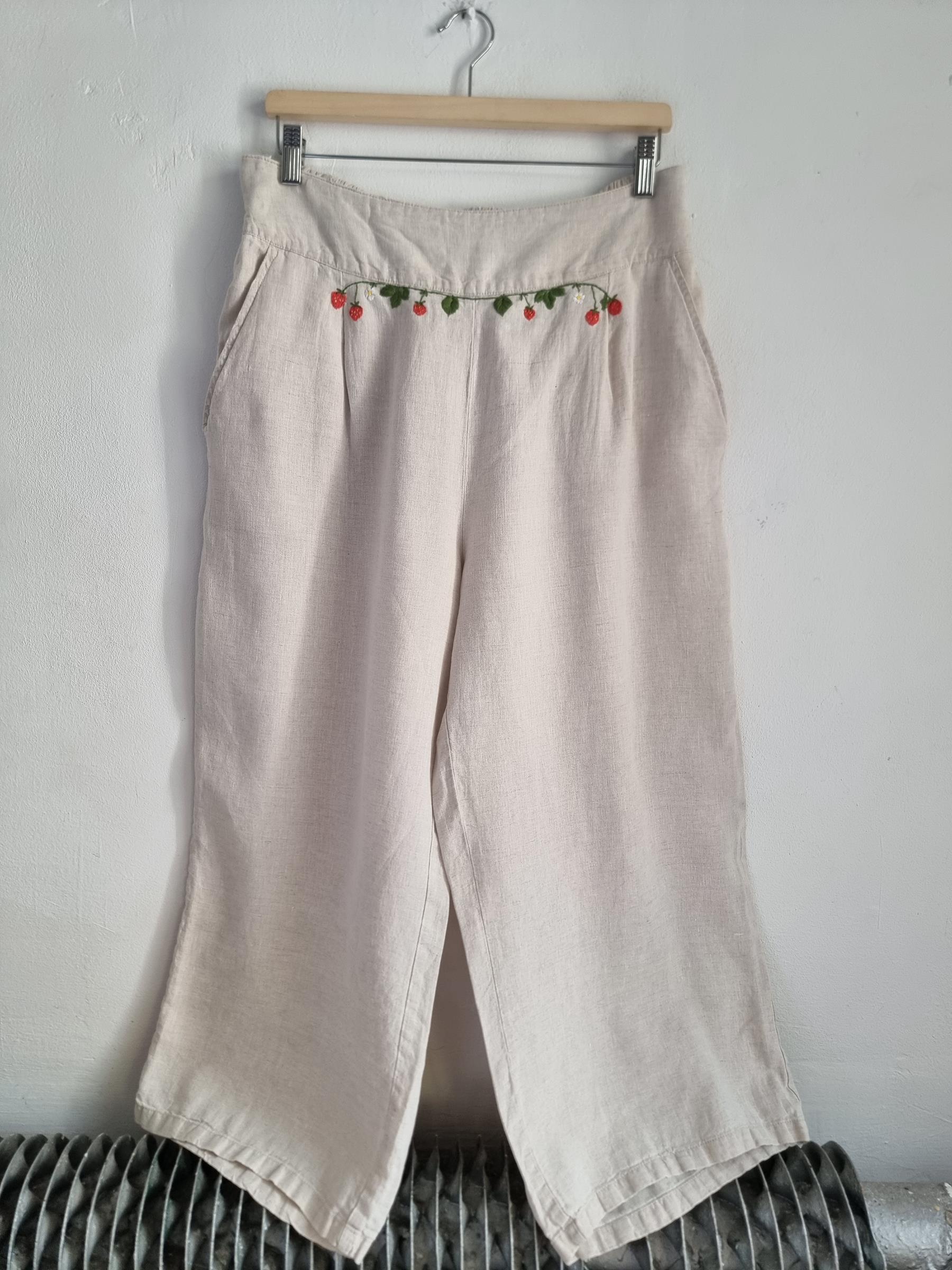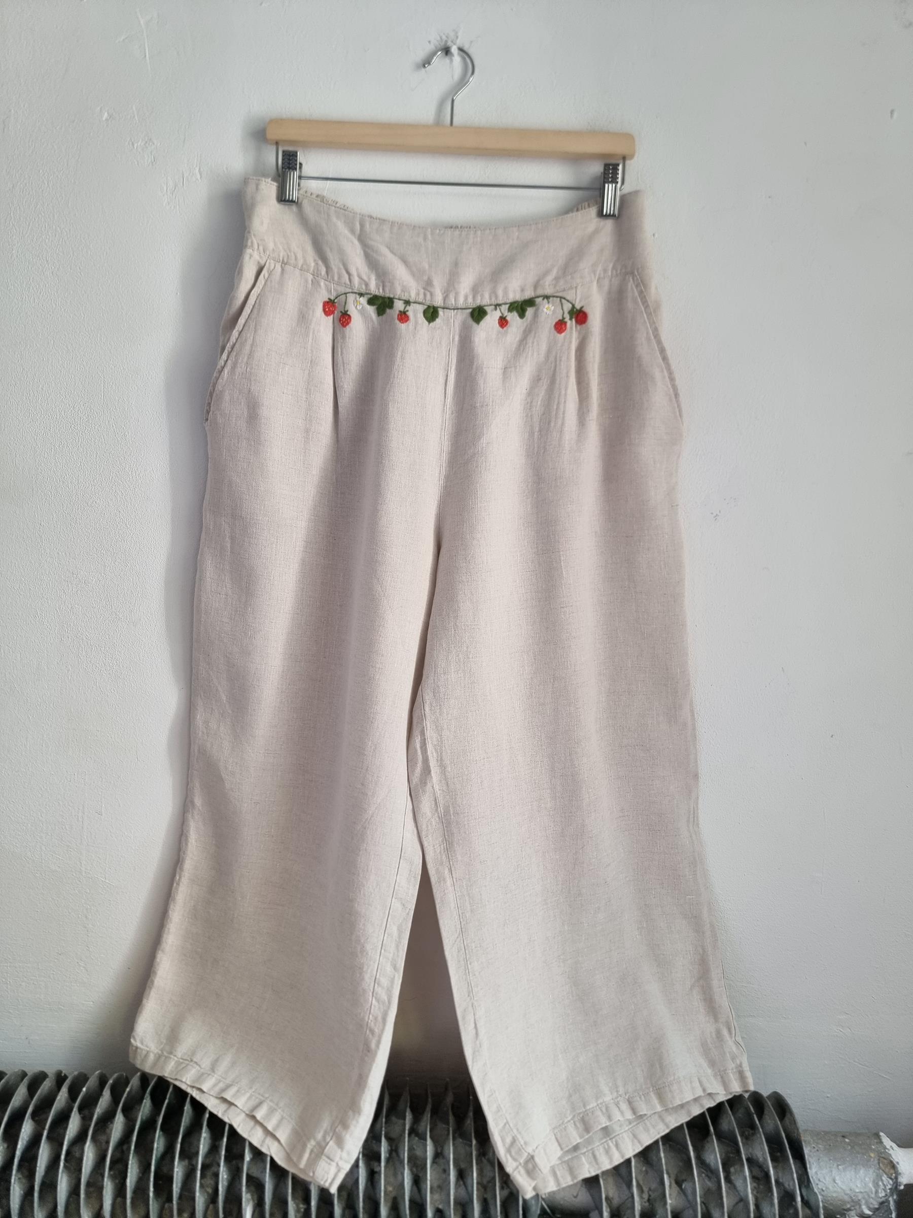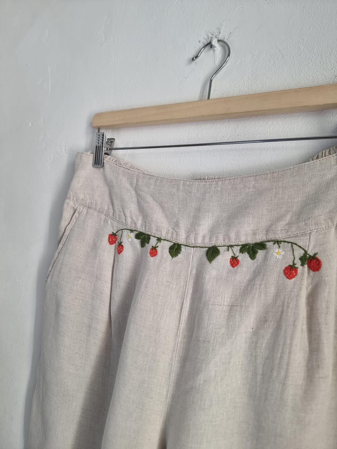 ALMA lniane spodnie hafty truskawki XL 42 beżowe len haft