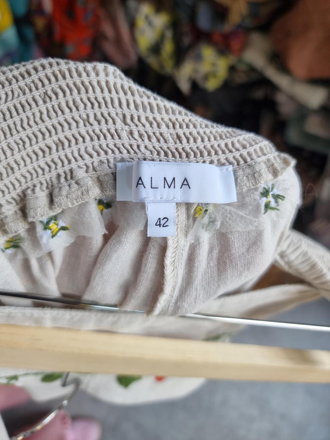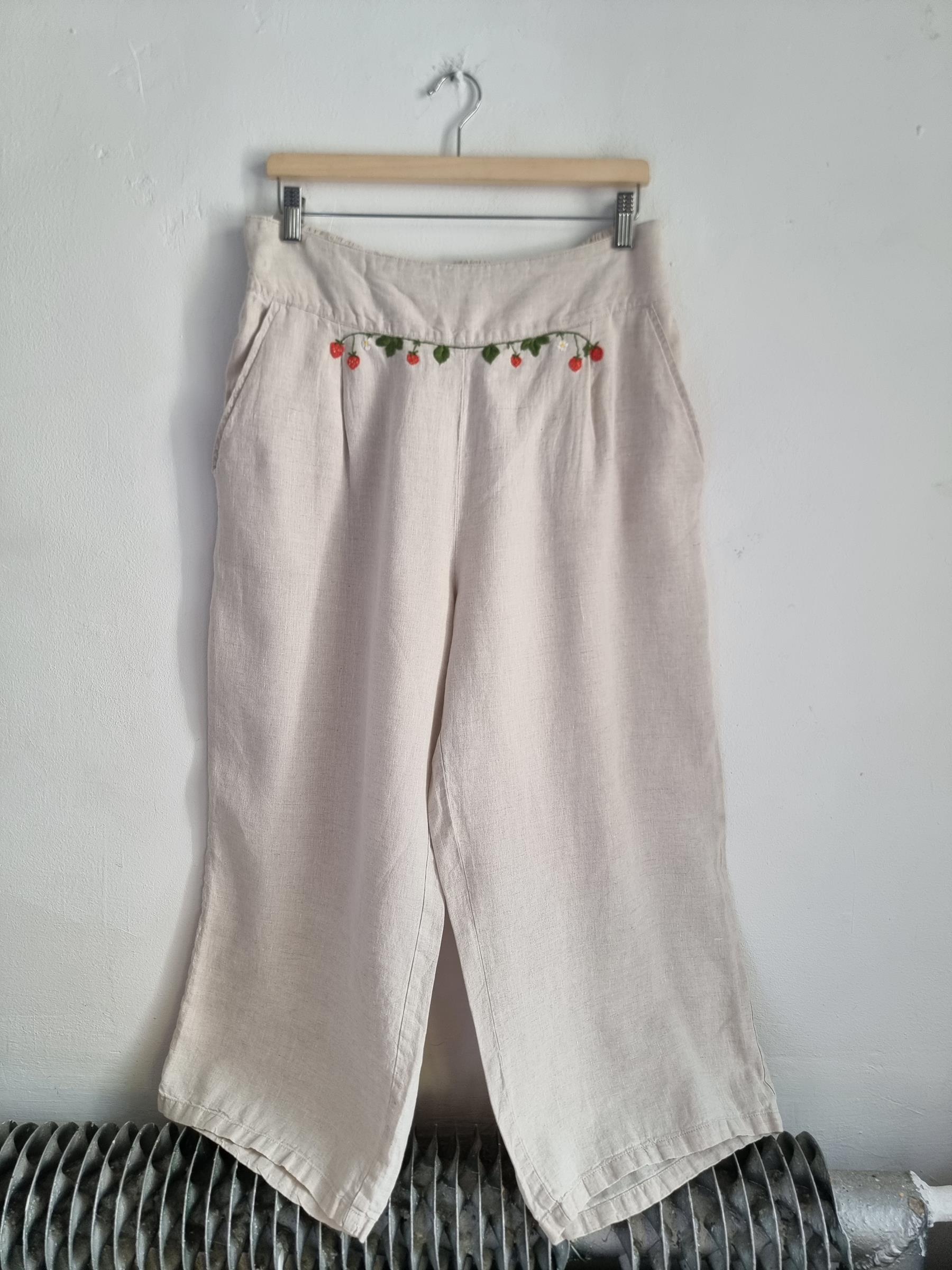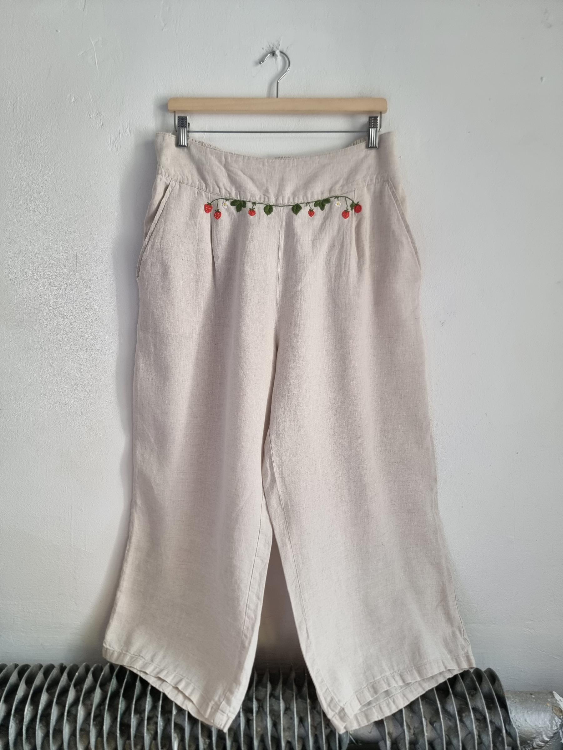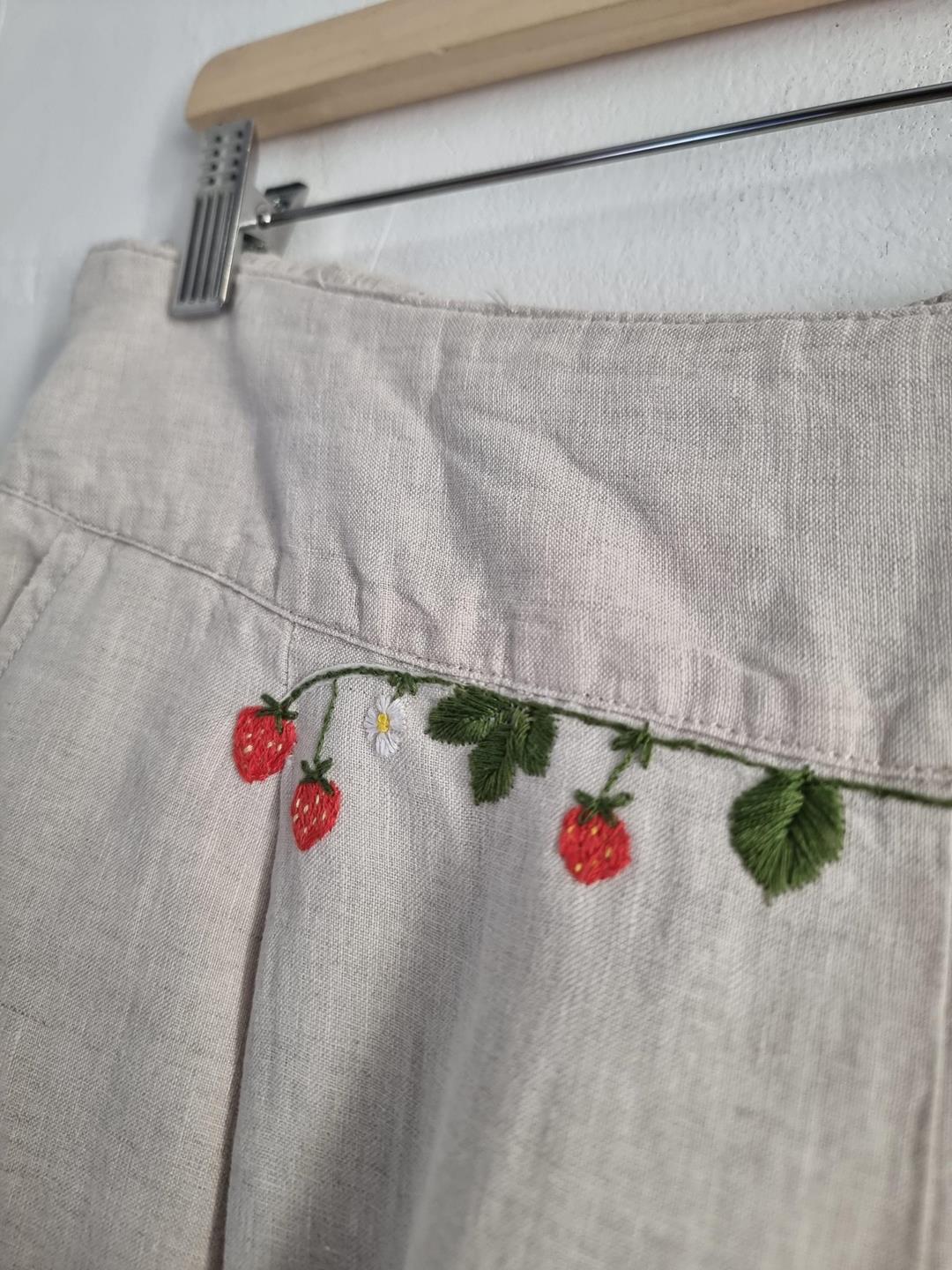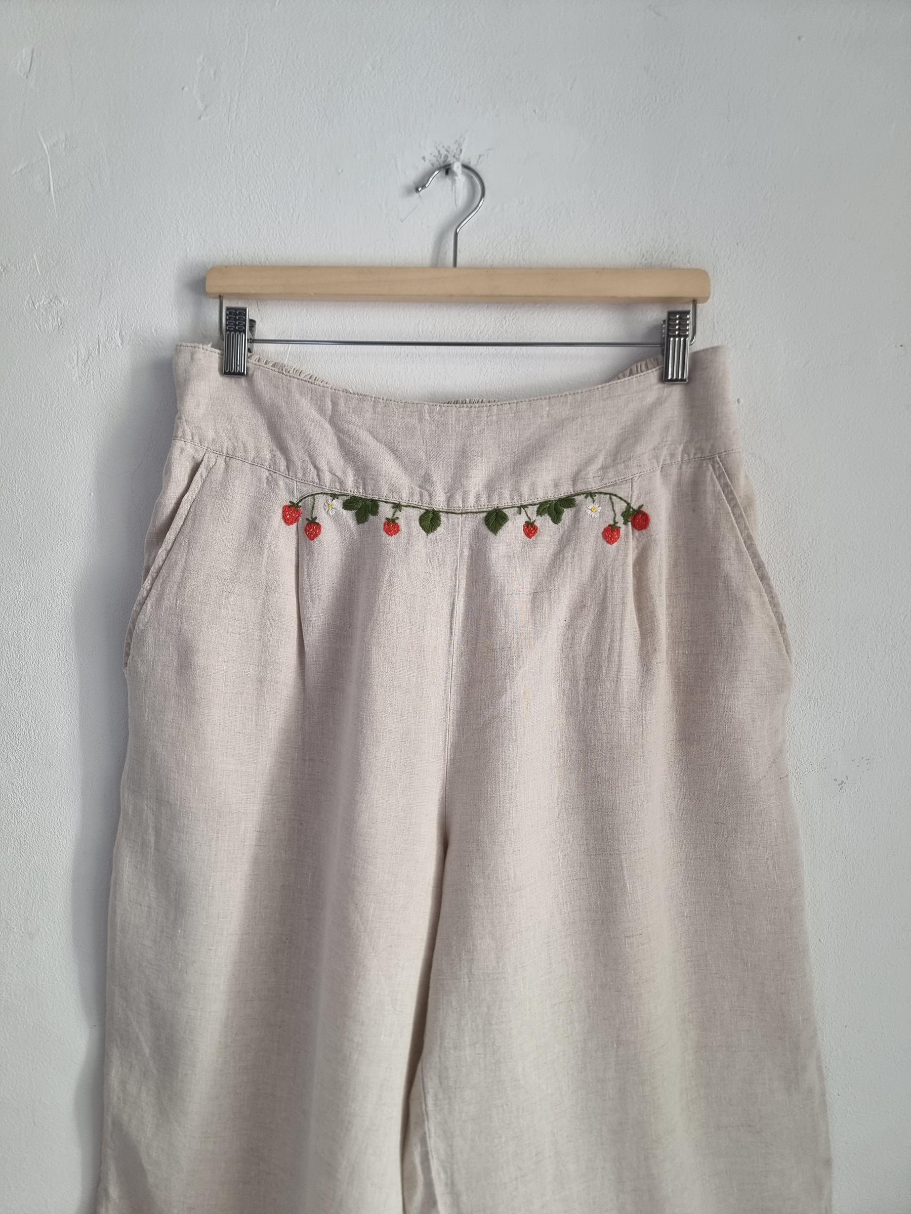 ALMA lniane spodnie hafty truskawki XL 42 beżowe len haft