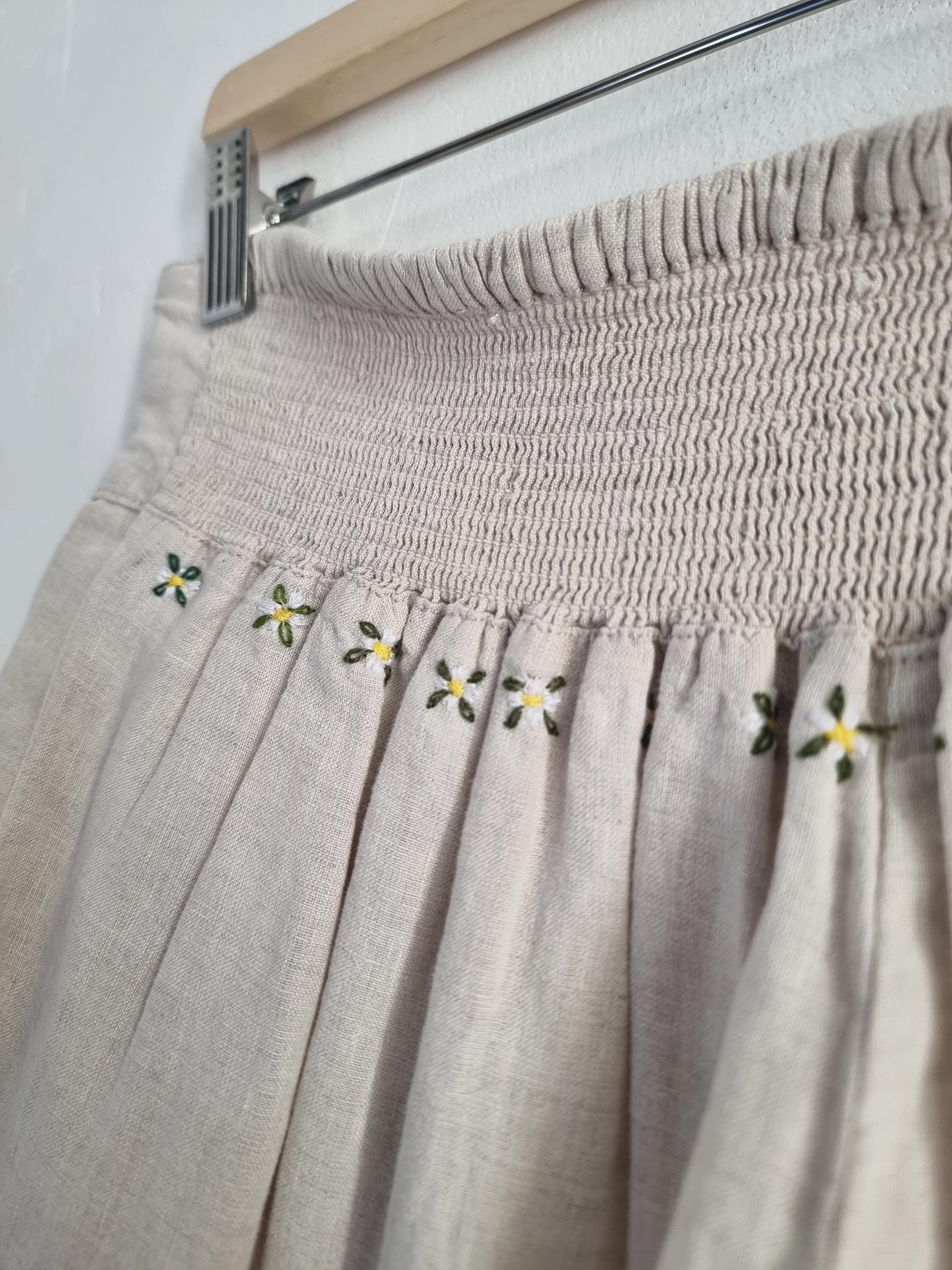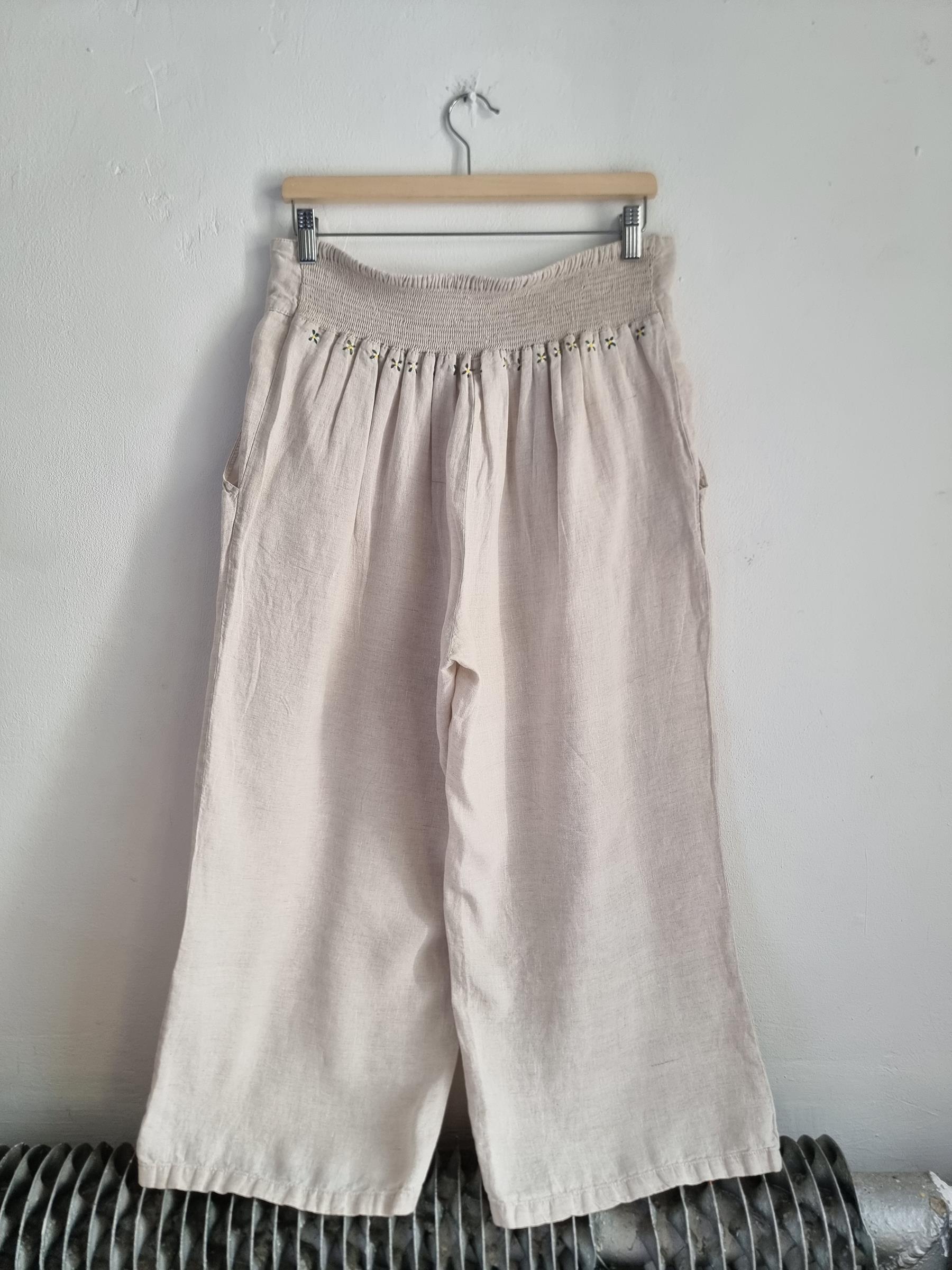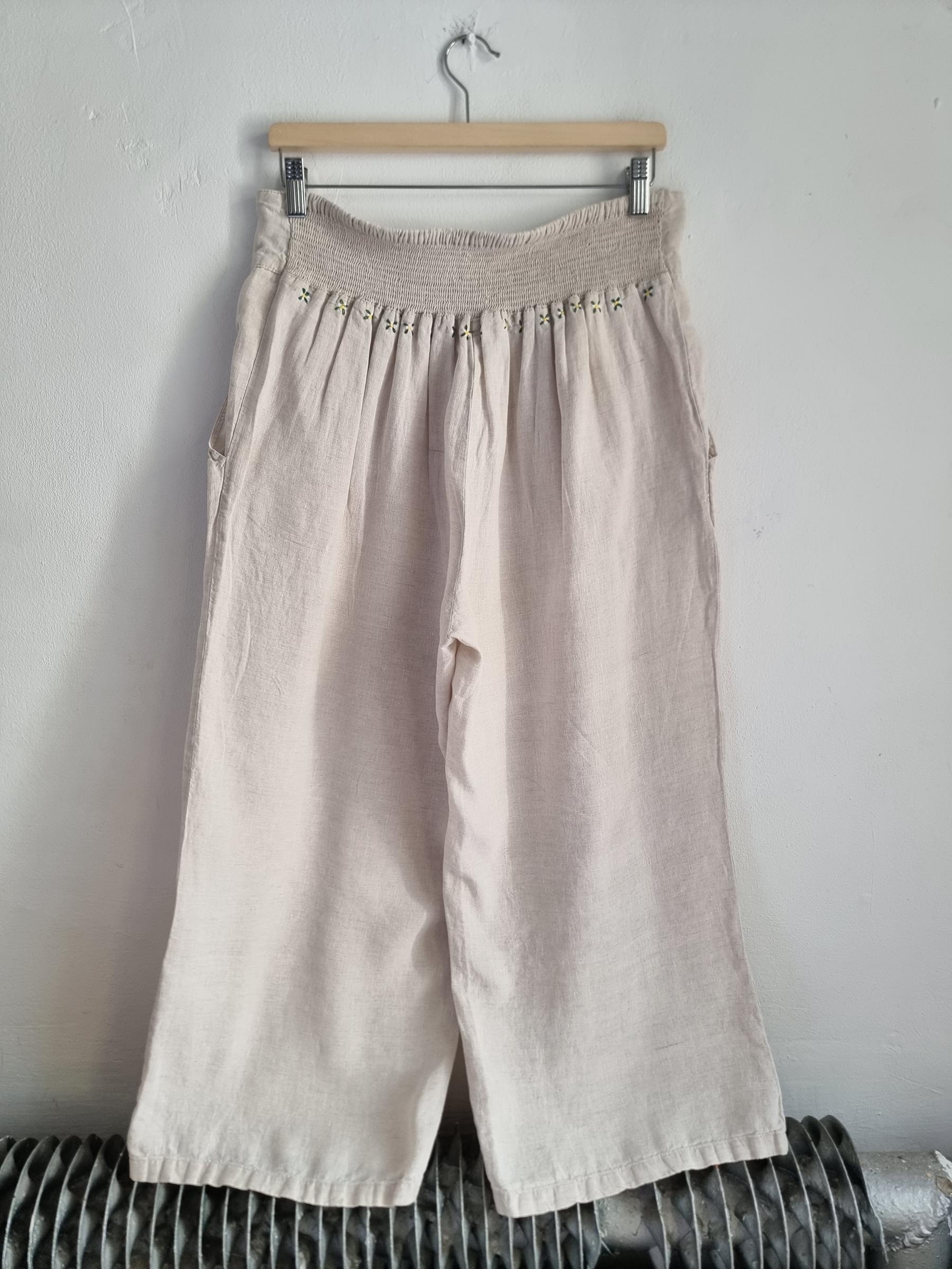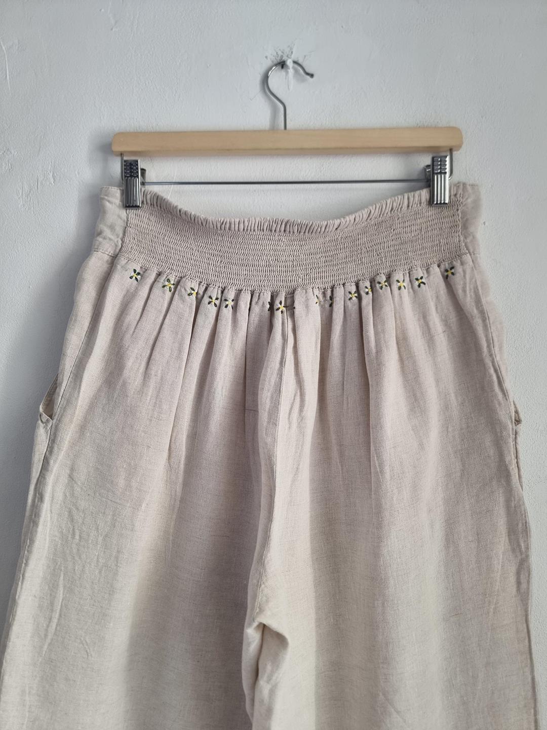 Beżowe lniane spodnie o długości 5/6. Na gumce z haftami w górnej części spodni z przodu motyw truskawek z tyłu kwiatuszki.