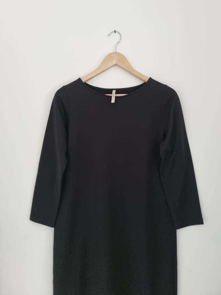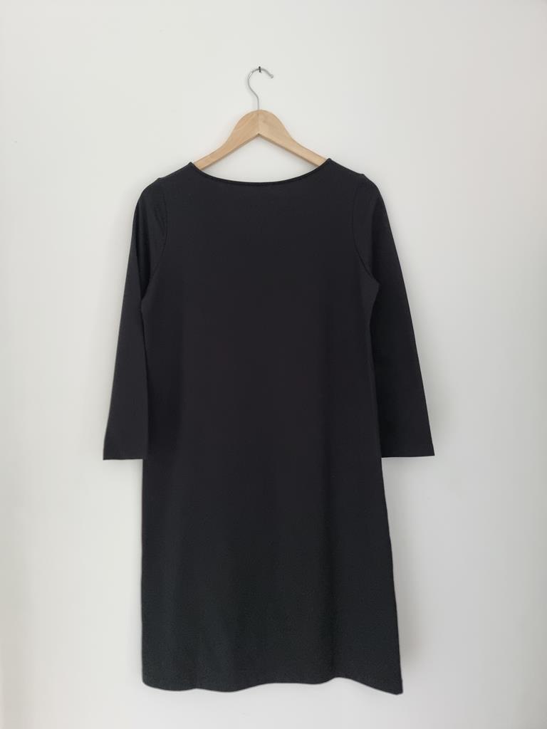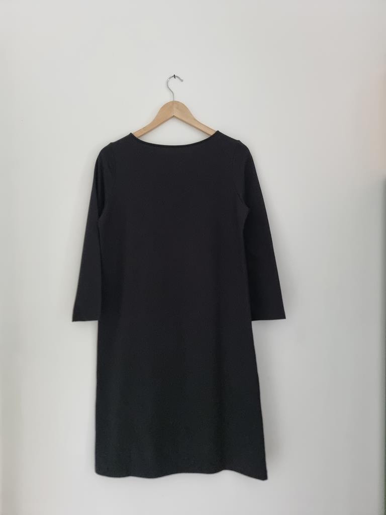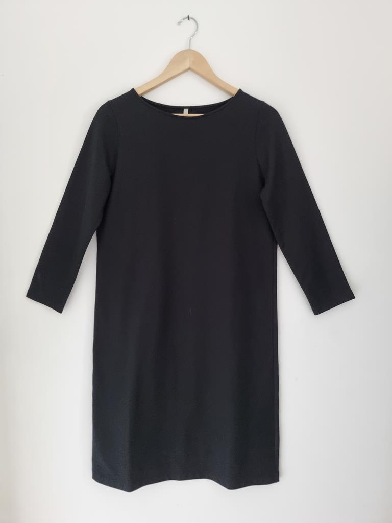 Czarna bawełniana prosta sukienka z długim rękawem. Dekolt łódka.