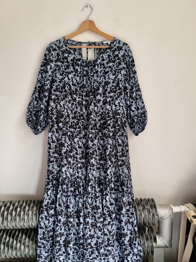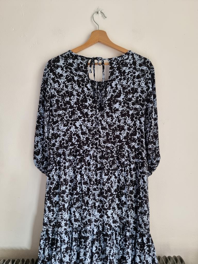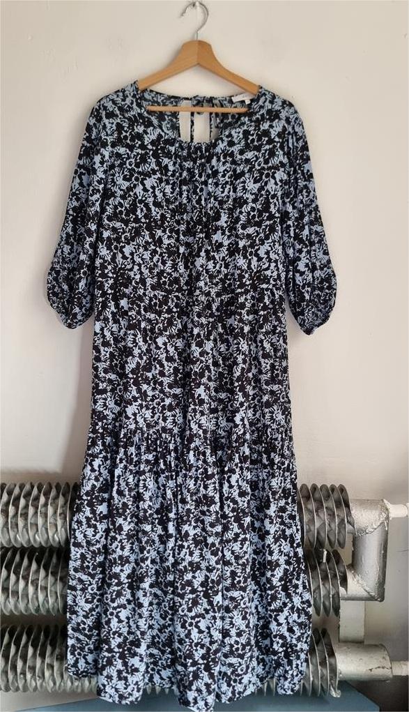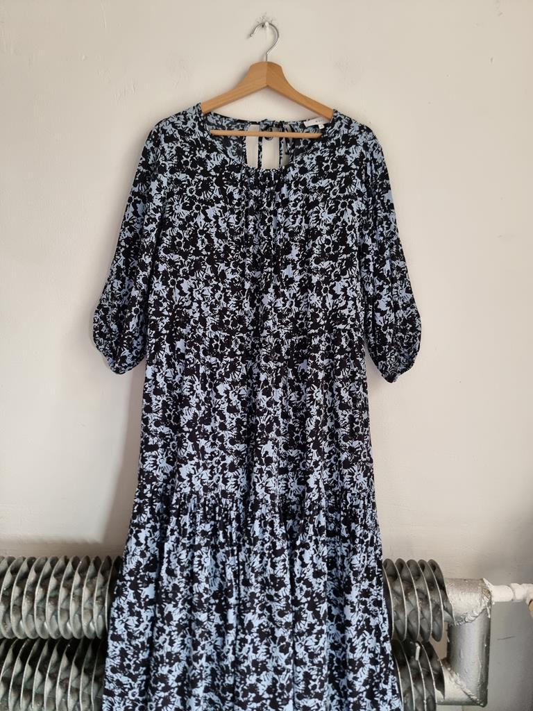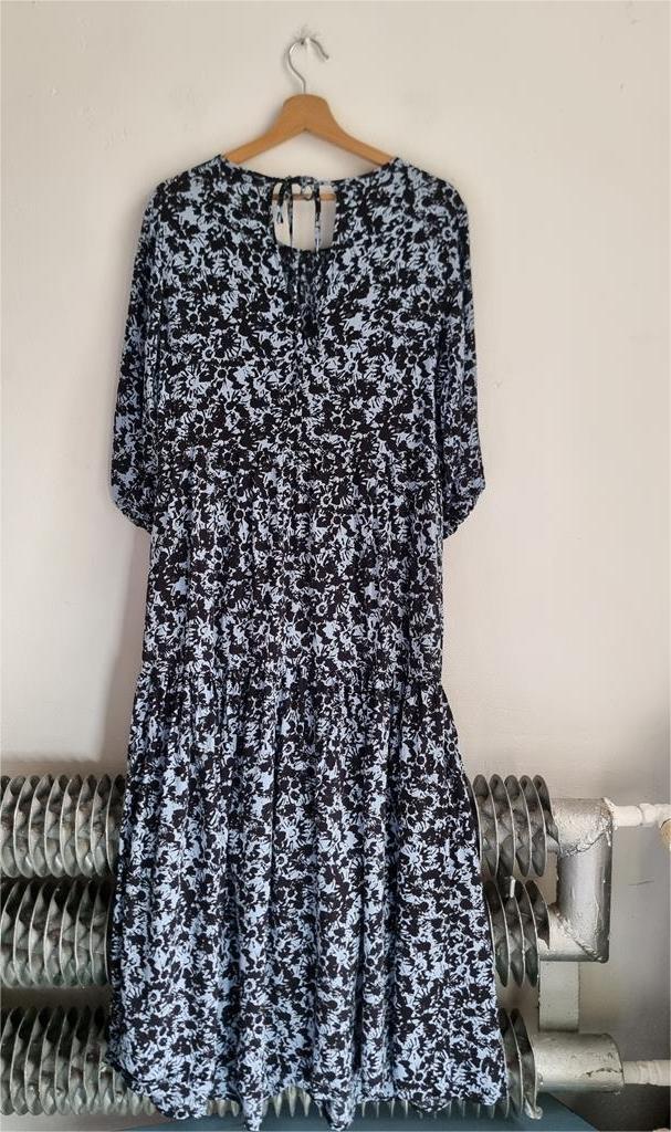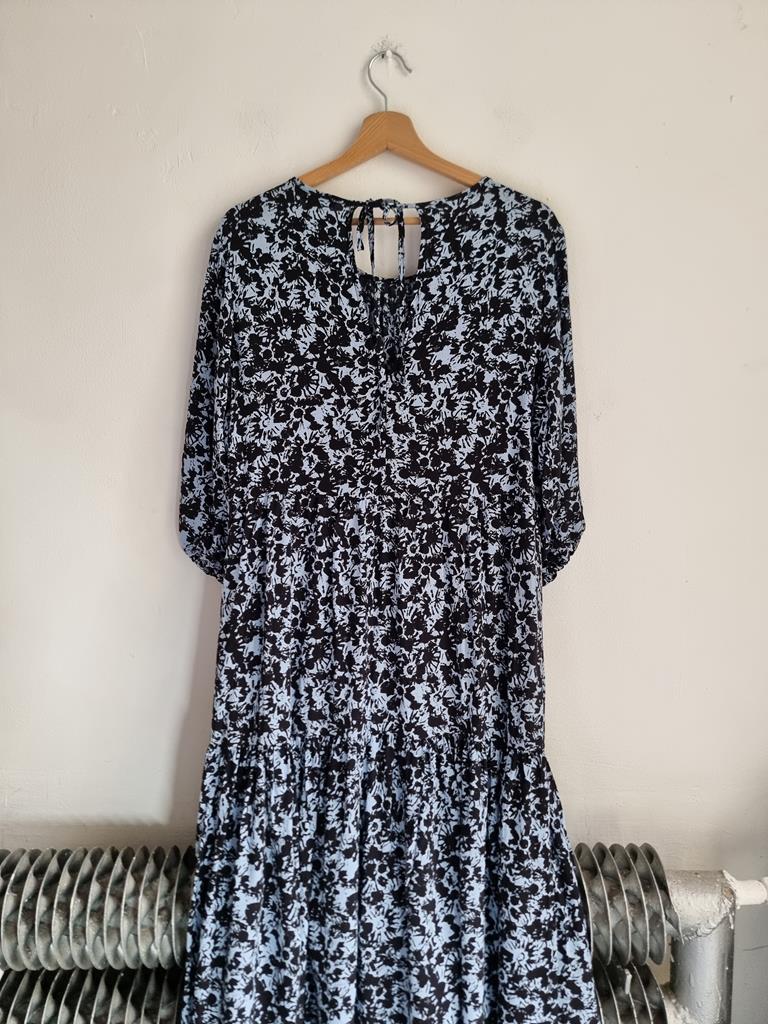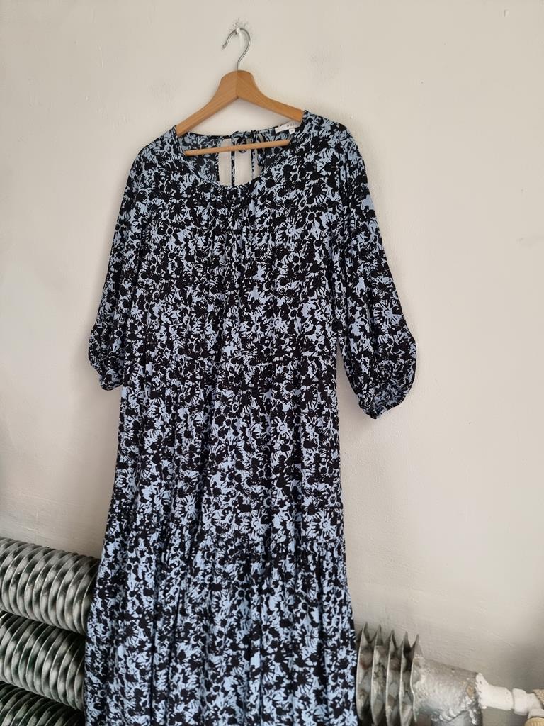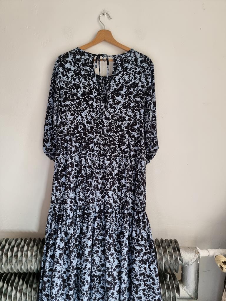 Długa wiskozowa sukienka o luźnym kroju z wiązaniem z tyłu. Odcienie niebieskiego i czerni.