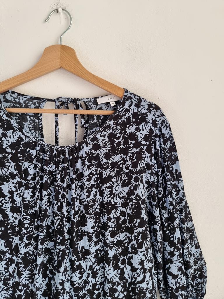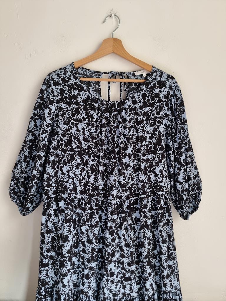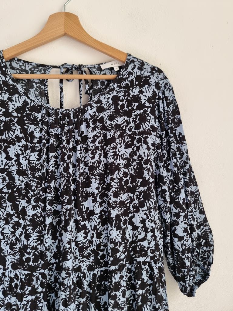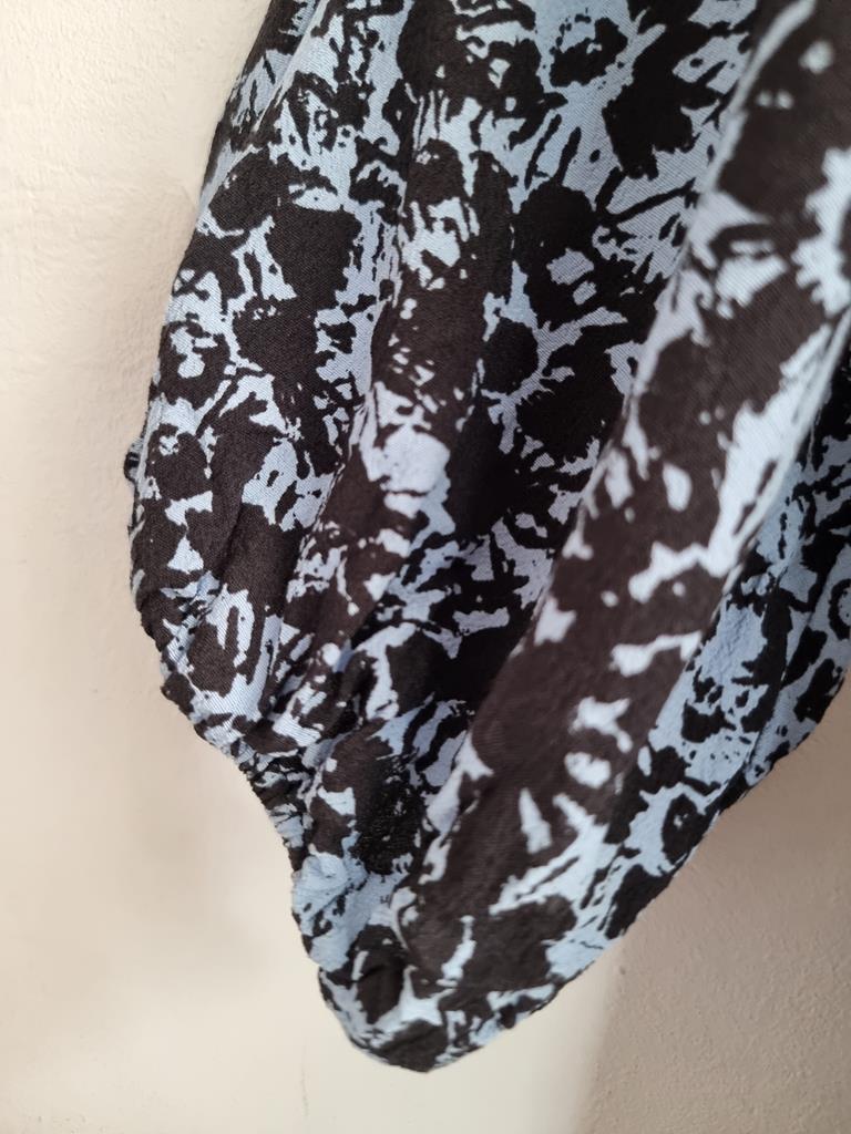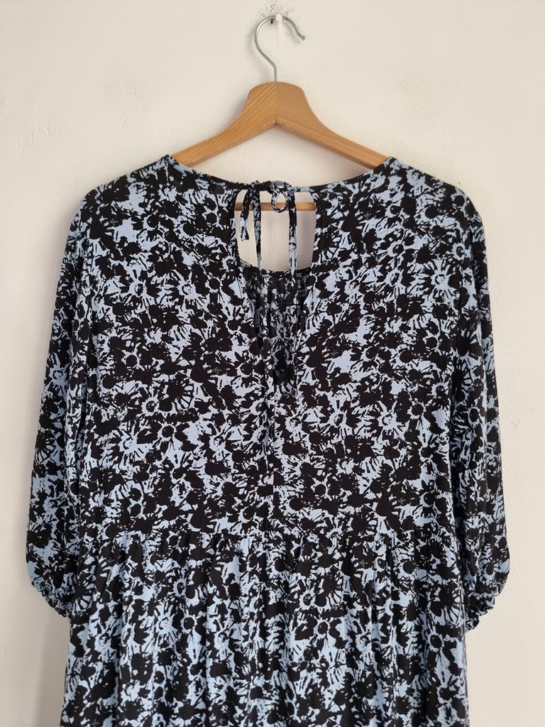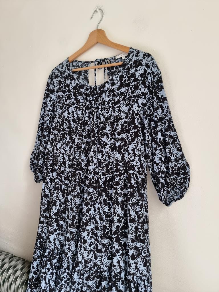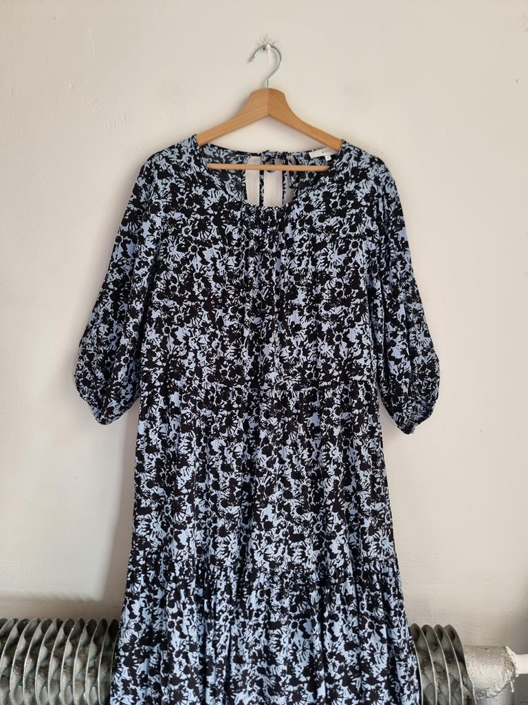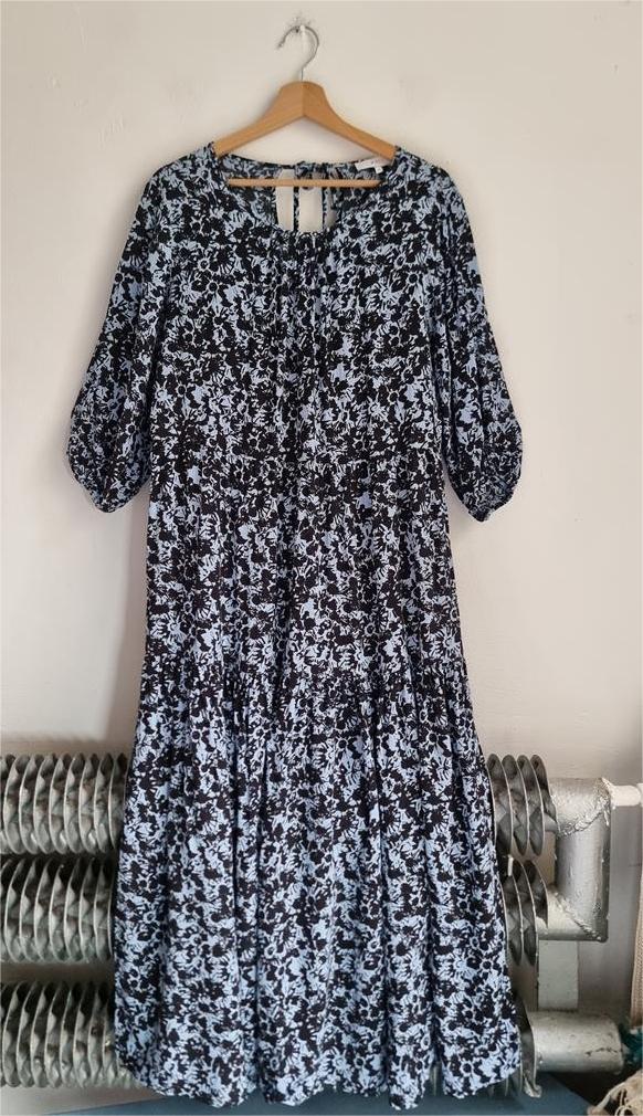 Długa wiskozowa sukienka o luźnym kroju z wiązaniem z tyłu. Odcienie niebieskiego i czerni.
