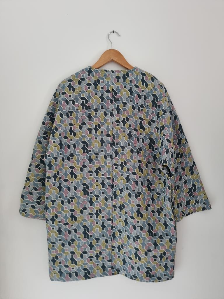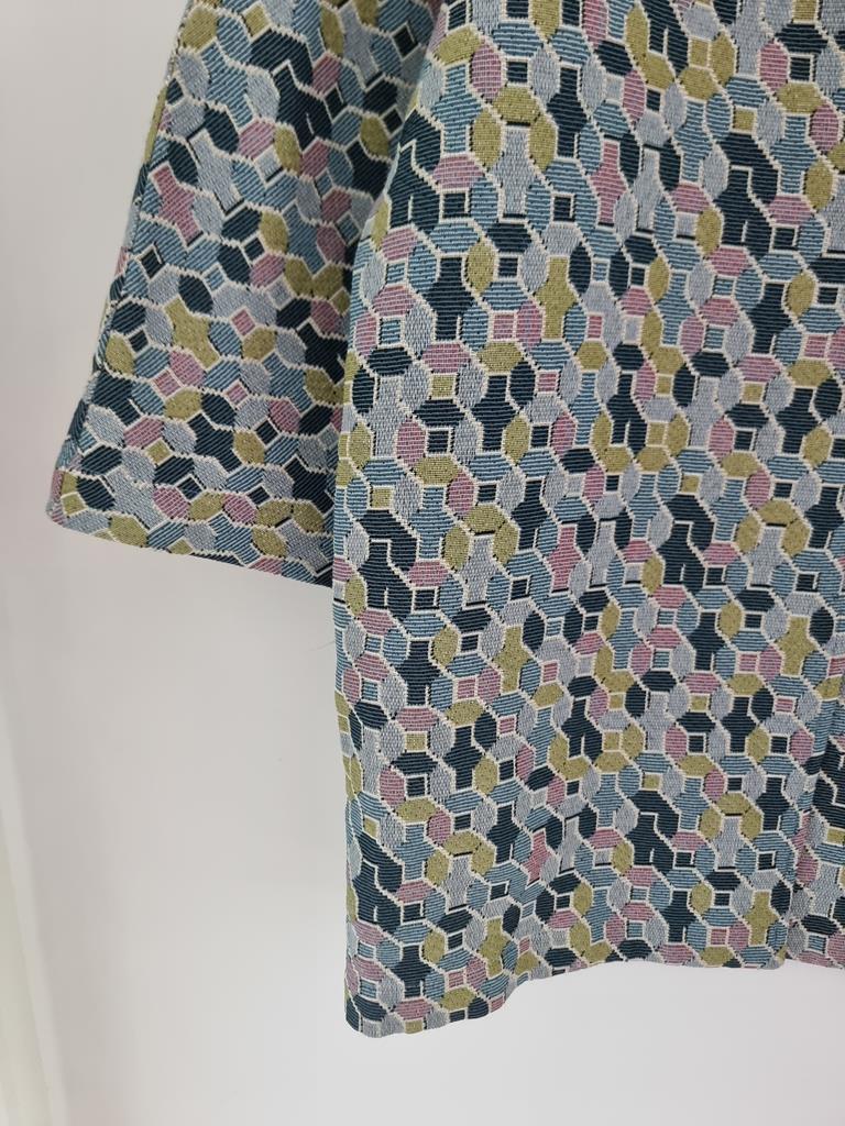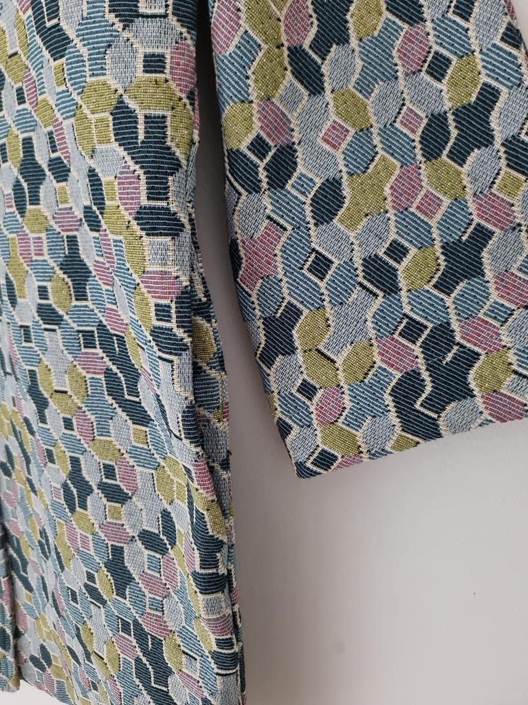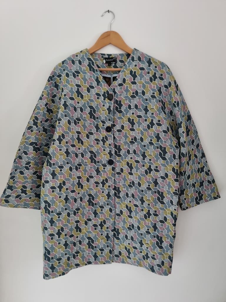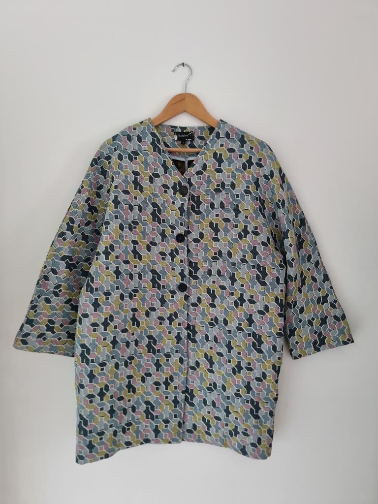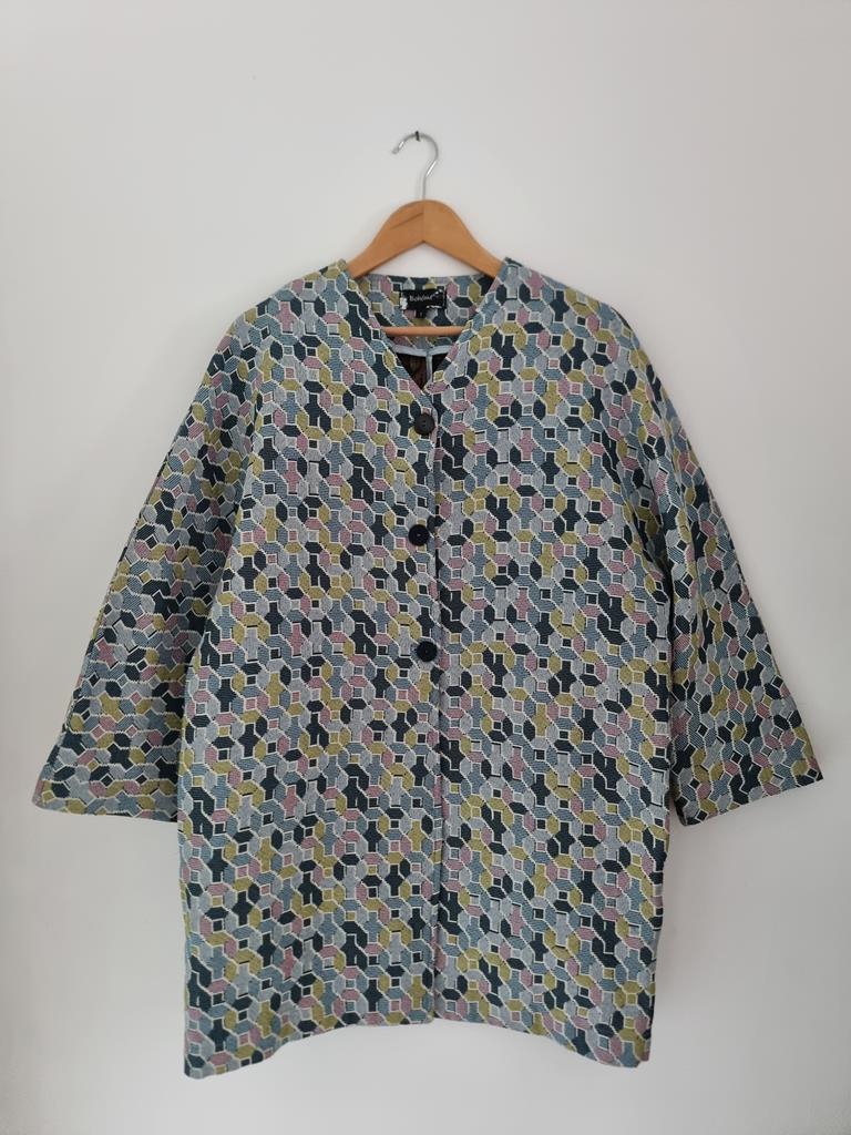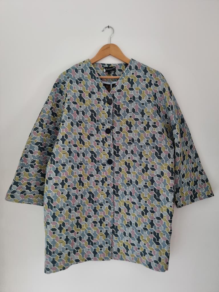 Wzorzysty  żakardowy płaszcz. Posiada kieszenie.