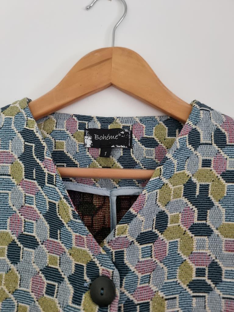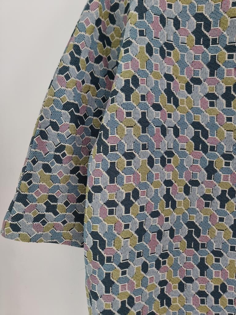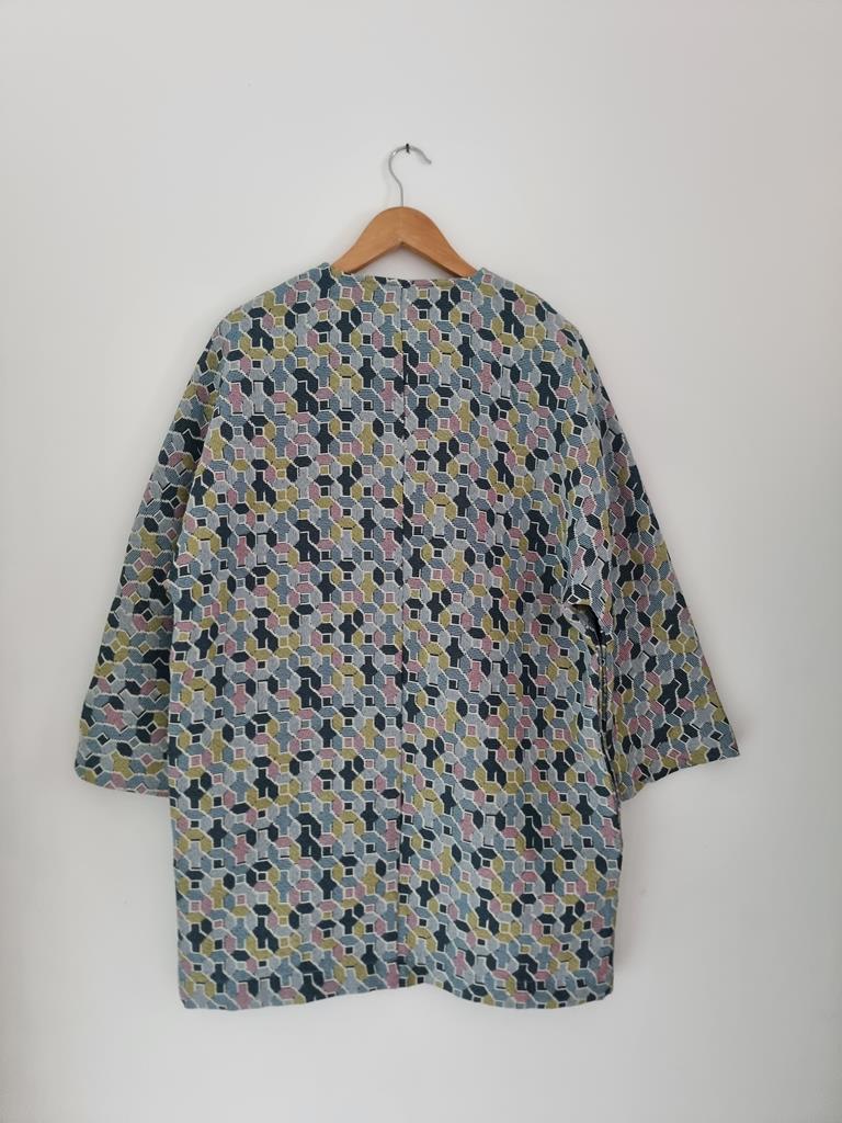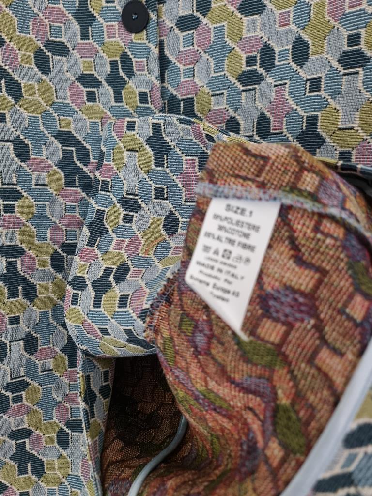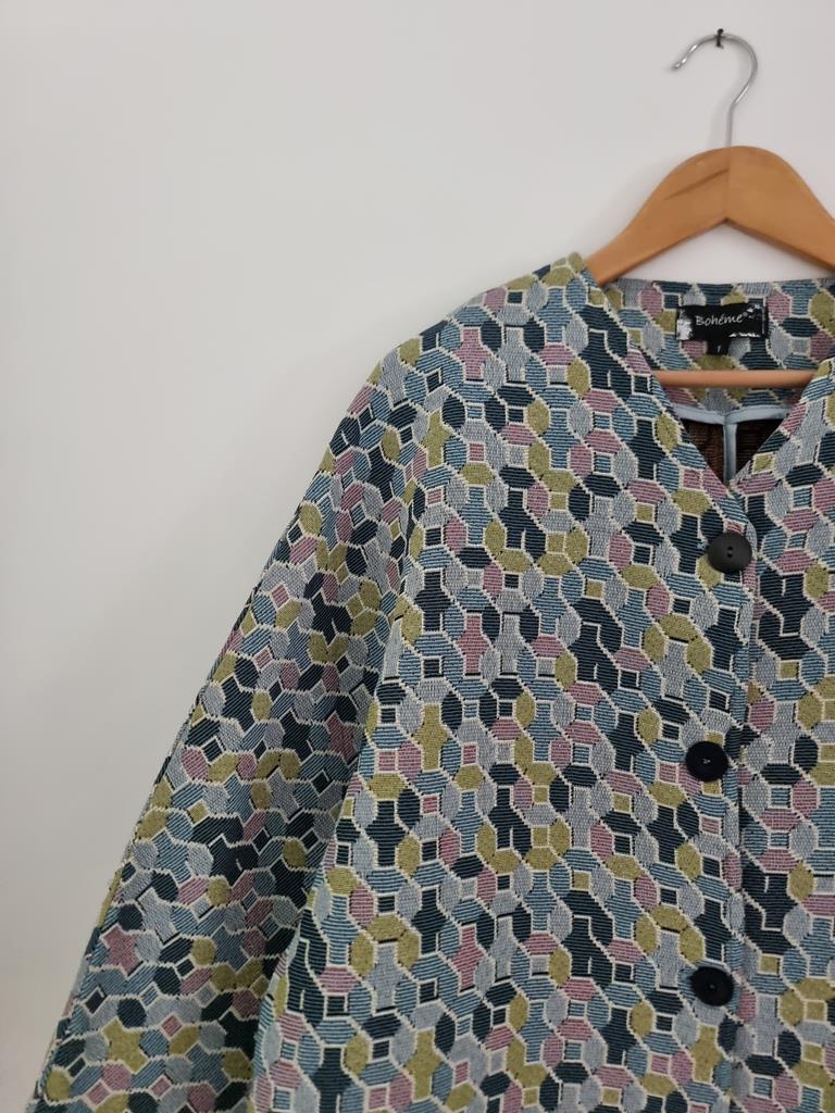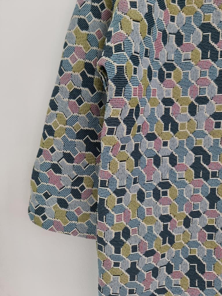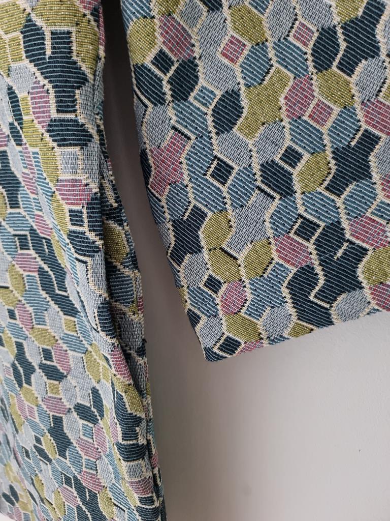 Wzorzysty  żakardowy płaszcz. Posiada kieszenie.