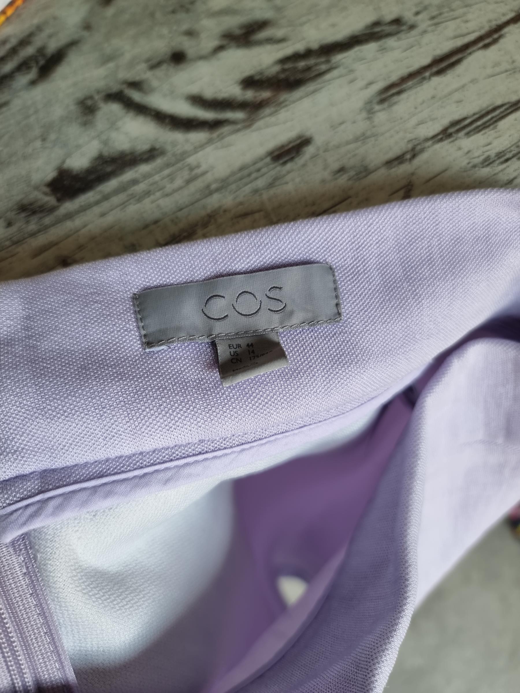Lawendowe spodenki bermudy marki COS. Sztywna talia, zapięcie na zamek. Wykonane z grubszej tkaniny - mieszanka poliamidu i cupro.