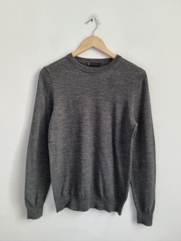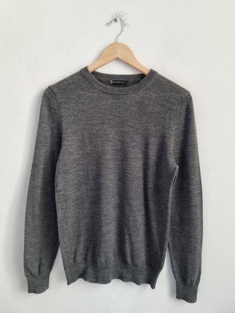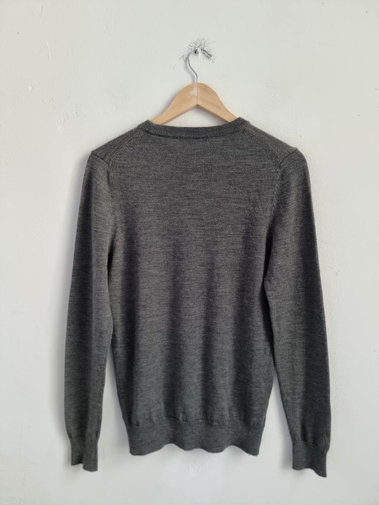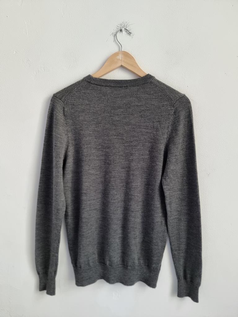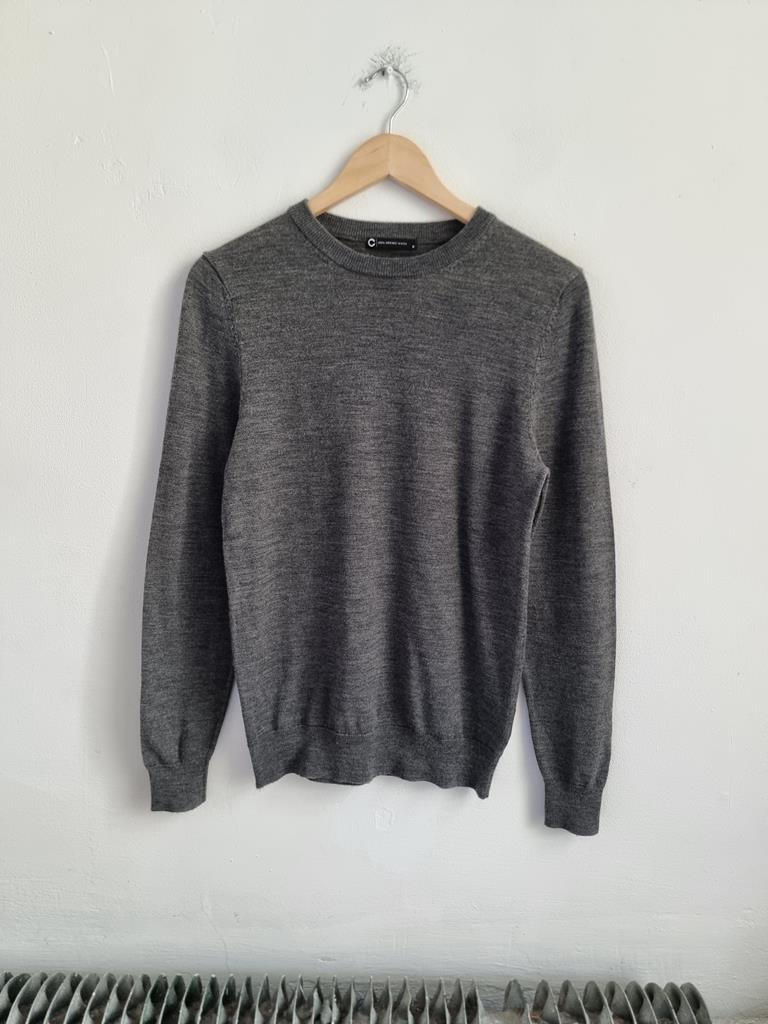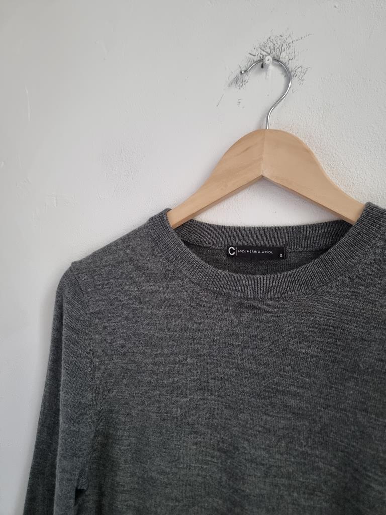 Szary klasyczny sweter z wełny merino. Półokrągły dekolt.