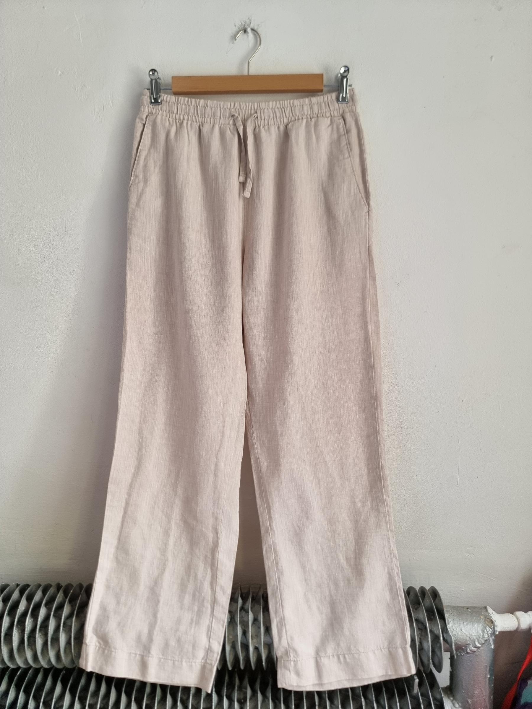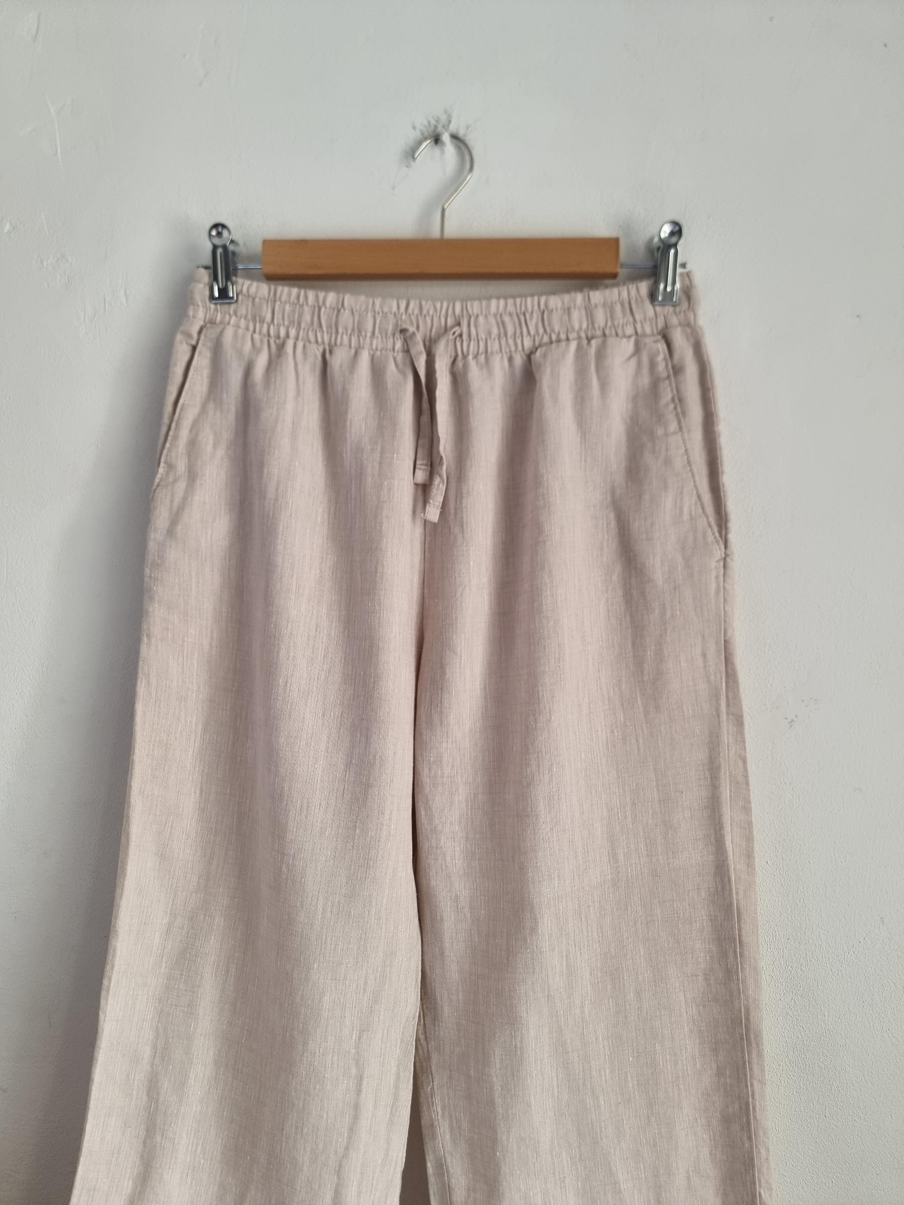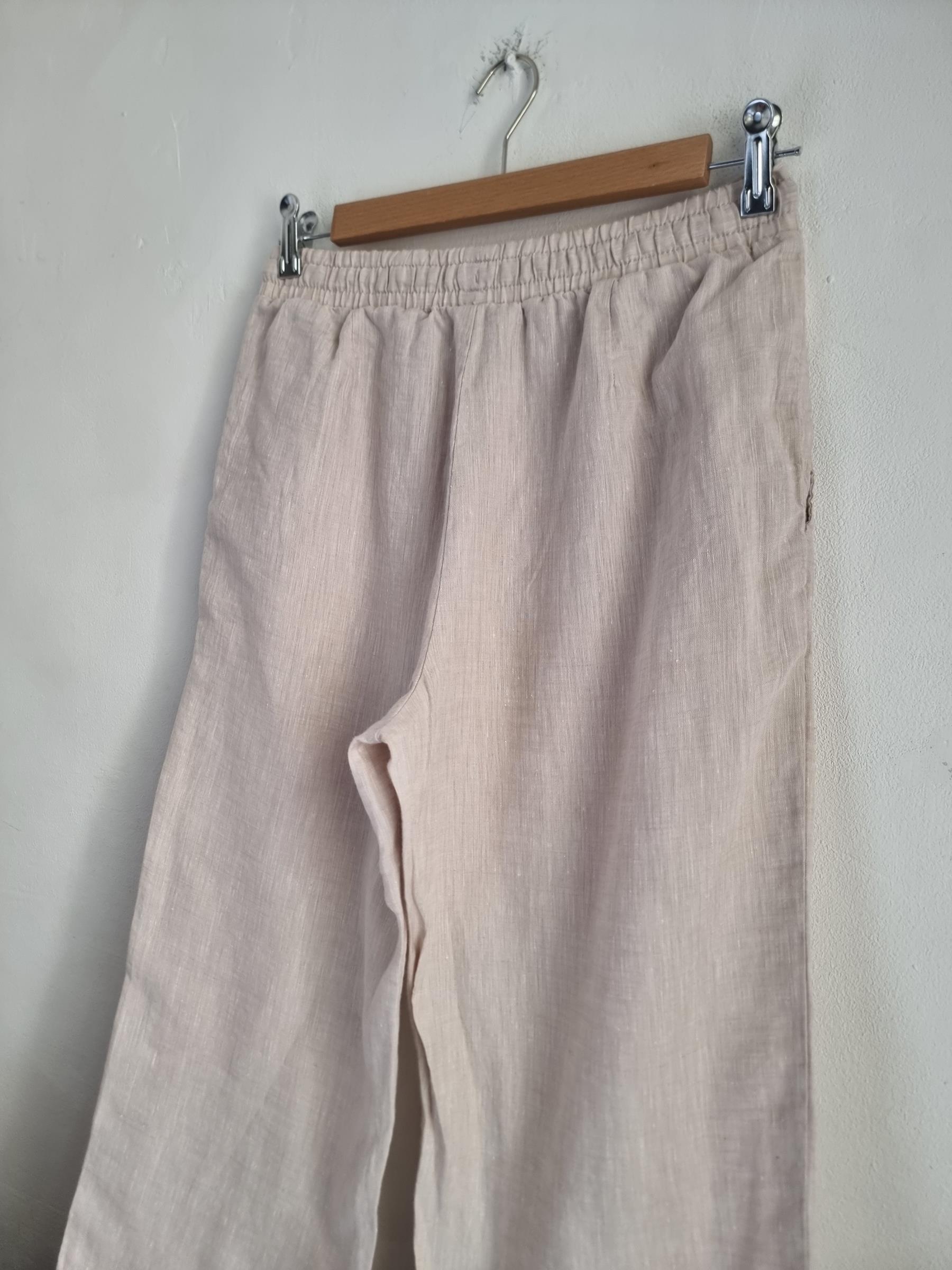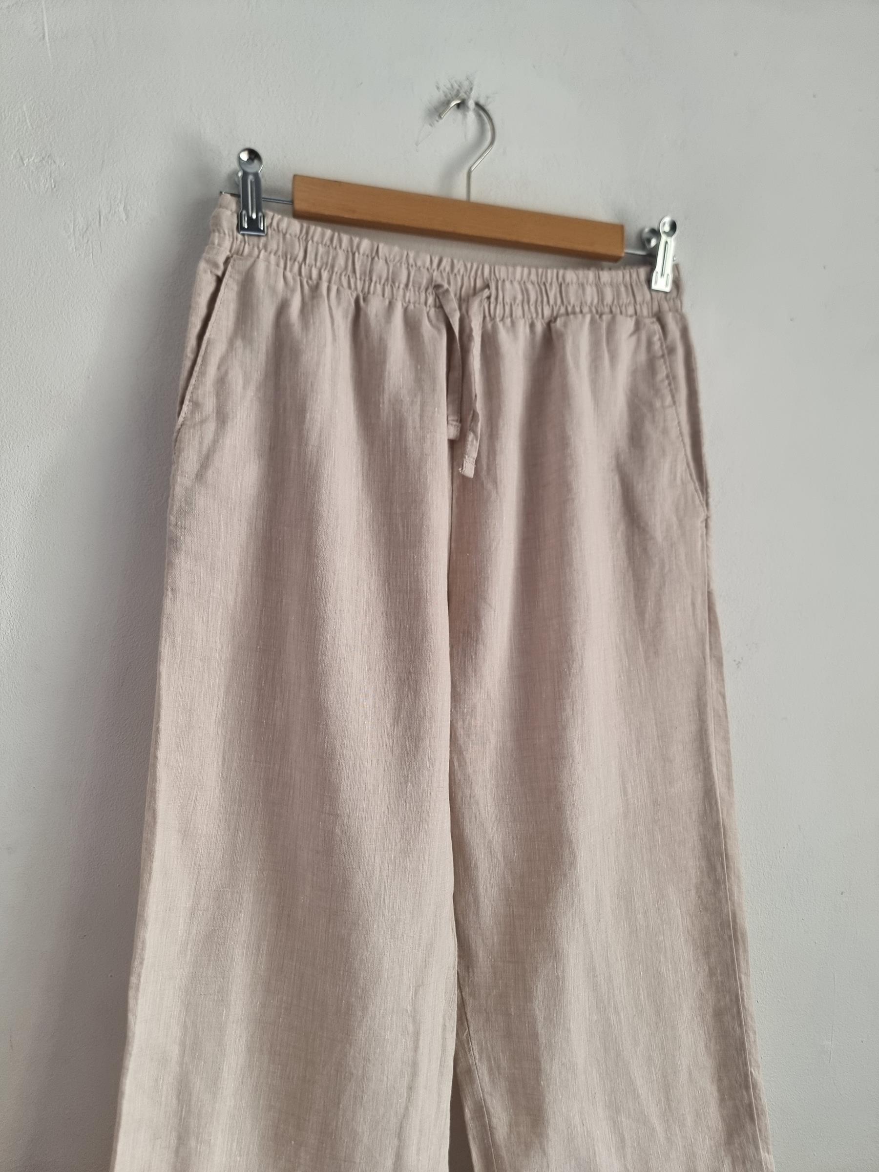 Beżowe lniane spodnie marki Cubus. Gumka w pasie i sznurek. Model: L Lena linen pant.