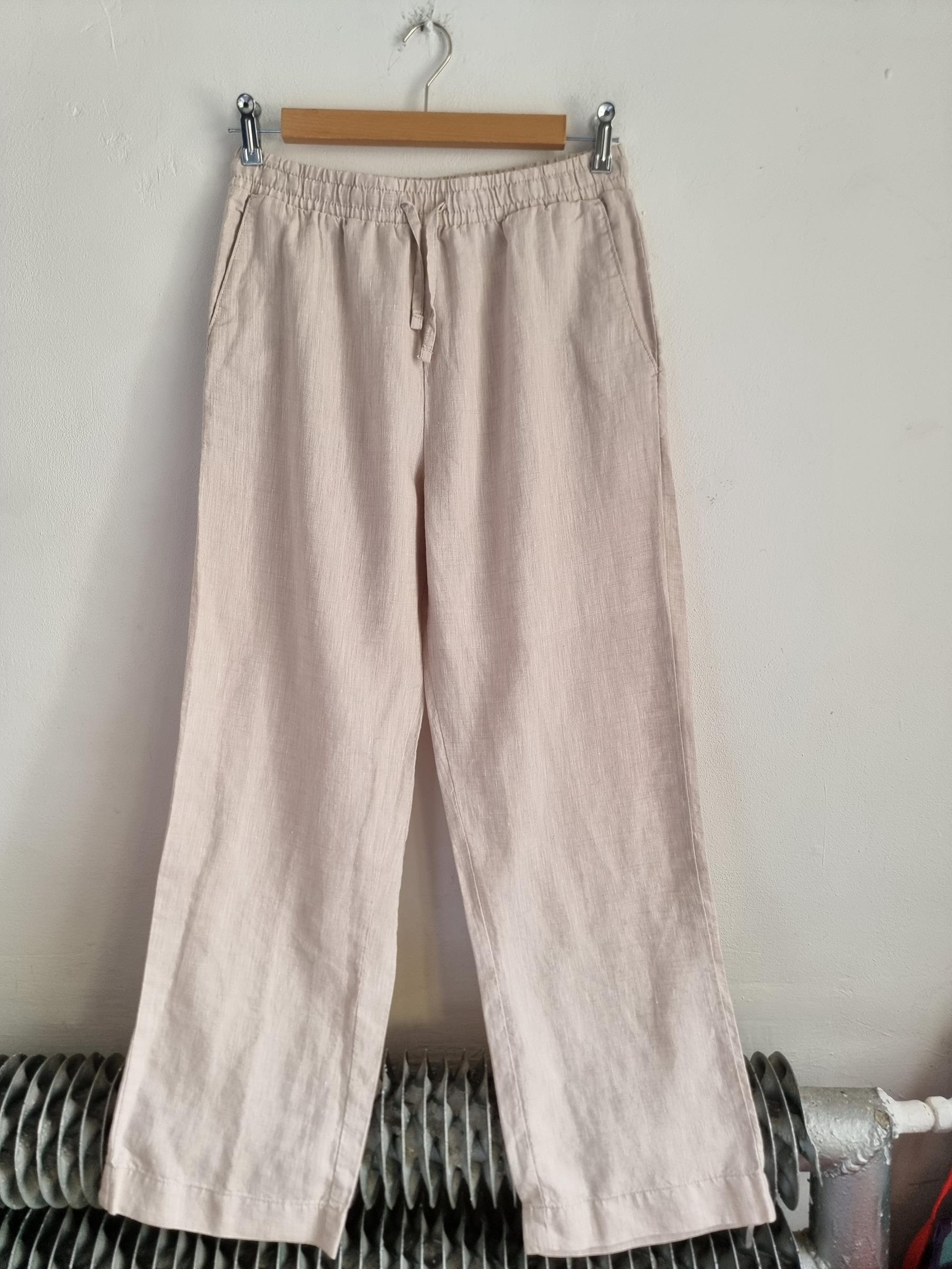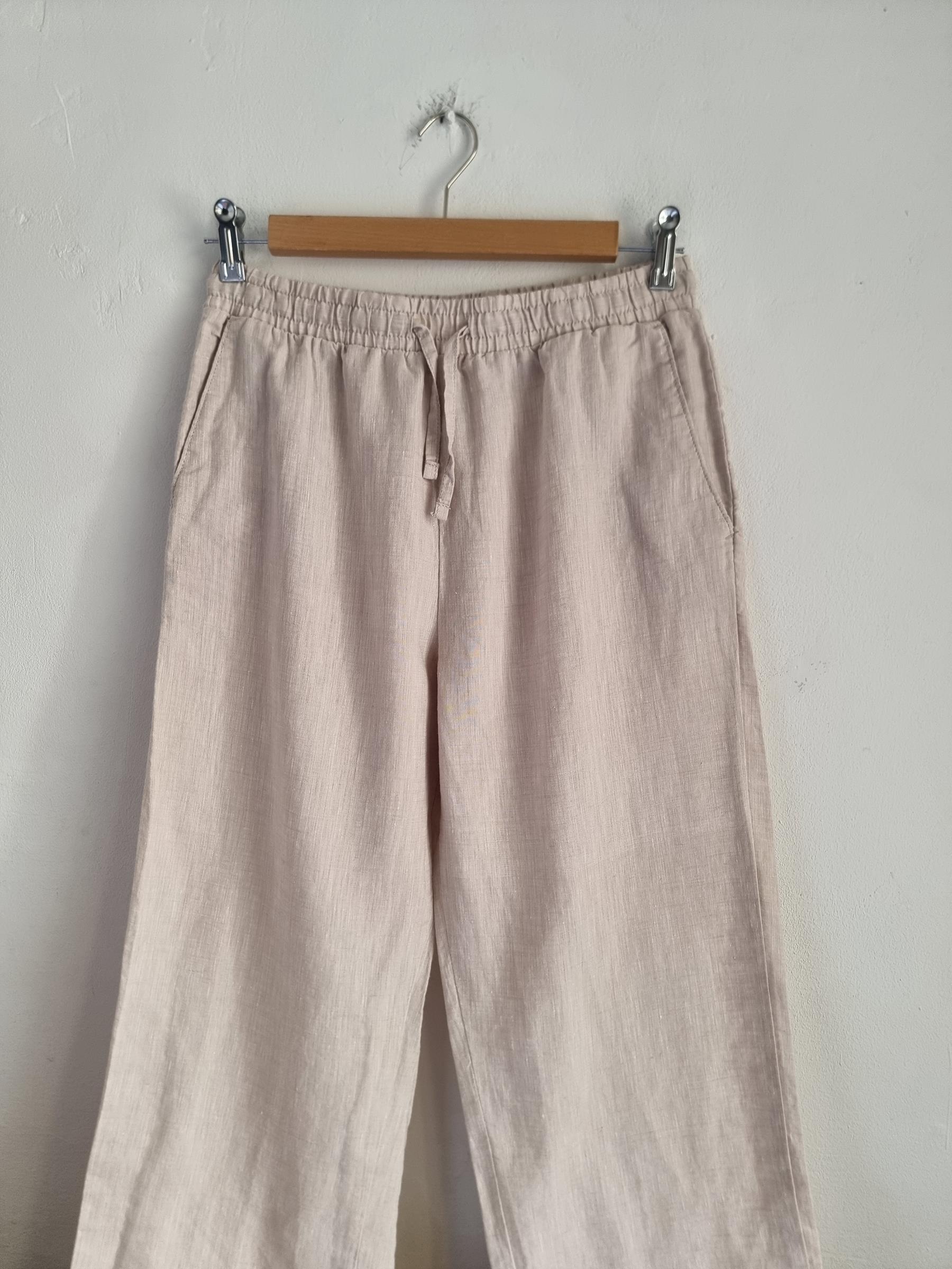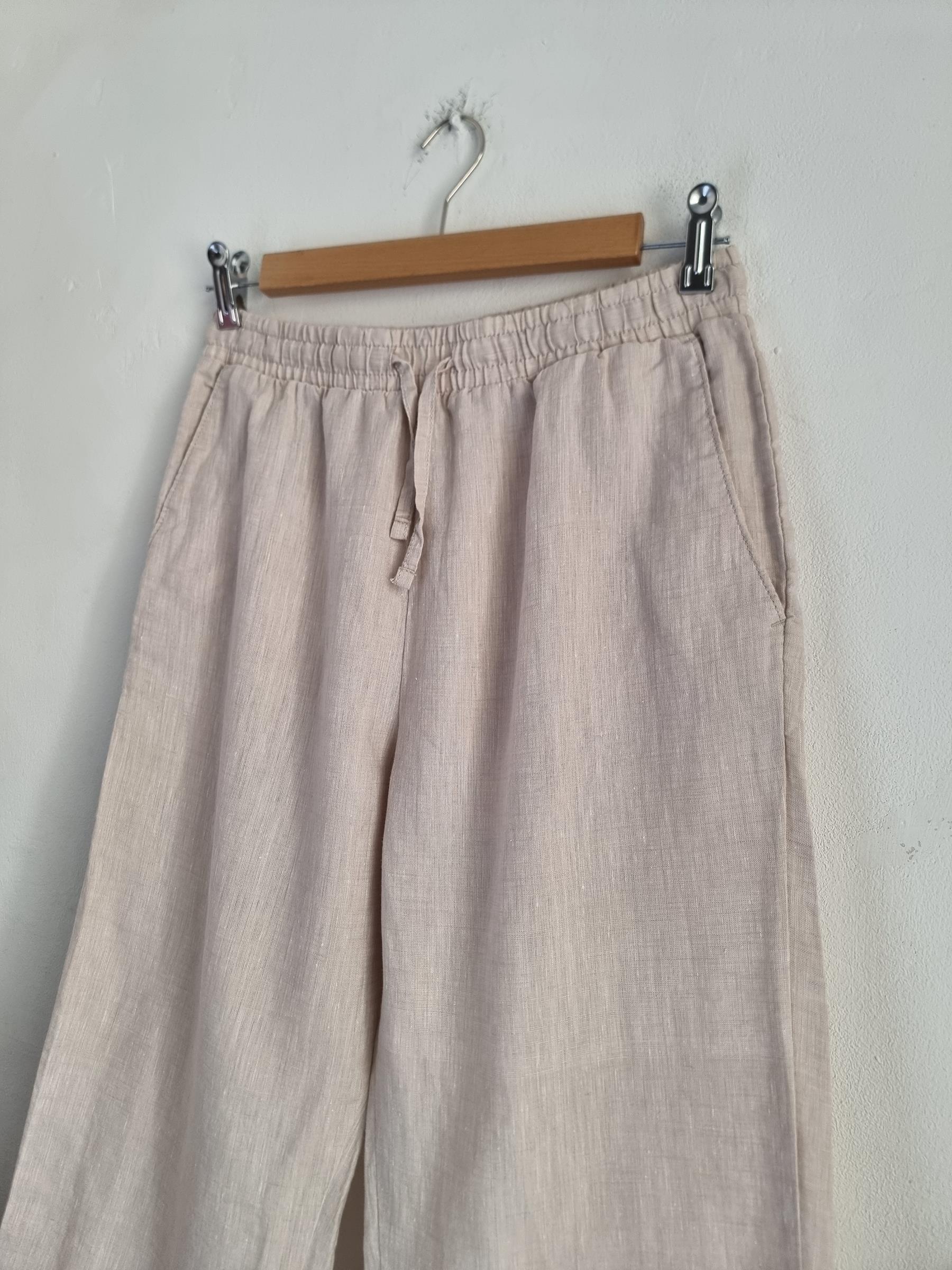 Beżowe lniane spodnie marki Cubus. Gumka w pasie i sznurek. Model: L Lena linen pant.