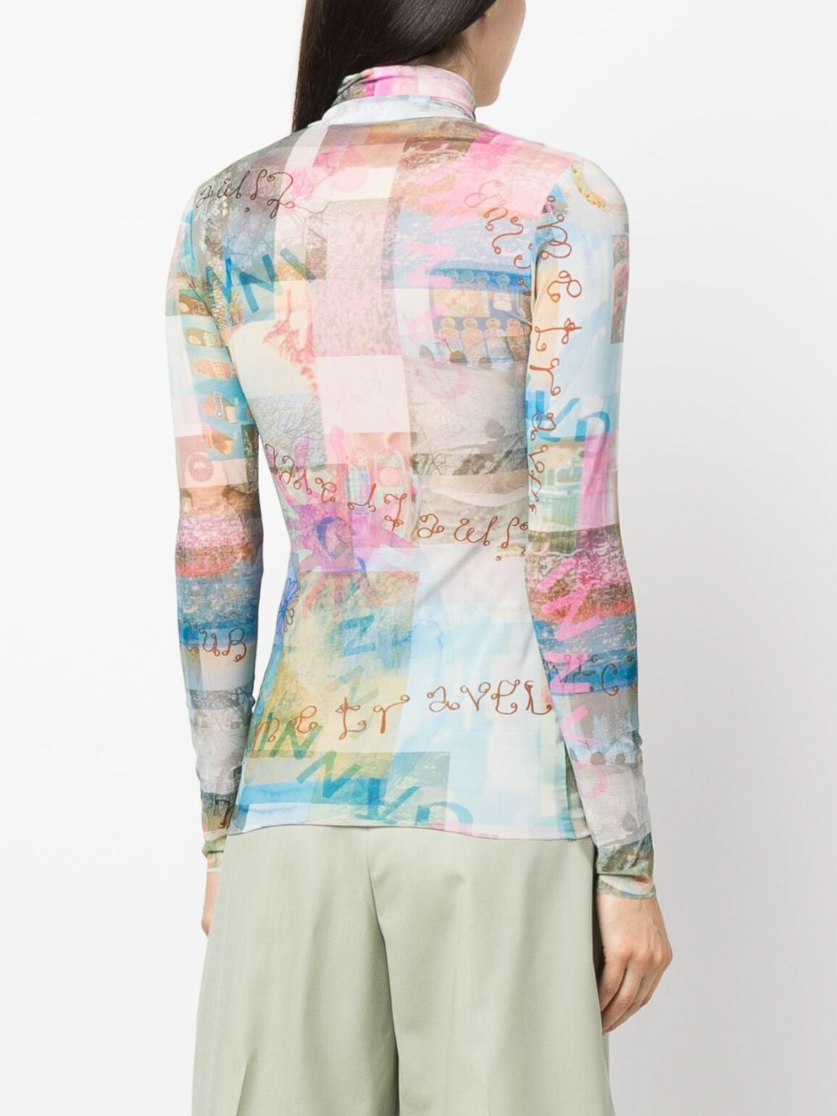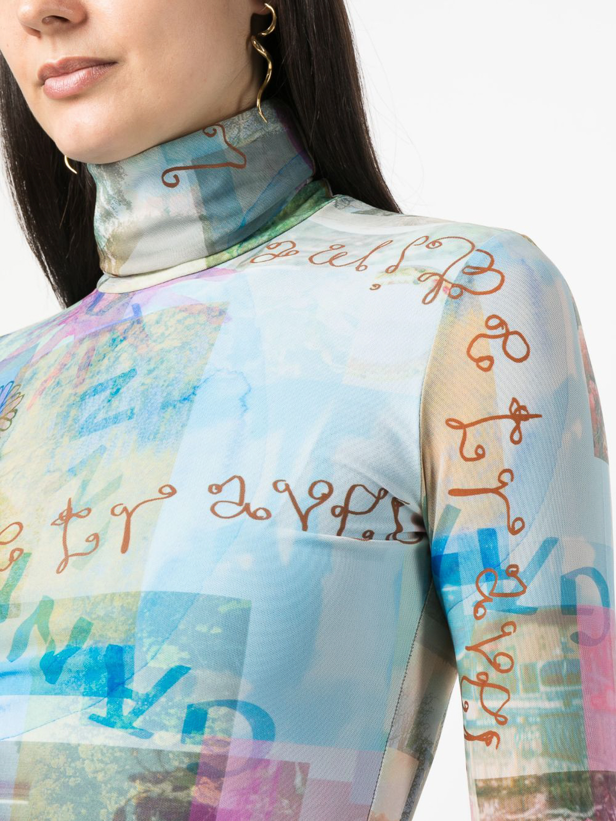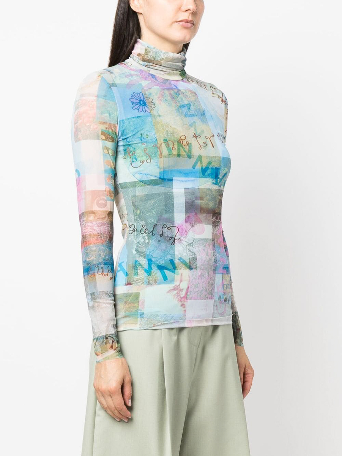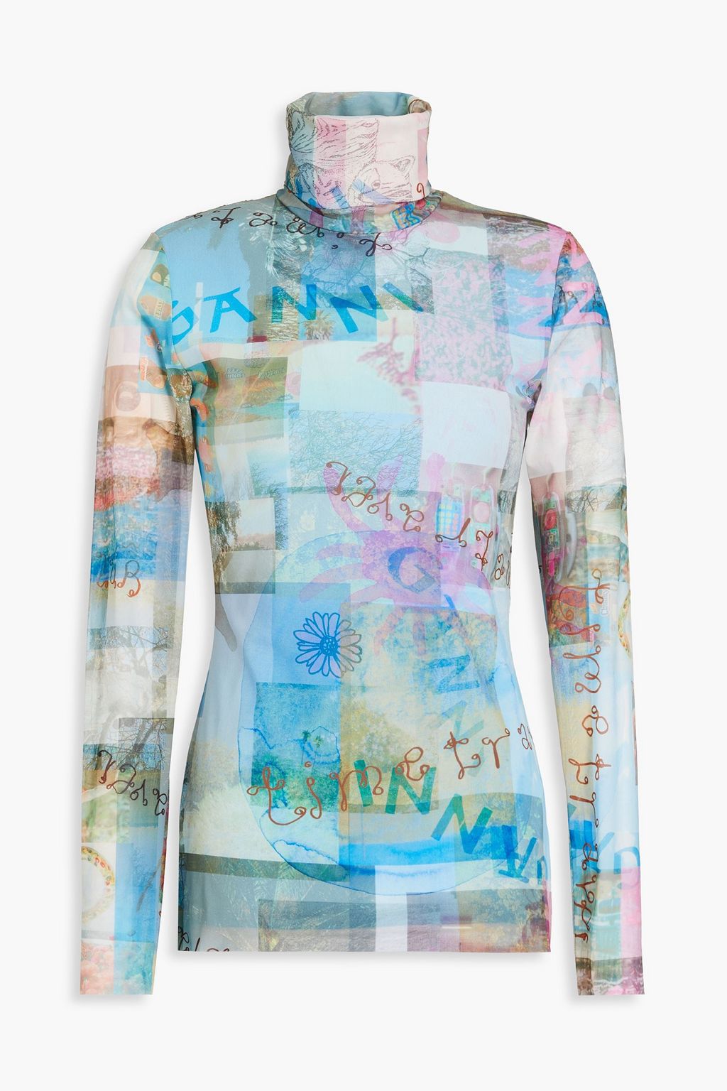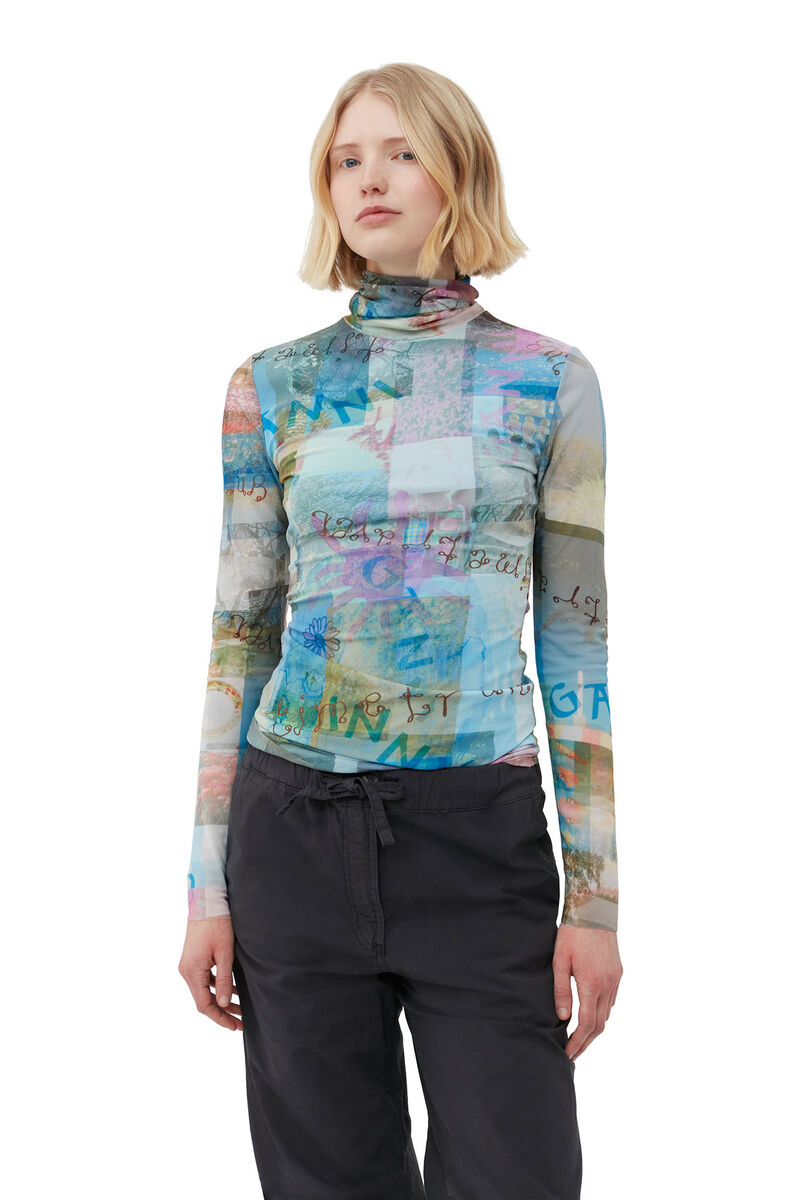 Koszulka z nadrukiem graficznym marki Ganni z jasnoniebieskim, wielokolorowym nadrukiem graficznym na całej powierzchni, golfem z długim rękawem i prostym dołem, rozmiar fry