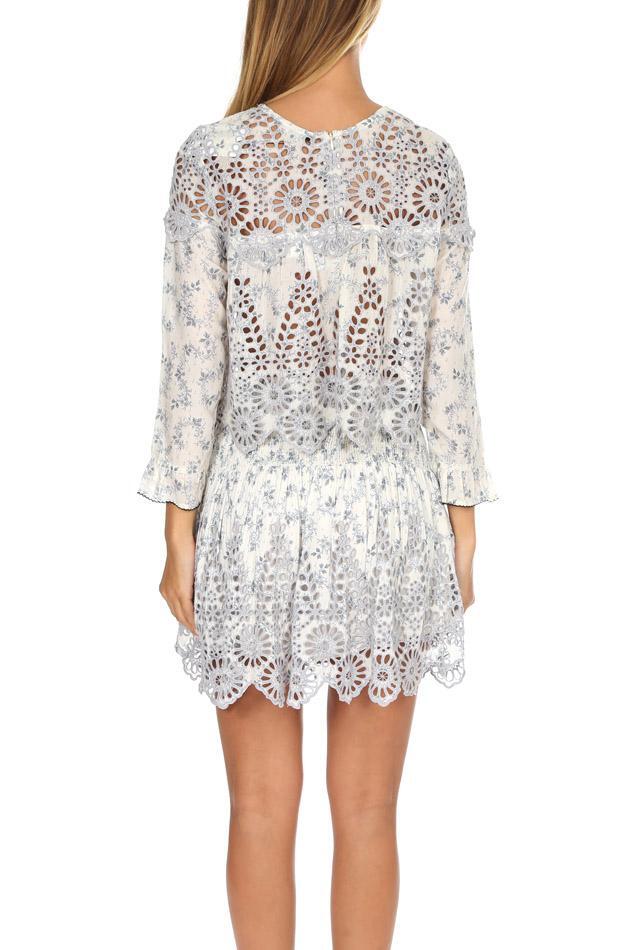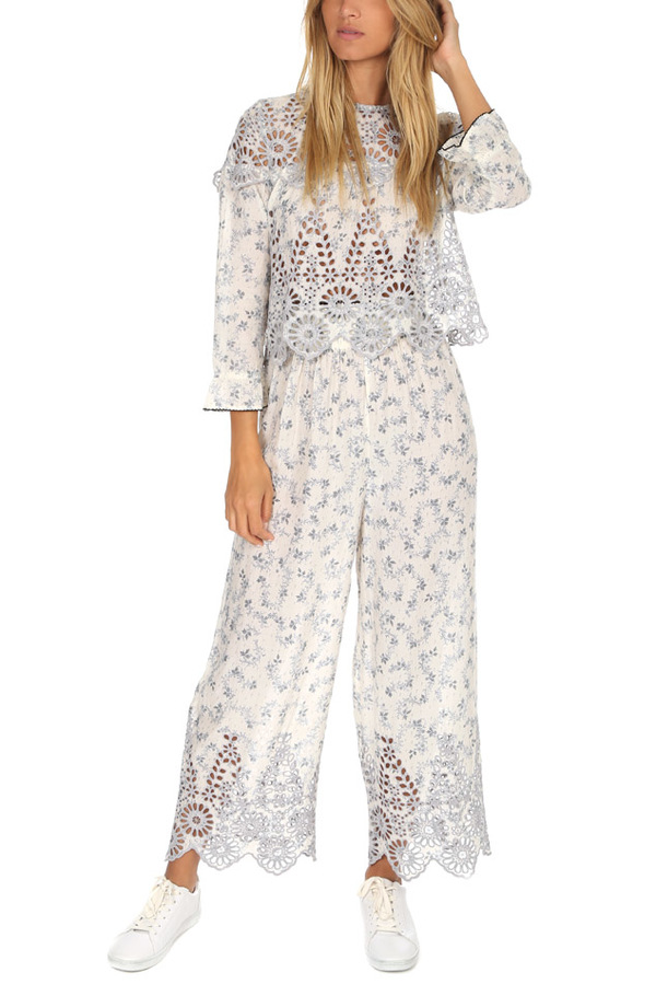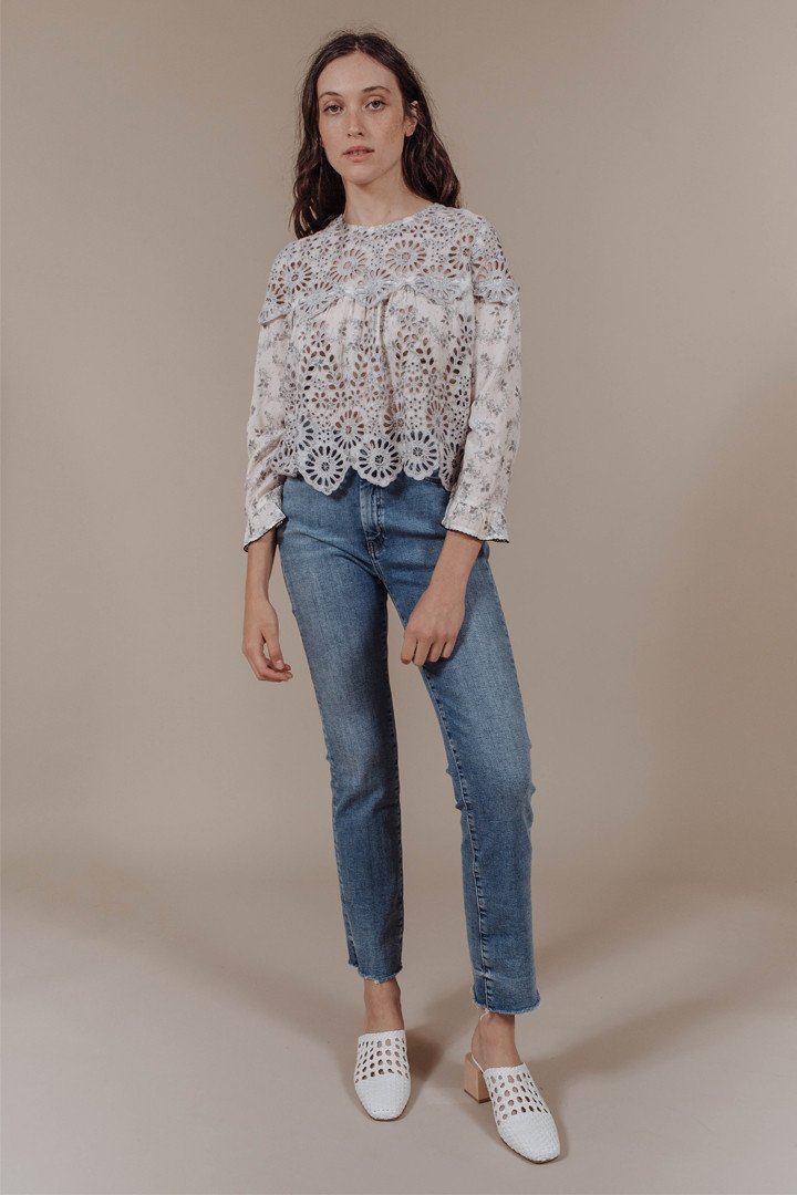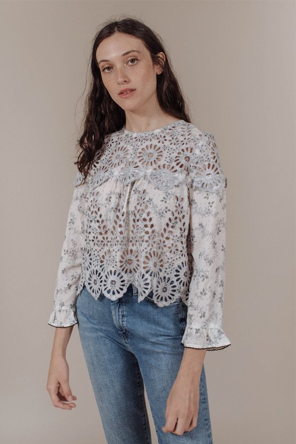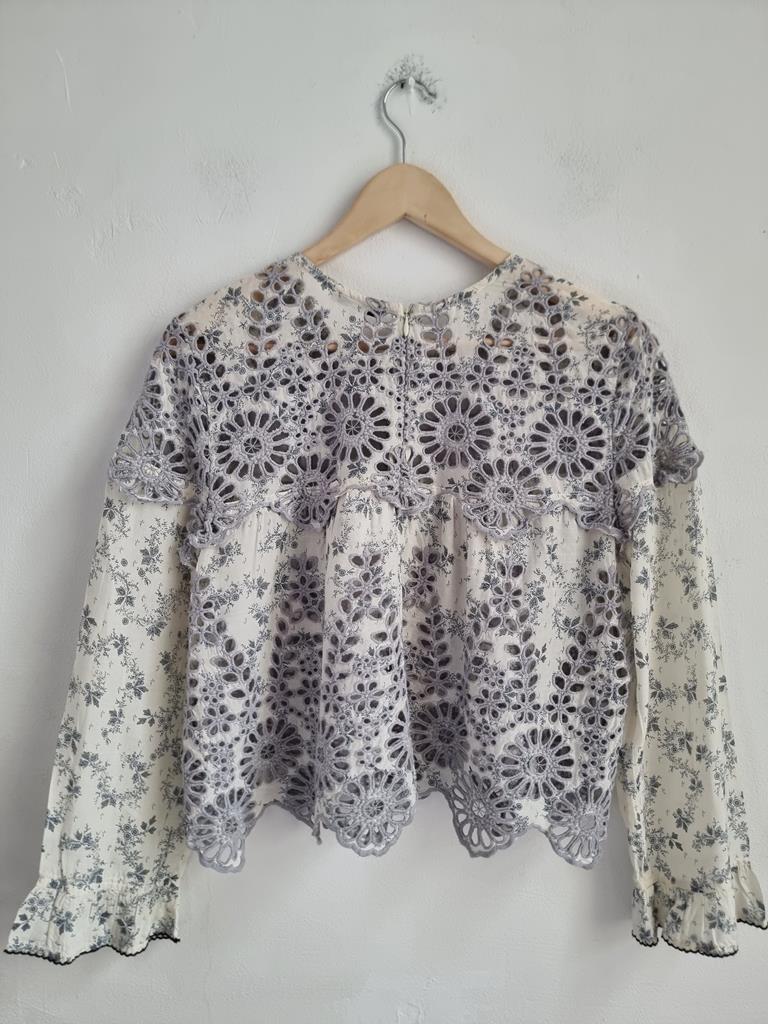 Bluzka koronkowa z długim rękawem marki GANNI. Model emile lace. Transparentny top z oczkami na rękawach i delikatnym kwiatowym nadrukiem. Długie rękawy z rozszerzanymi mankietami i ukrytym zamkiem błyskawicznym z tyłu.