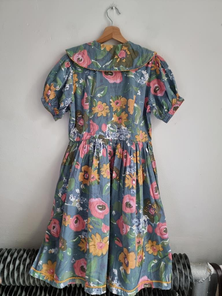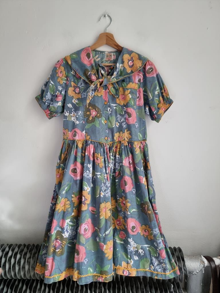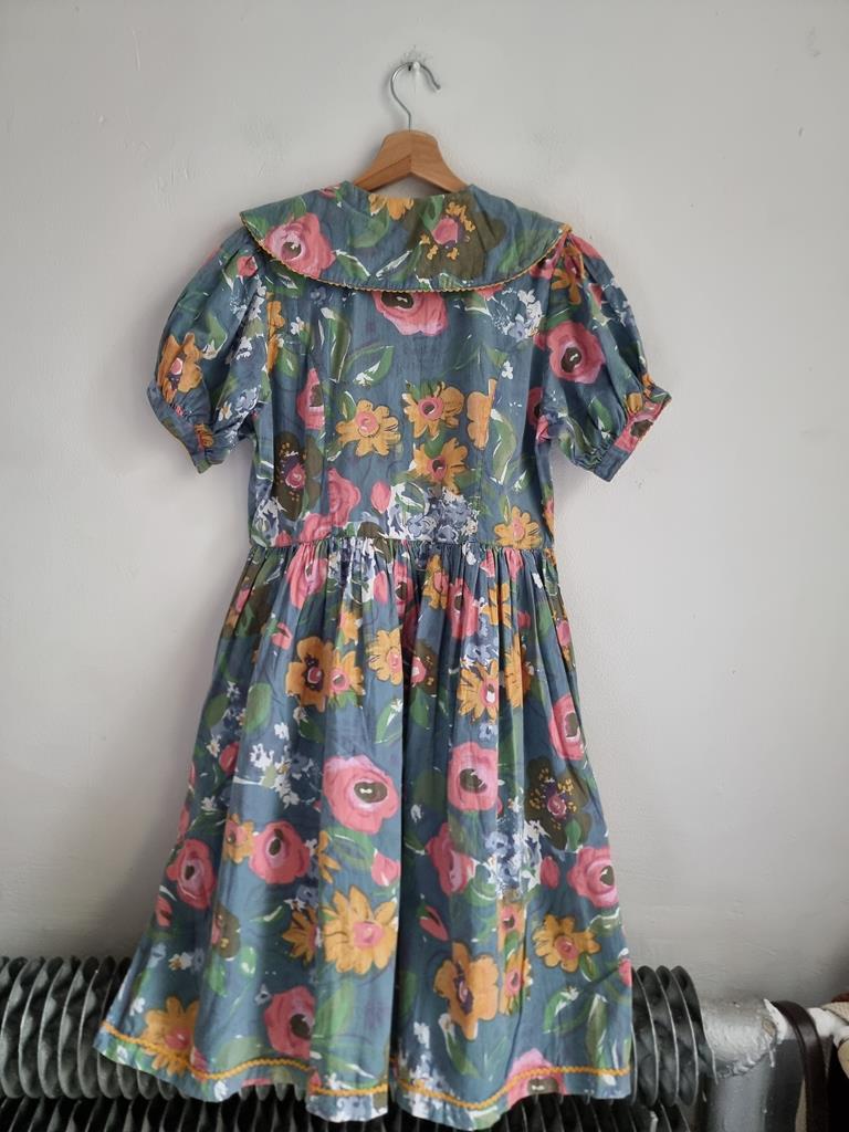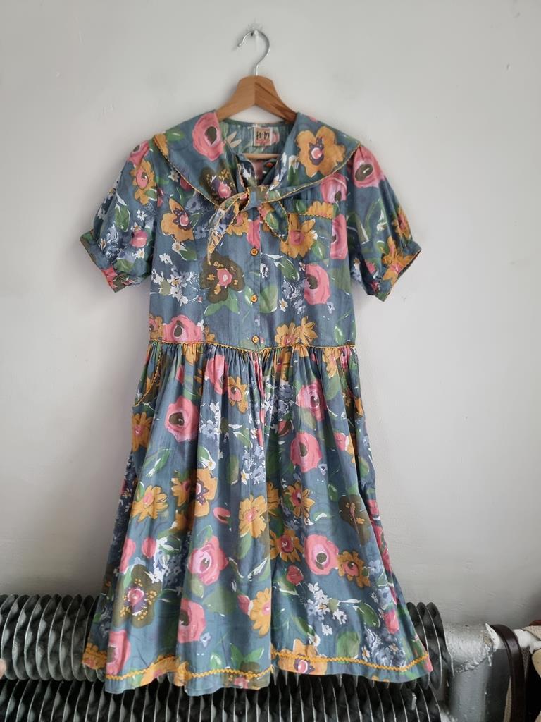 Vintage sukienka seria dziecięca na 158 cm, piękny długi kołnierz, który można związać.