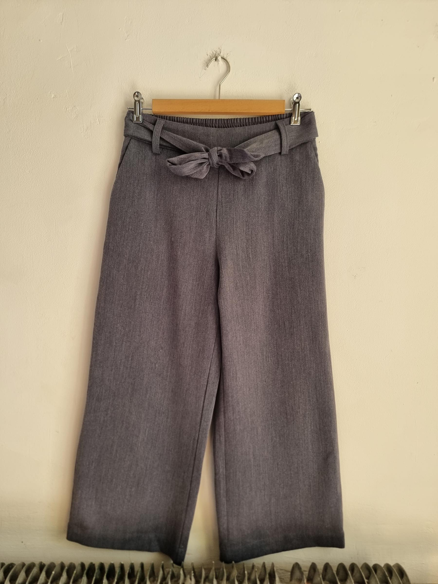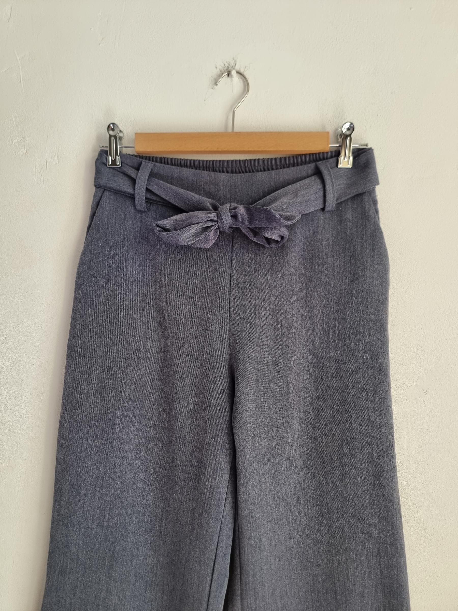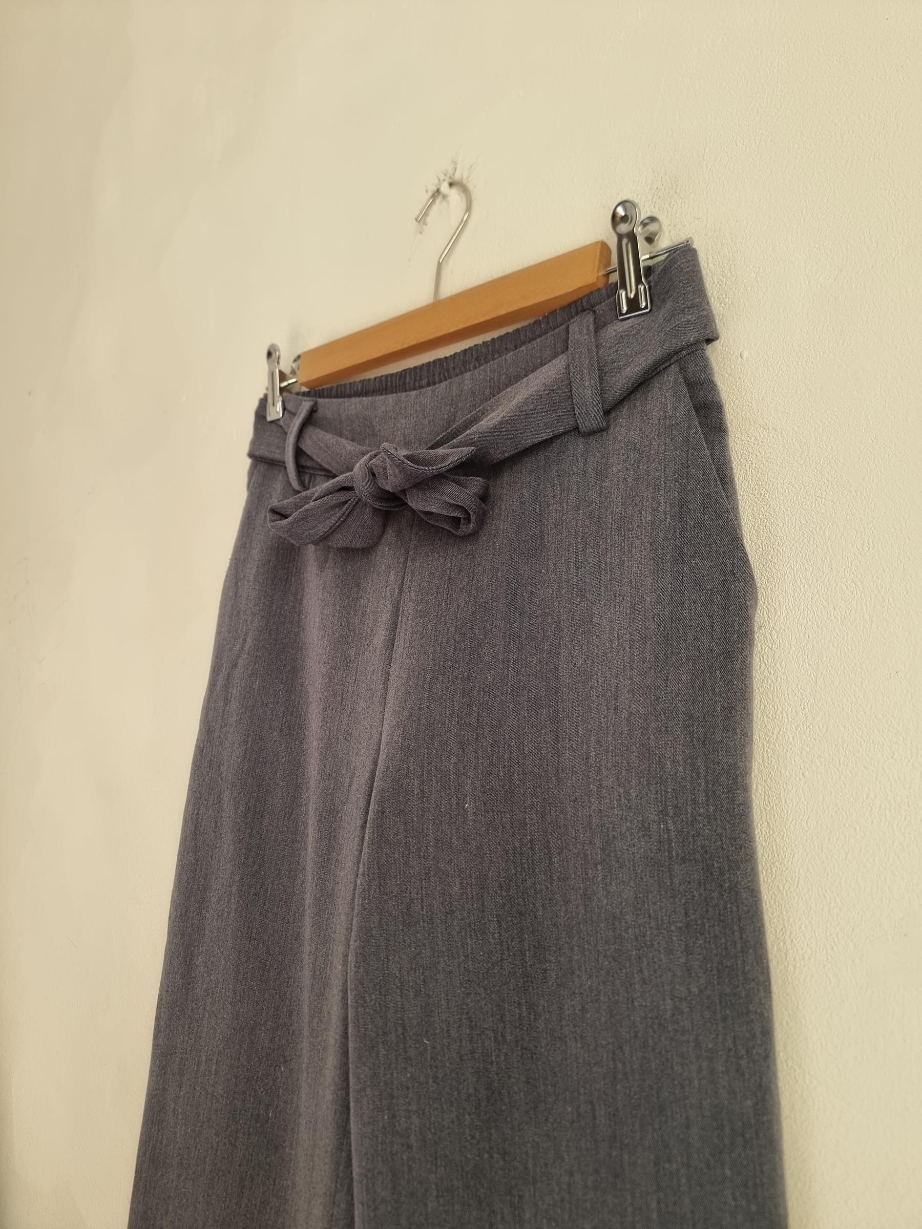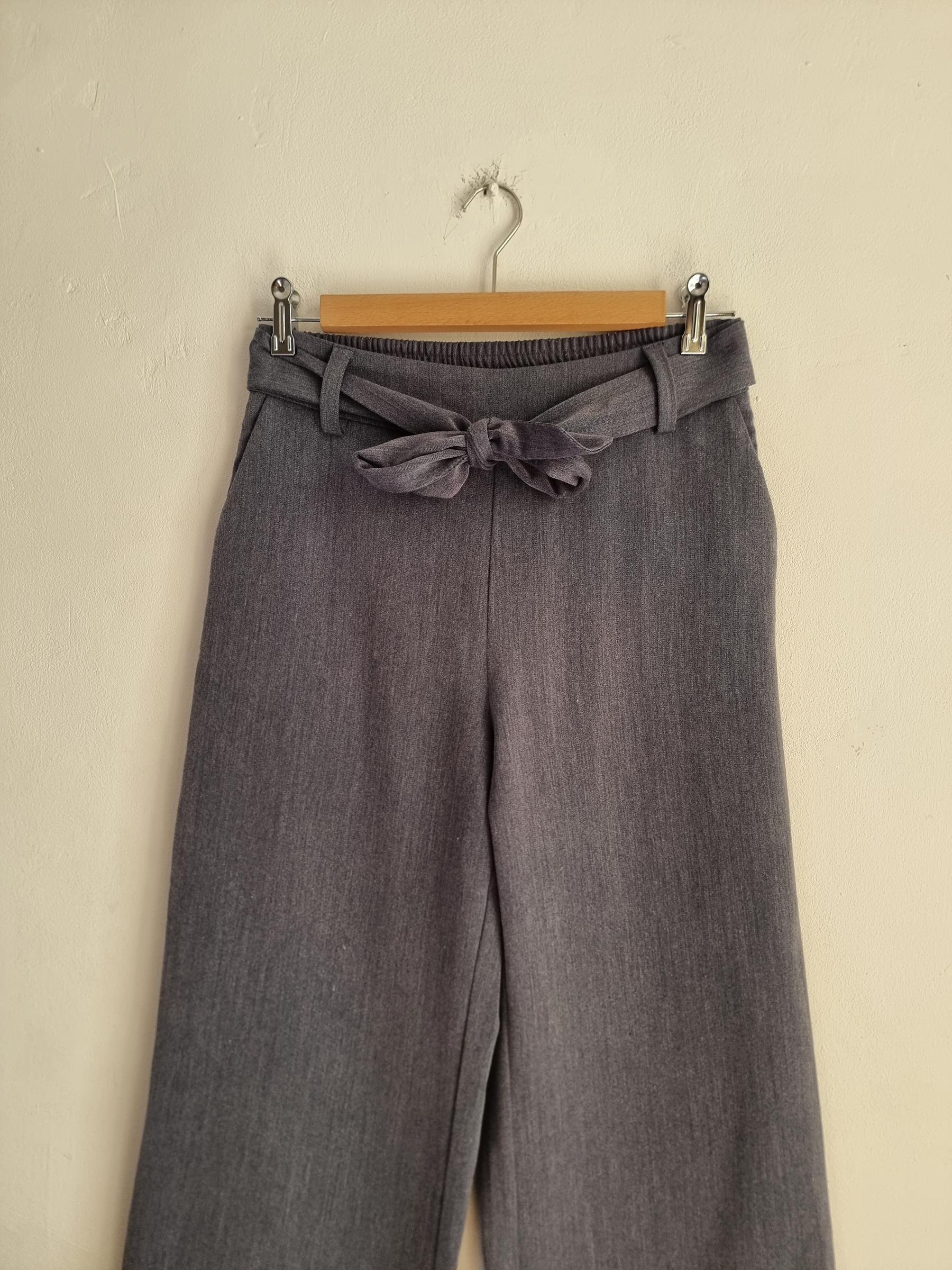 Szare spodnie z szerokimi nogawkami z wiązaniem w pasie.