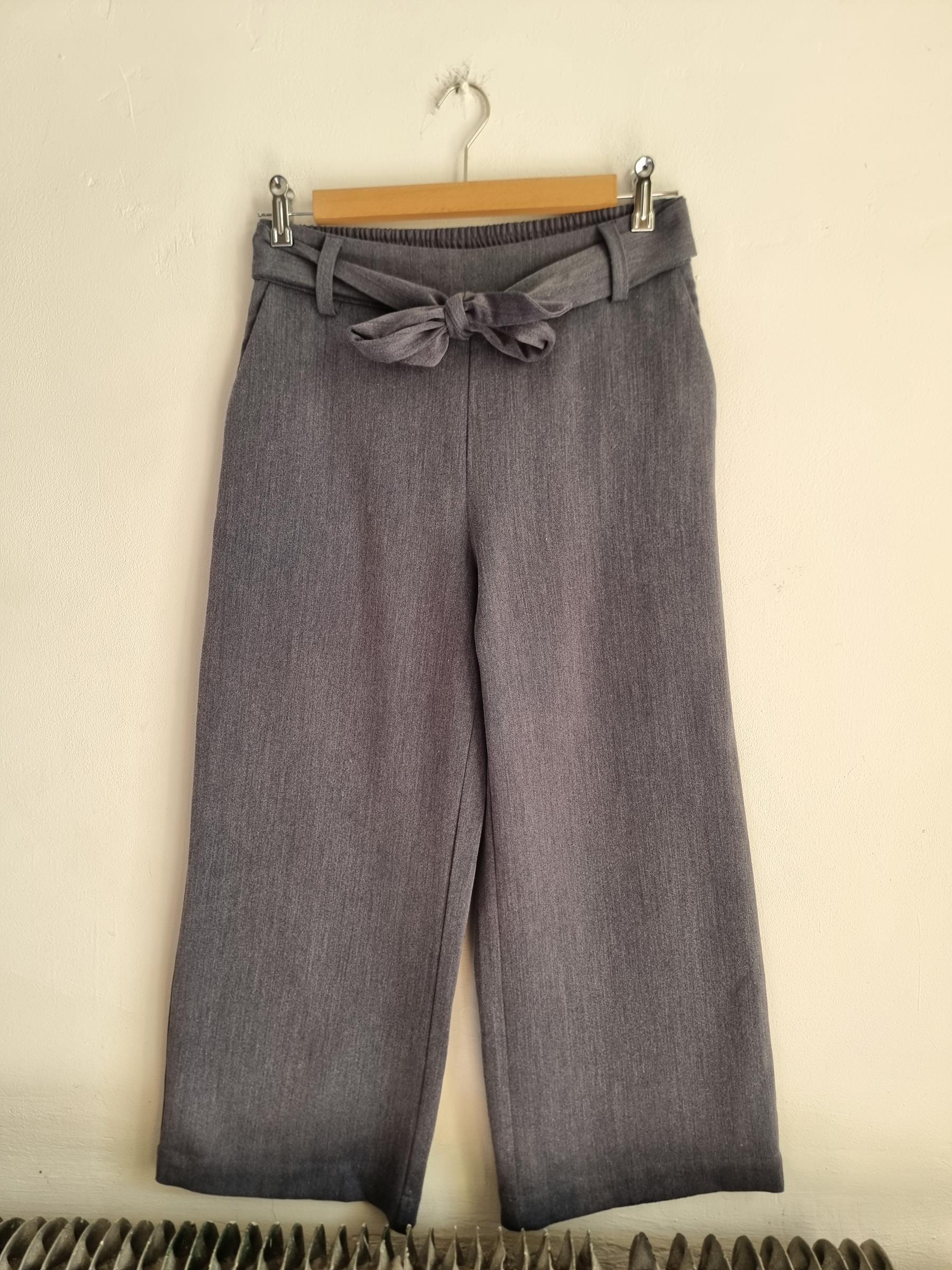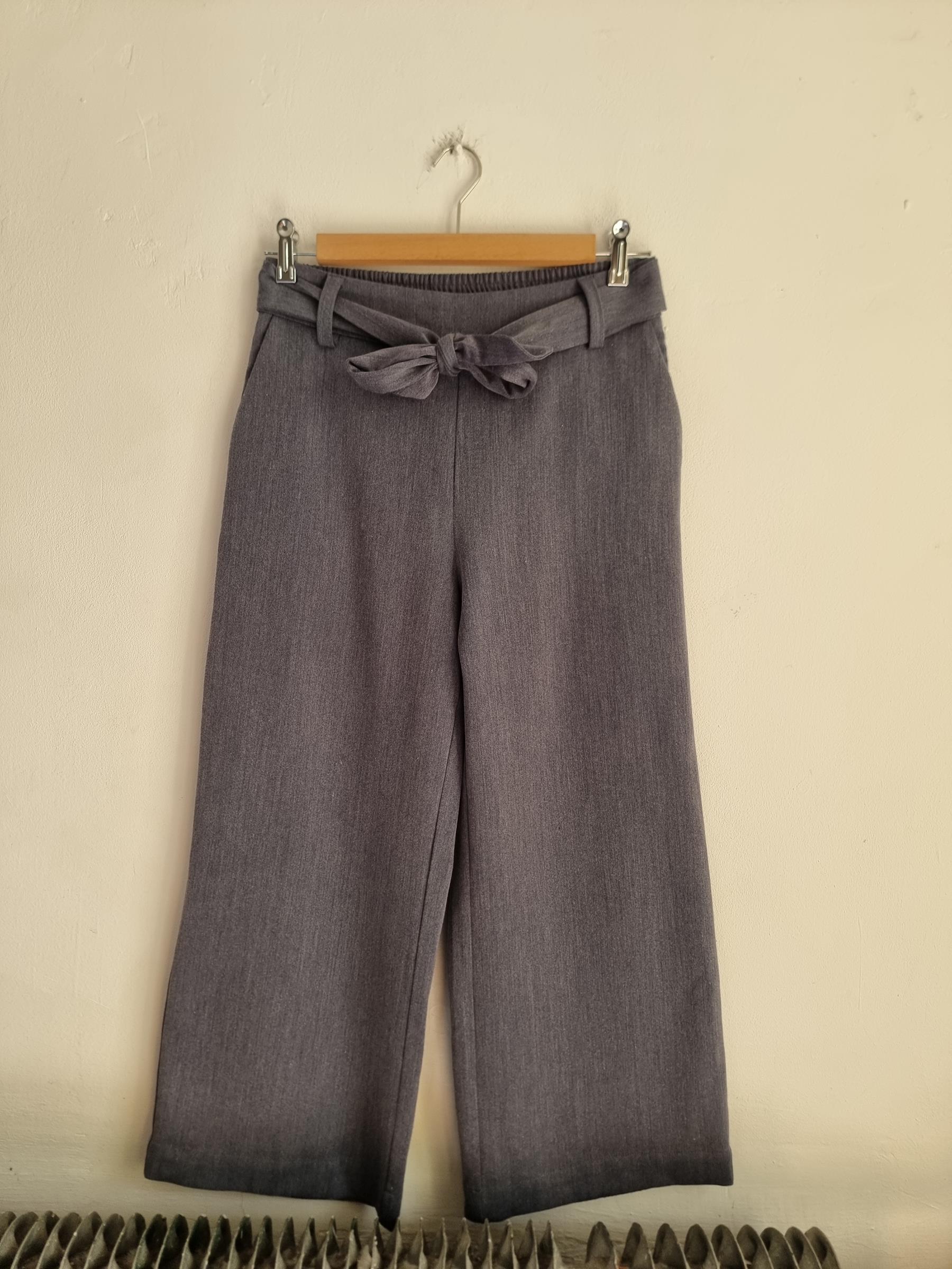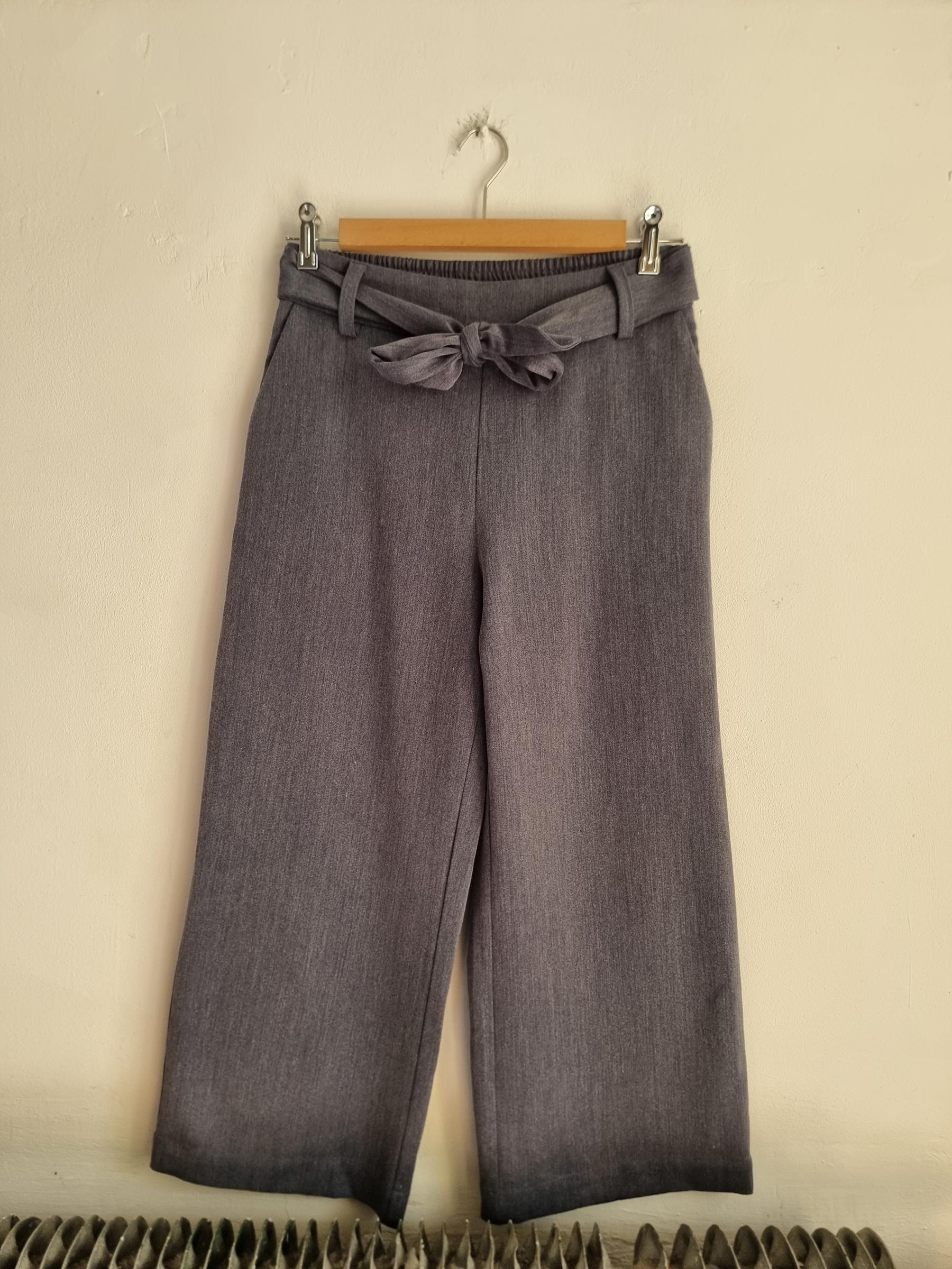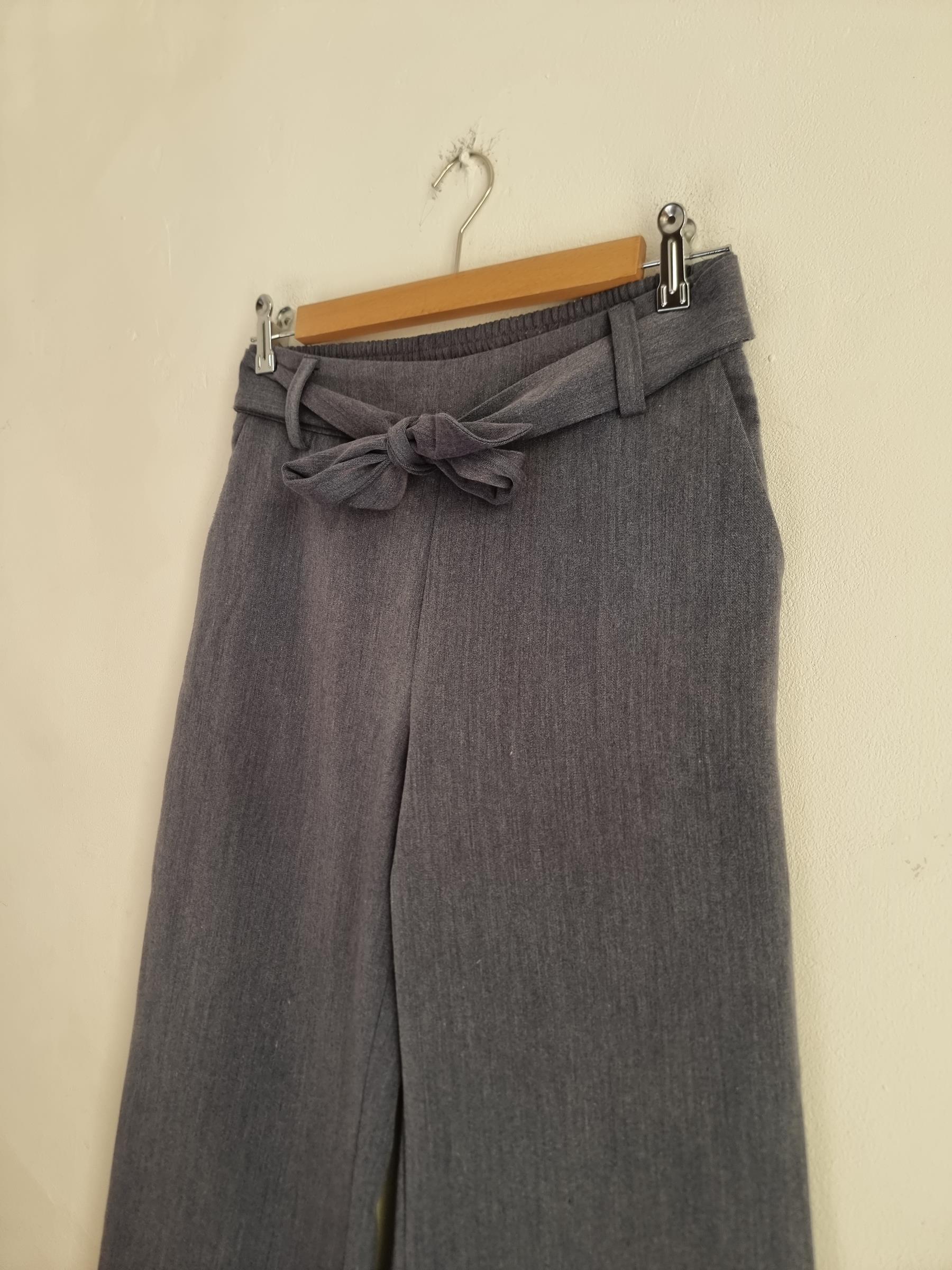 Szare spodnie z szerokimi nogawkami z wiązaniem w pasie.
