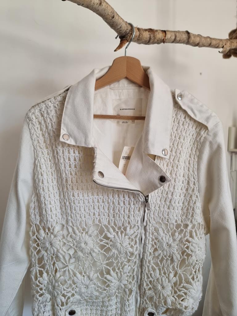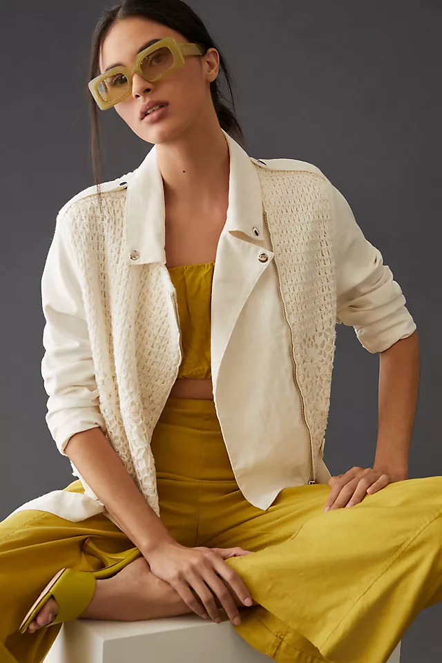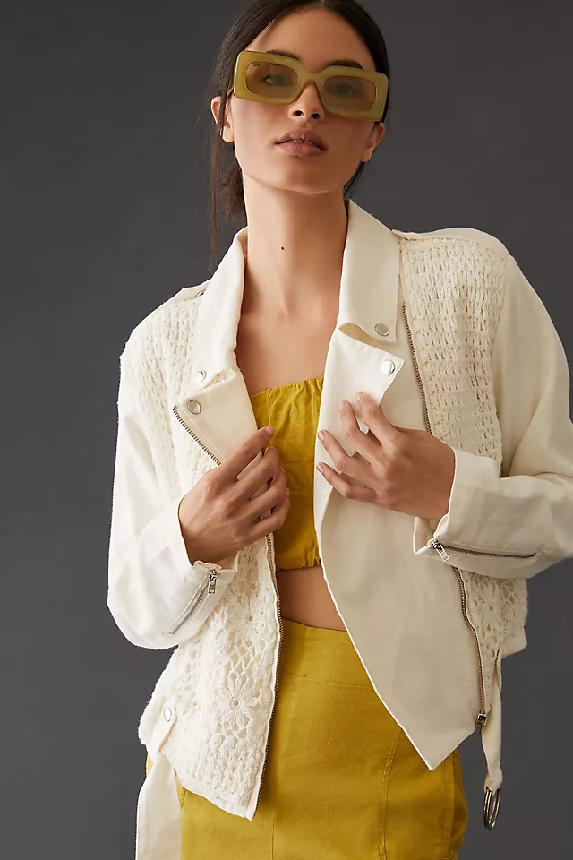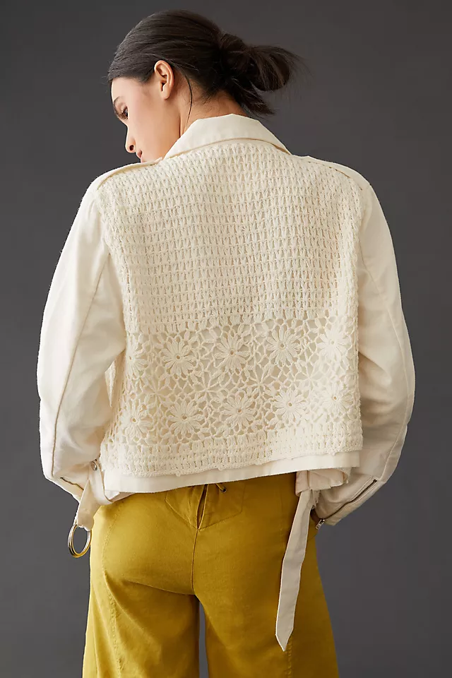 Kurtka motocyklowa z płótna szydełkowego firmy Anthropologie.