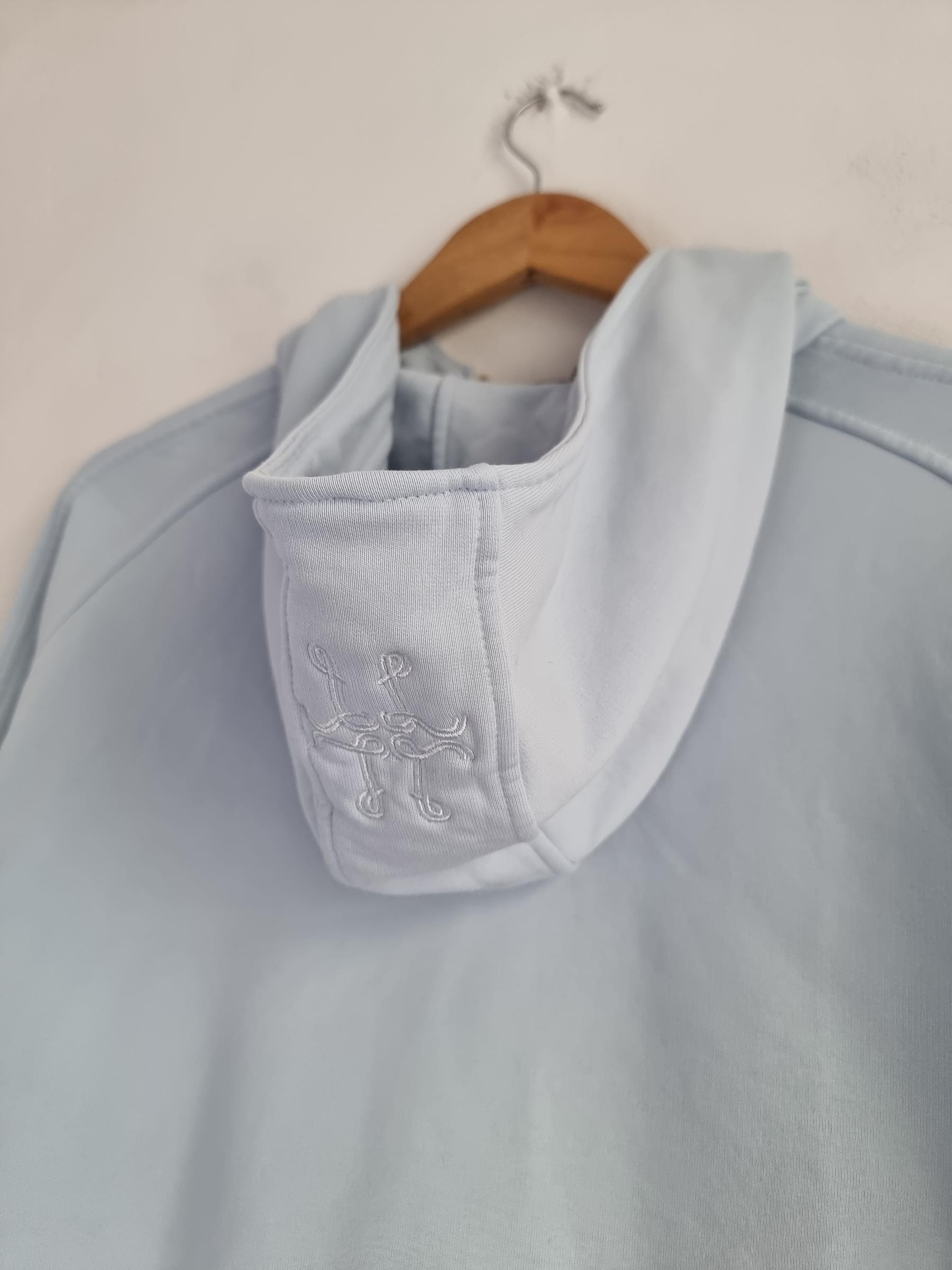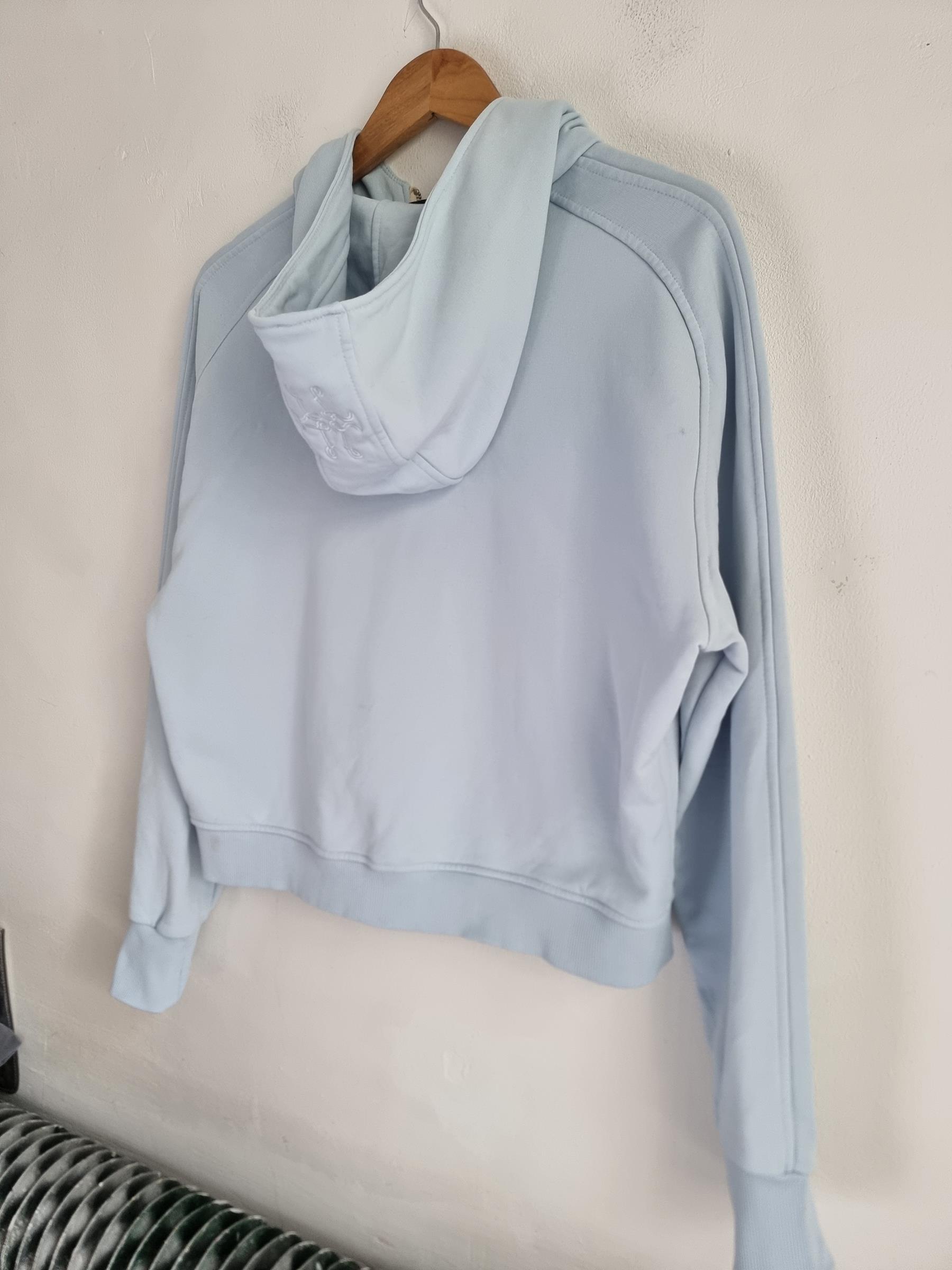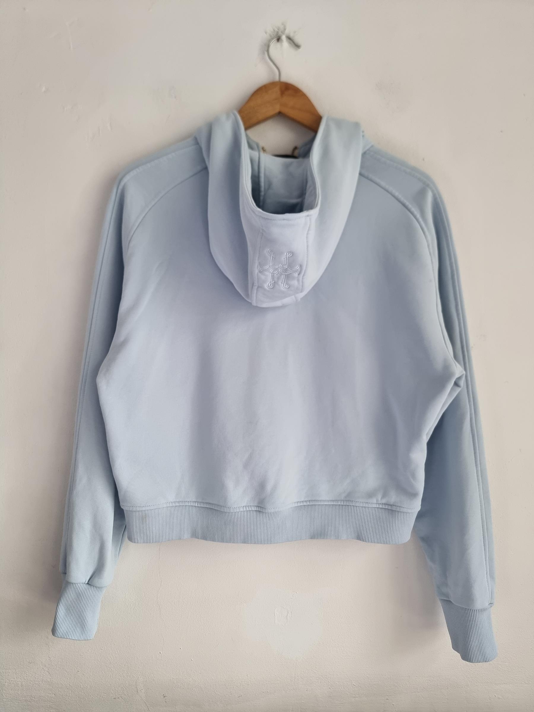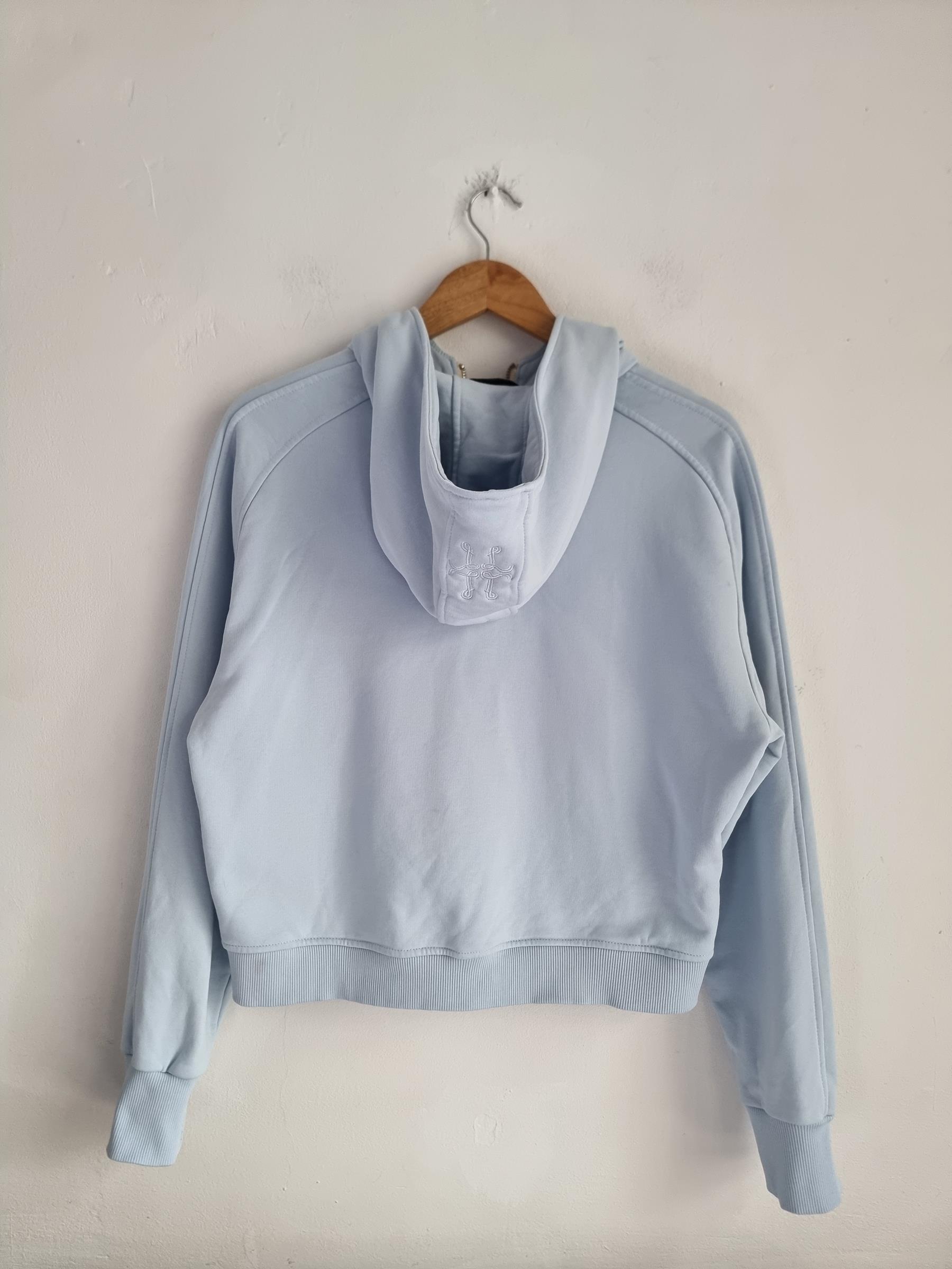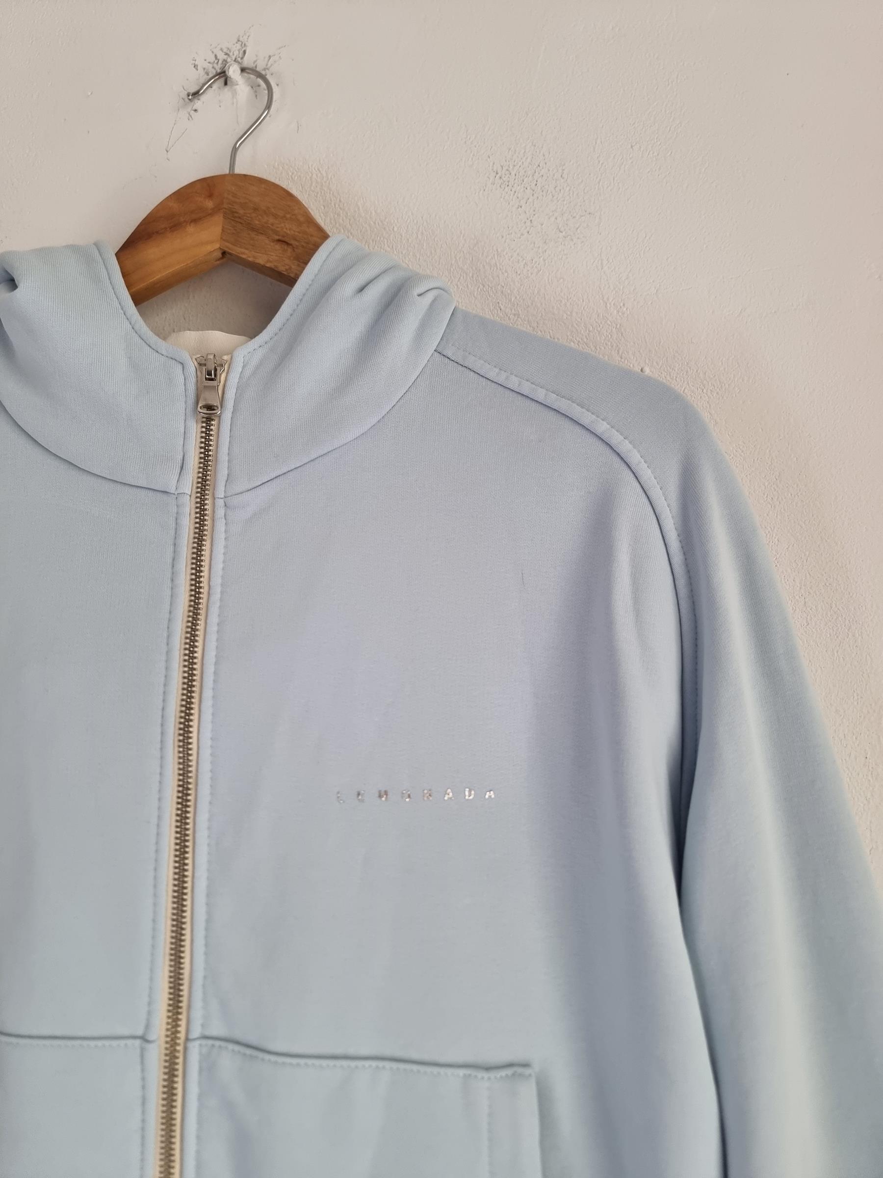 Błękitna bawełniana bluza z kapturem zapinana na zamek .