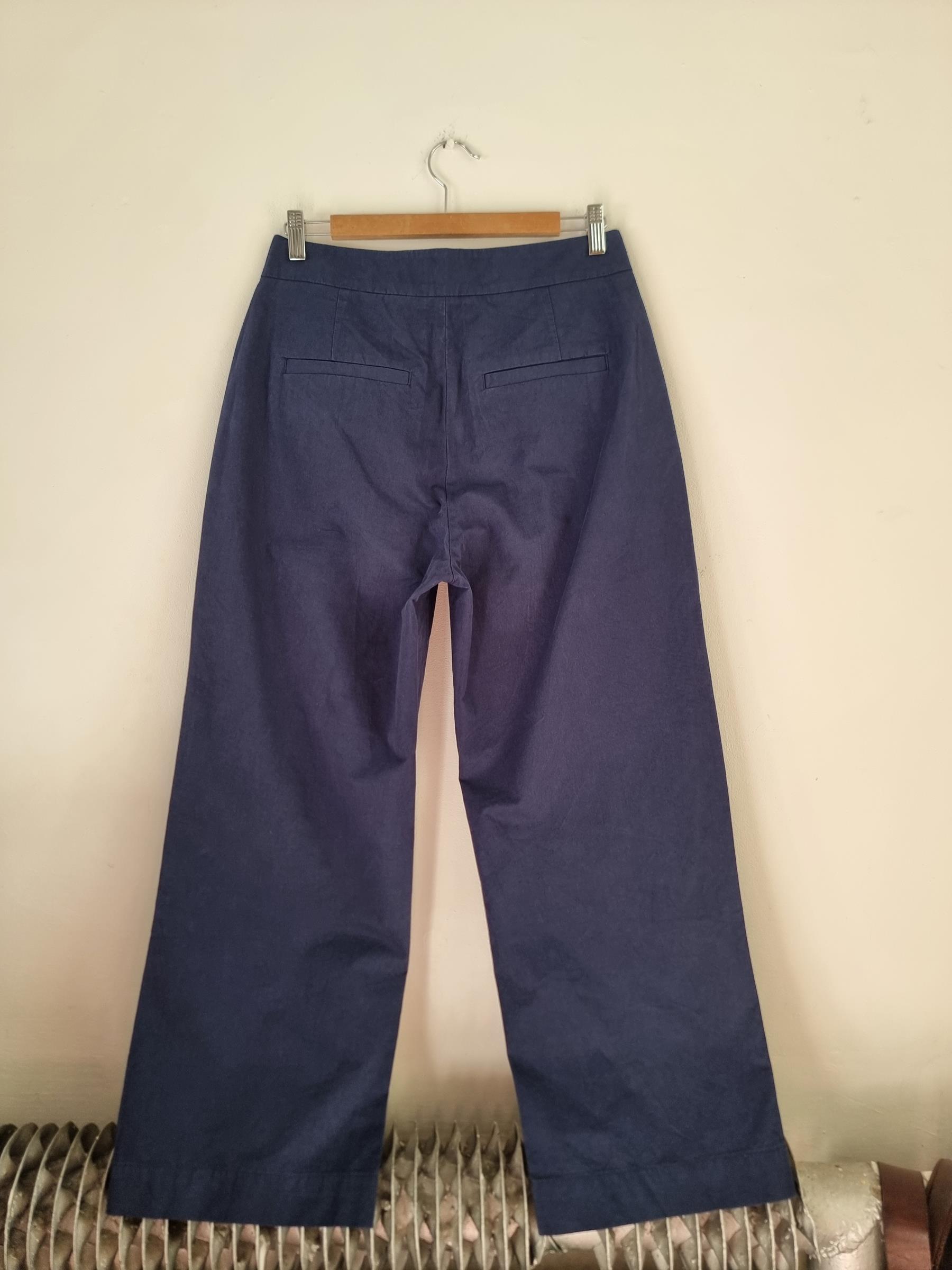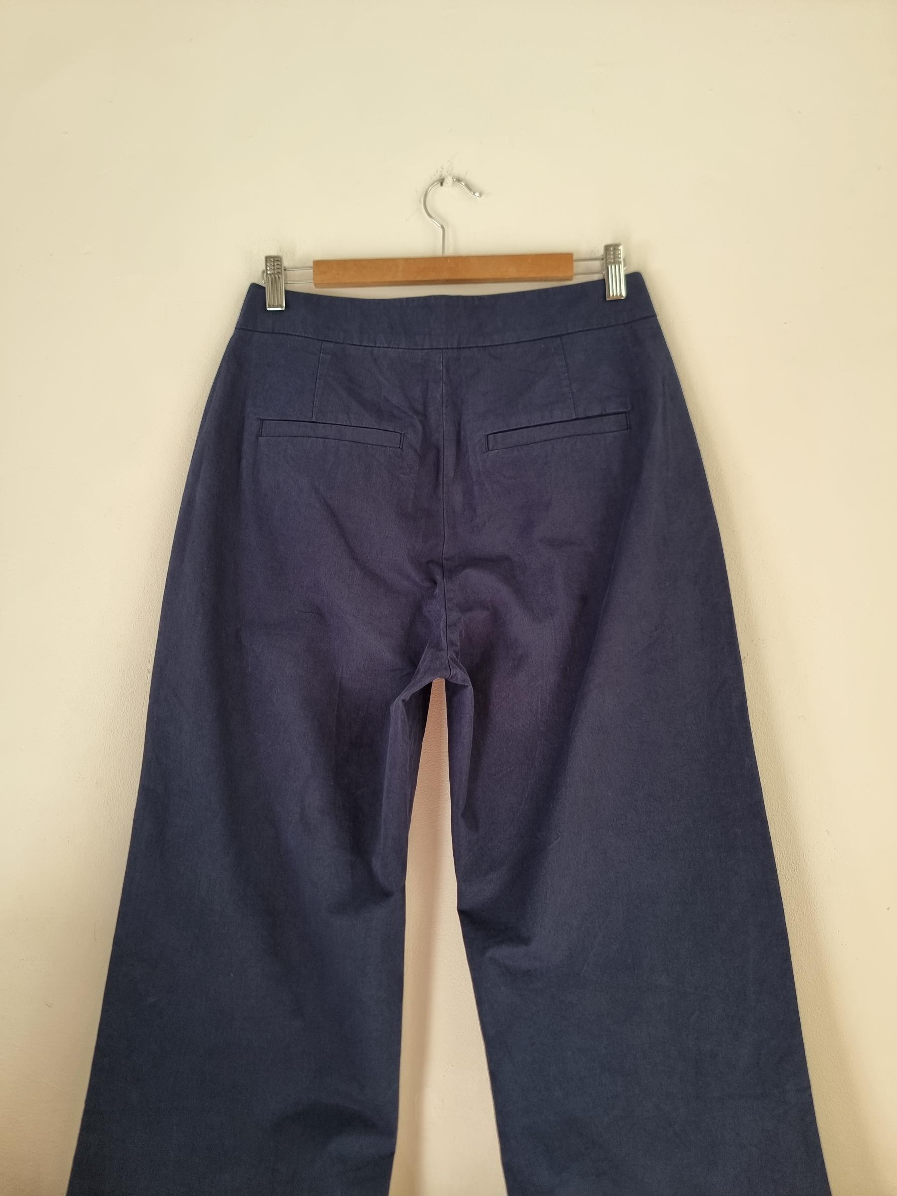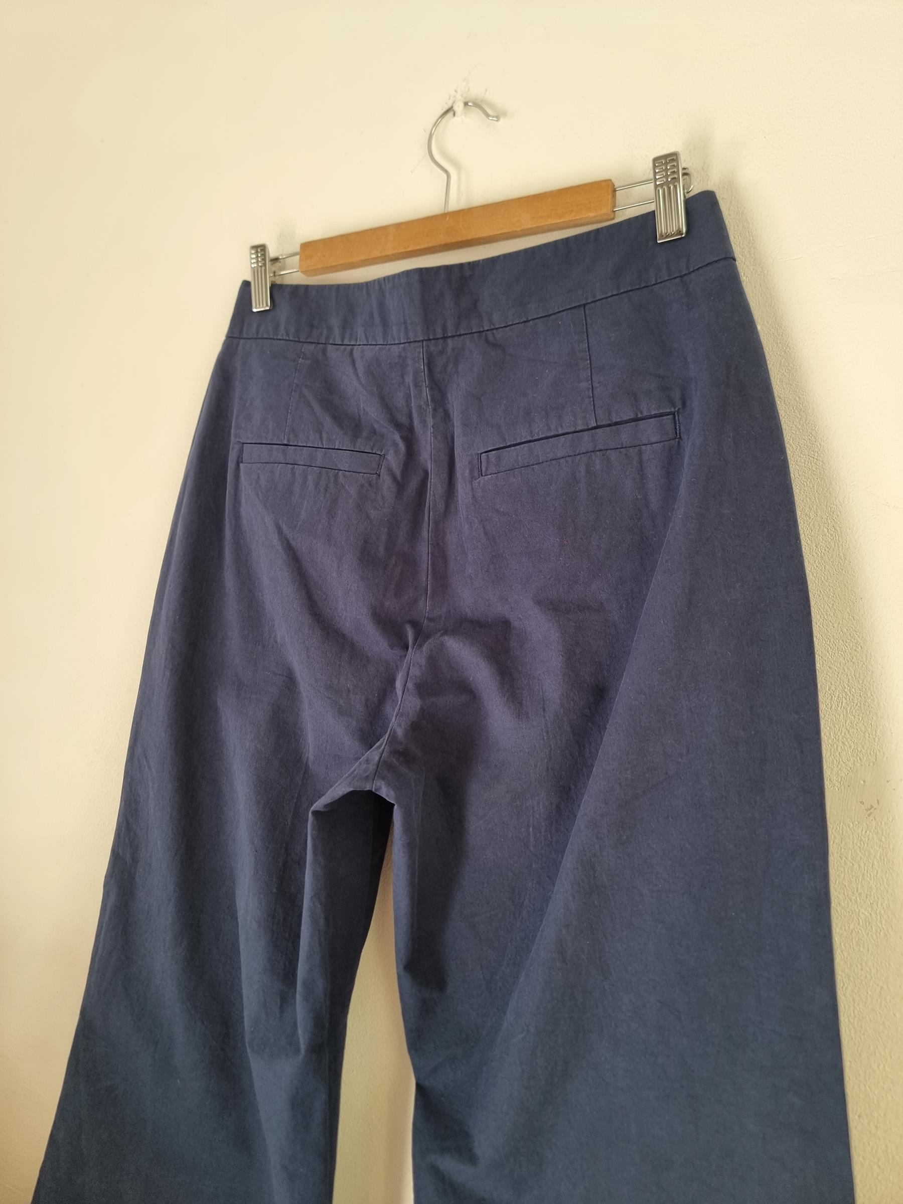 Bawełniane granatowe spodnie. Sztywna talia z zapieciem na zamek i guzik. Szersza prosta nogawka.