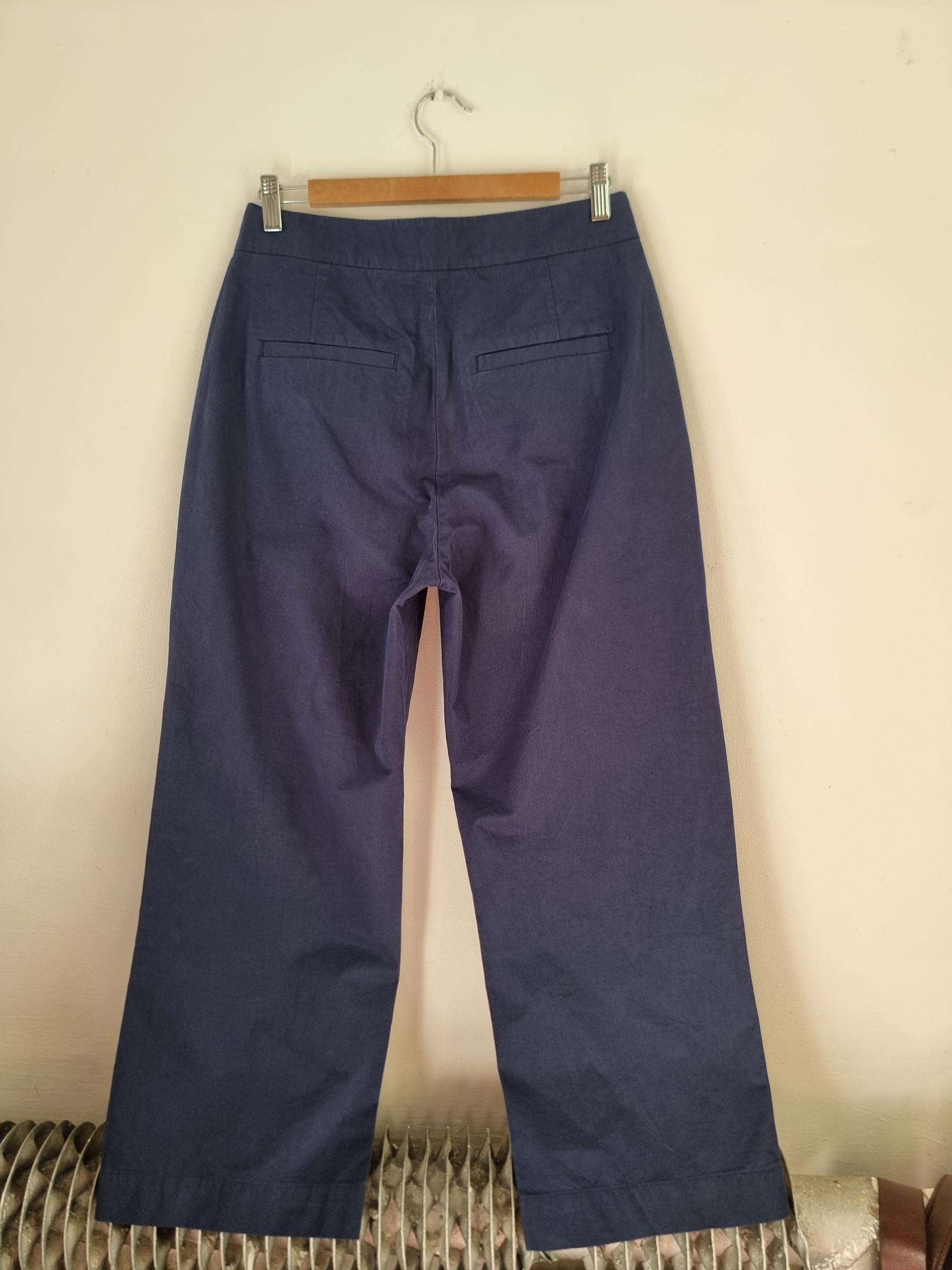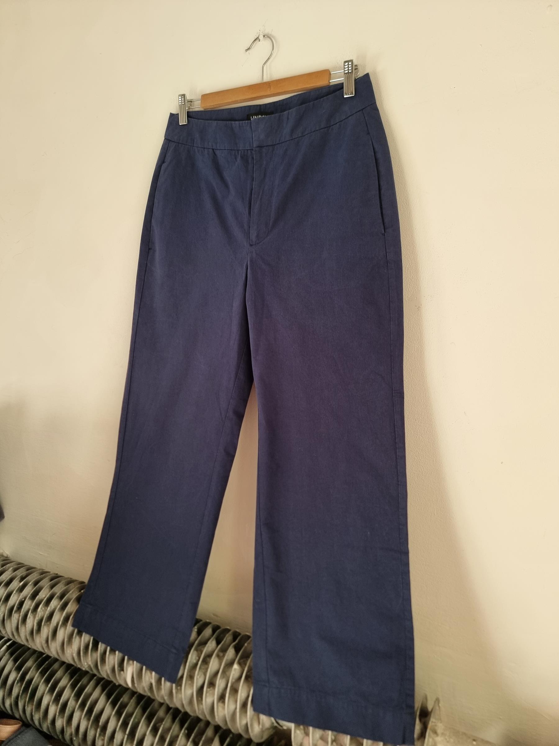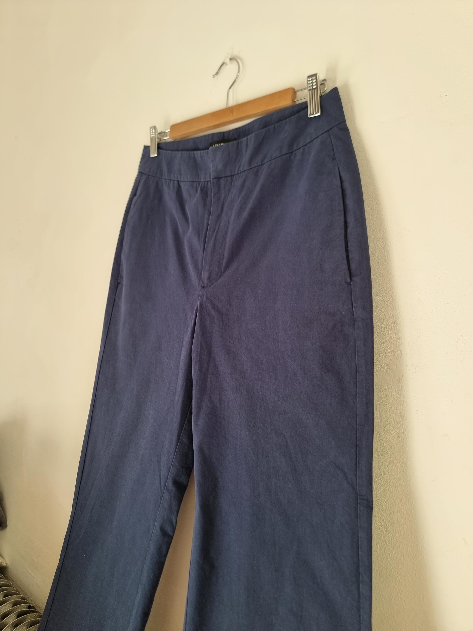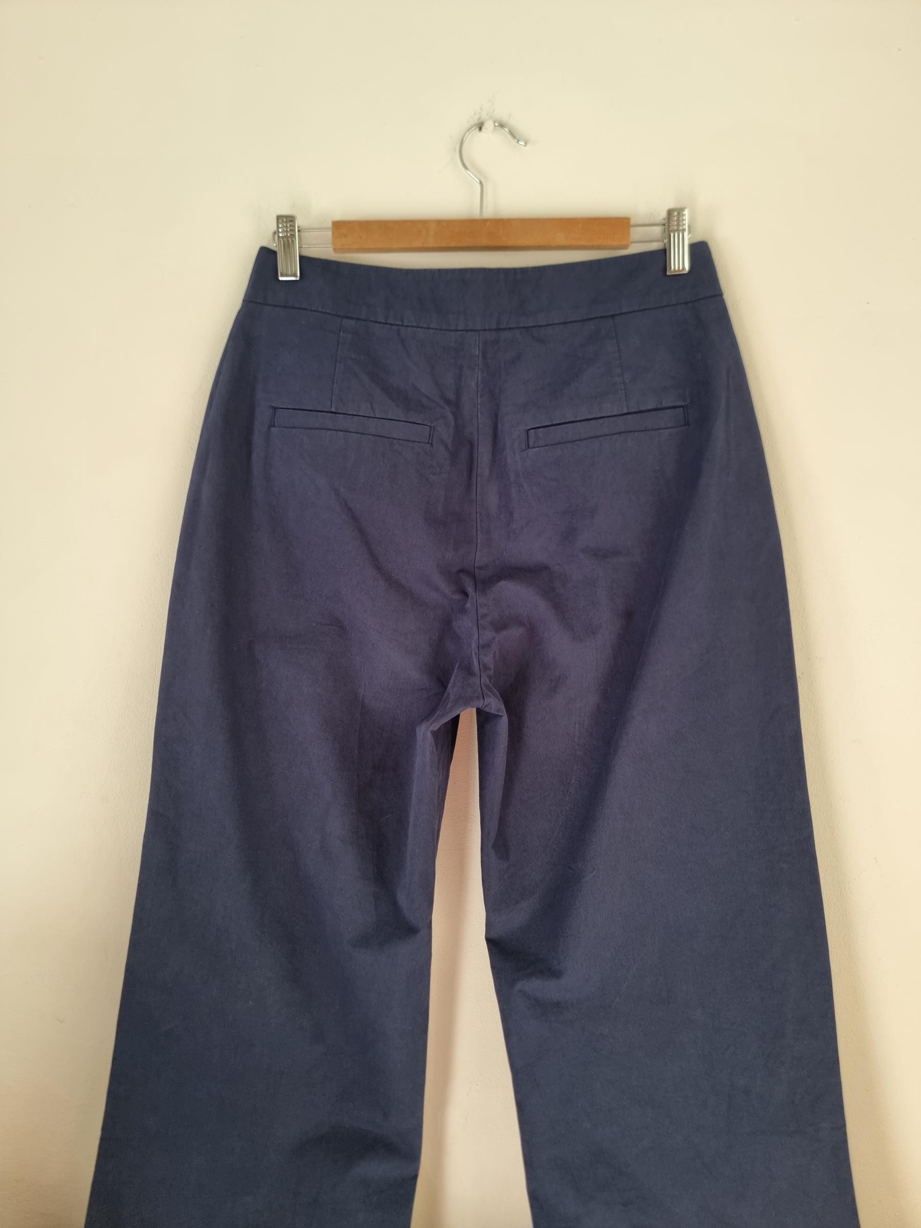 Bawełniane granatowe spodnie. Sztywna talia z zapieciem na zamek i guzik. Szersza prosta nogawka.