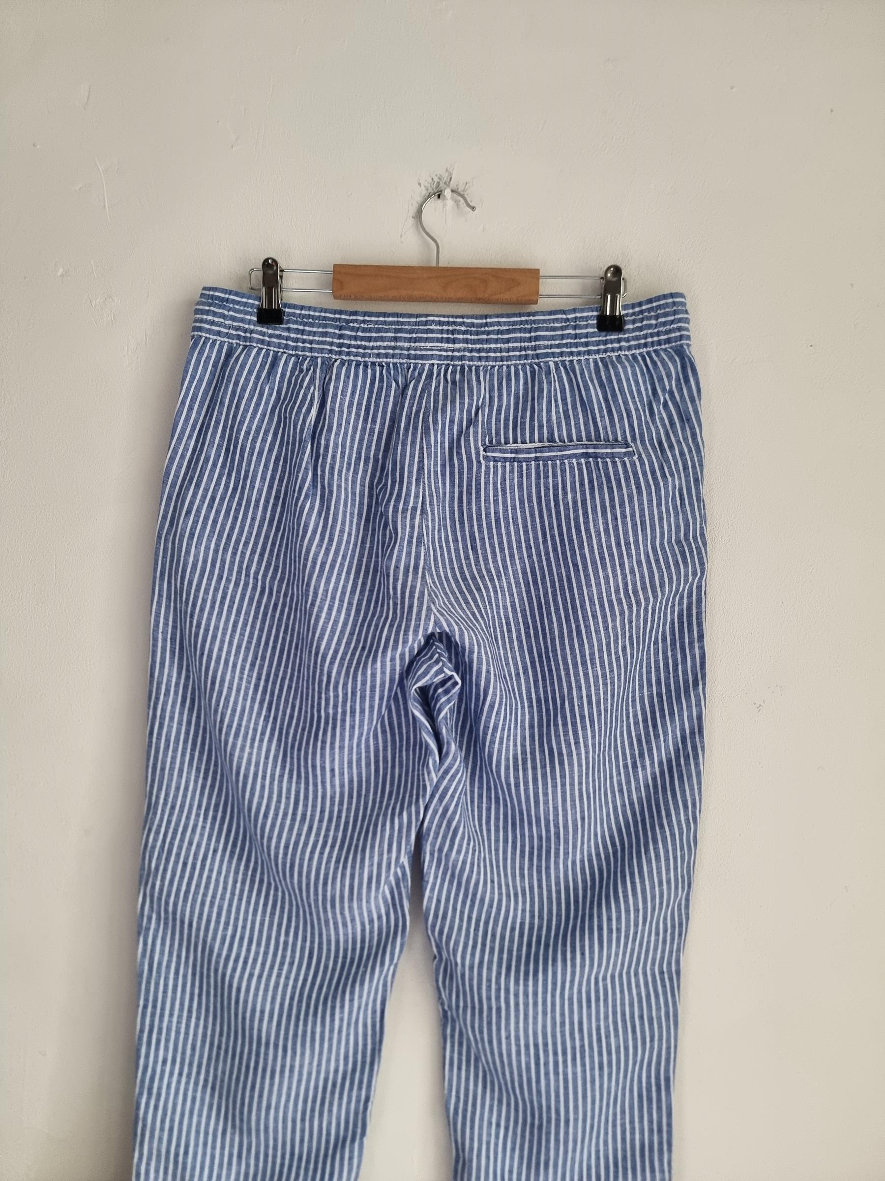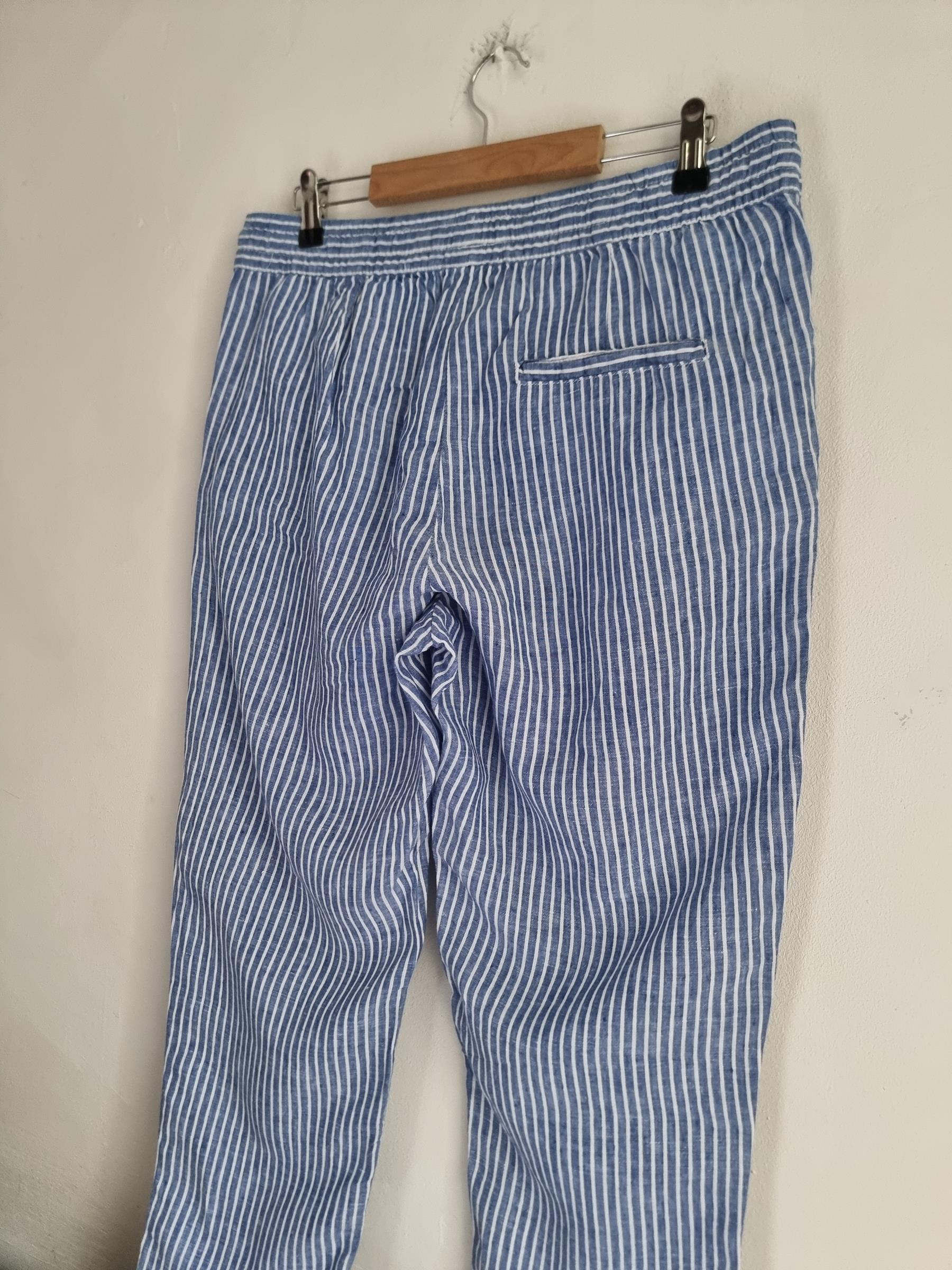 Lniane spodnie niebieskie w białe paski. W pasie gumka. Posiadają kieszenie.
