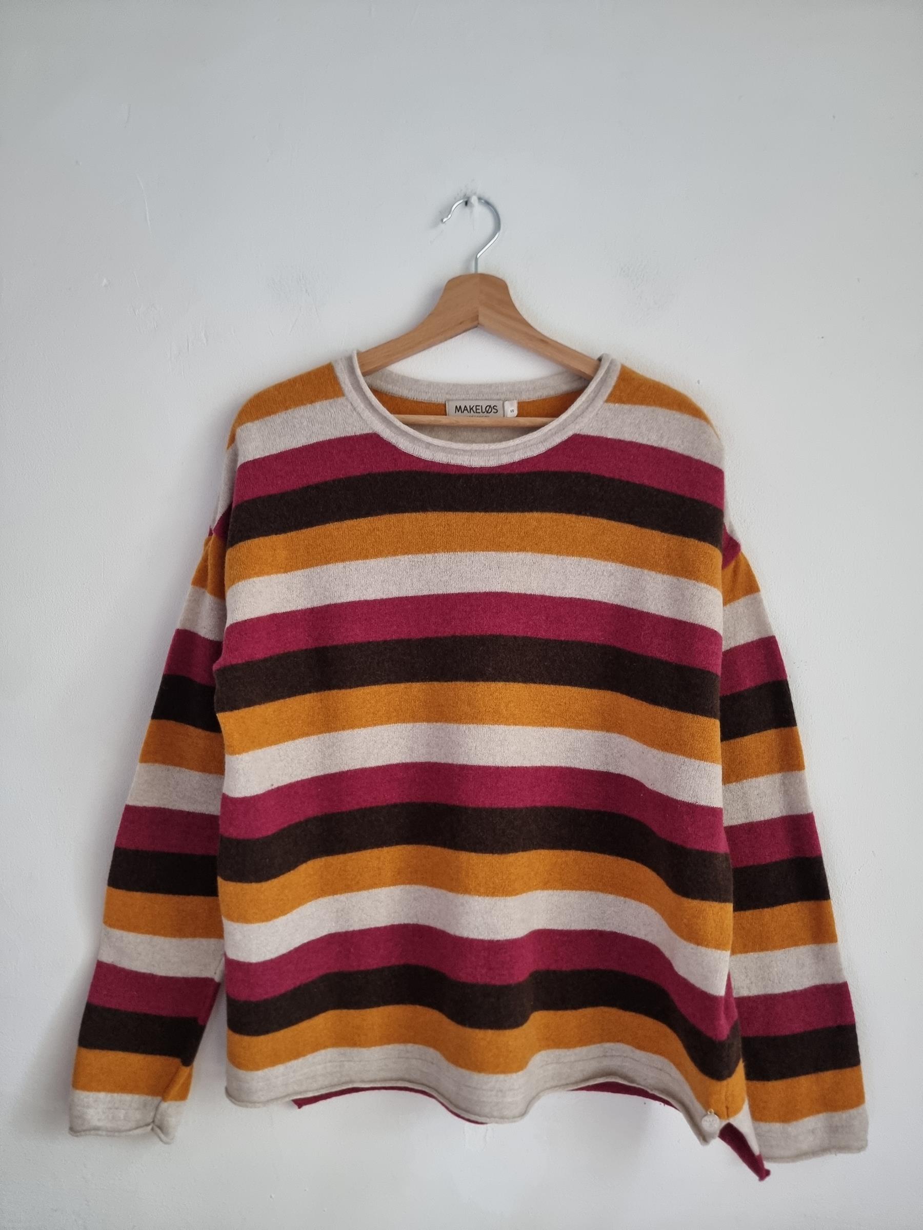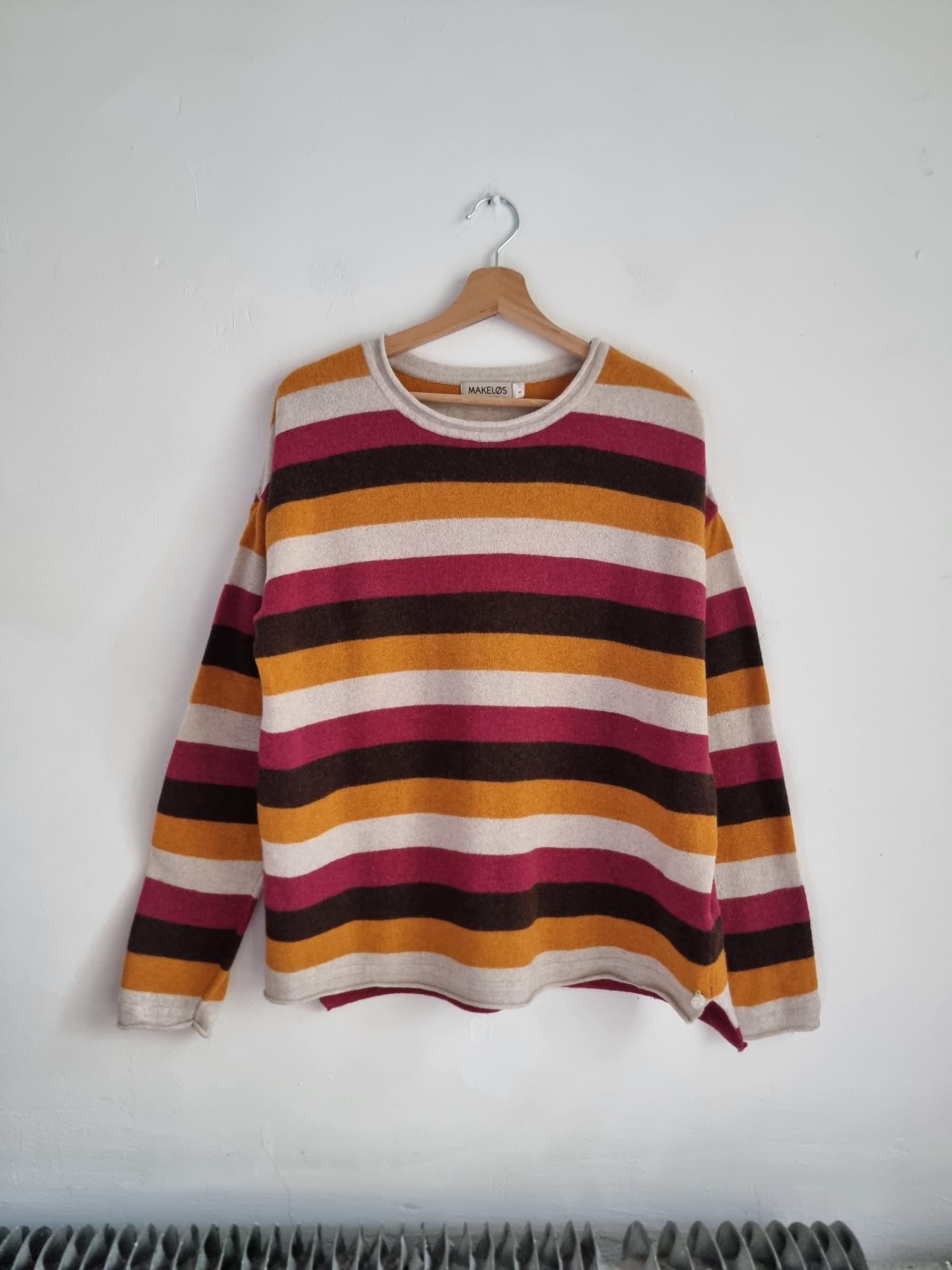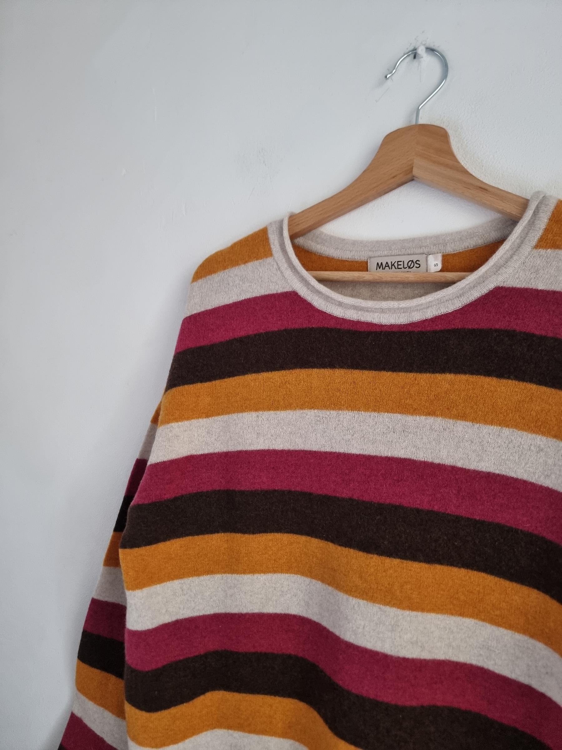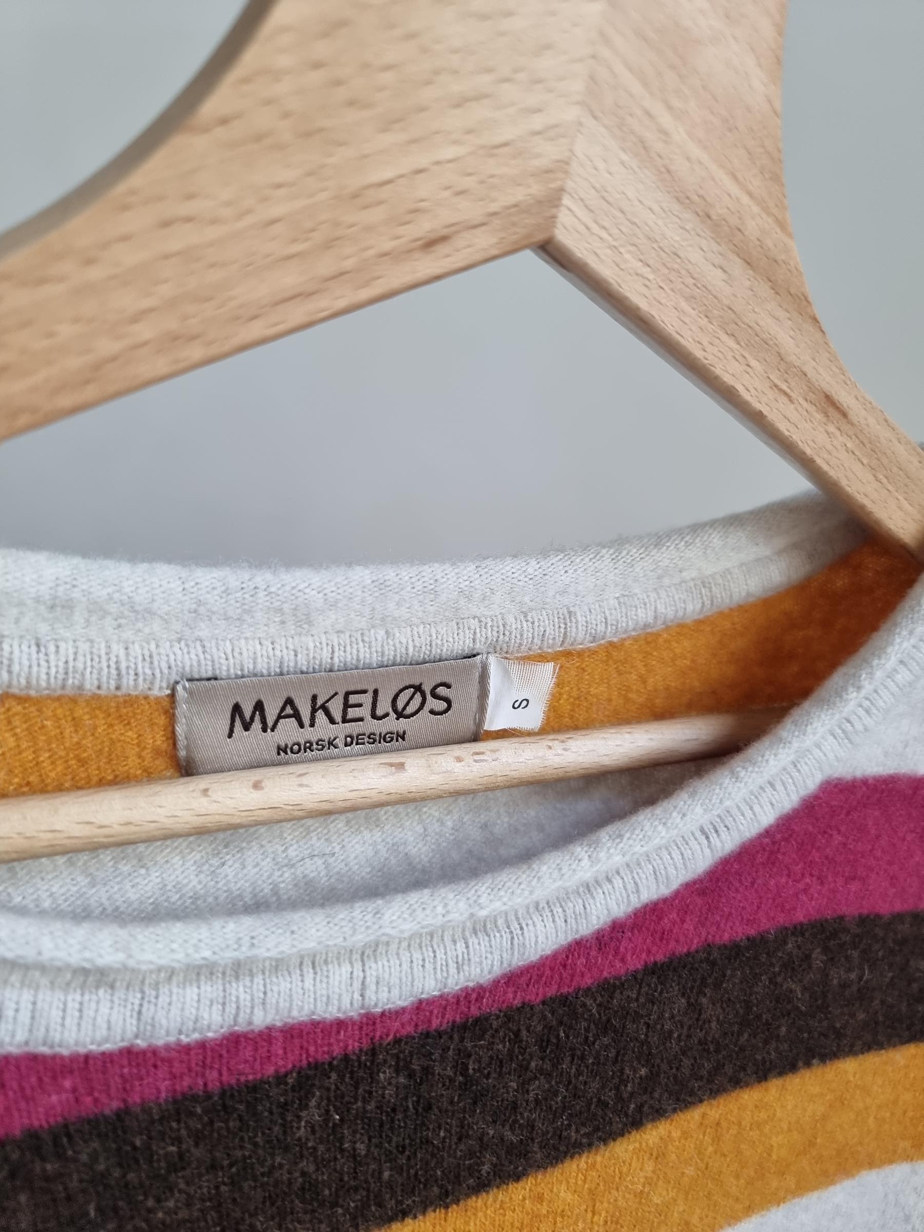 Świetnej jakości wełniany sweter w paski norweskiej marki MAKELOS.
