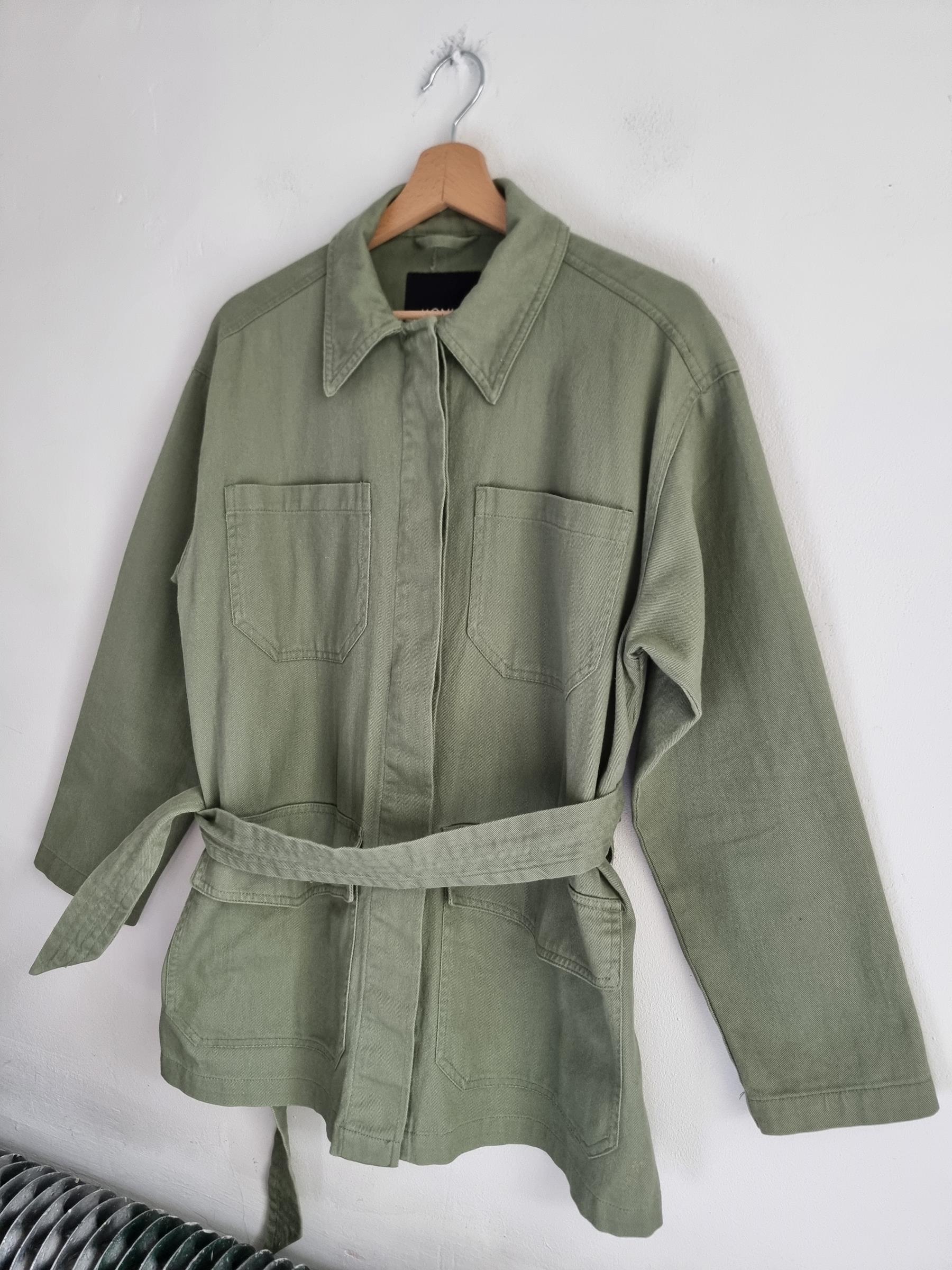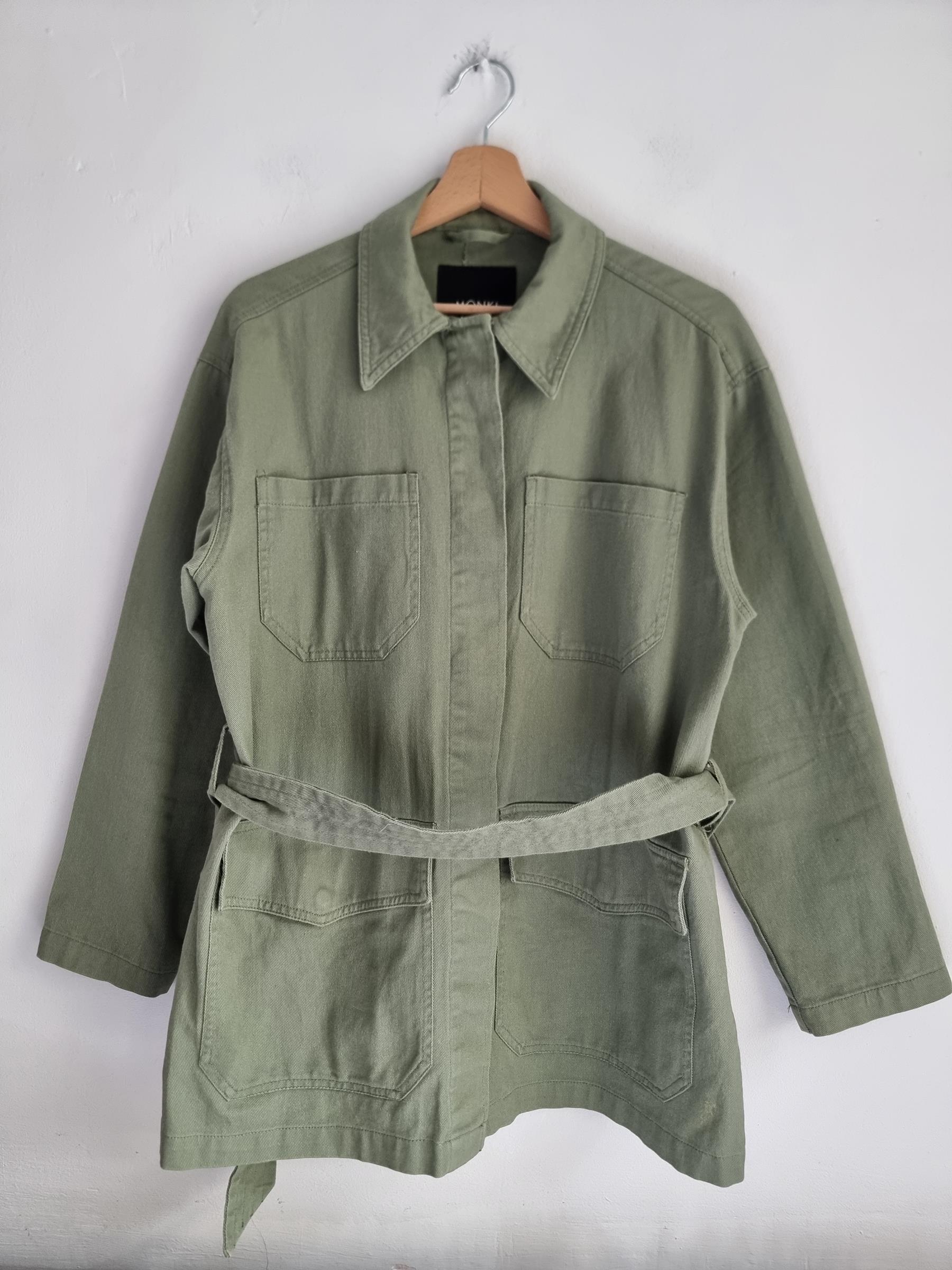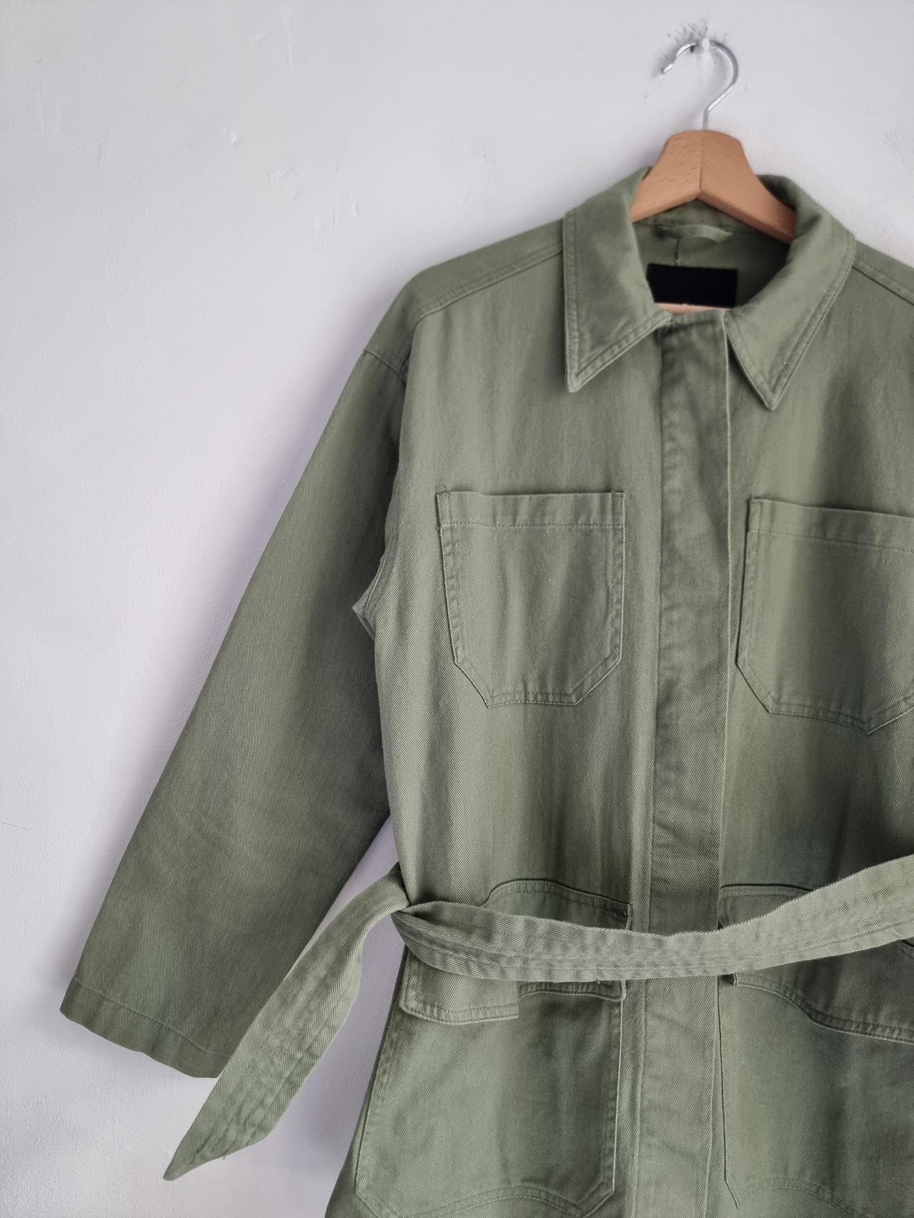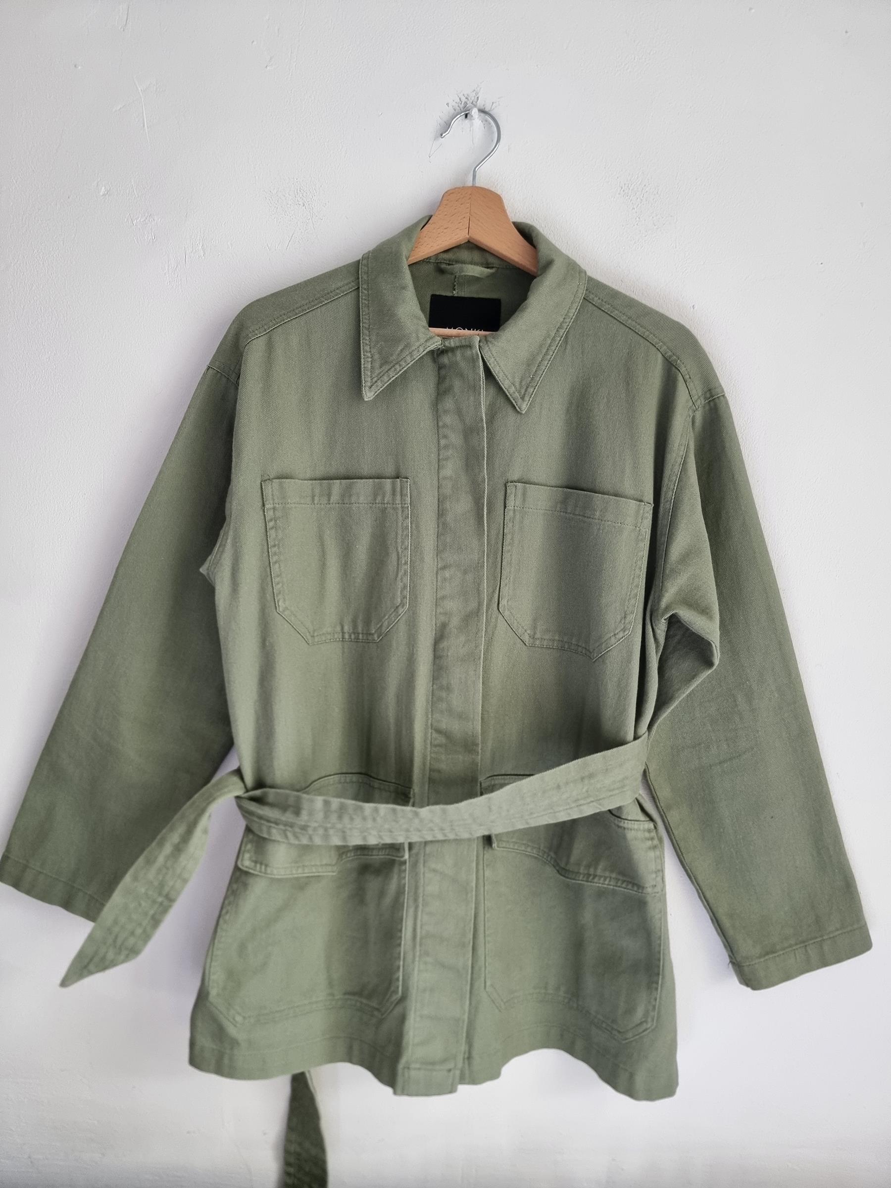 Zielona wojskowa katana z wiązaniem w talii. Duże kieszenie z przodu.  Płaszcz Monki Utility Parka Duvet Coat.
