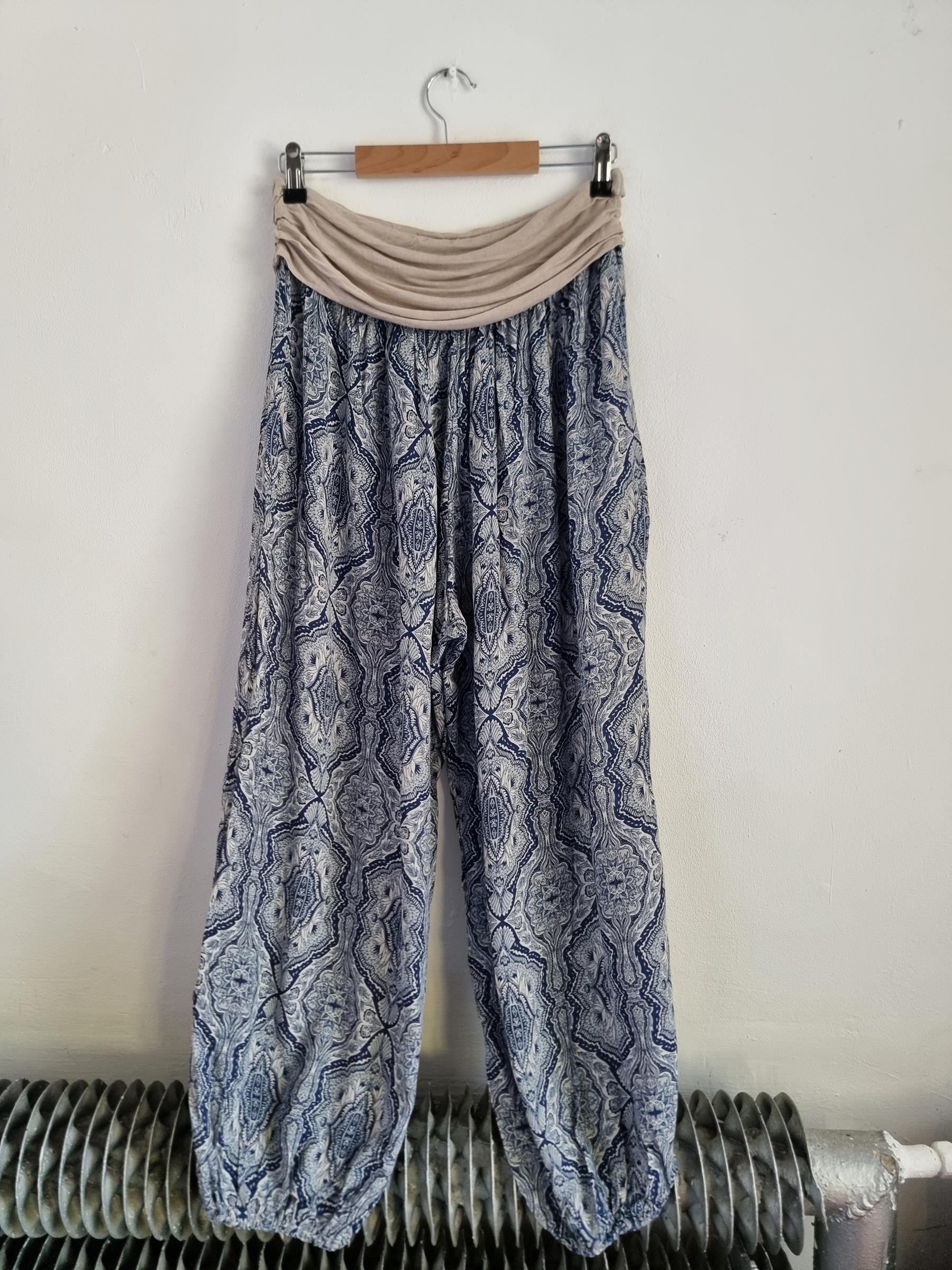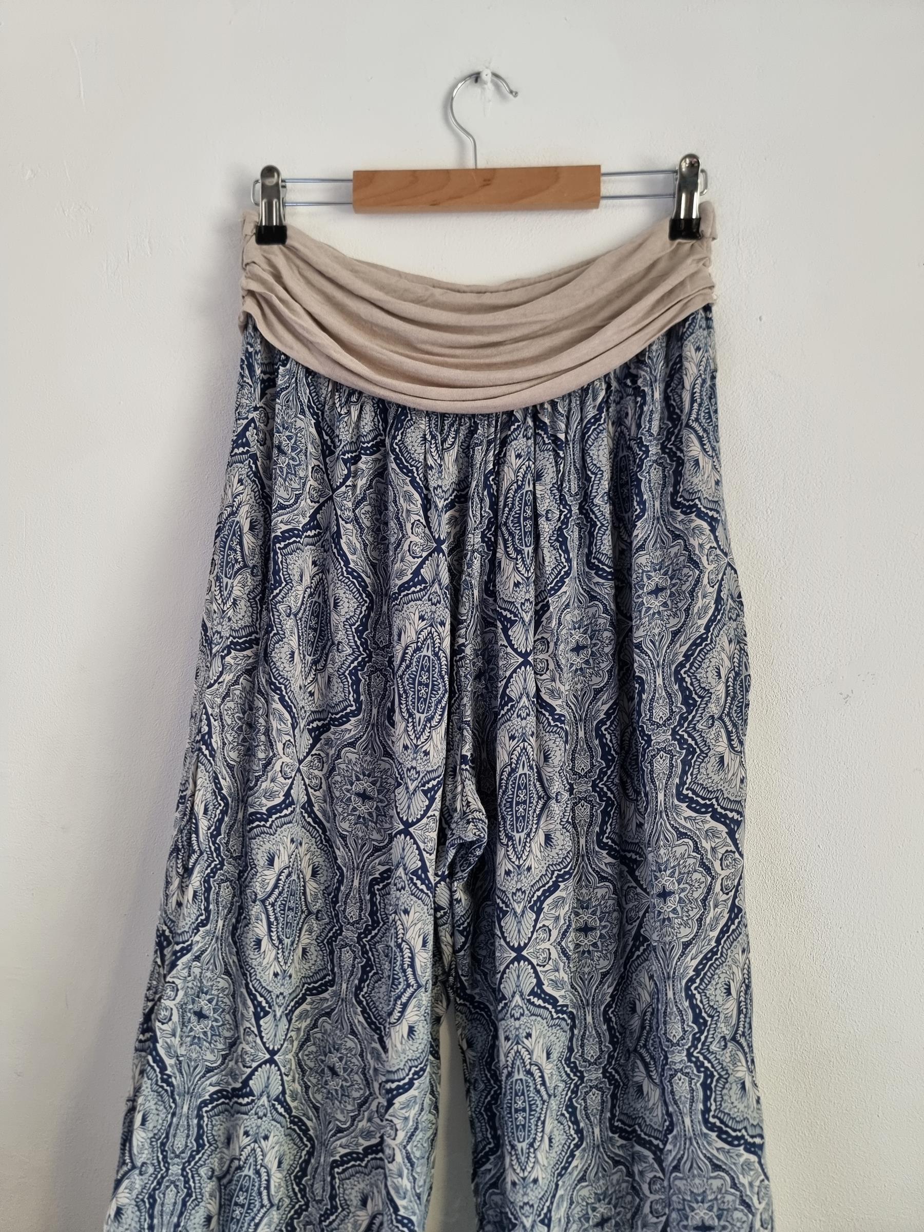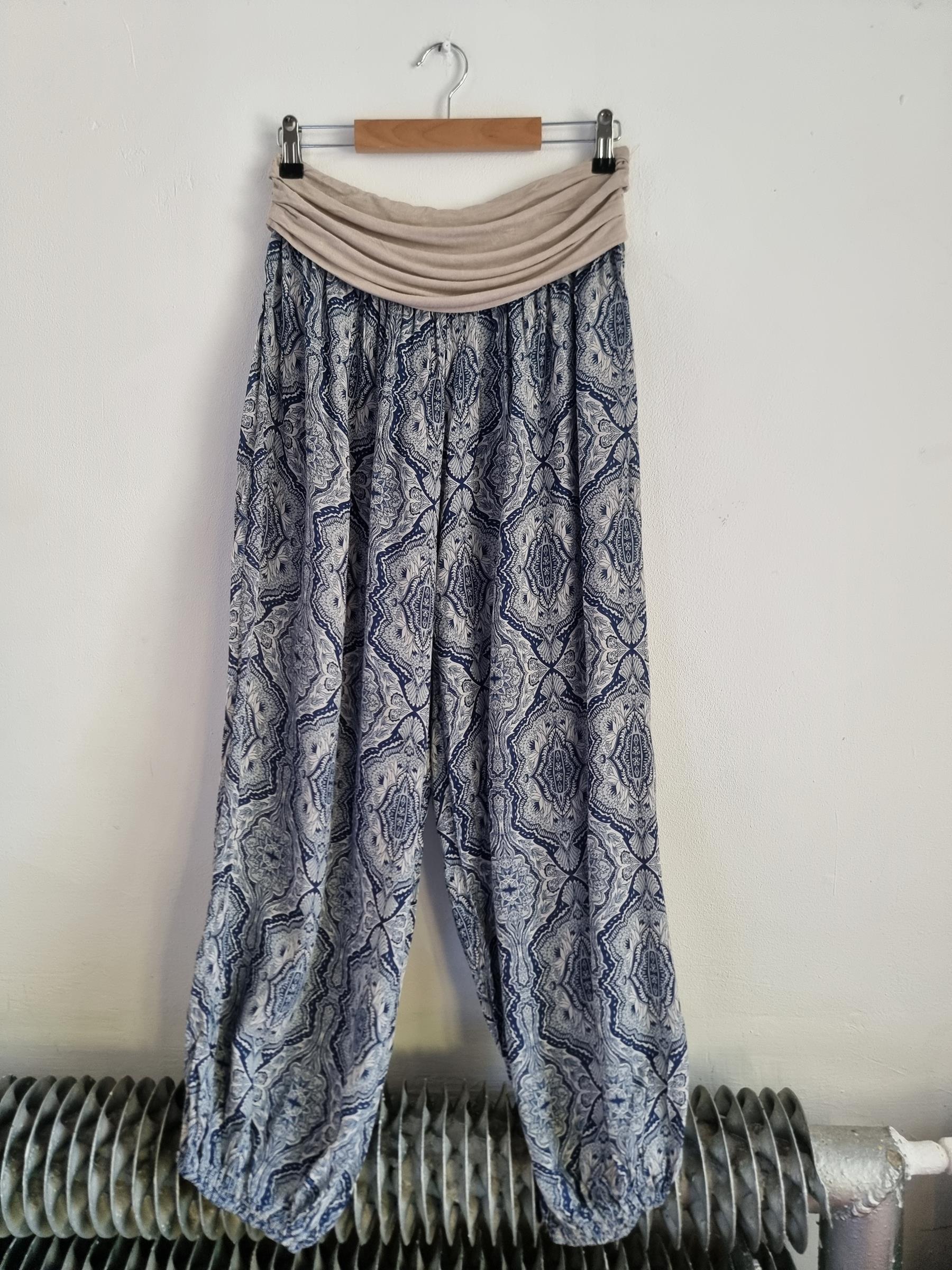 Wiskozowe wzorzyste letnie spodnie haremki. Ugóry szeroka guma.