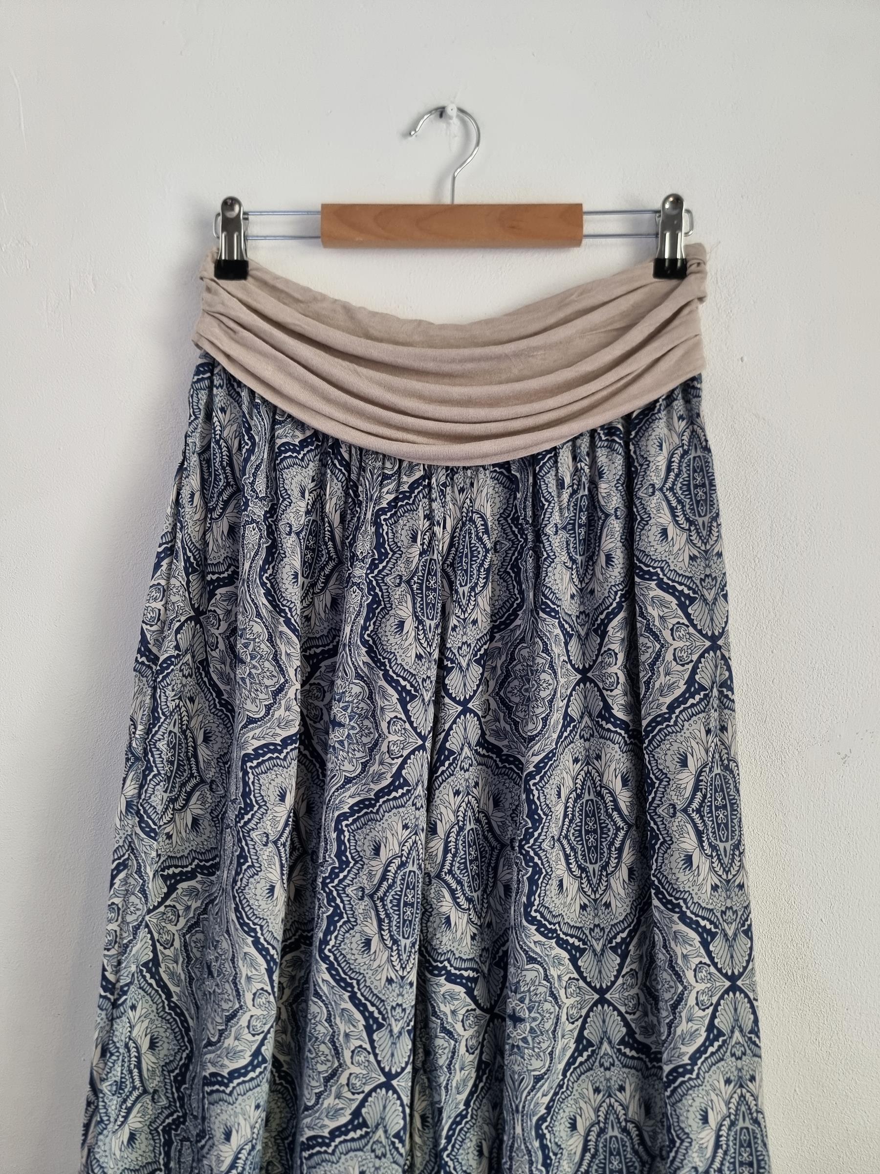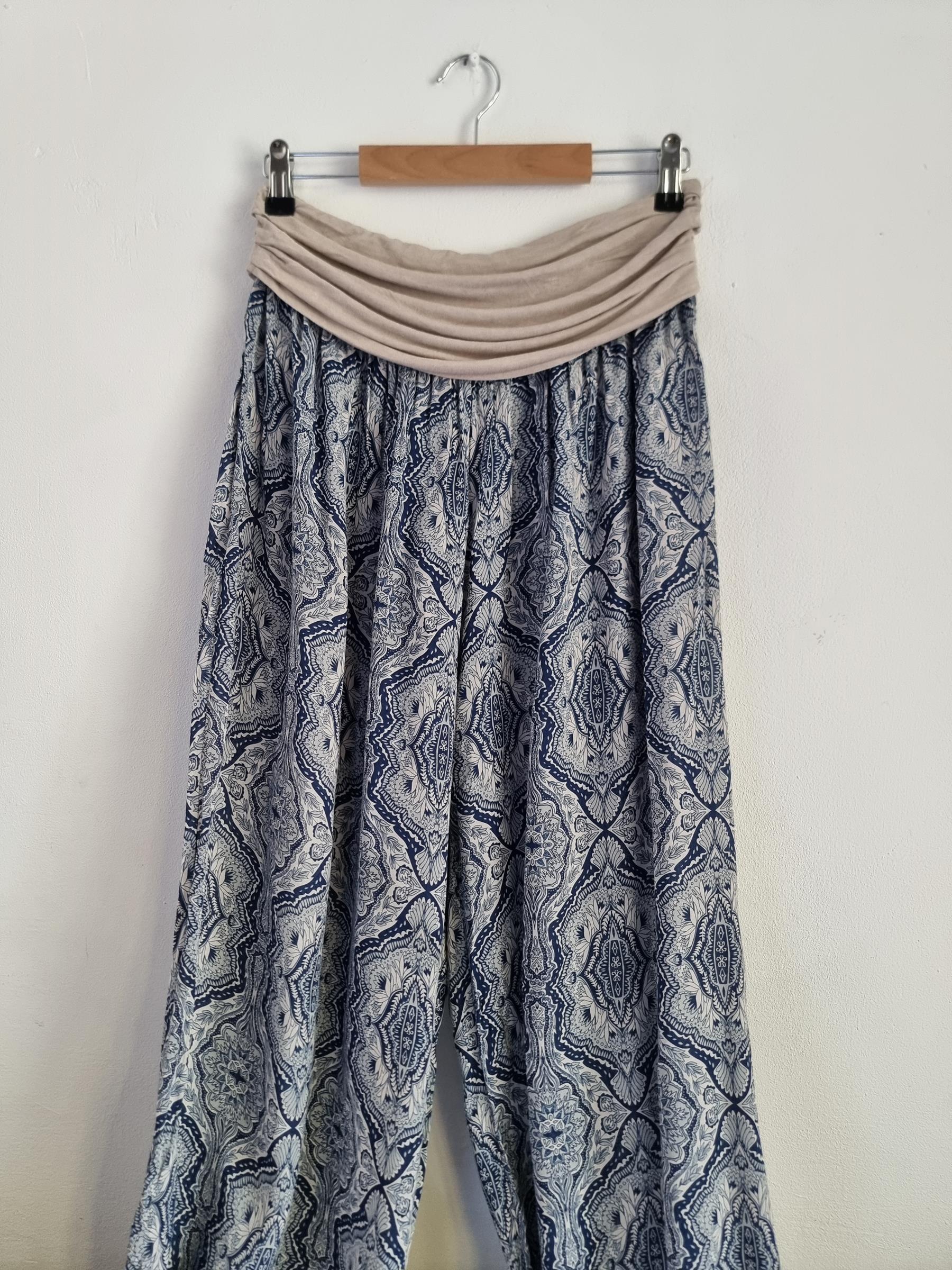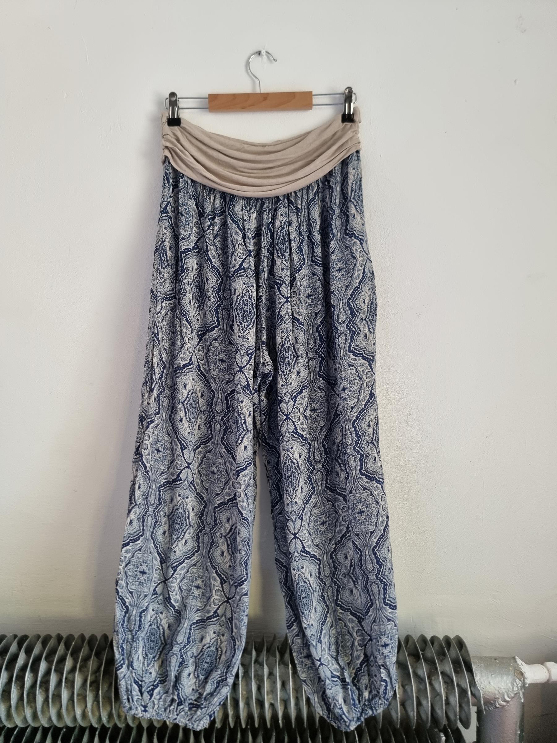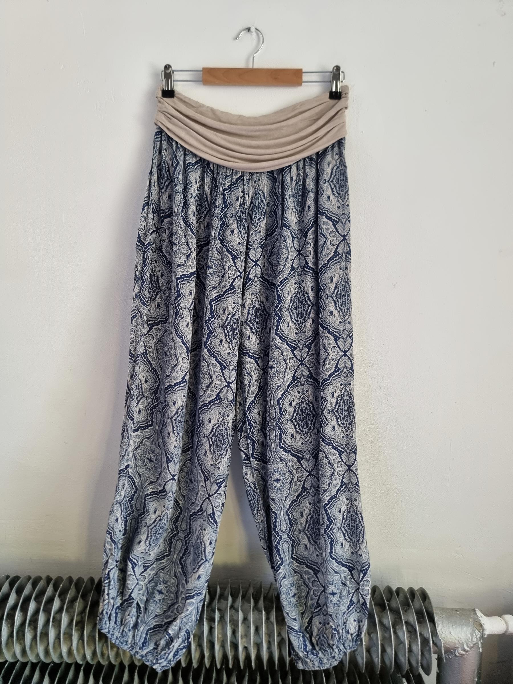 Wiskozowe wzorzyste letnie spodnie haremki. Ugóry szeroka guma.