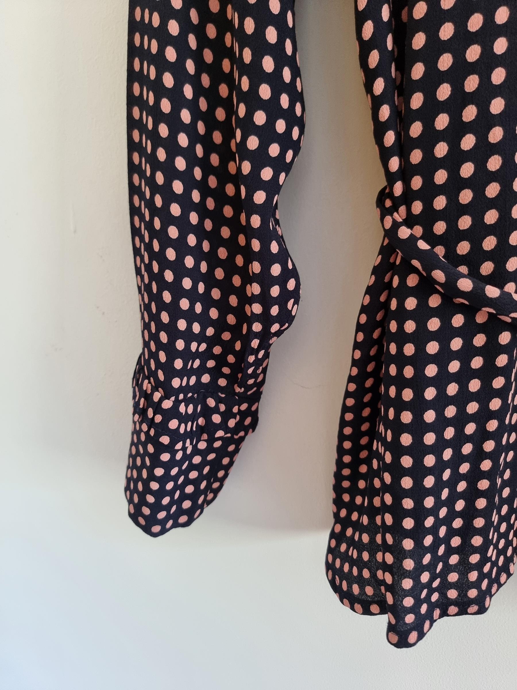 Wiskozowa narzutka w kolorze granatowym w kropki w kolorze pudrowego różu. Wiązanie w talii.