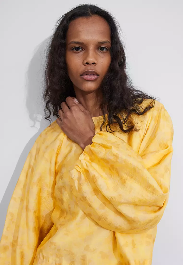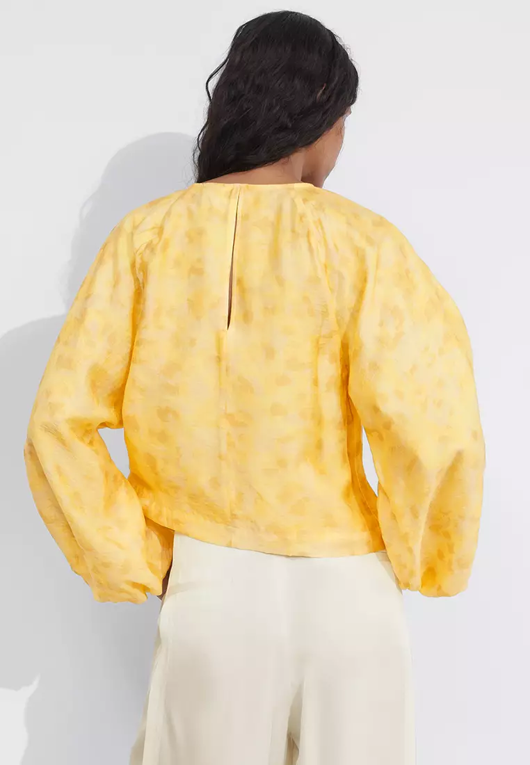 Bluzka z długim rękawem, okrągłym dekoltem i bufiastymi rękawami wykończonymi marszczeniami w kolorze żółtym