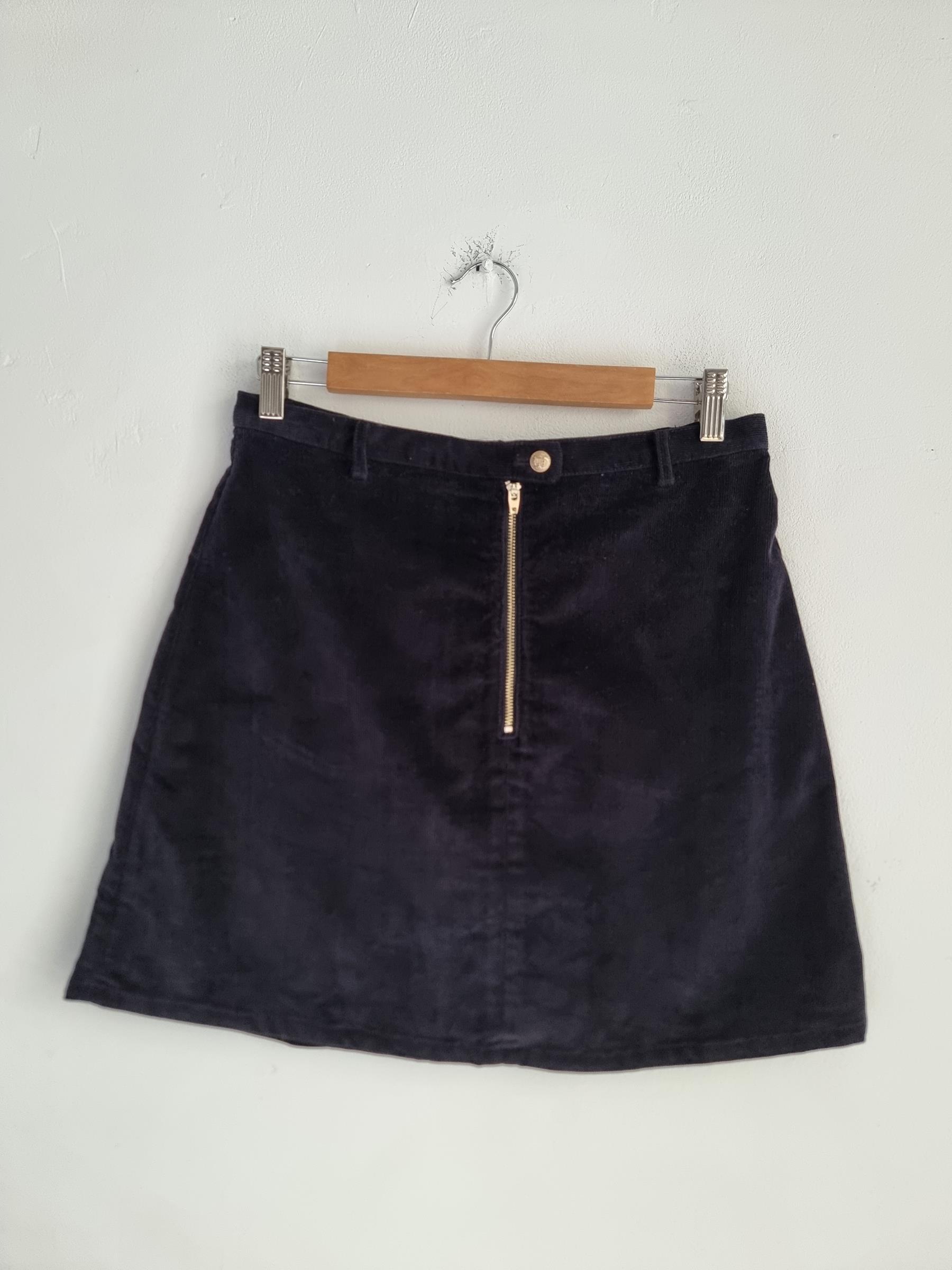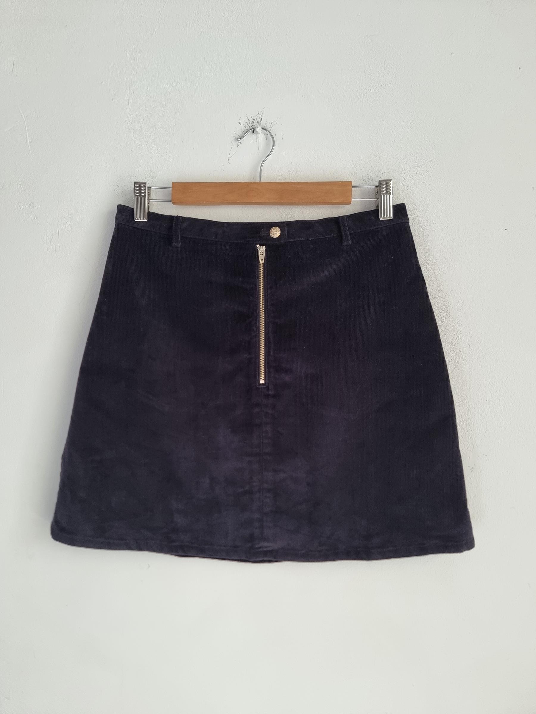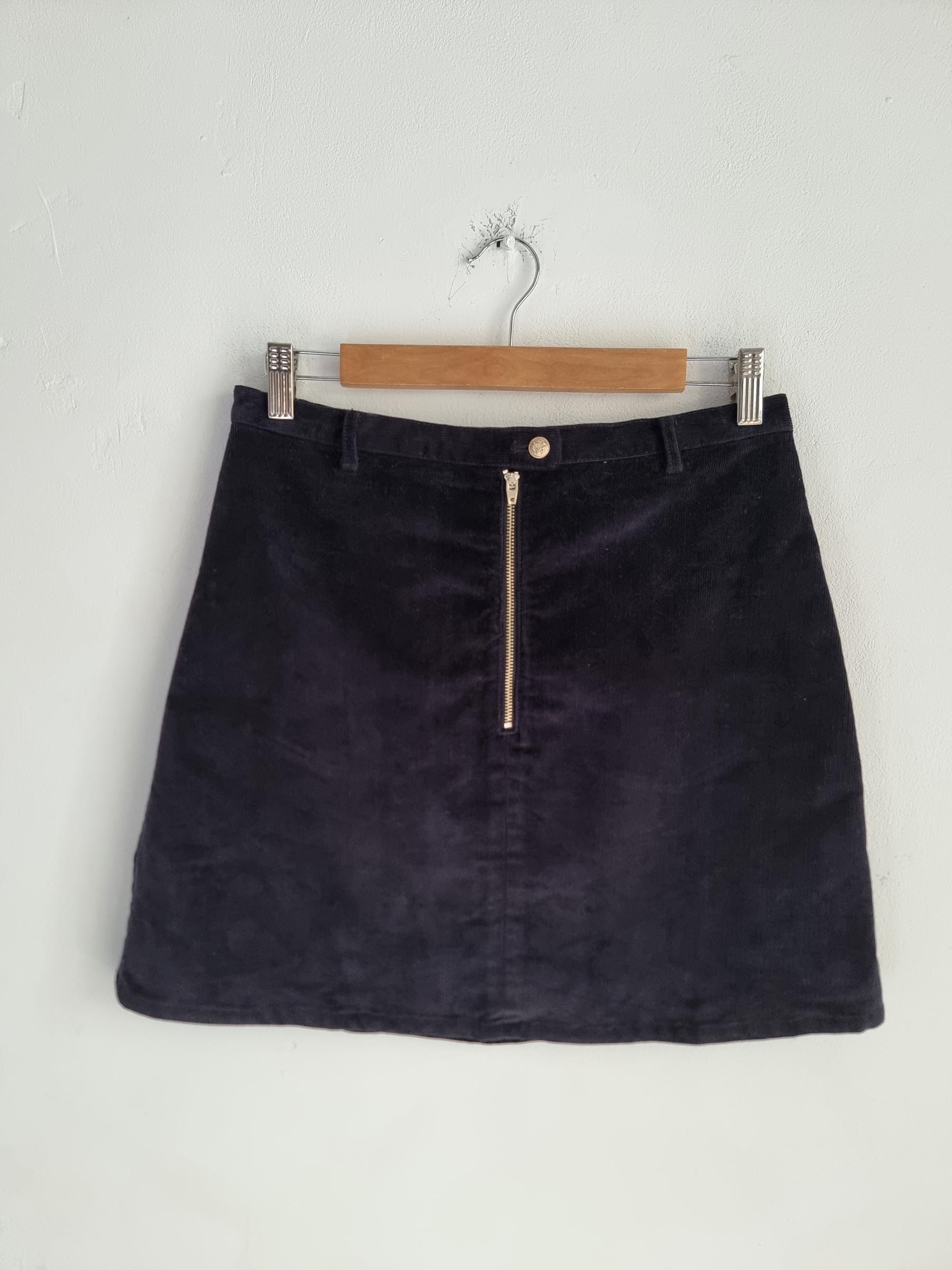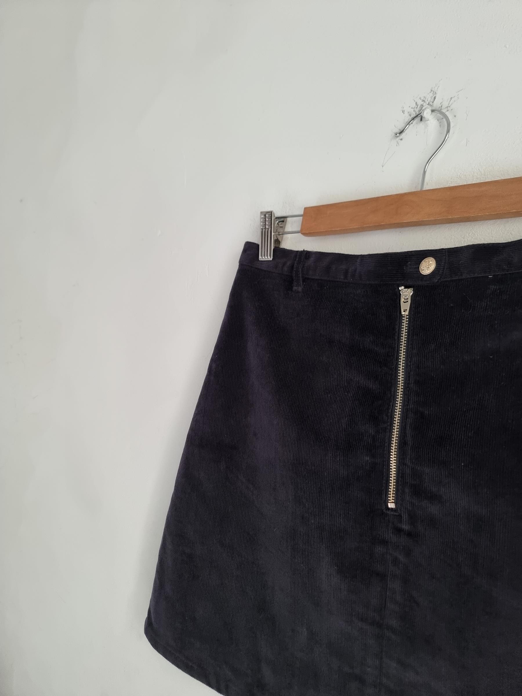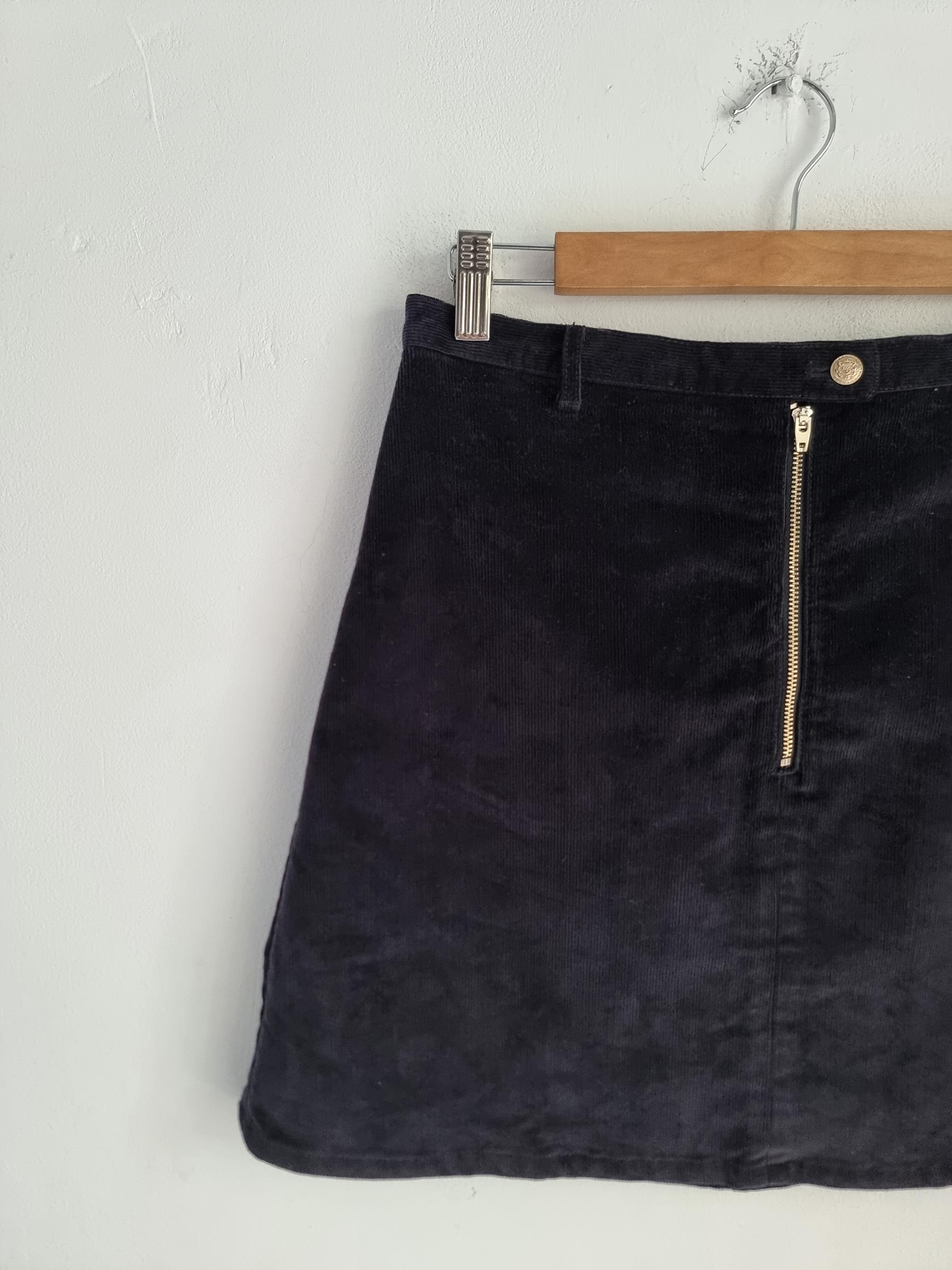 Krótka sztruksowa spódnica. Zapinana na guzik i zamek w pasie.