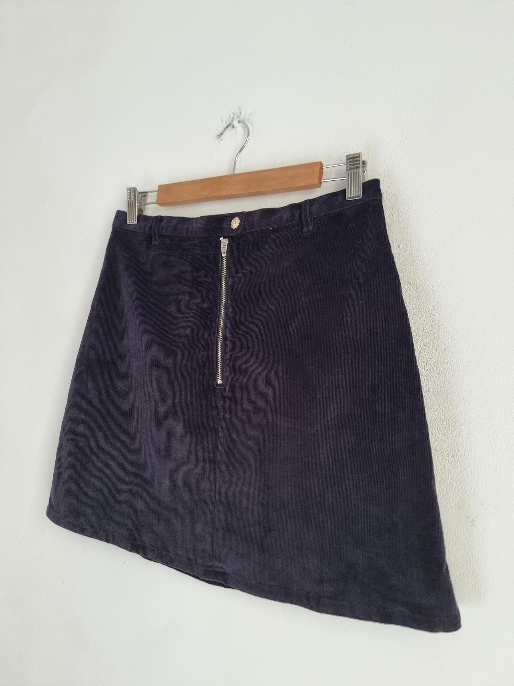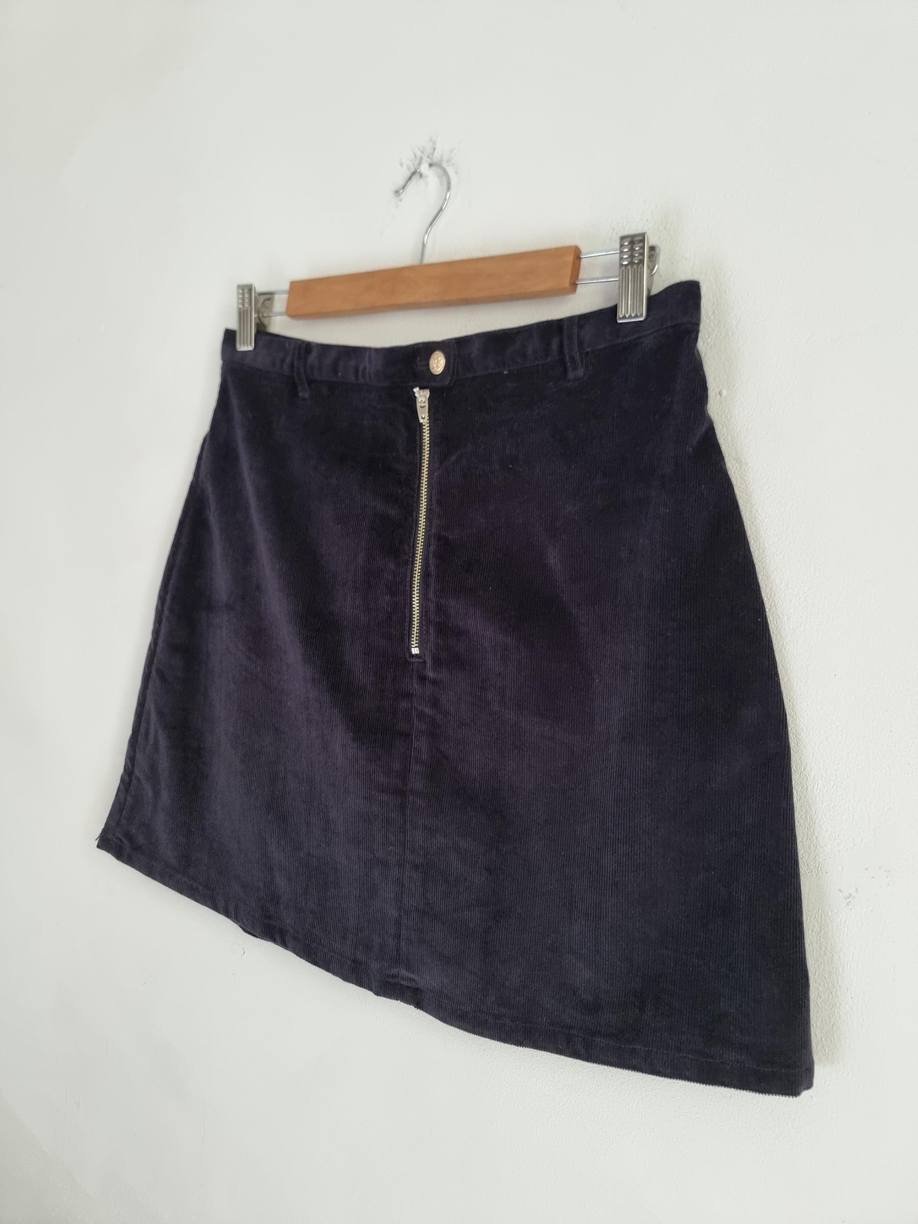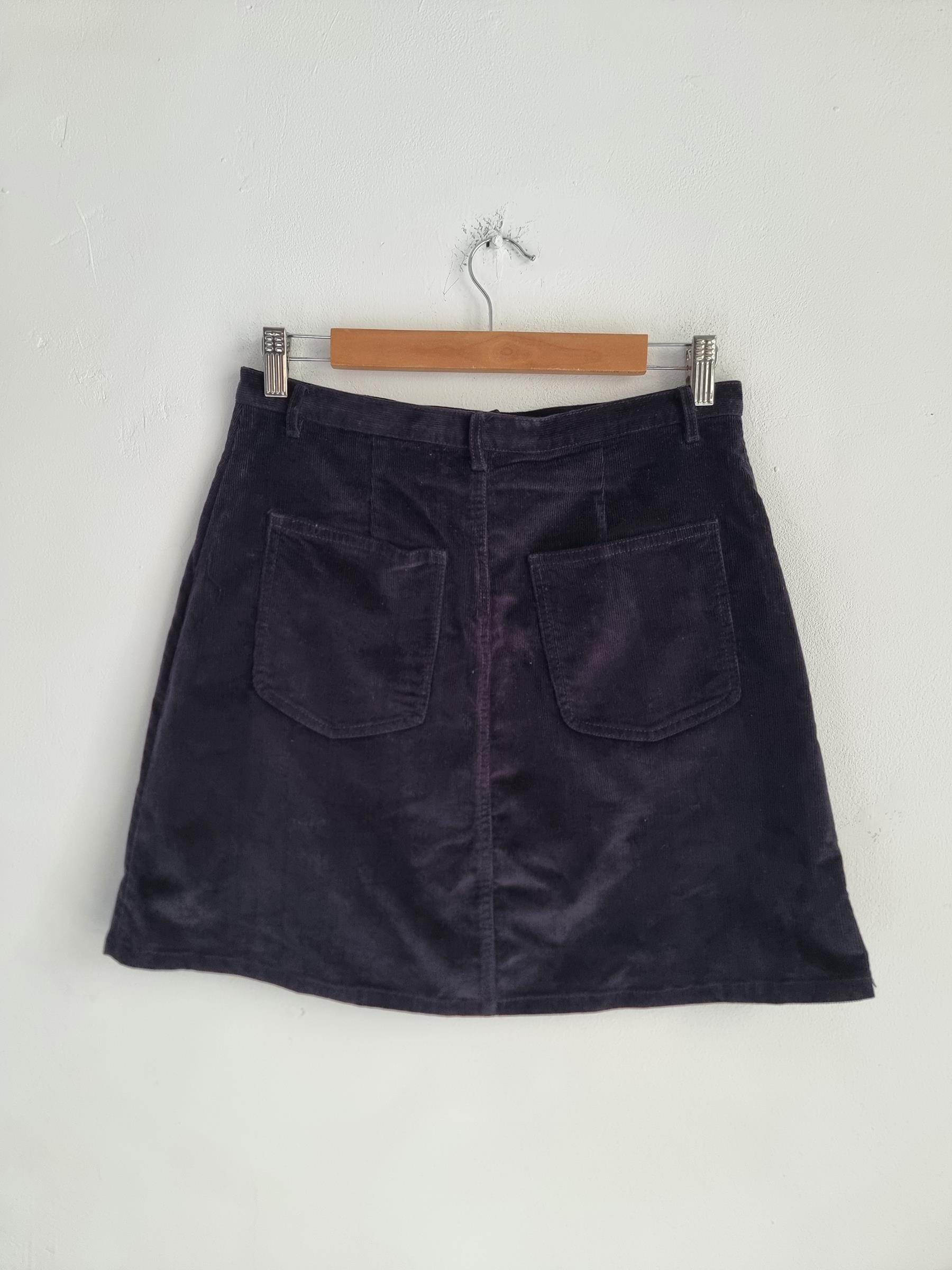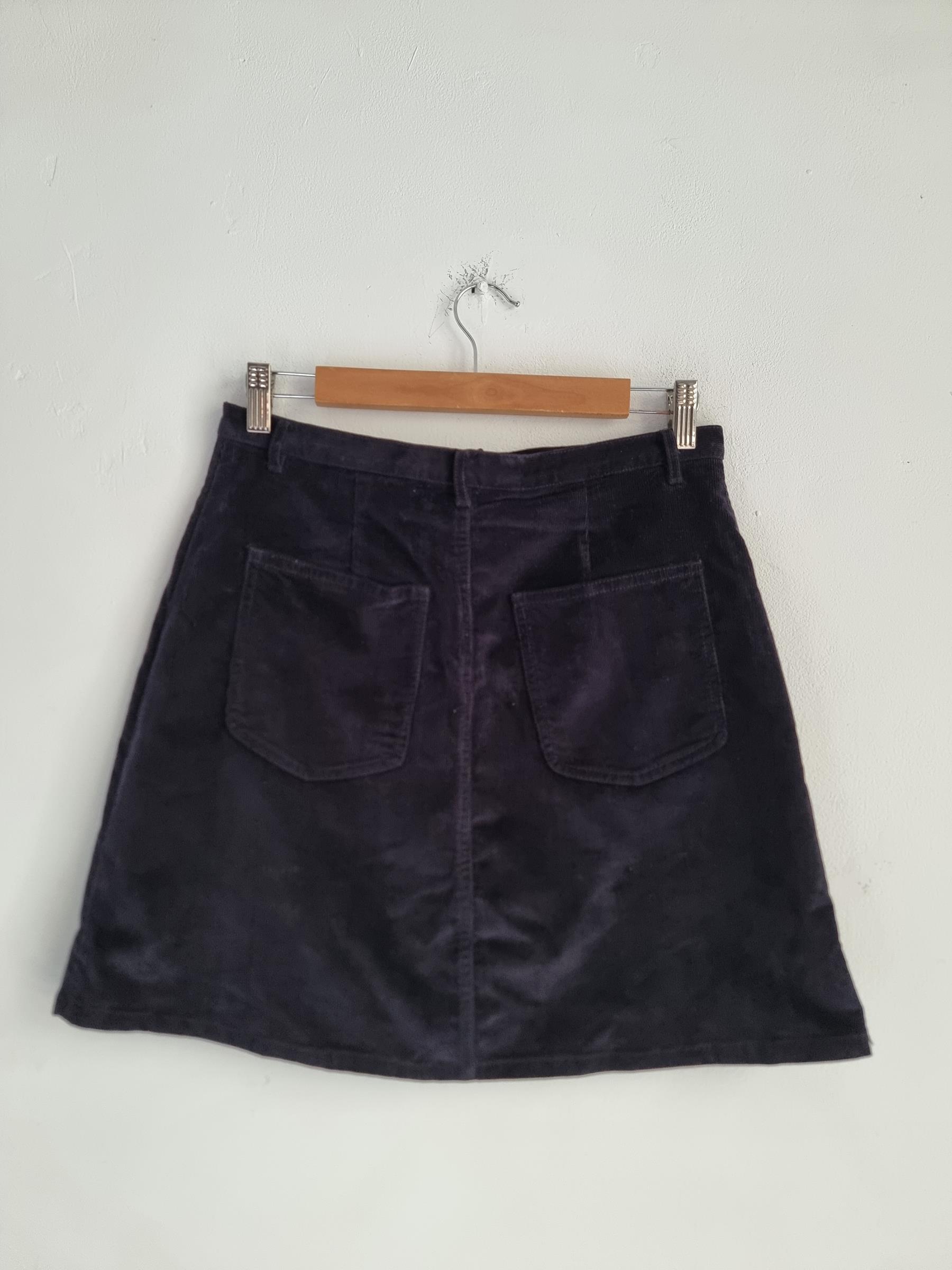 Krótka sztruksowa spódnica. Zapinana na guzik i zamek w pasie.