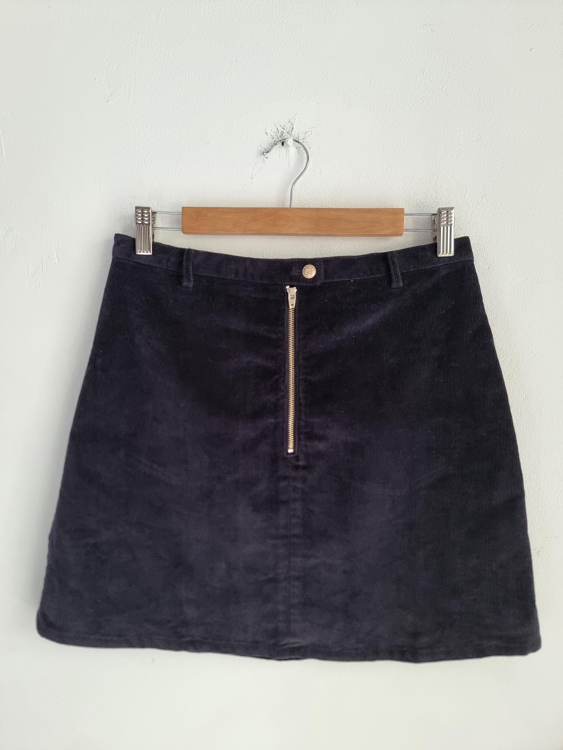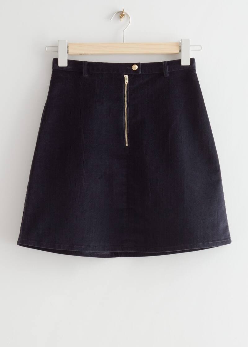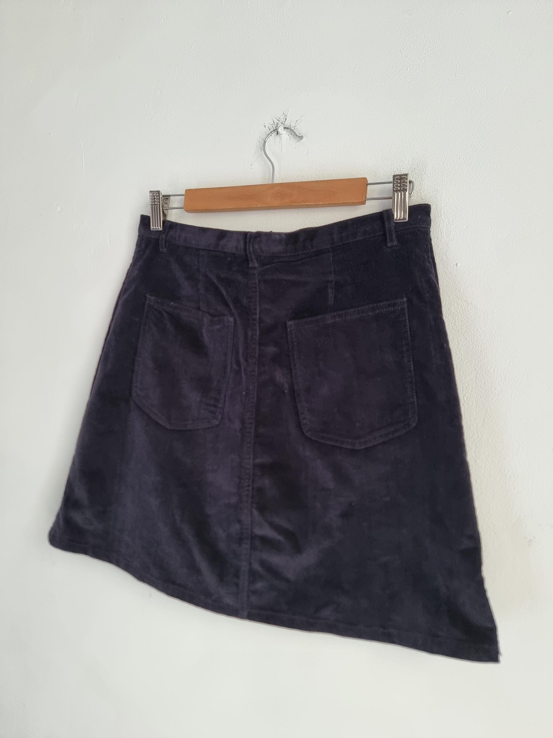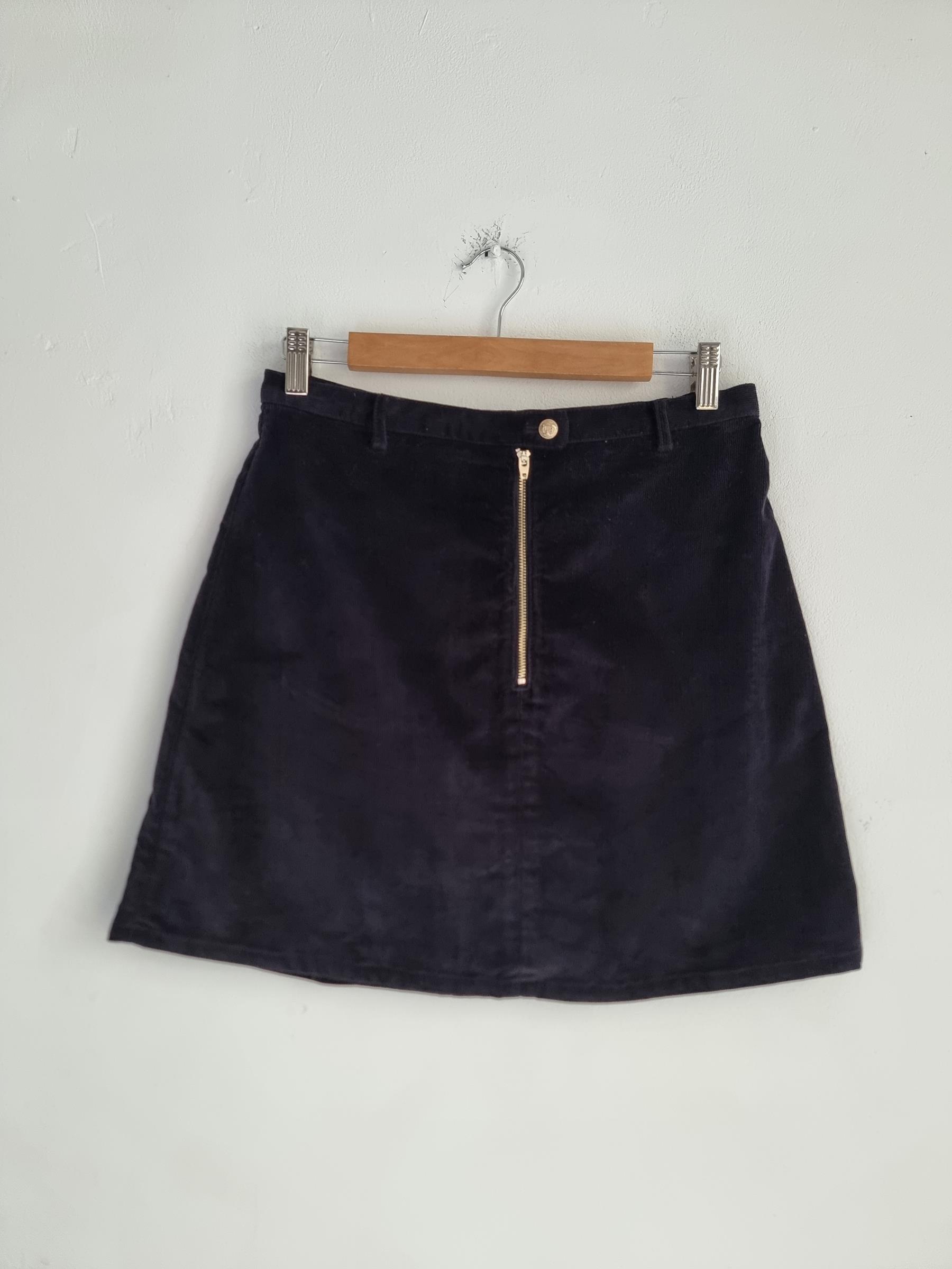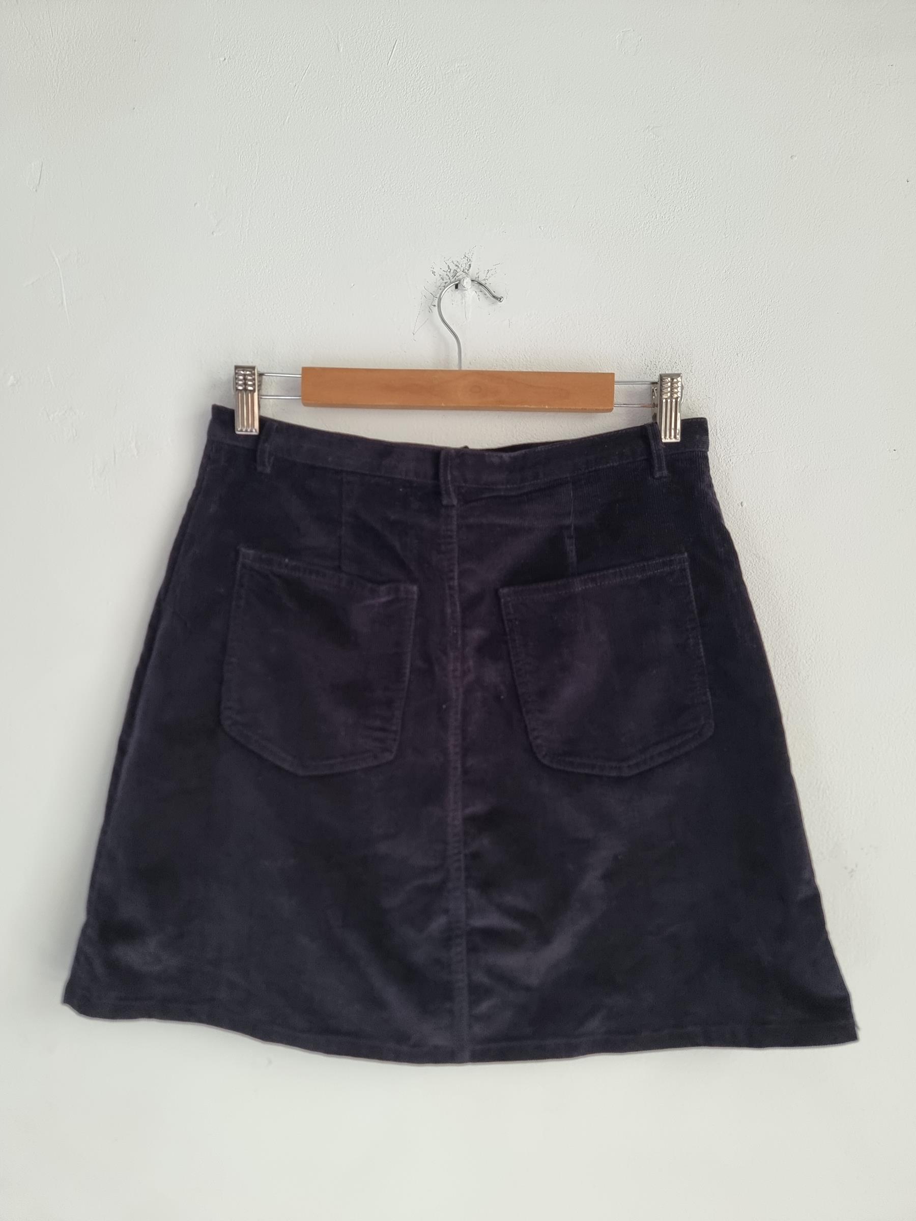 Krótka sztruksowa spódnica. Zapinana na guzik i zamek w pasie.