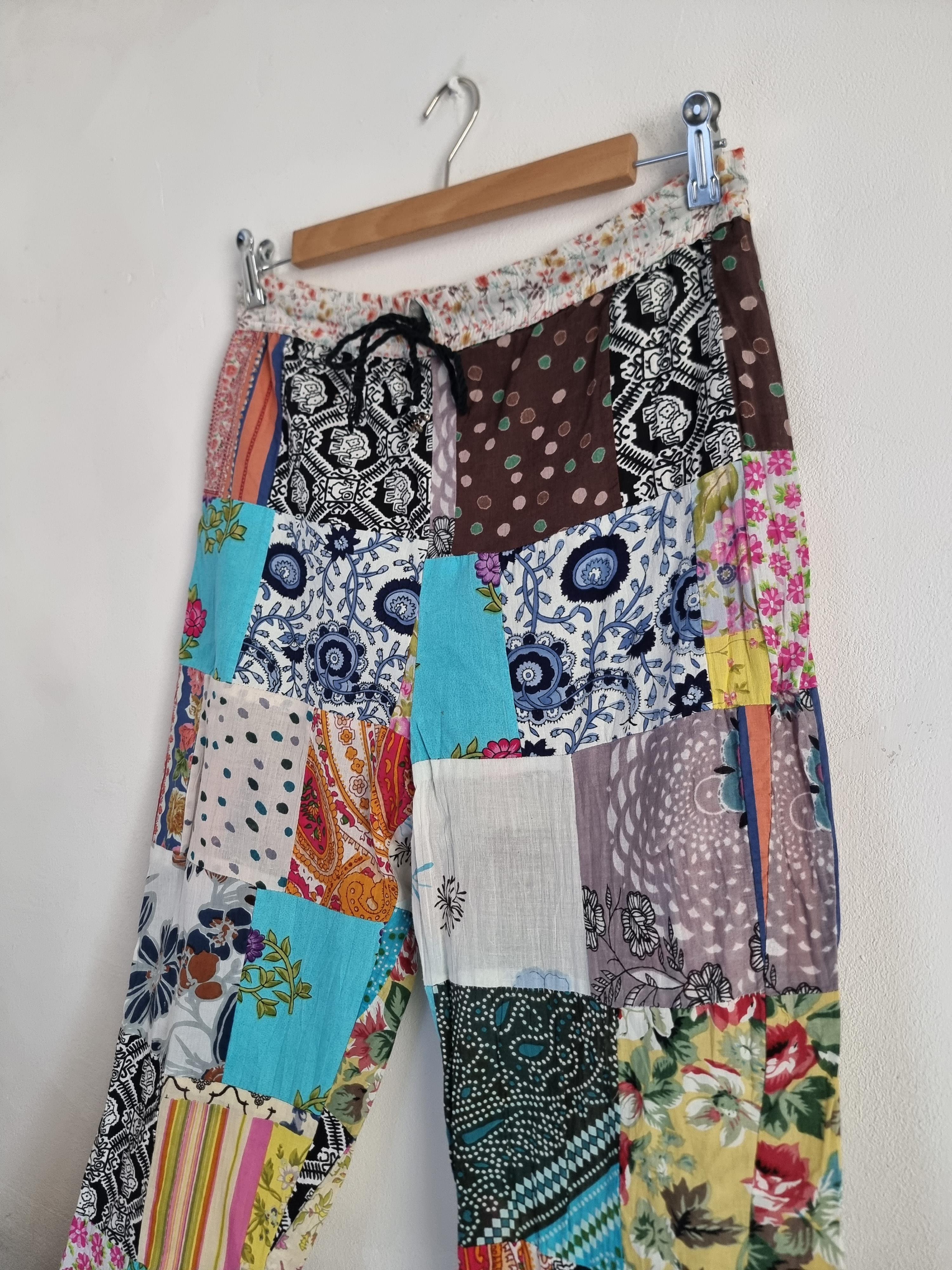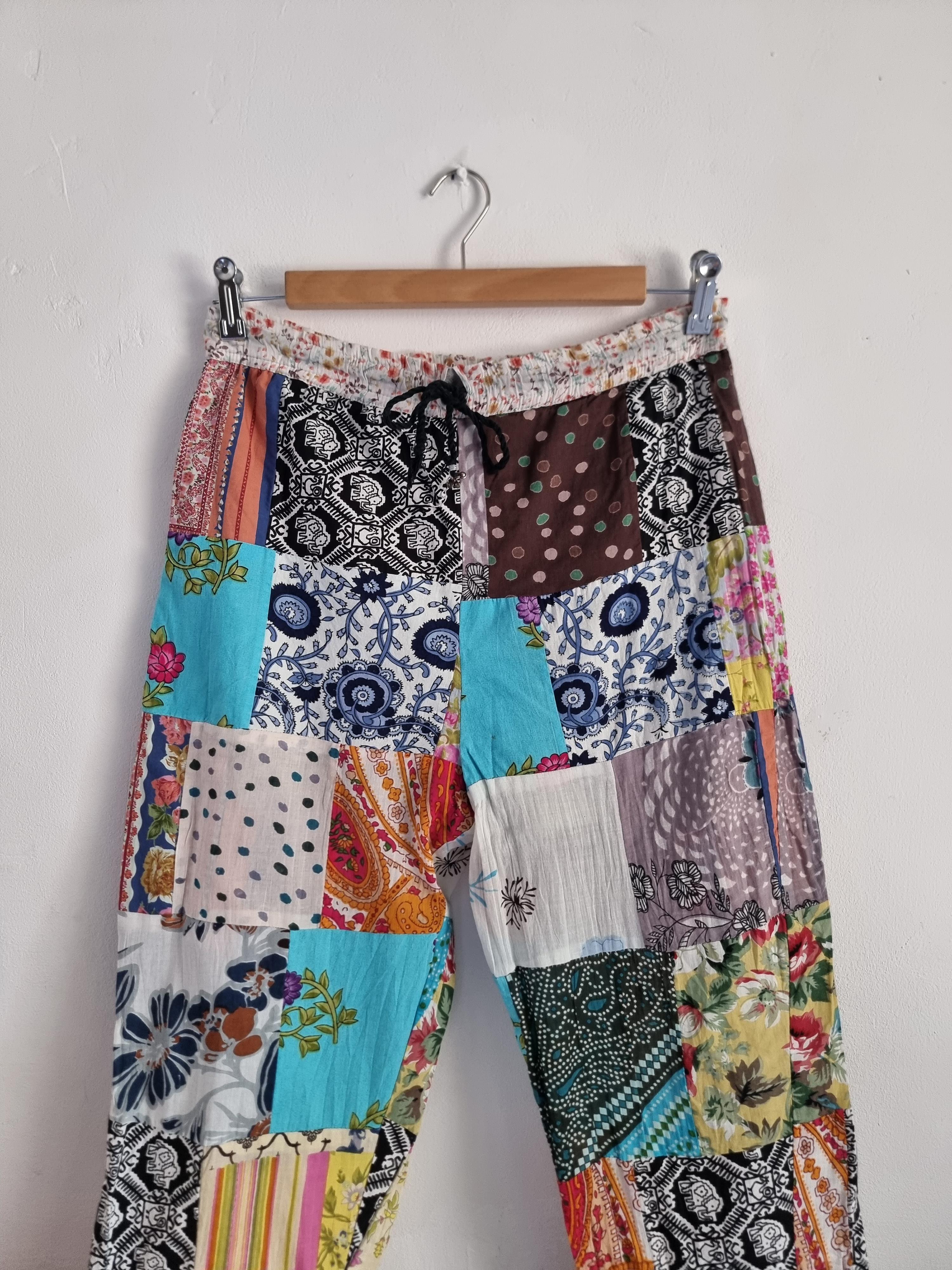 Bawełniane patchworkowe spodnie na gumce, wiązanie w pasie.