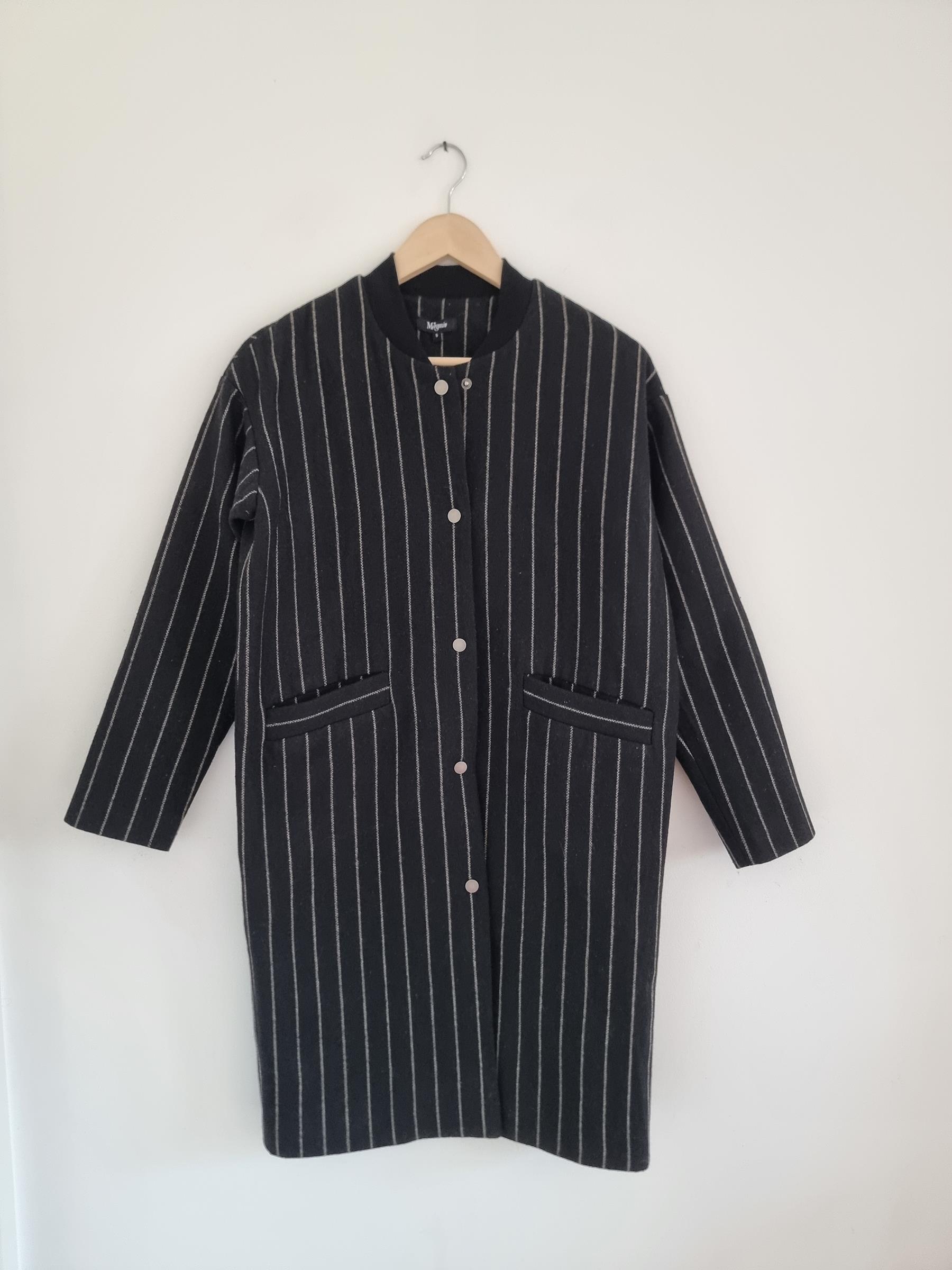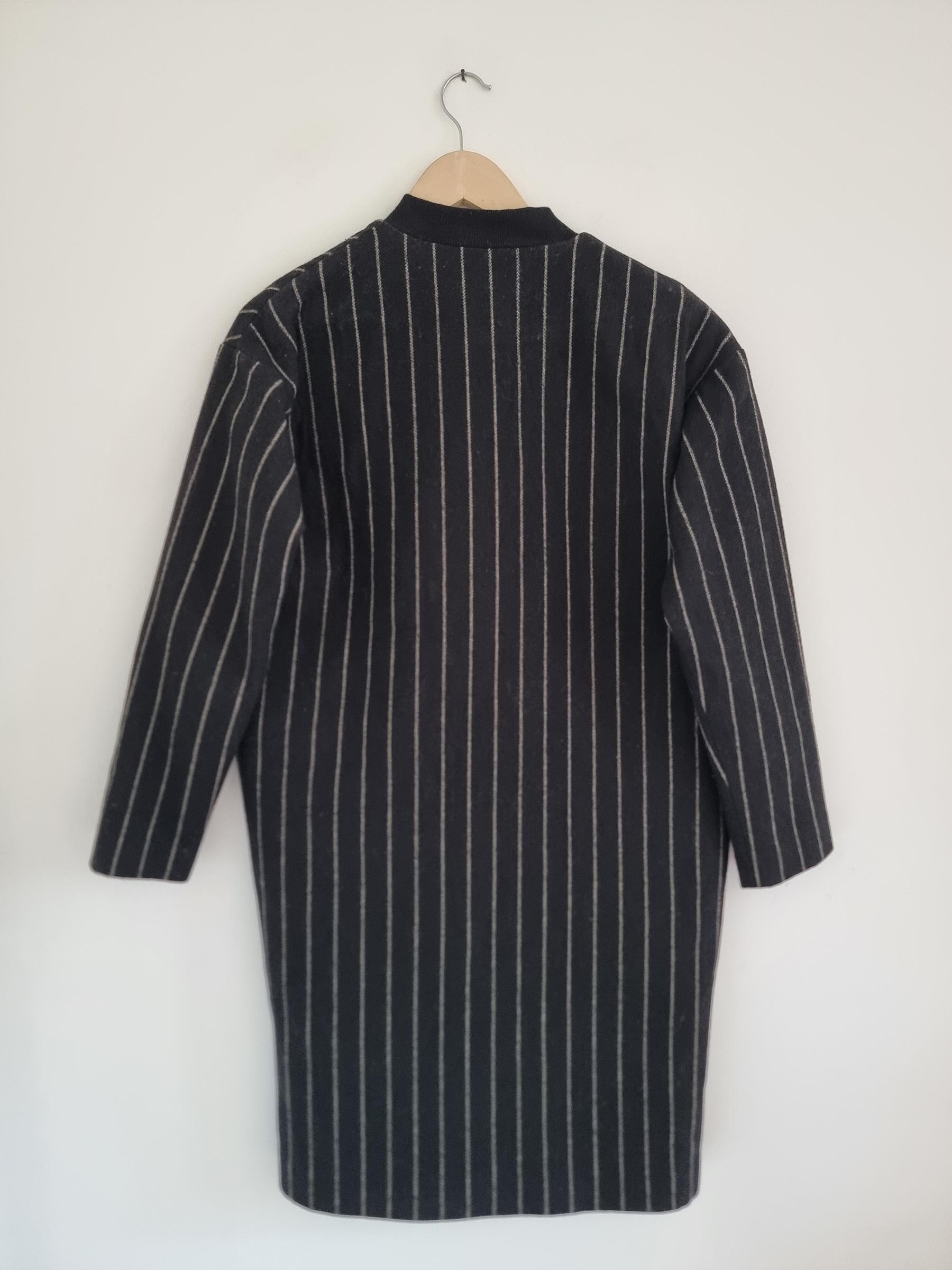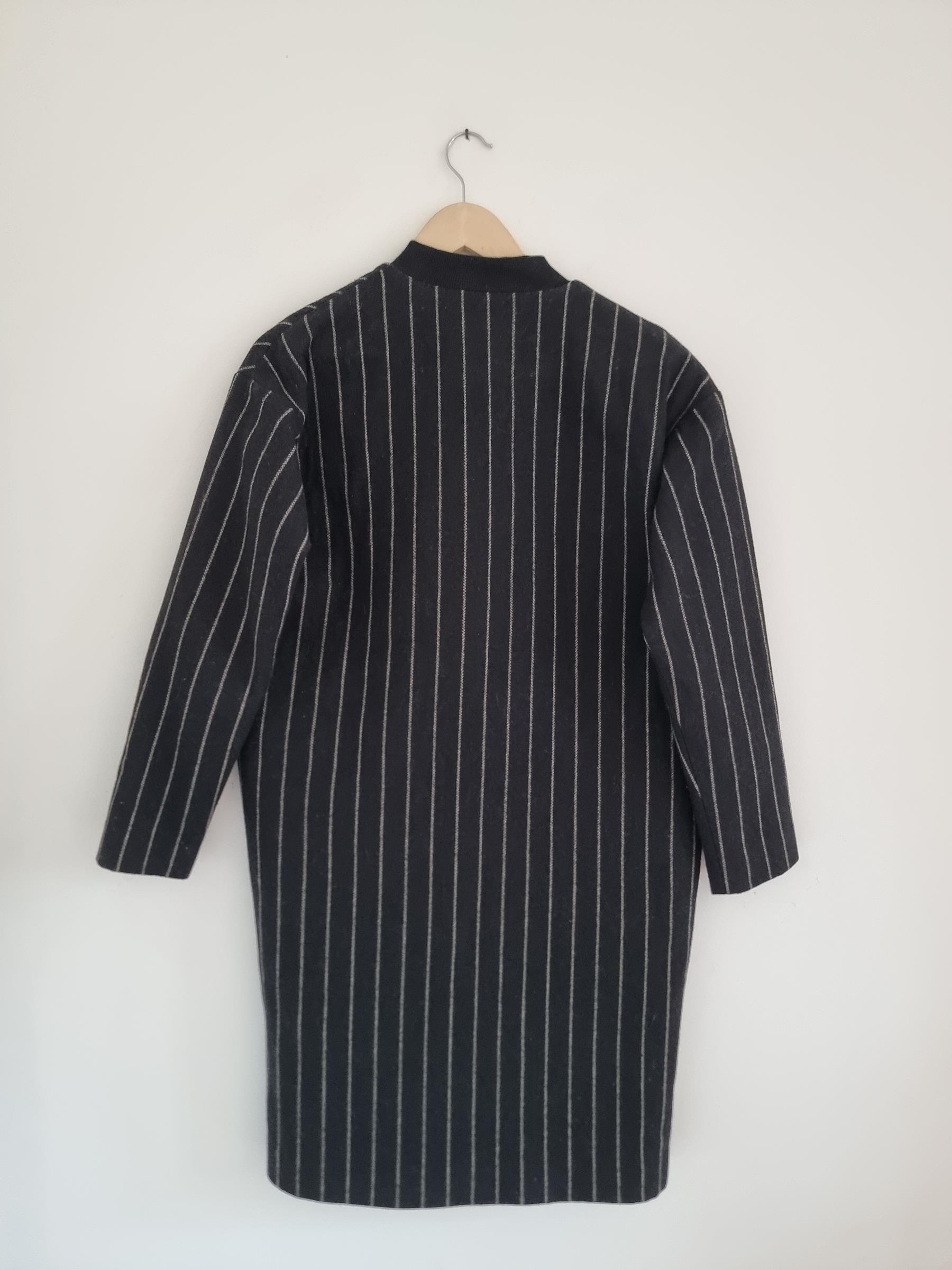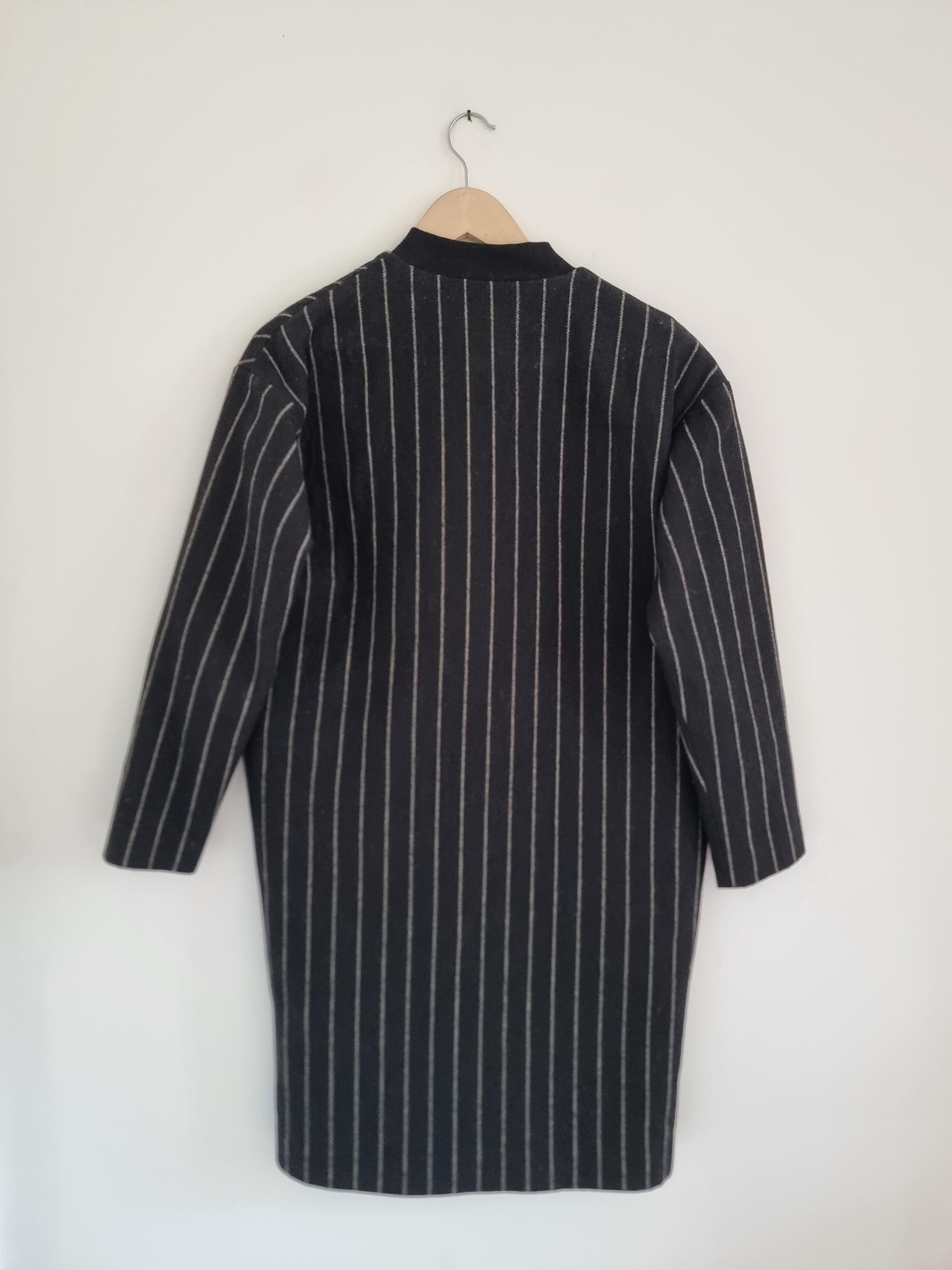 Prosty płaszcz o kokonowym fasonie na stójce. Kolor czarny z białymi paskami. W składzie 50% wełny. Zapinany na napy.