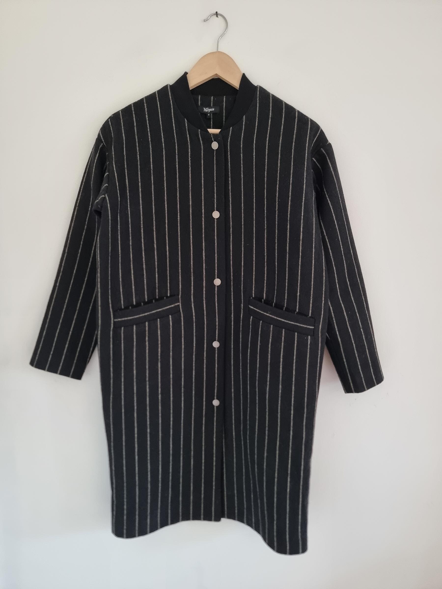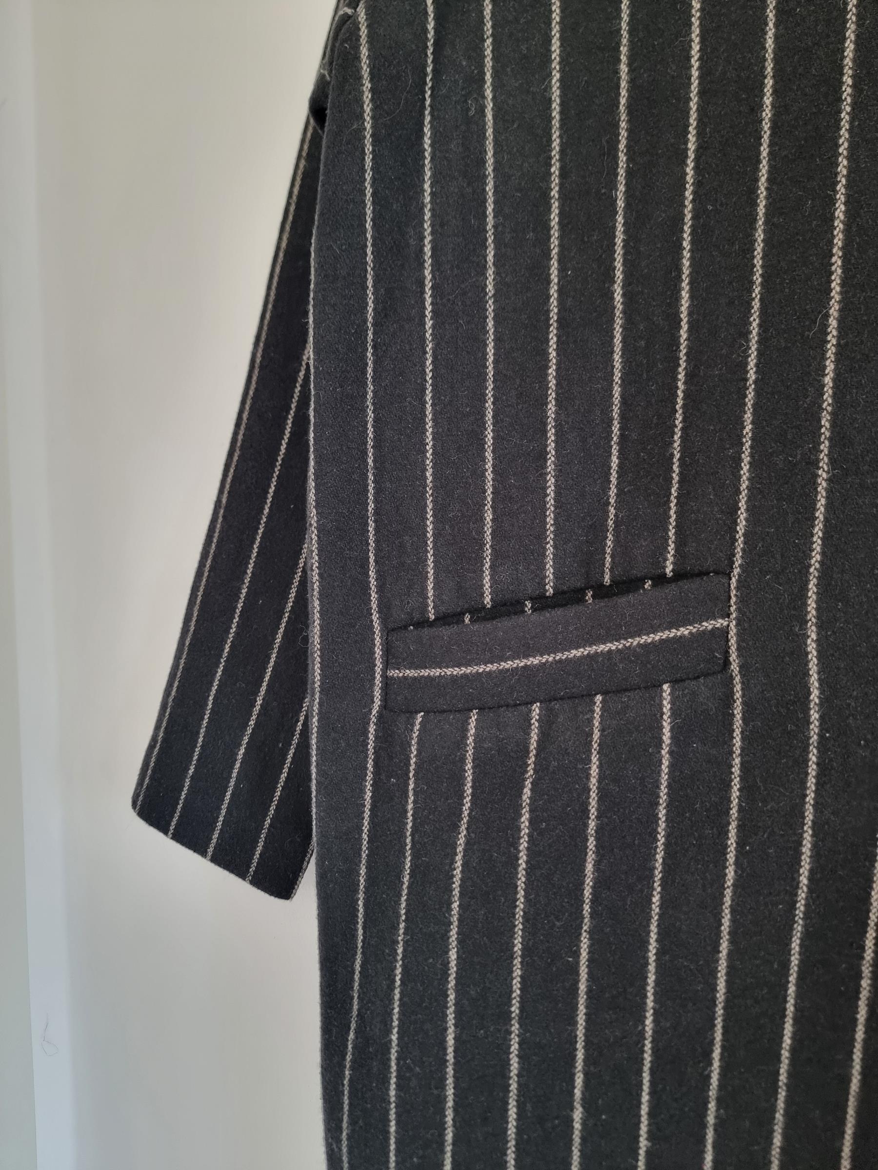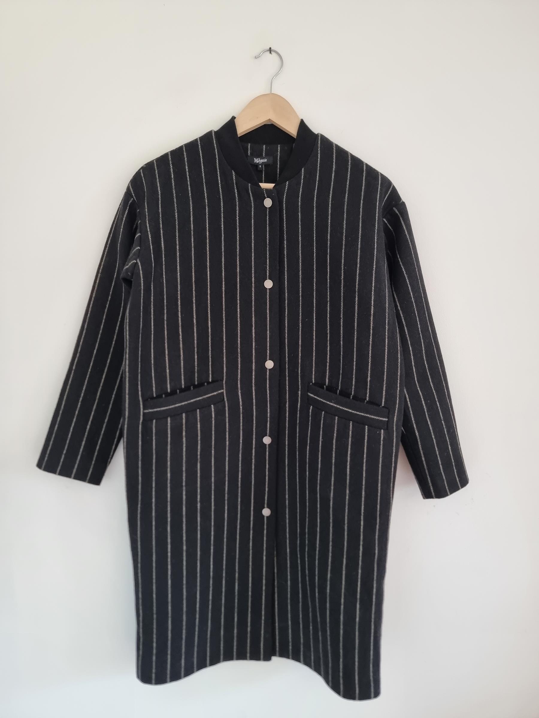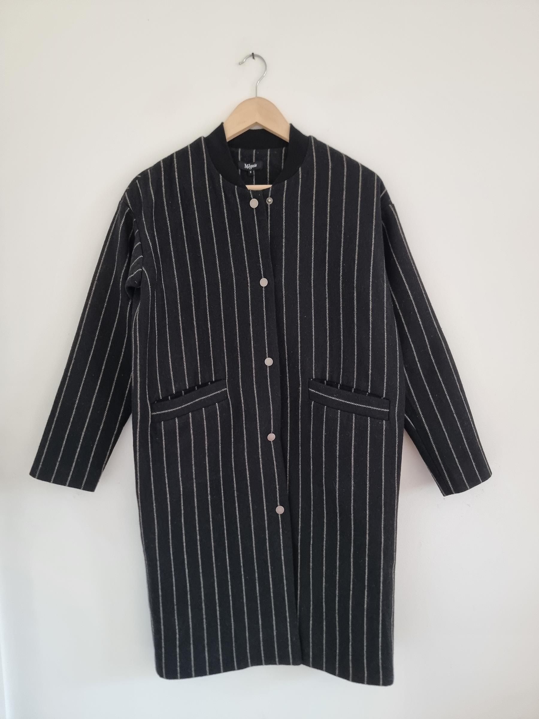 Prosty płaszcz o kokonowym fasonie na stójce. Kolor czarny z białymi paskami. W składzie 50% wełny. Zapinany na napy.