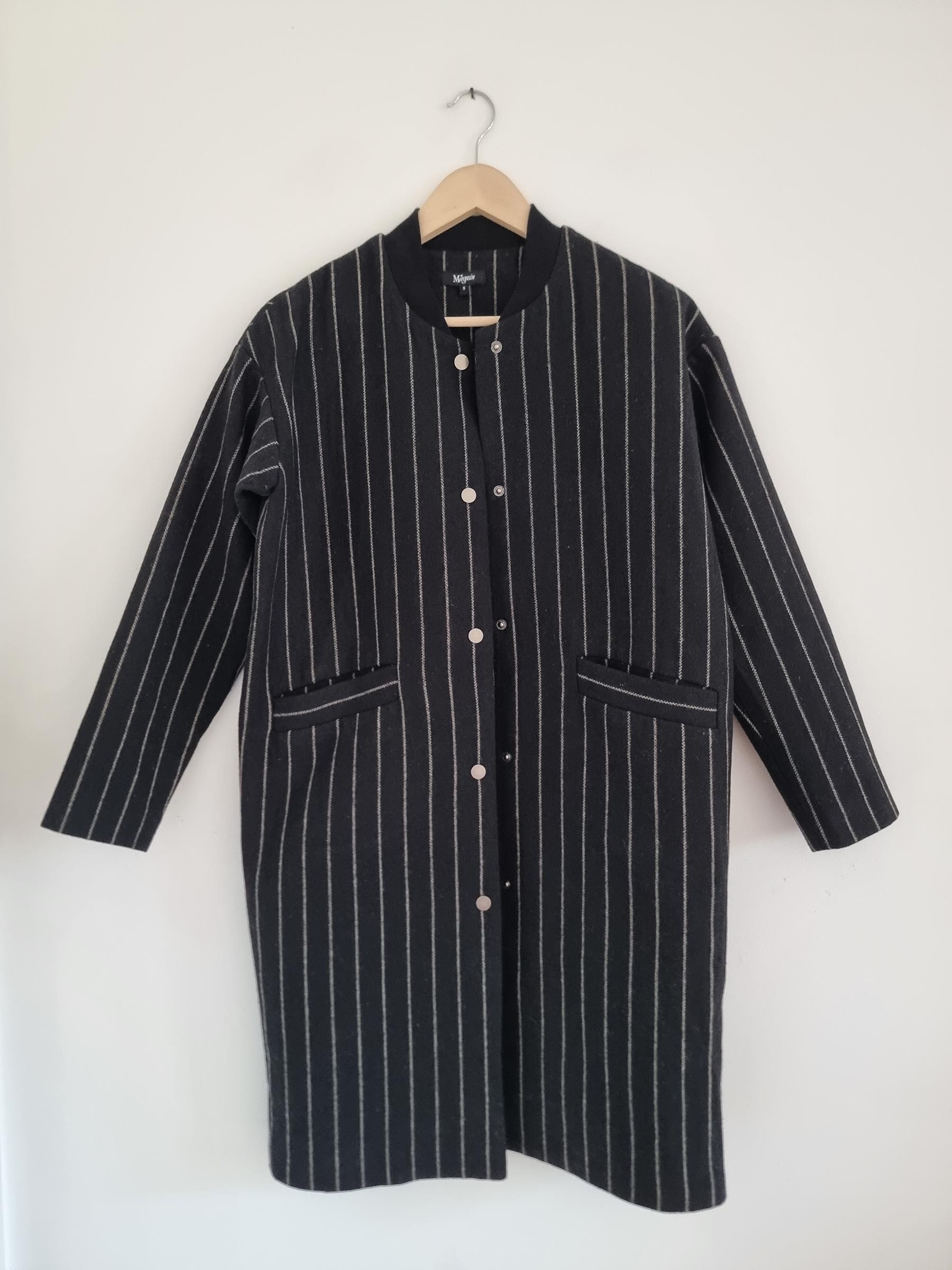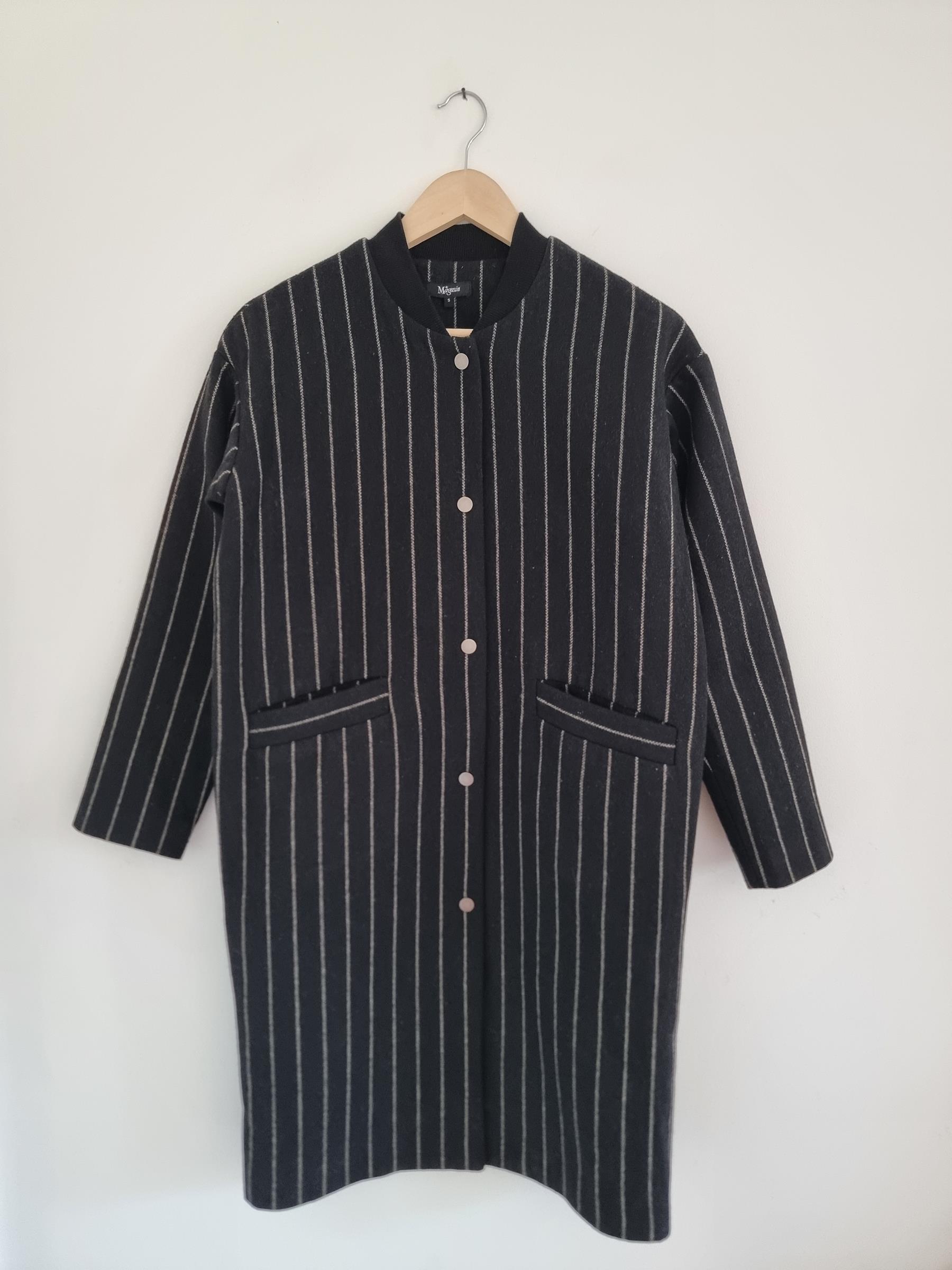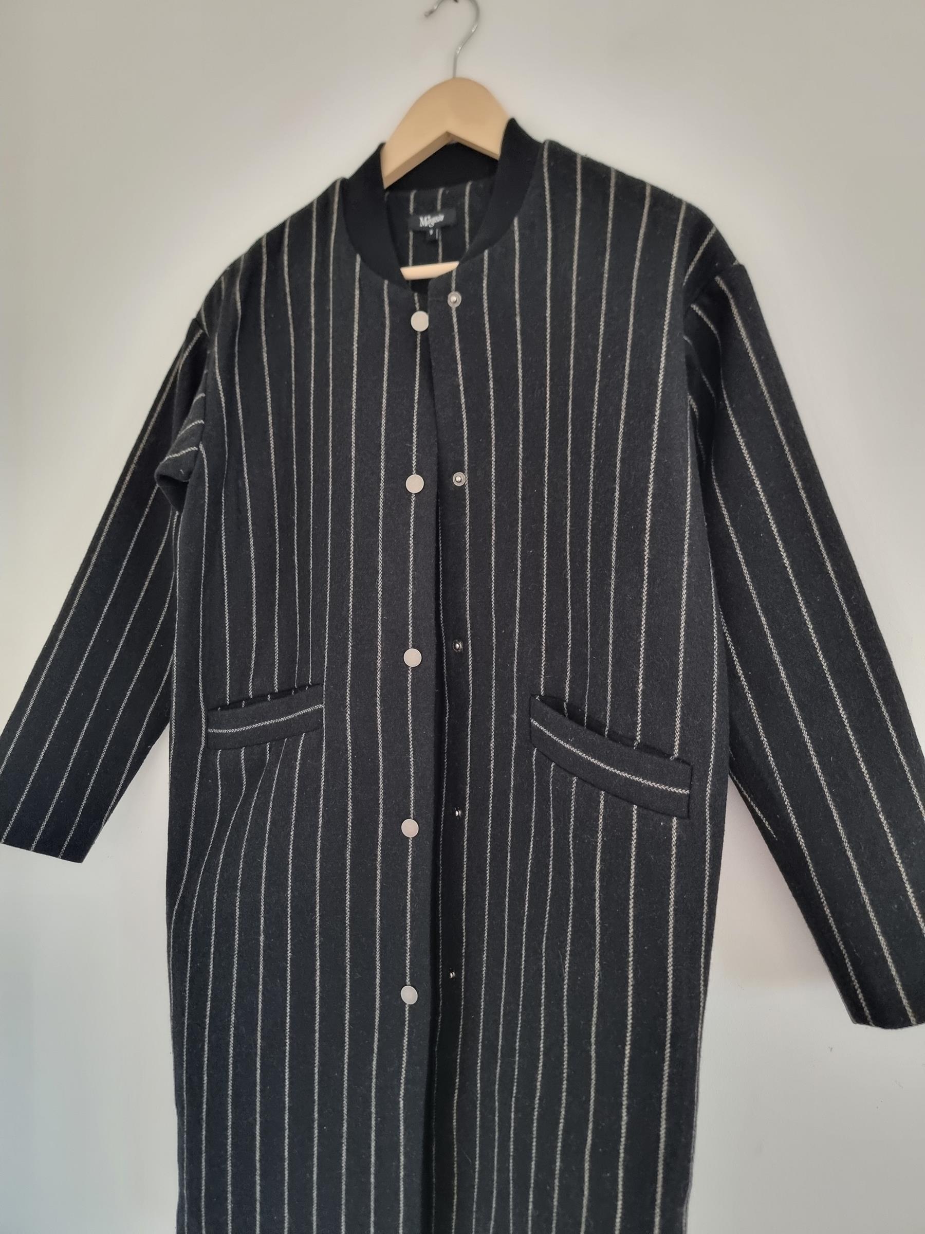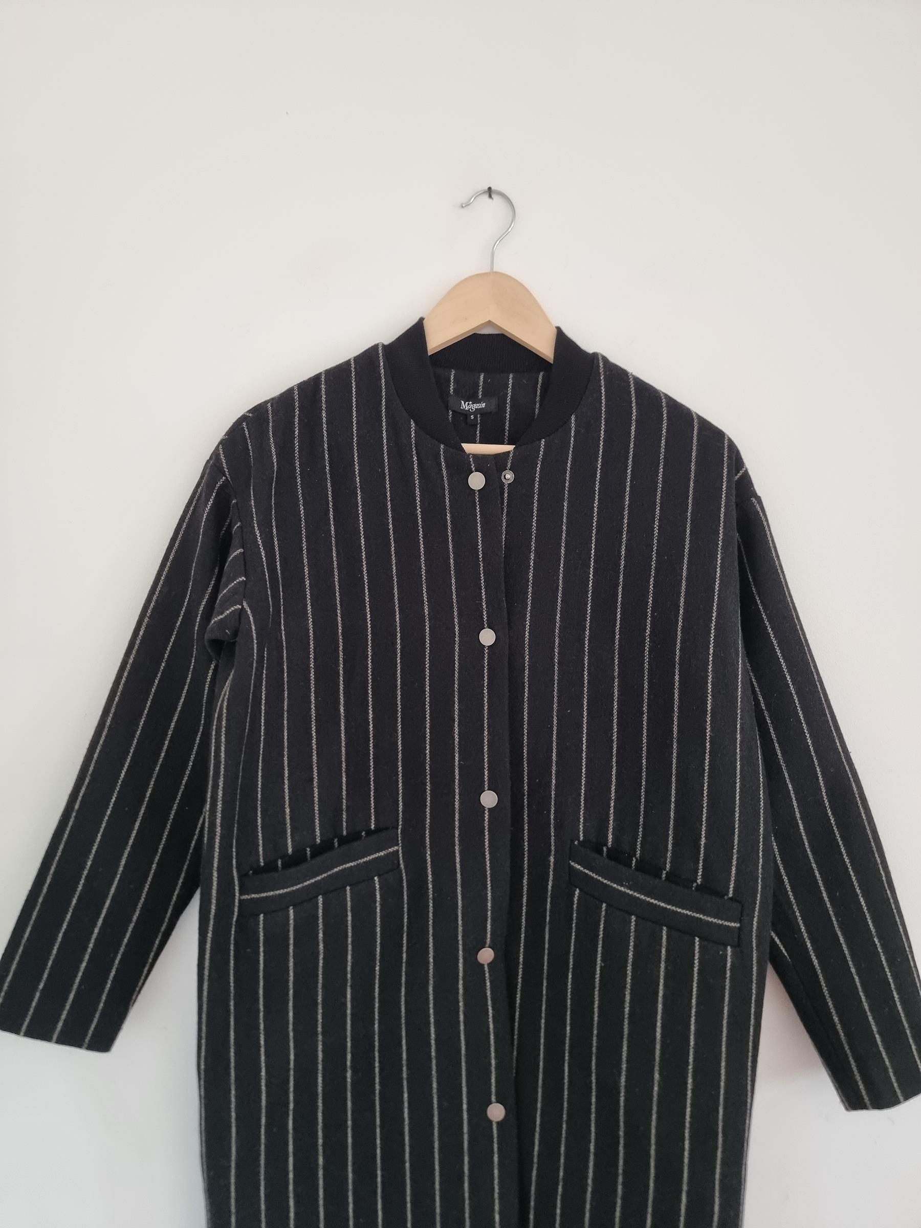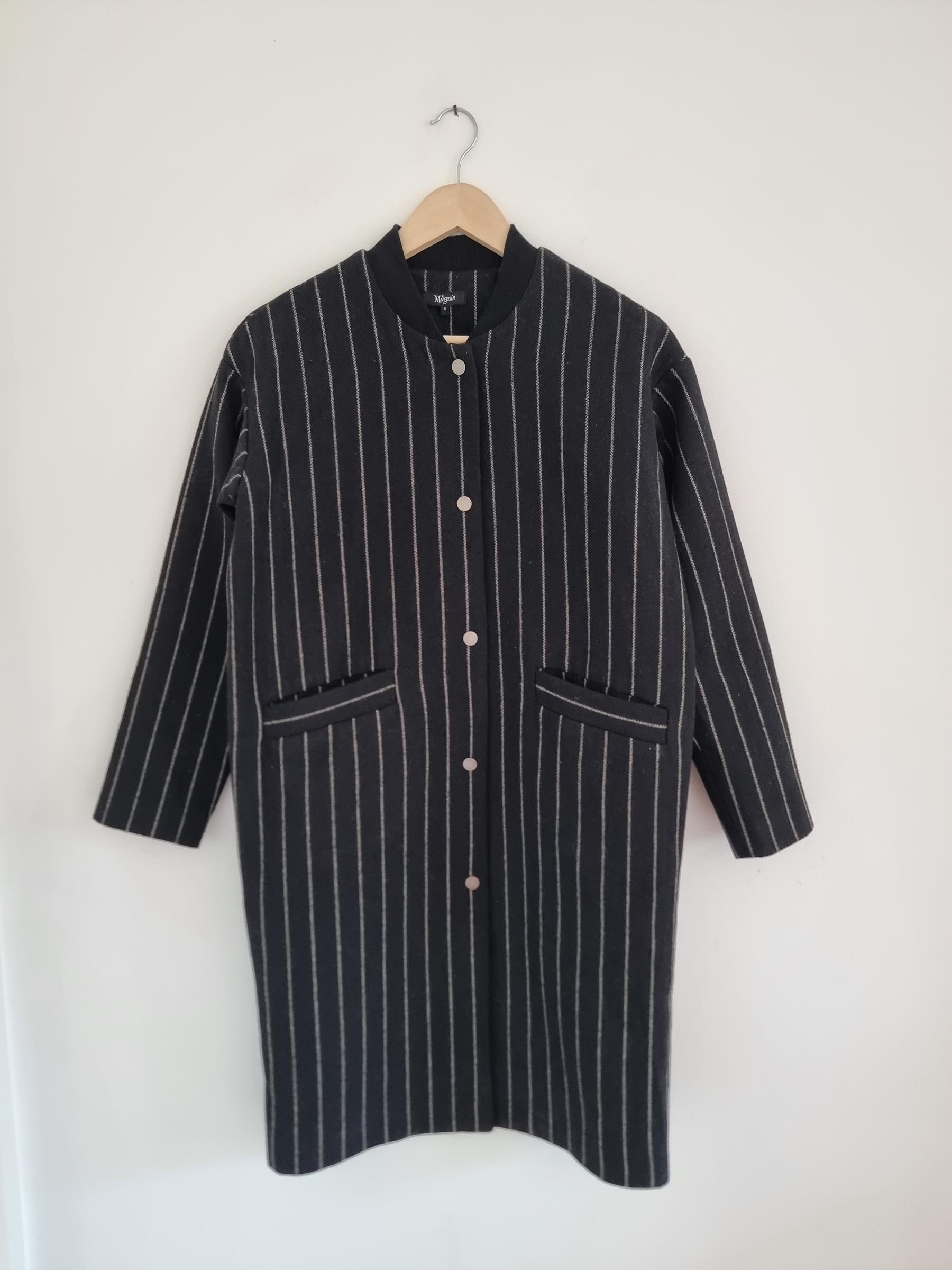 Prosty płaszcz o kokonowym fasonie na stójce. Kolor czarny z białymi paskami. W składzie 50% wełny. Zapinany na napy.