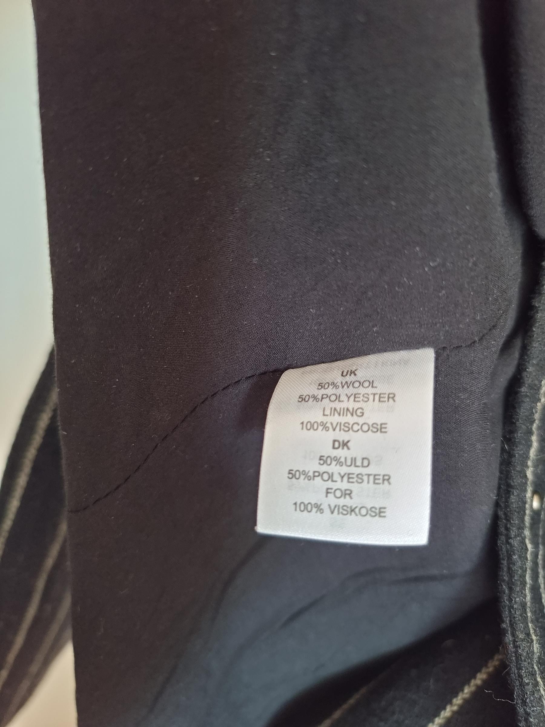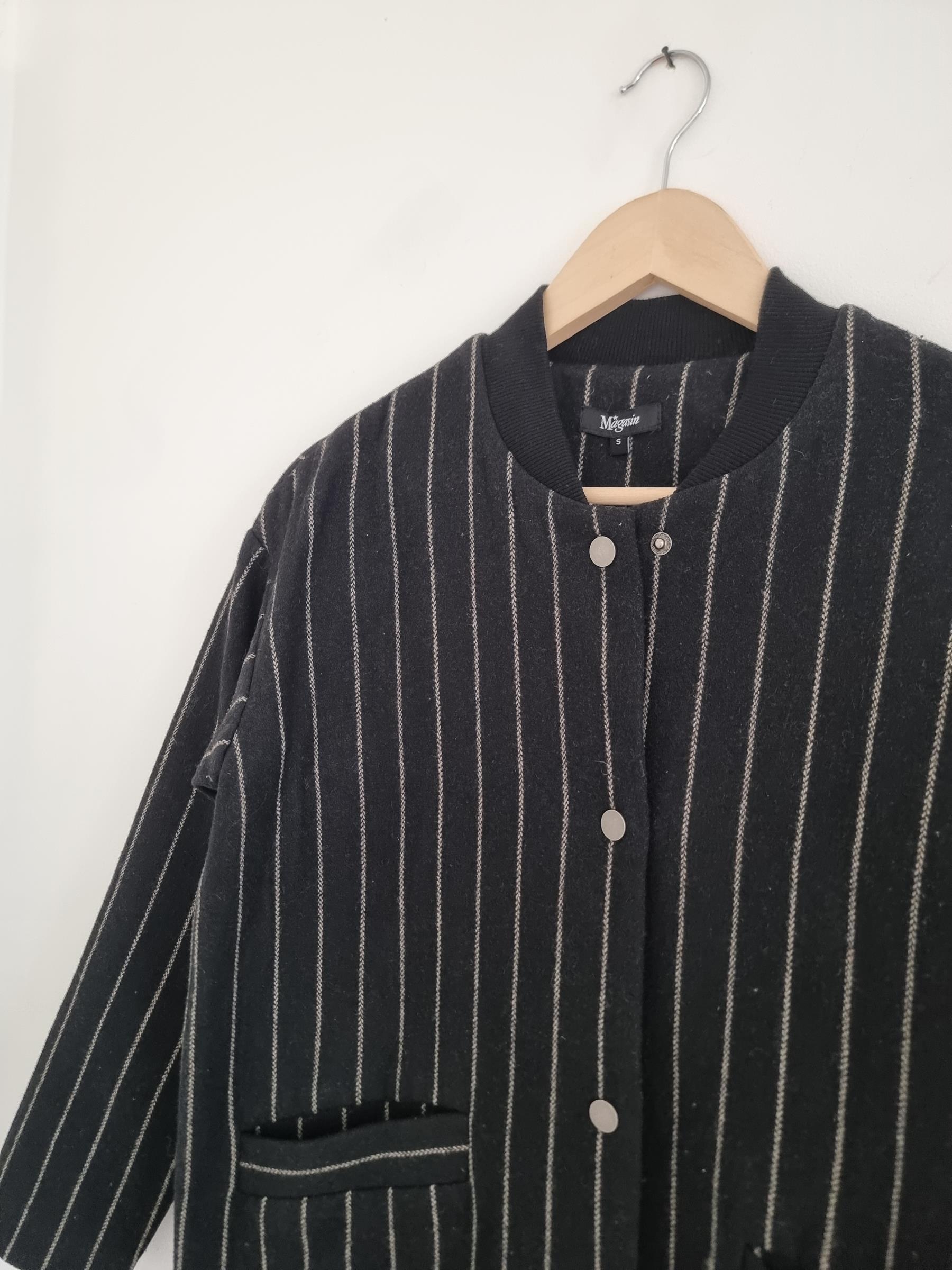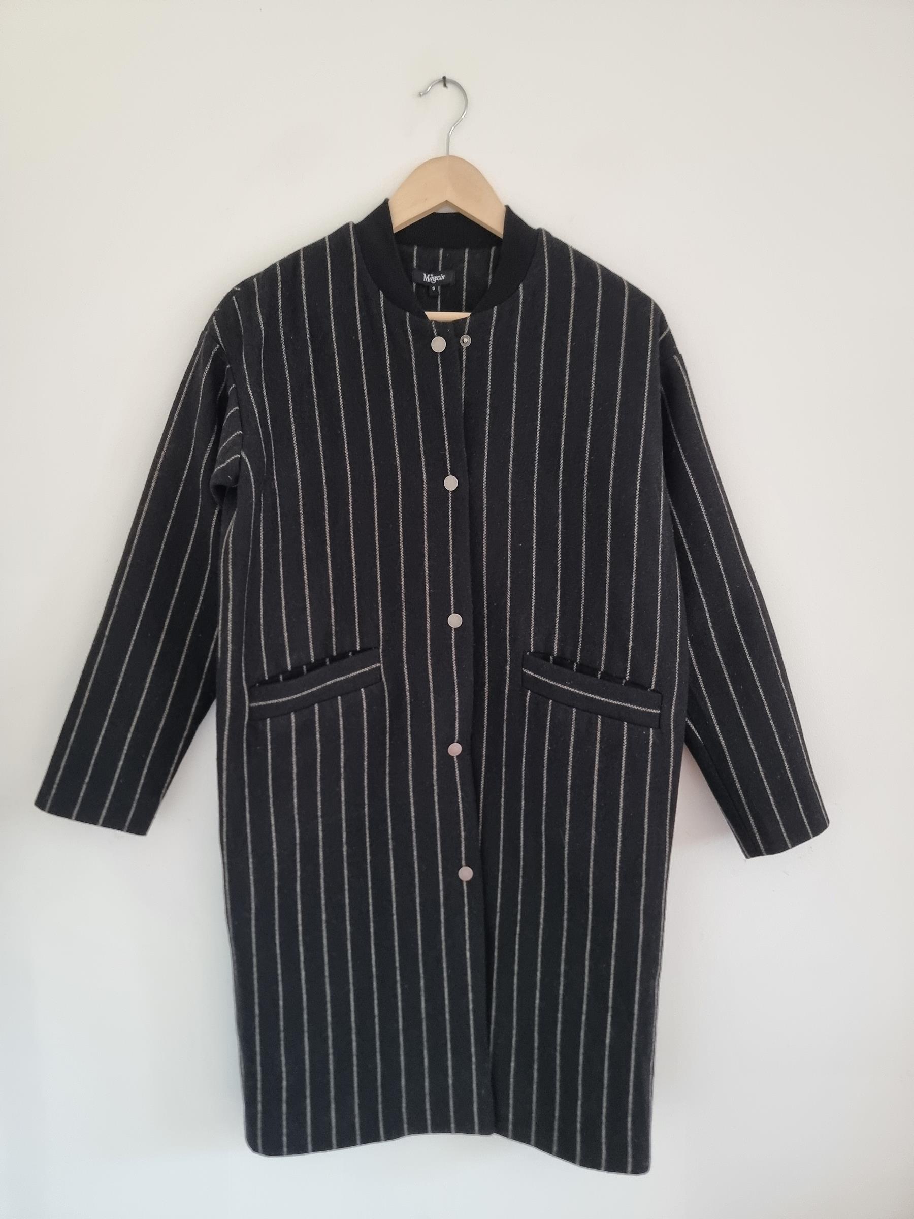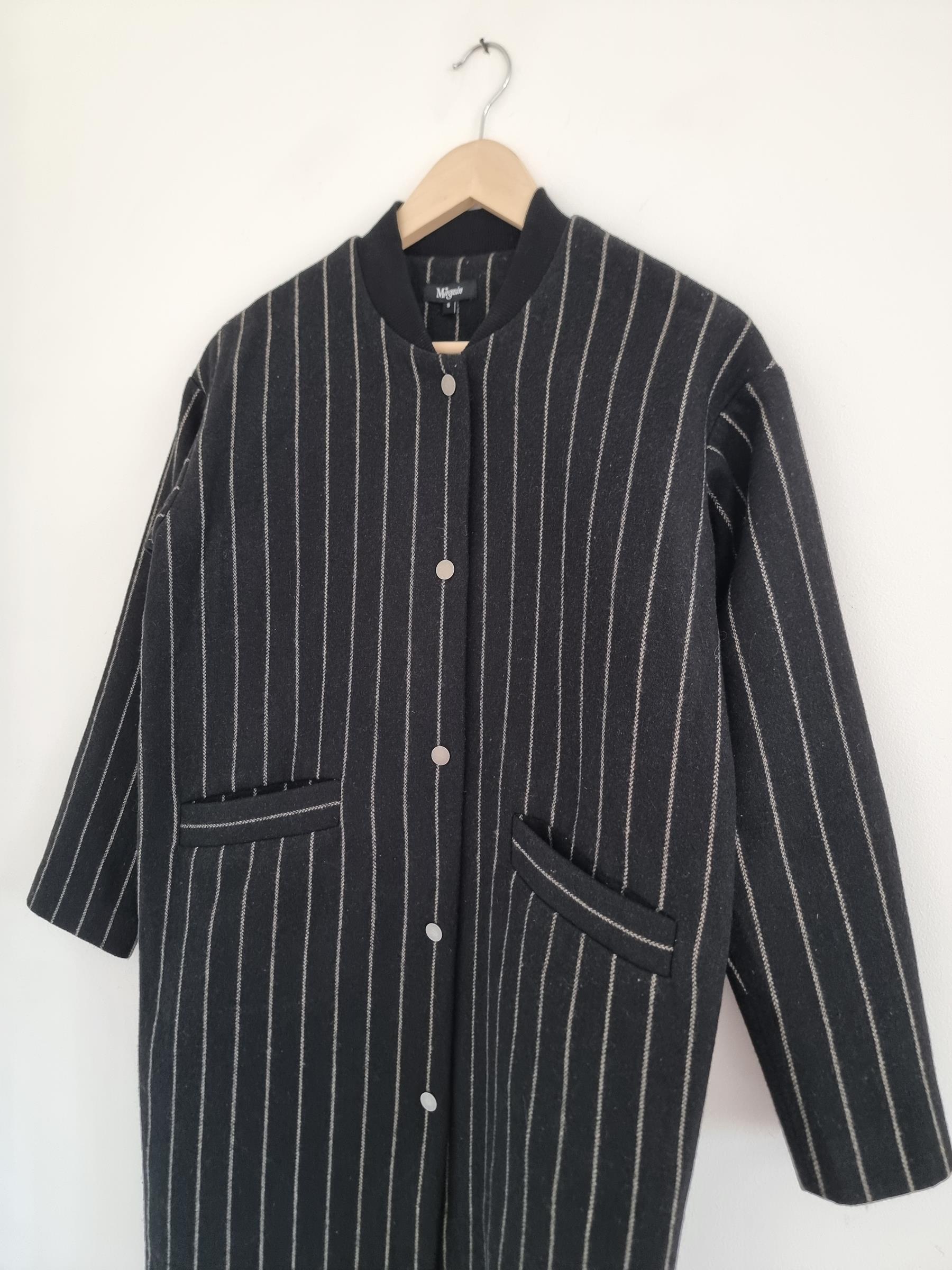 Prosty płaszcz o kokonowym fasonie na stójce. Kolor czarny z białymi paskami. W składzie 50% wełny. Zapinany na napy.