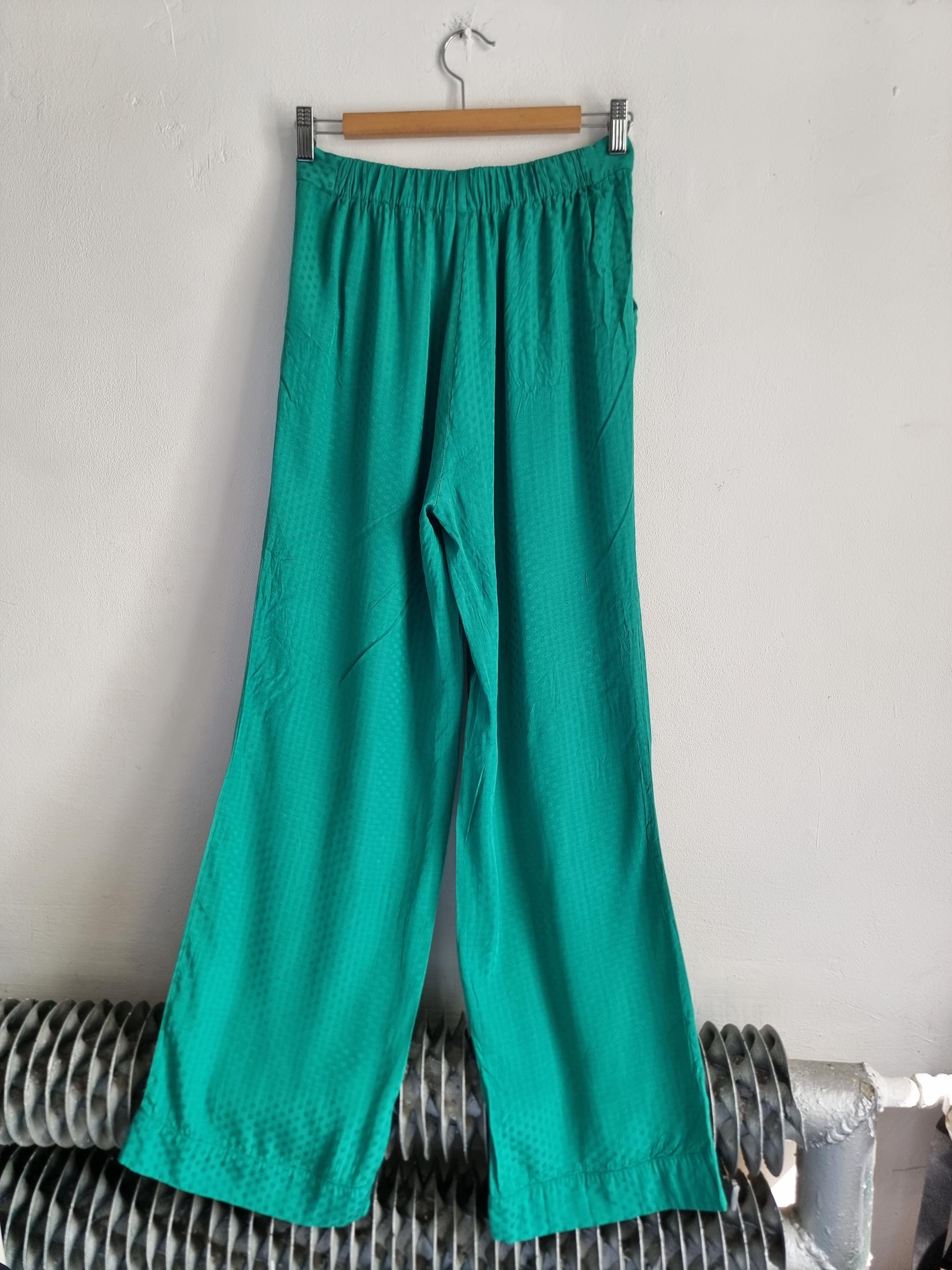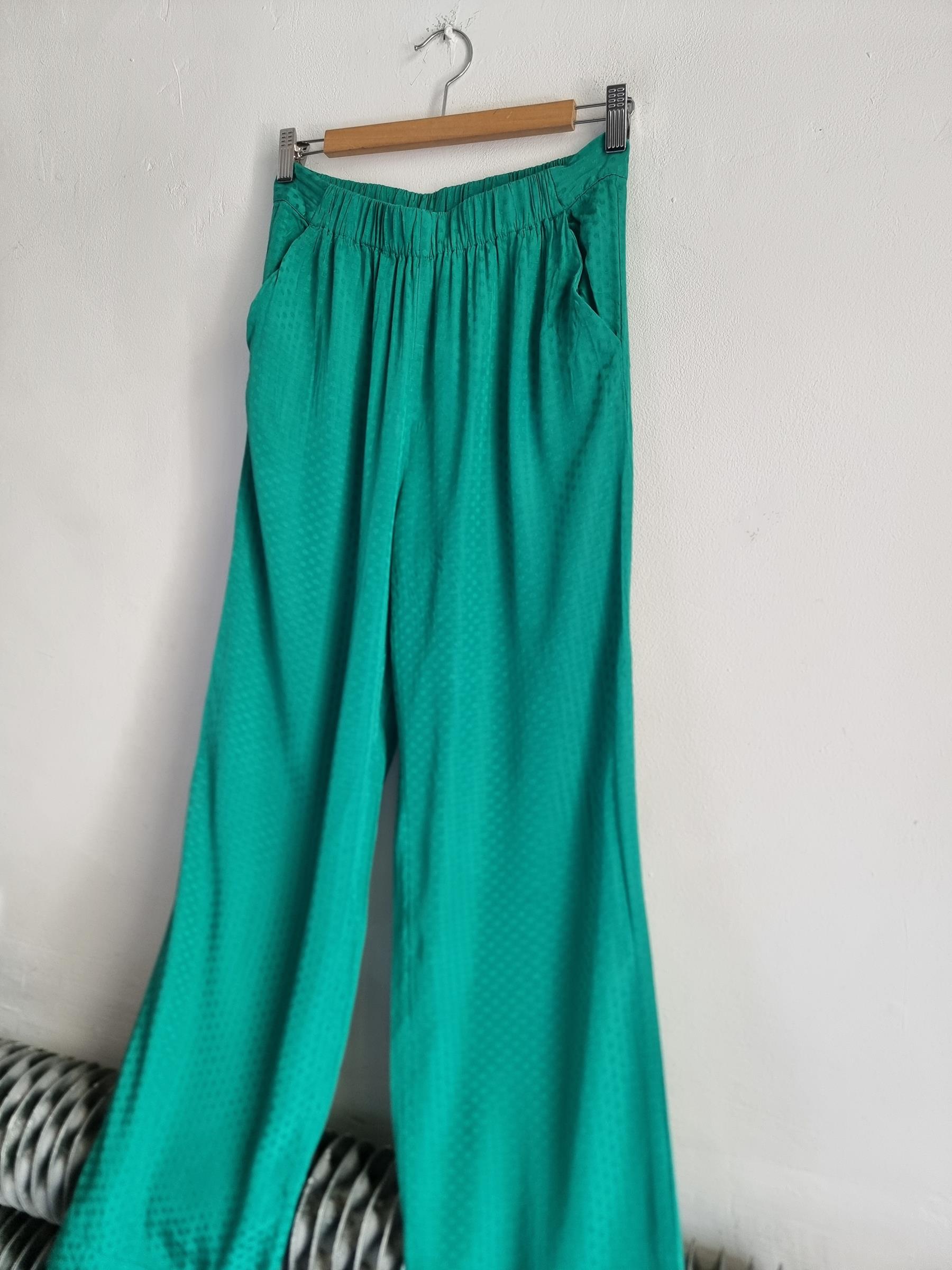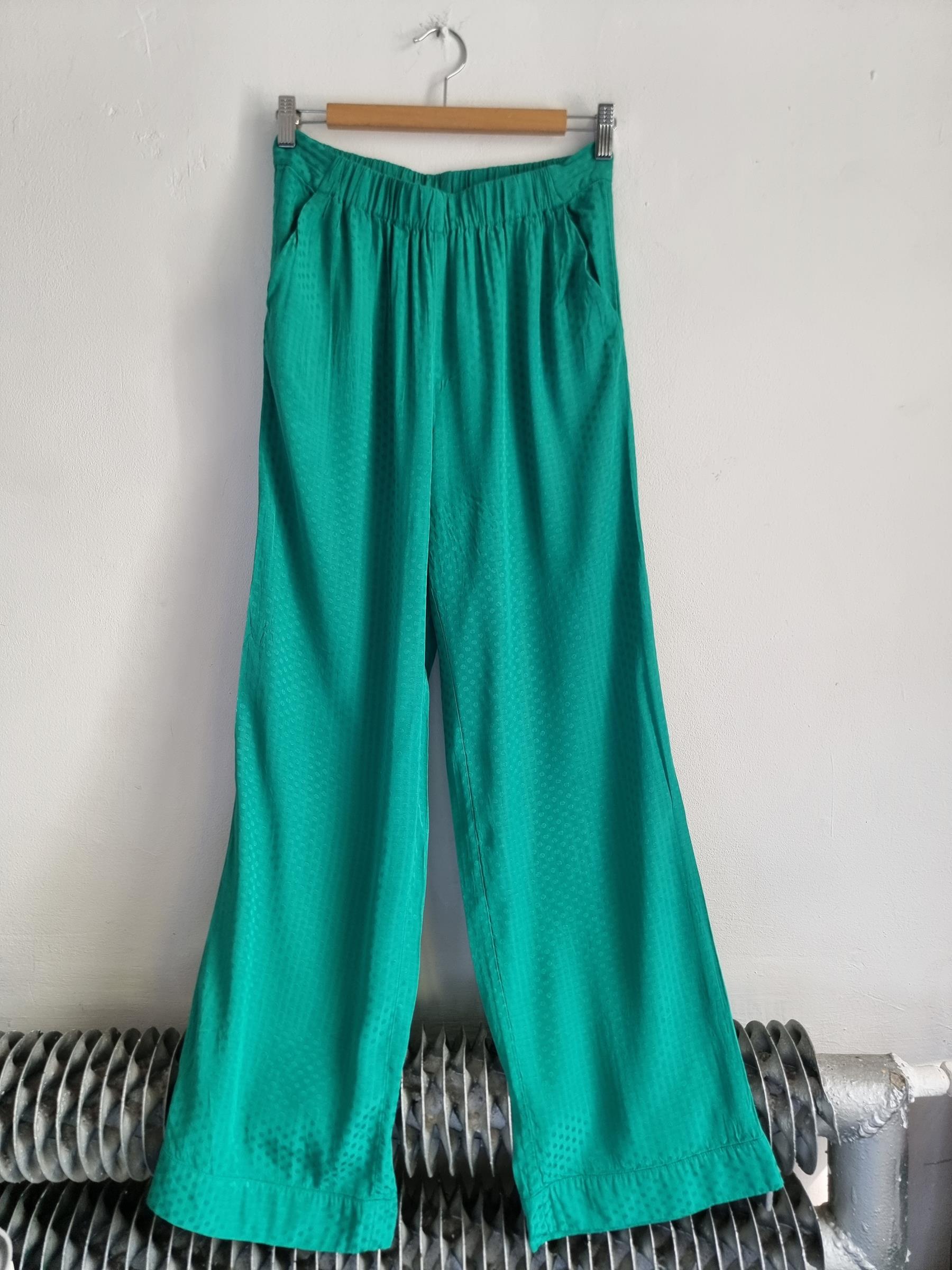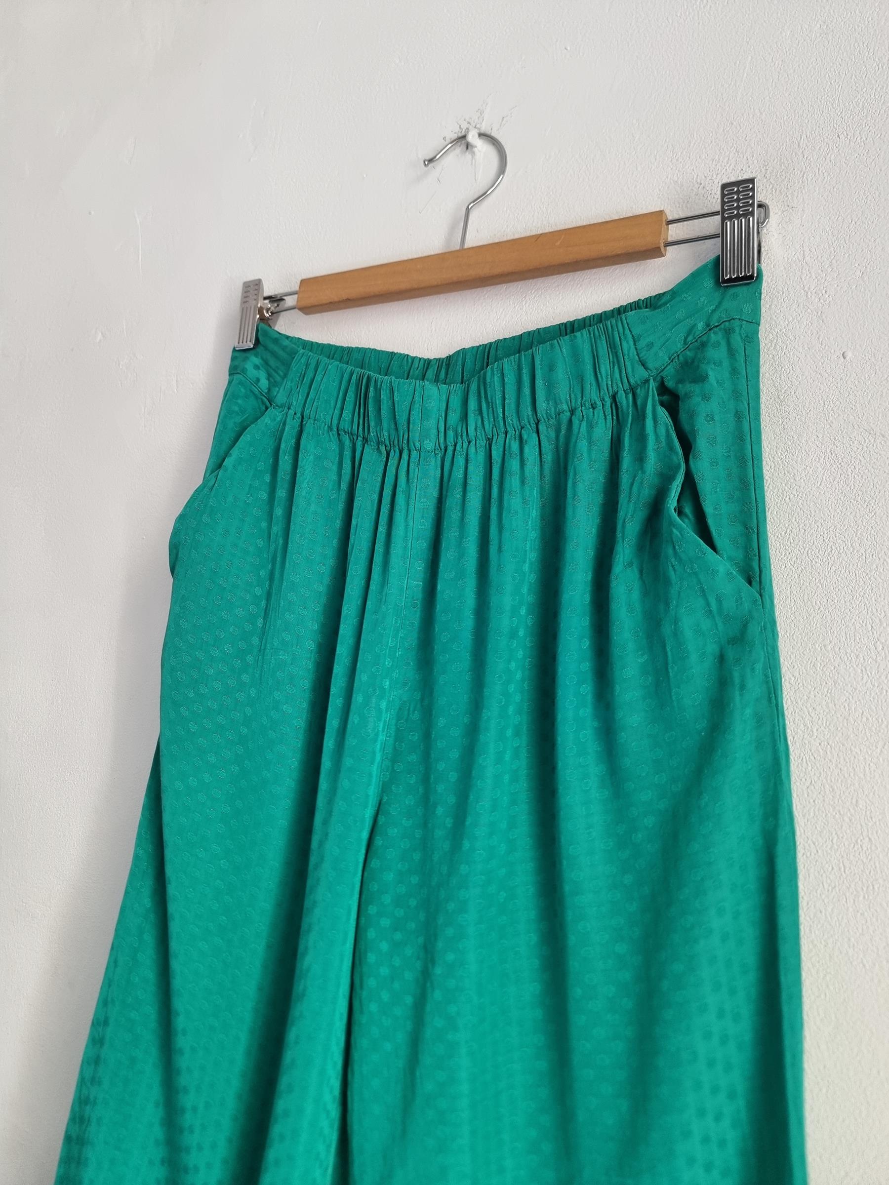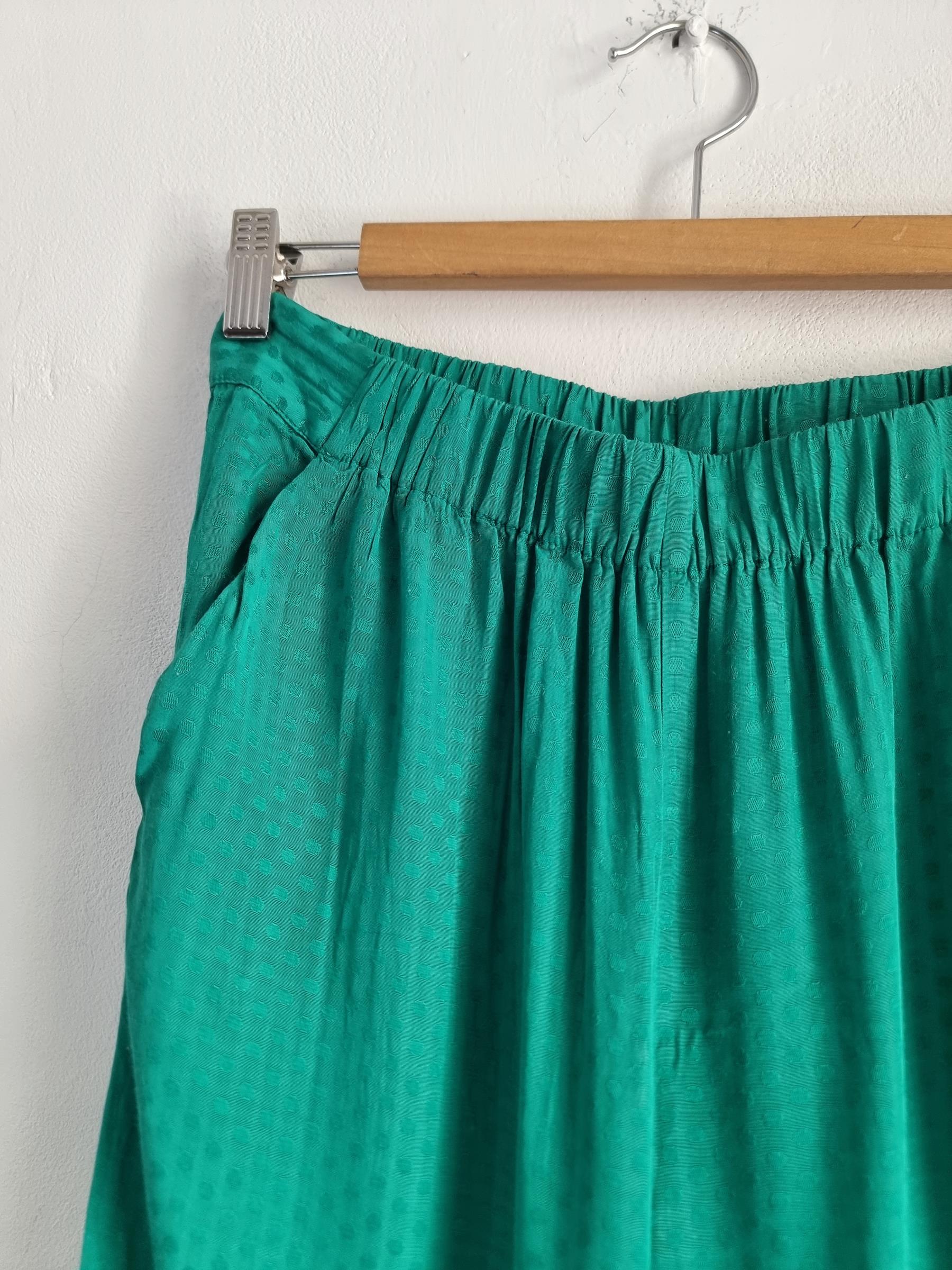 Zielone spodnie w kropki. Na gumce z kieszeniami po bokach. Wykonane z satynowej wiskozy.