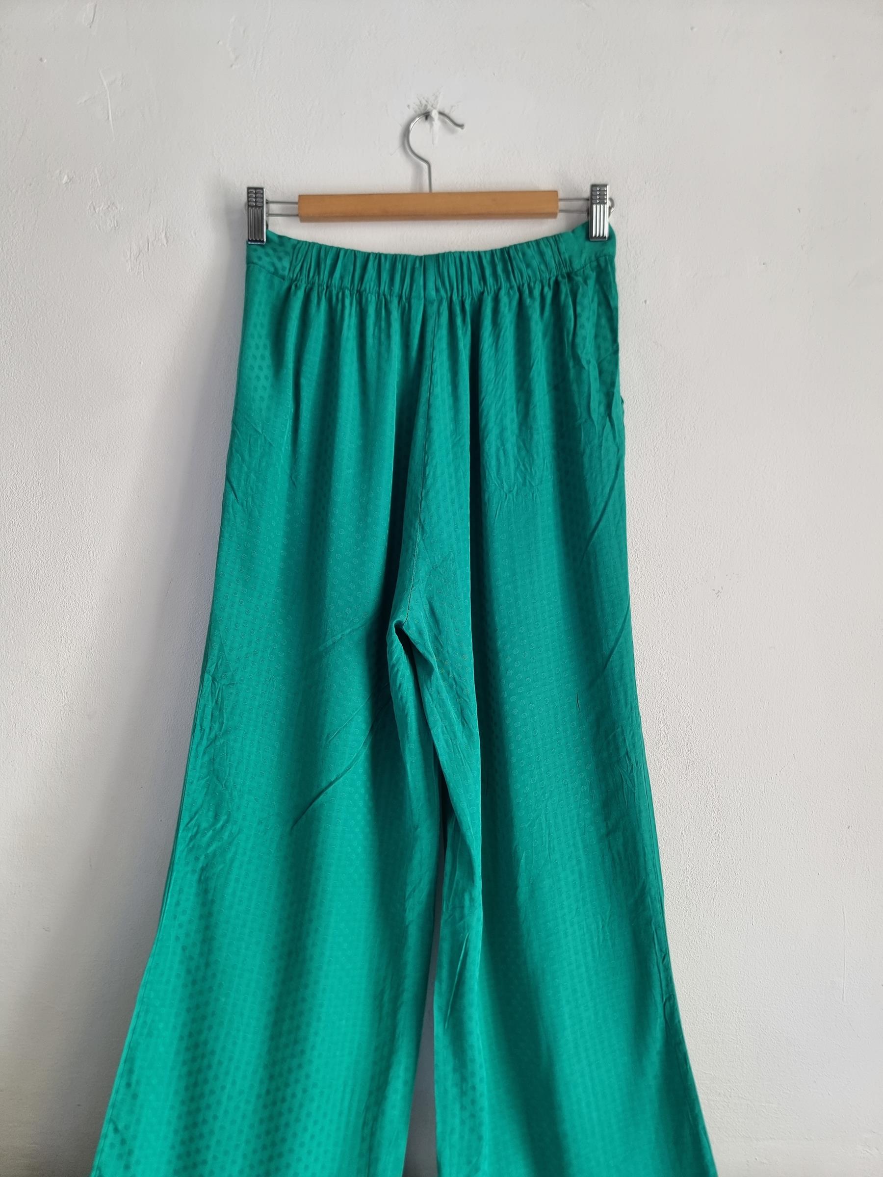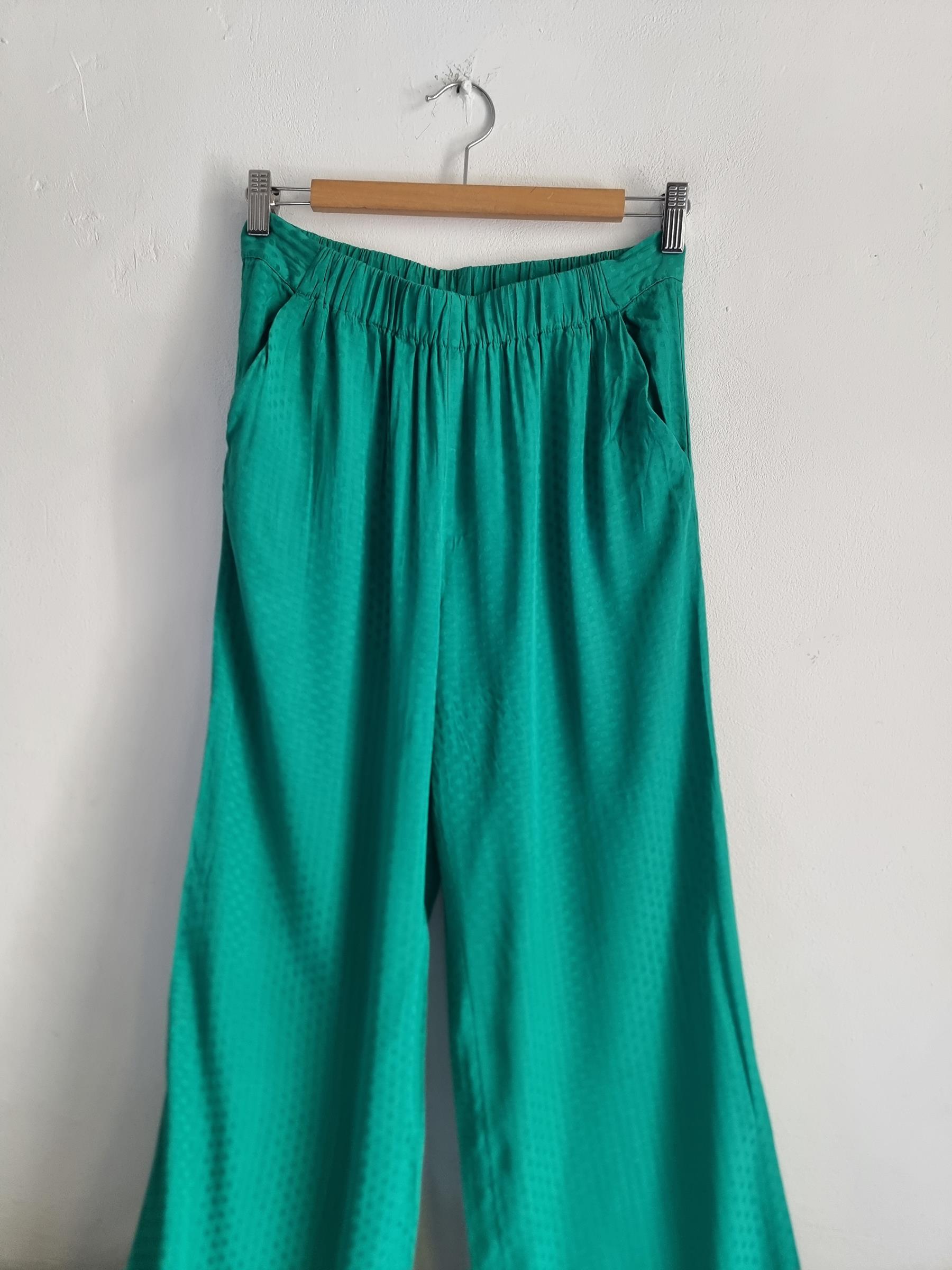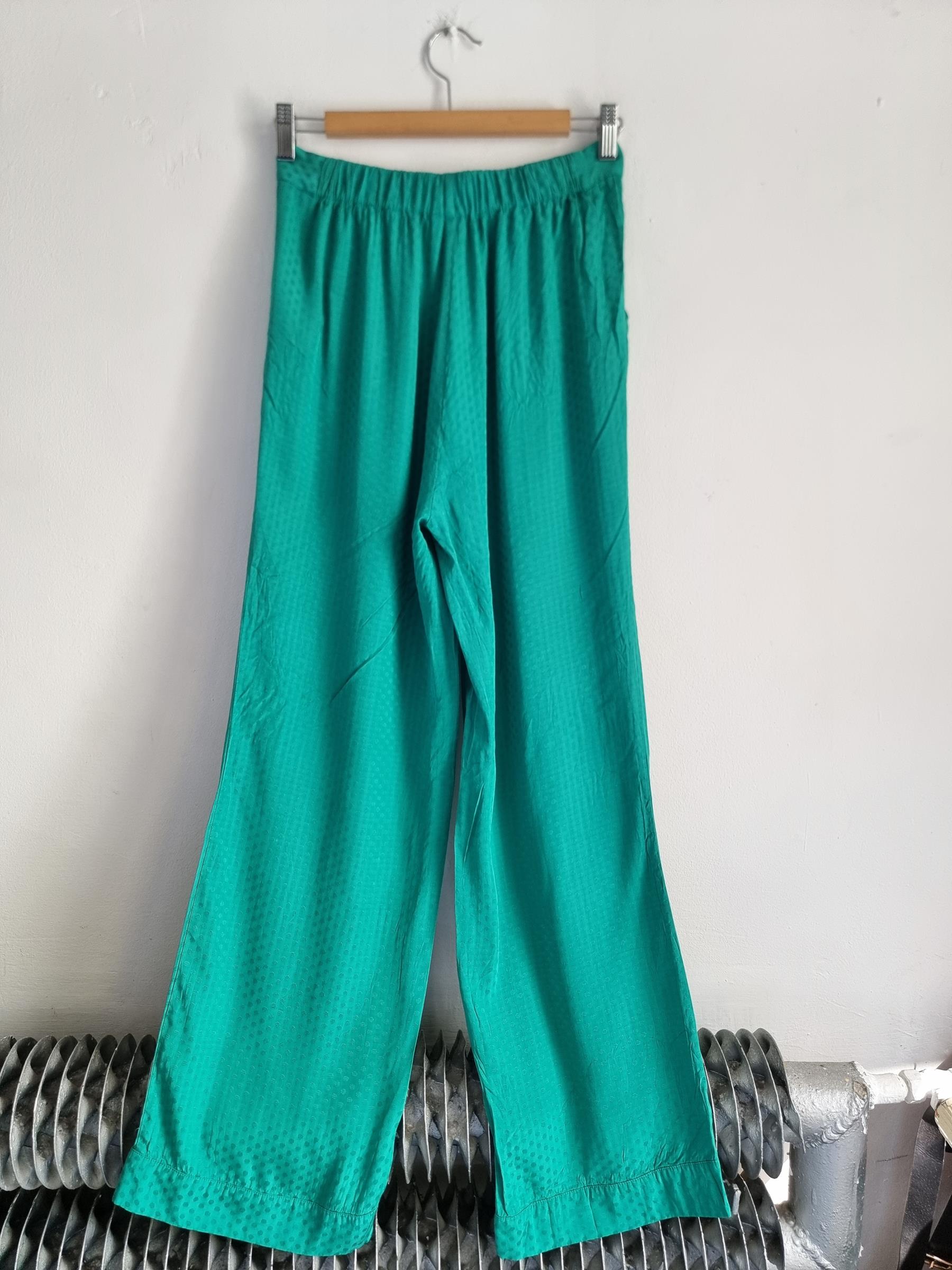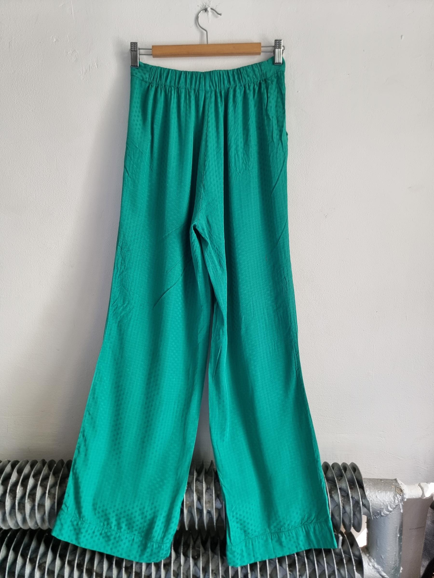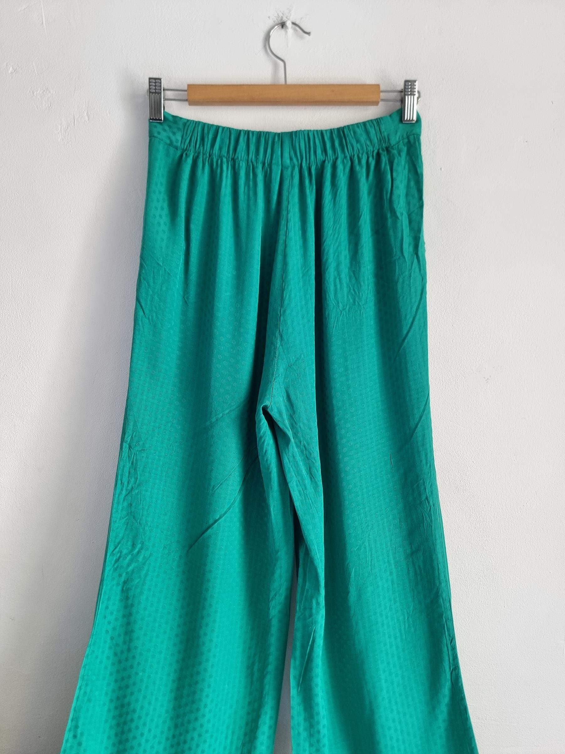 Zielone spodnie w kropki. Na gumce z kieszeniami po bokach. Wykonane z satynowej wiskozy.