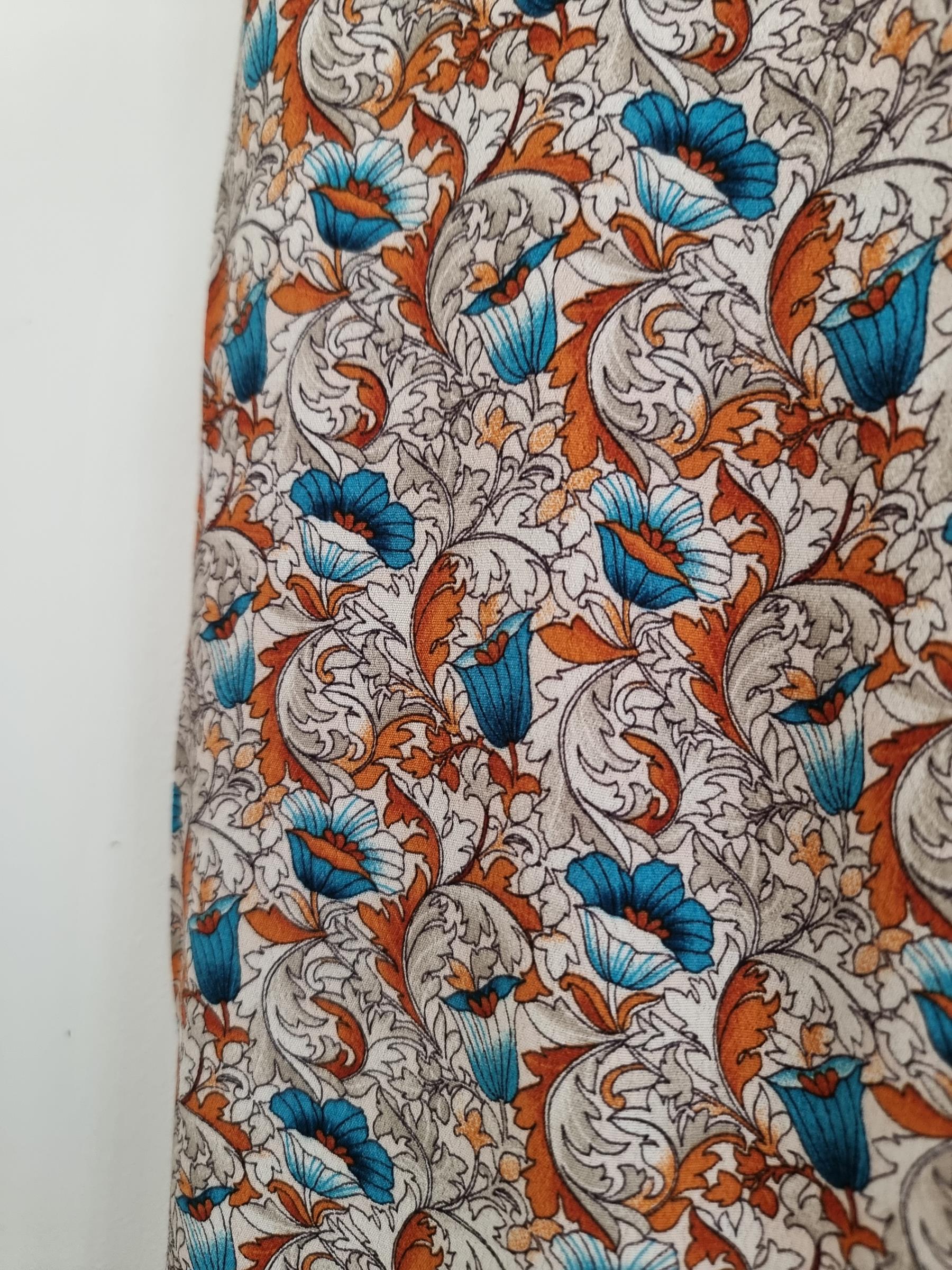 Letnie luźne wiskozowe spodnie od Rodebjer. Model Nala w pięknym wzorze – Flower. Są w kolorze beżowym, ale turkus przełamuje wzór. Gumka z tyłu w pasie i nogawki owijają się wokół bioder.