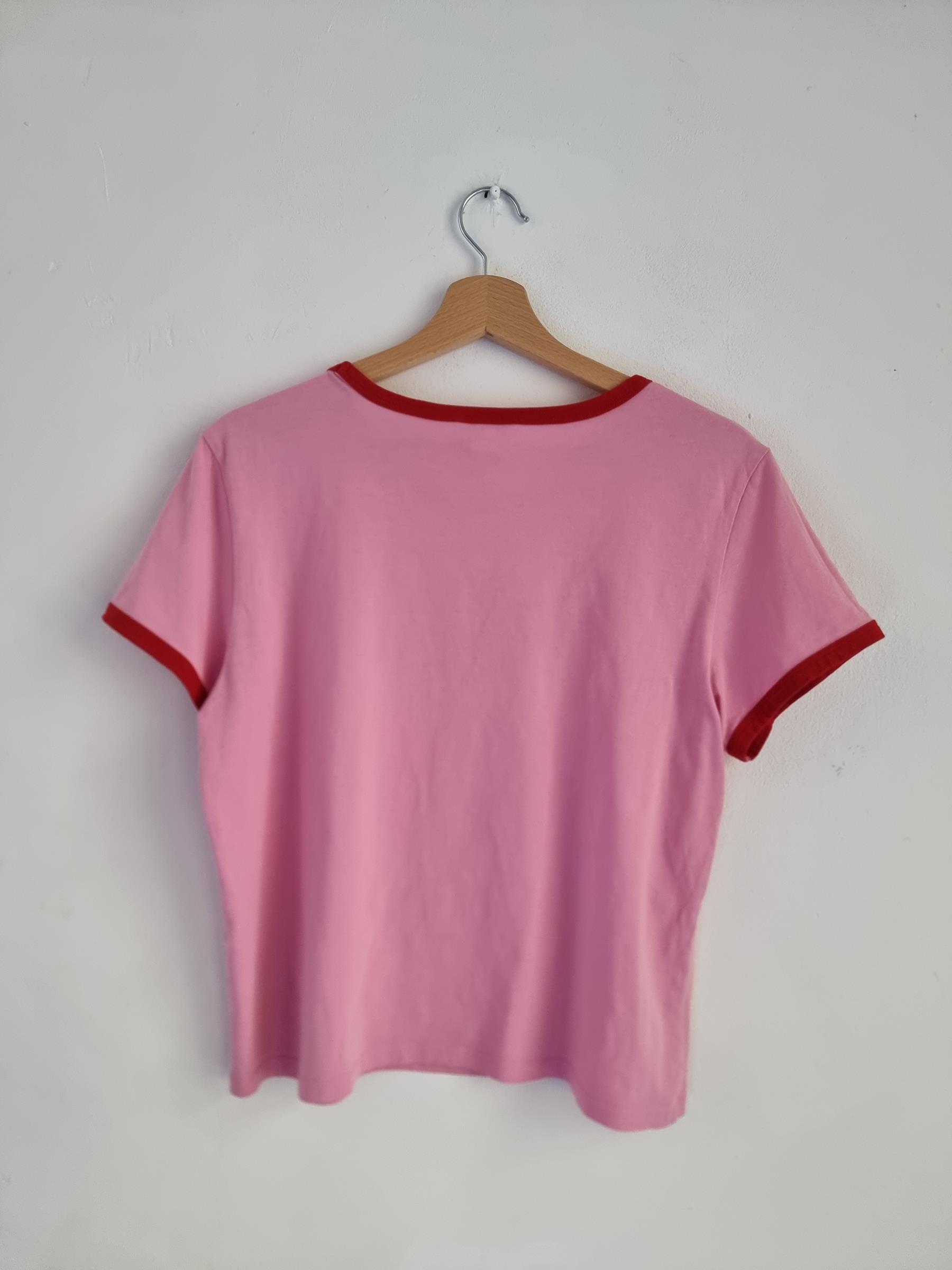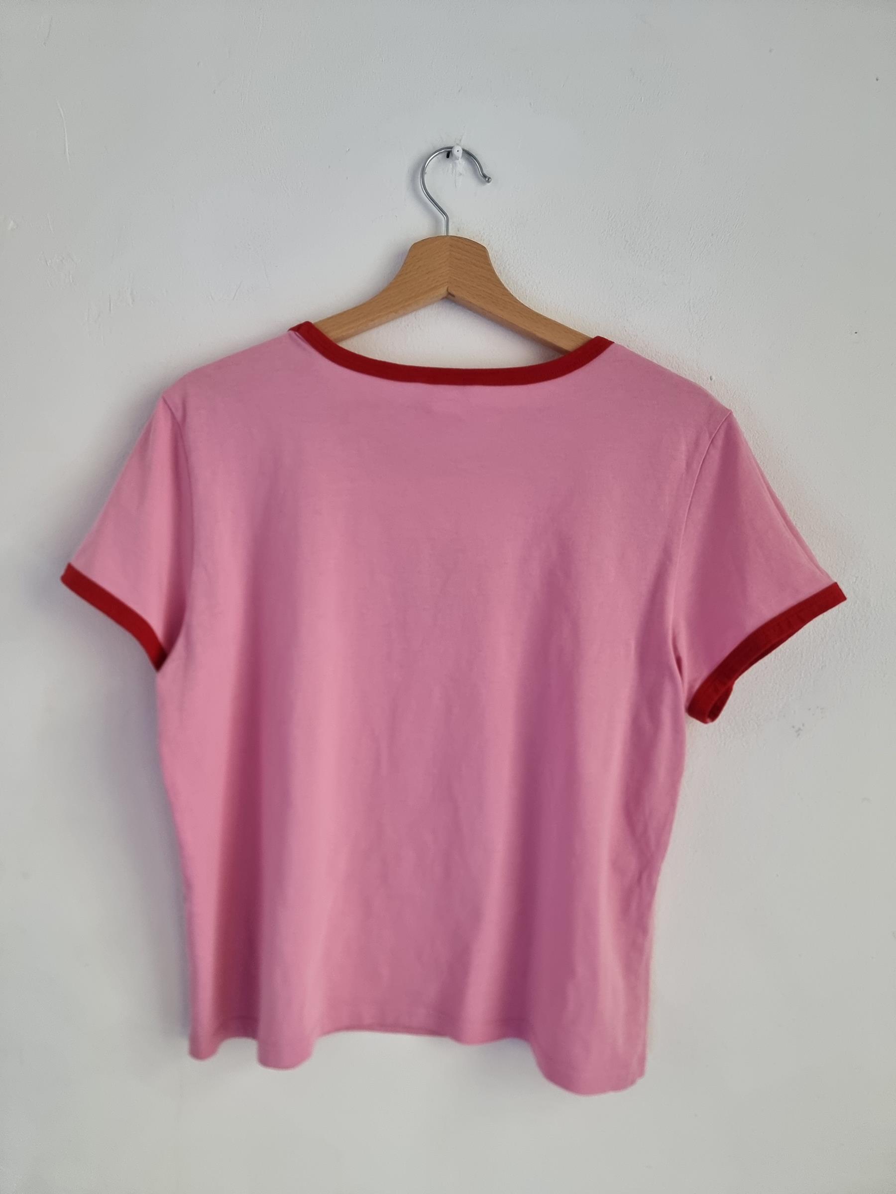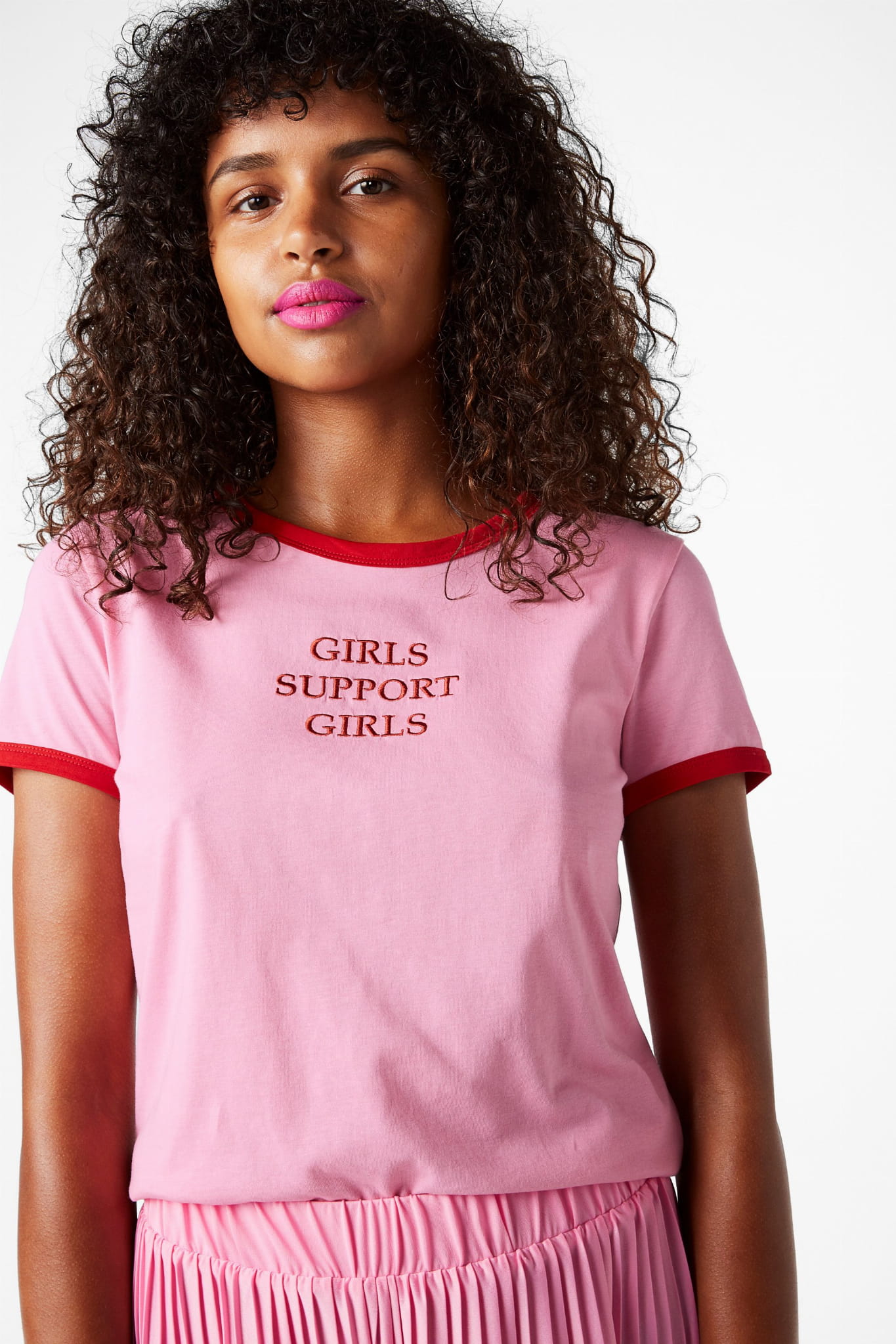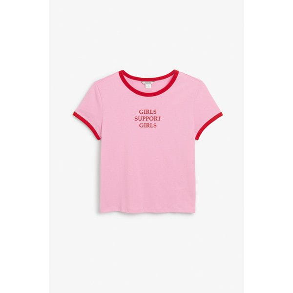 Bawełniany t-shirt różowy z czerwoną lamówką. Półokragły dekolt. Print girls support girls.