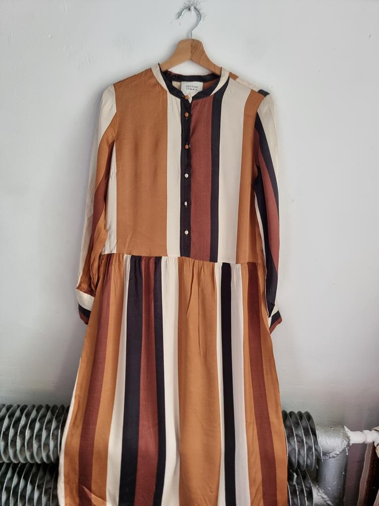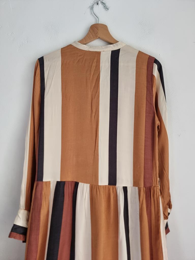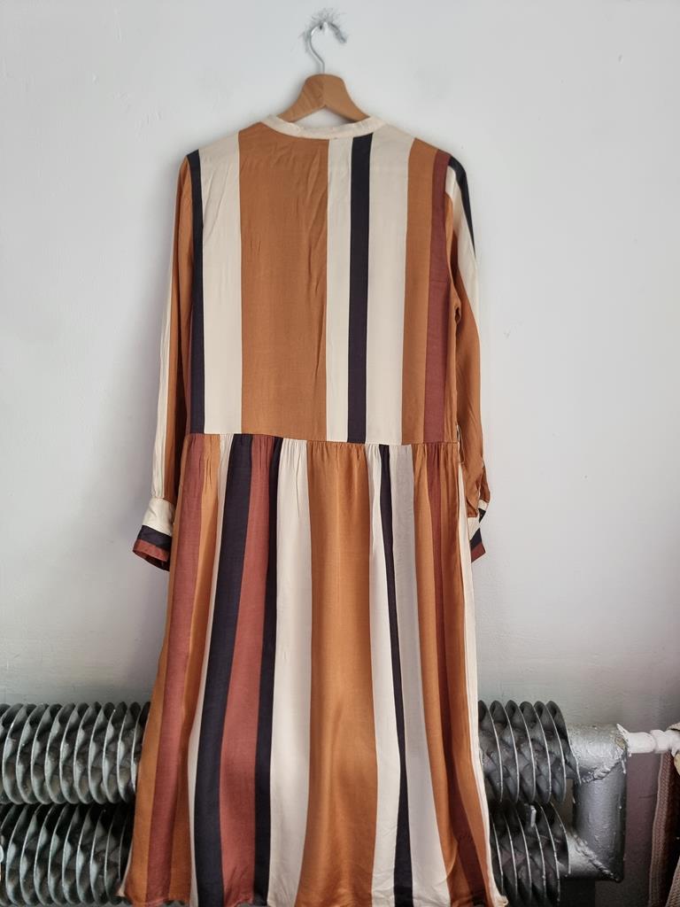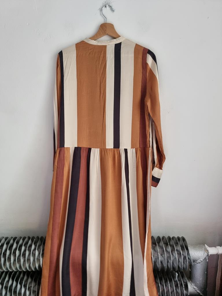 Sukienka w paski w odcieniach brązu, beżu i czerni wykonana z satynowej wiskozy. Długi rękaw, zapinana na guziki w górnej części.