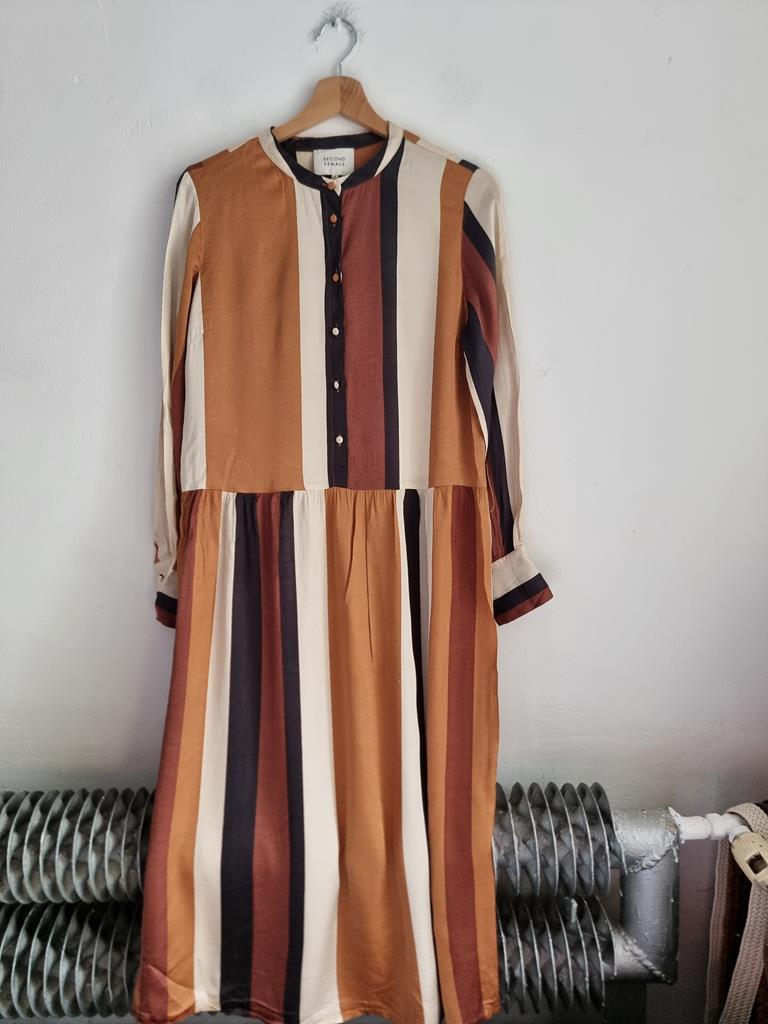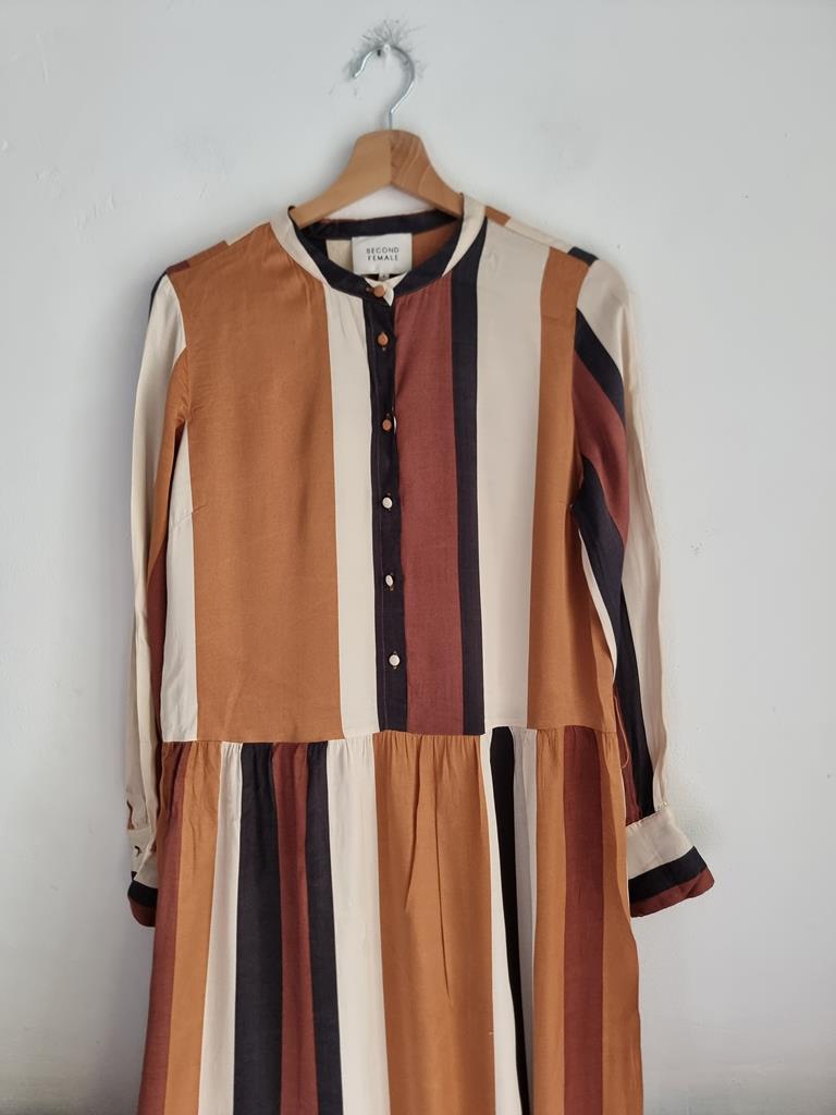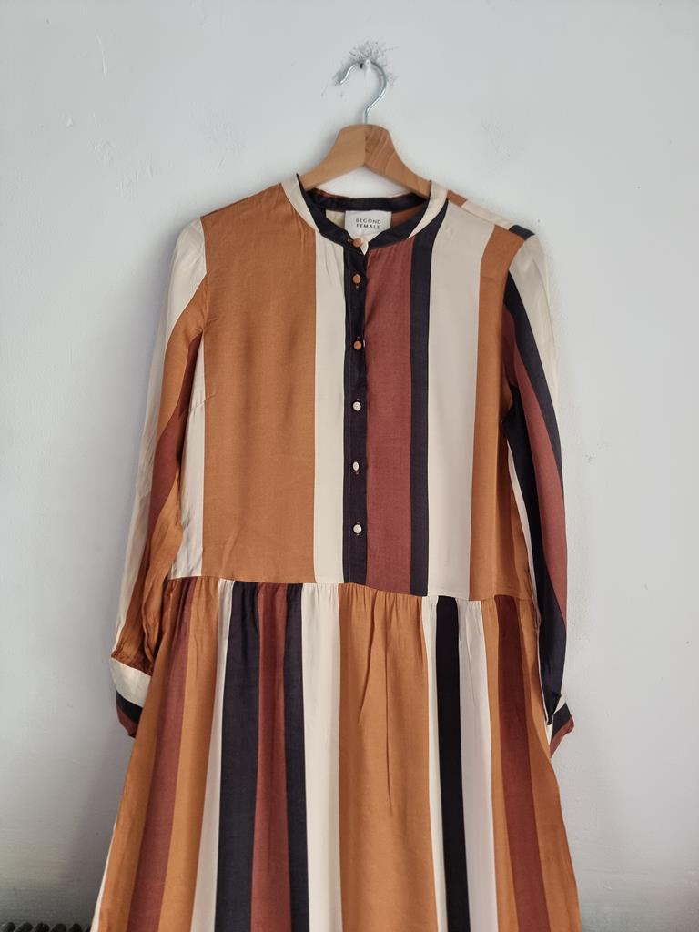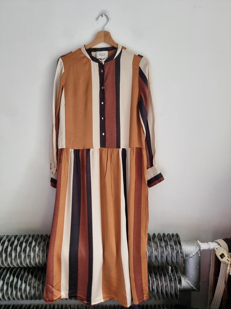 Sukienka w paski w odcieniach brązu, beżu i czerni wykonana z satynowej wiskozy. Długi rękaw, zapinana na guziki w górnej części.