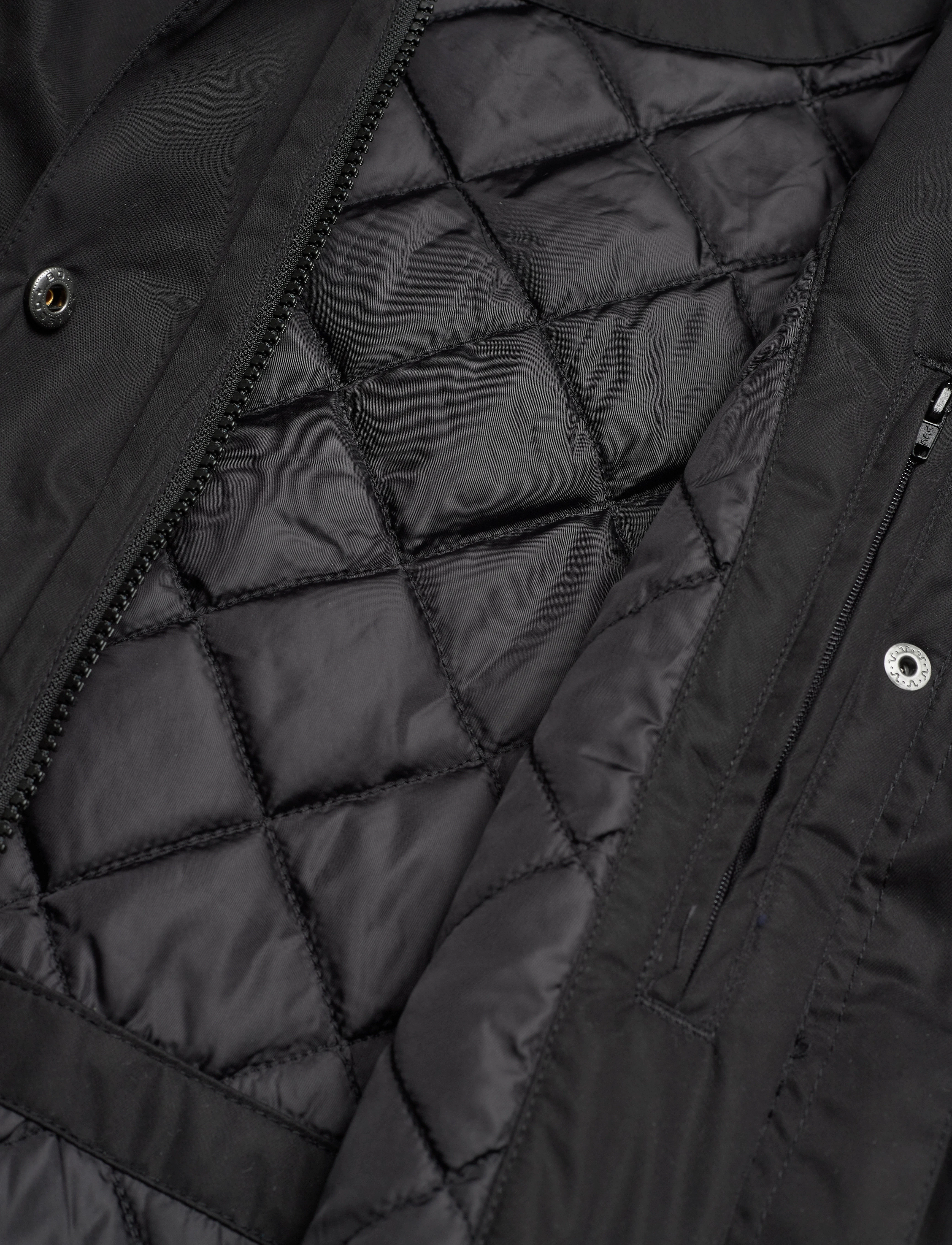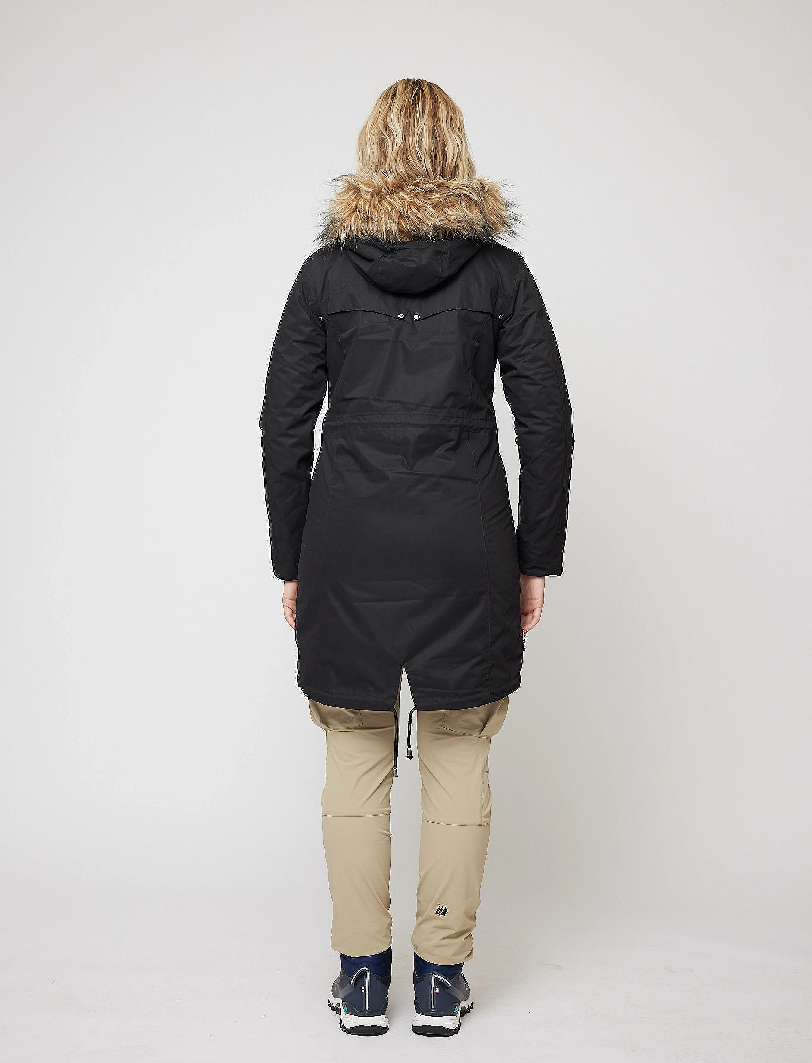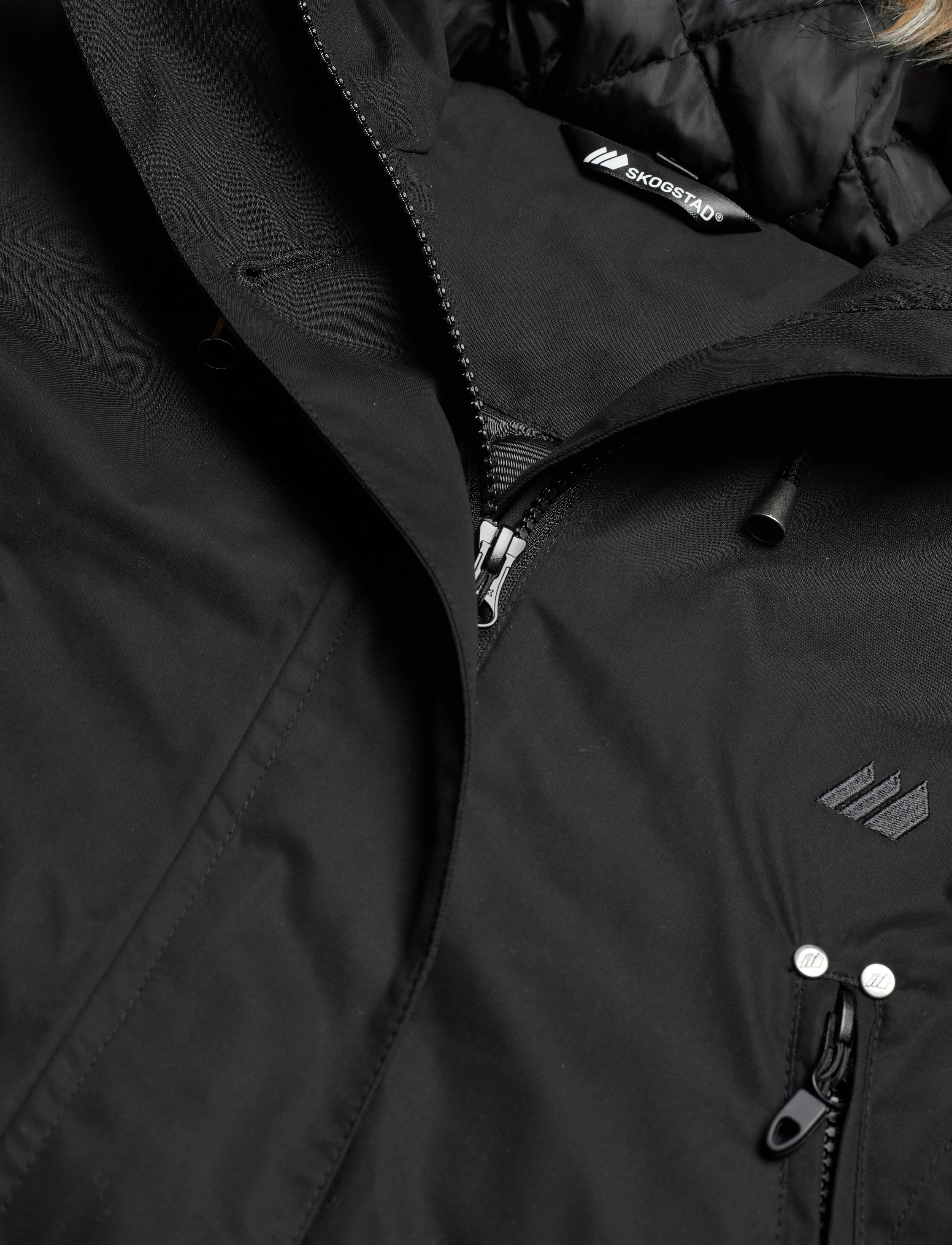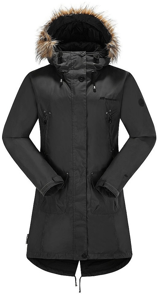 antracytowy sportowy zimowy płaszcz marki Skogstad. Płaszcz z kapturem o długości do połowy uda. Cena sklepowa 919 zł