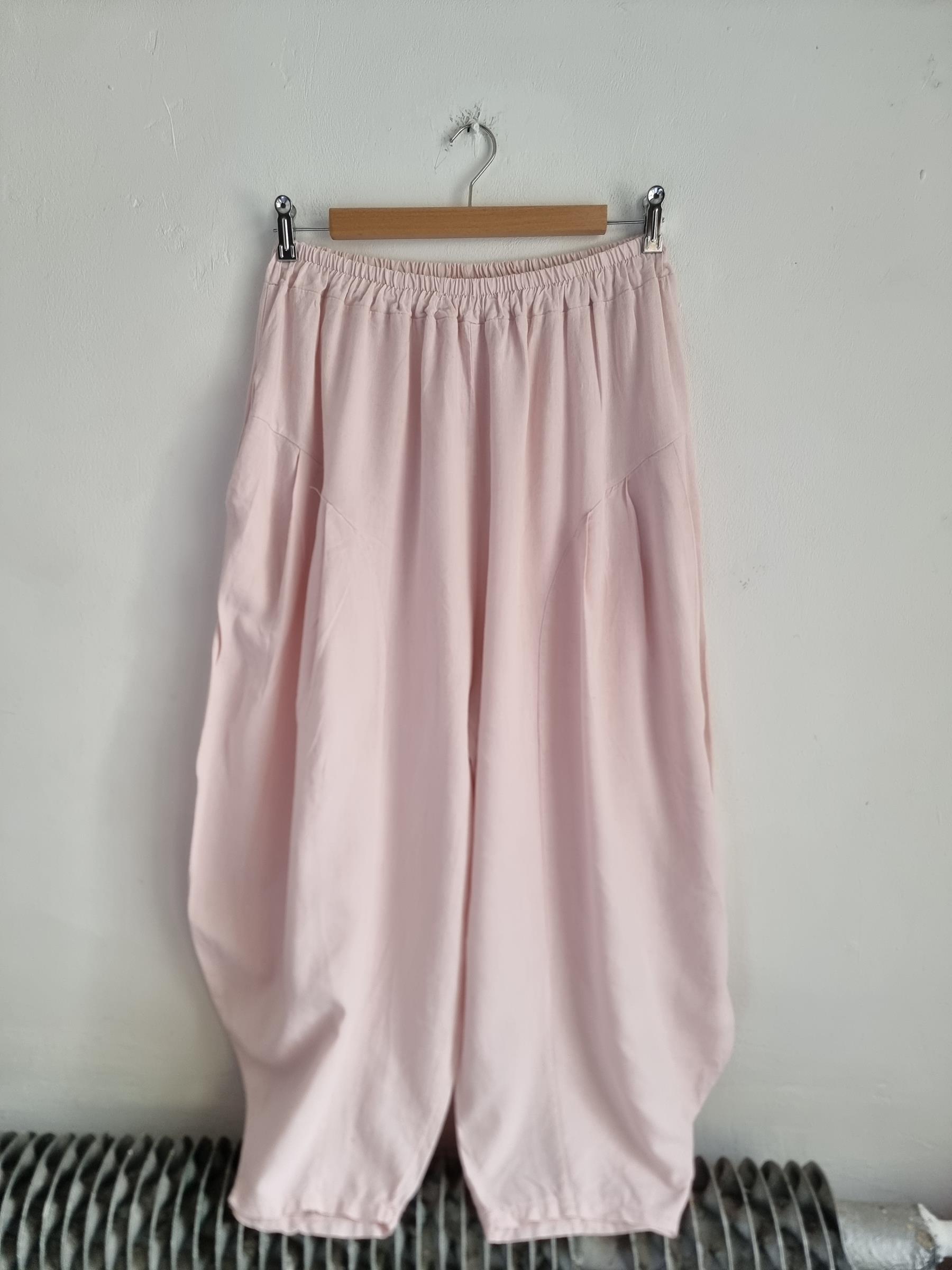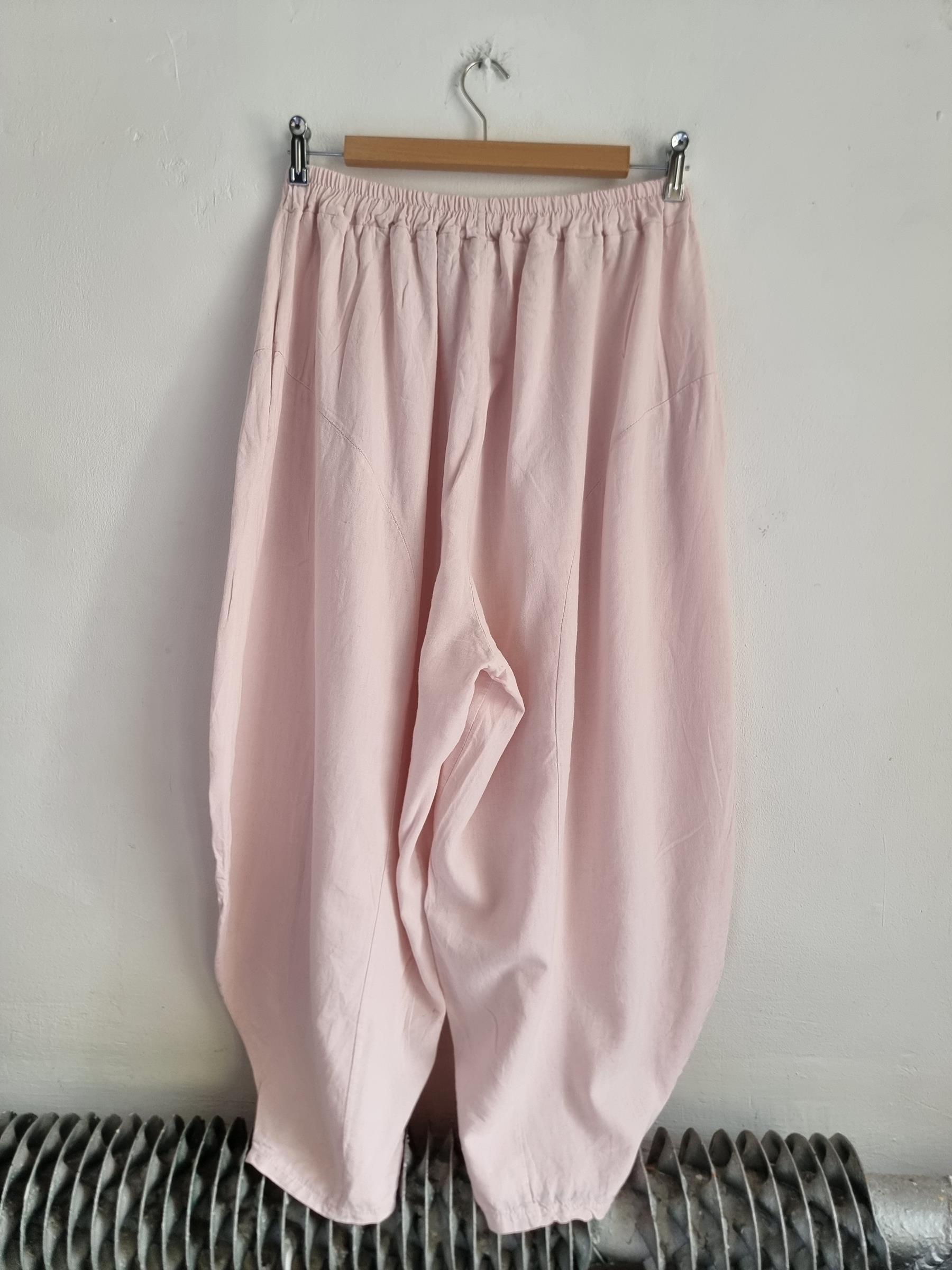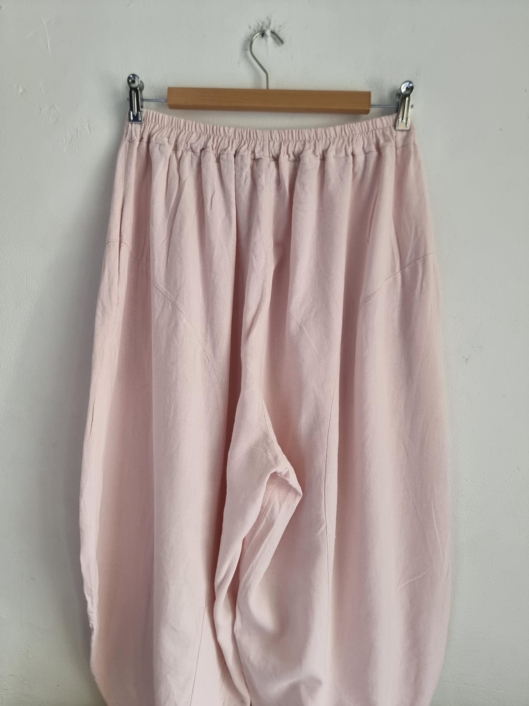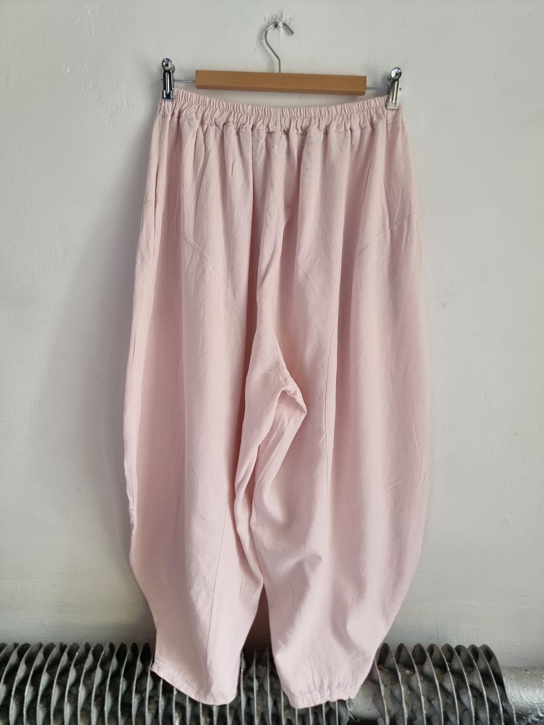 Spodnie baggy pudrowy róż lniane włoskie niski krok M / L