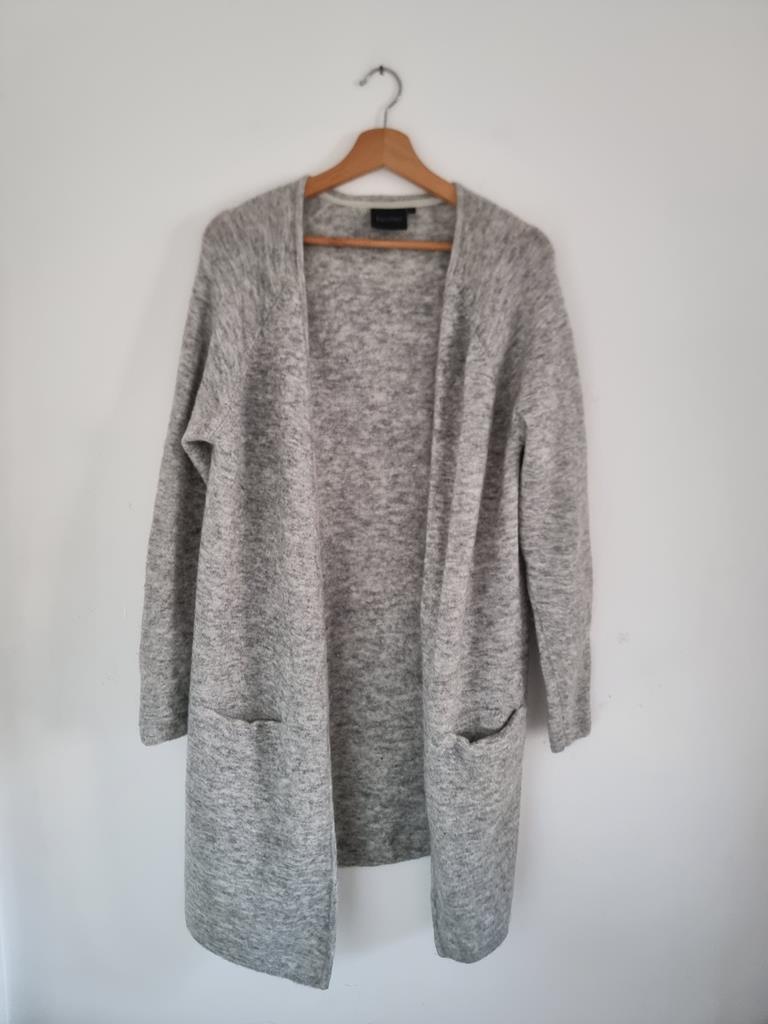 Długi otwarty sweter /narzutka marki Gestuz. Posiada dwie kieszenie po bokach.