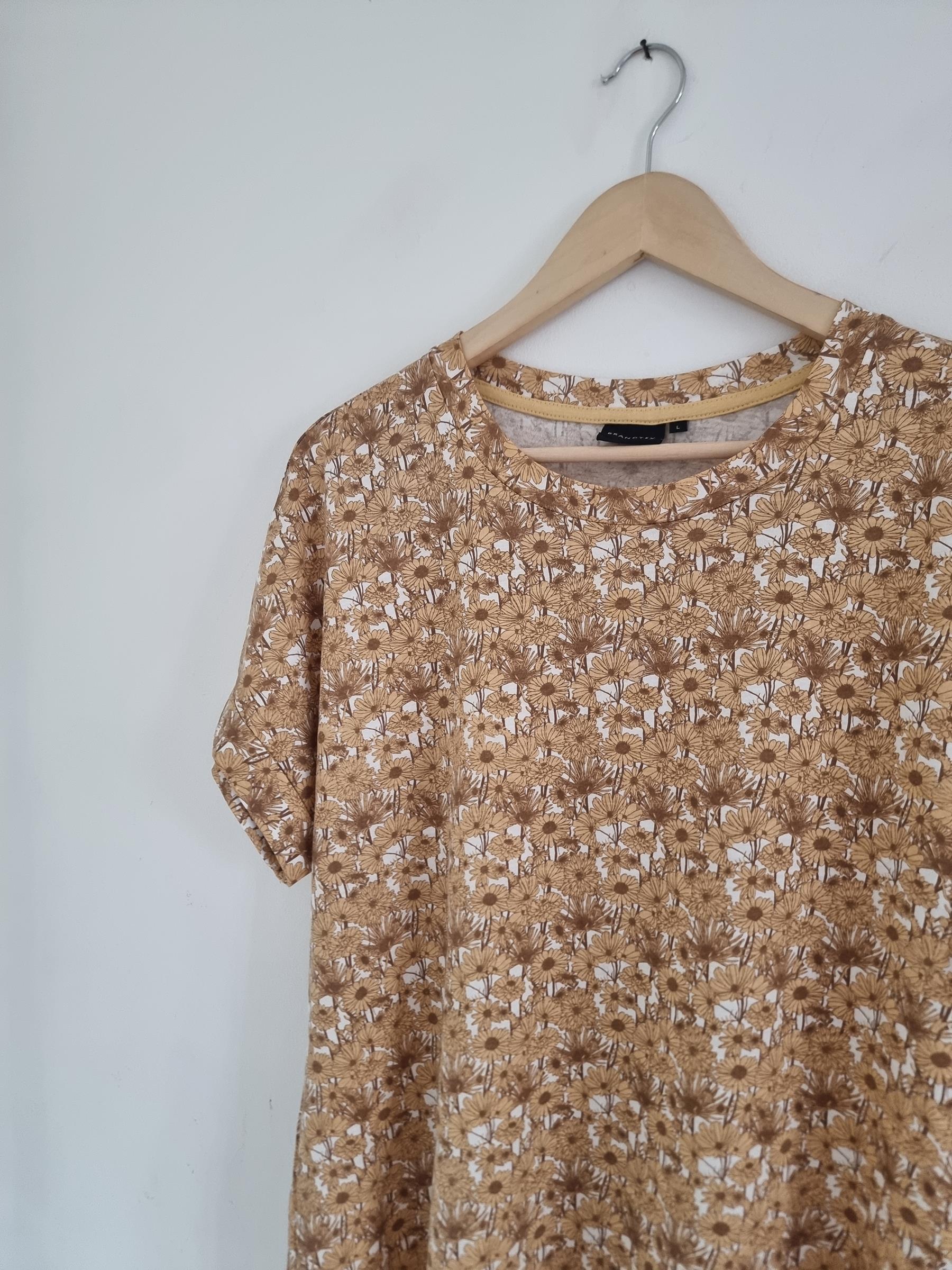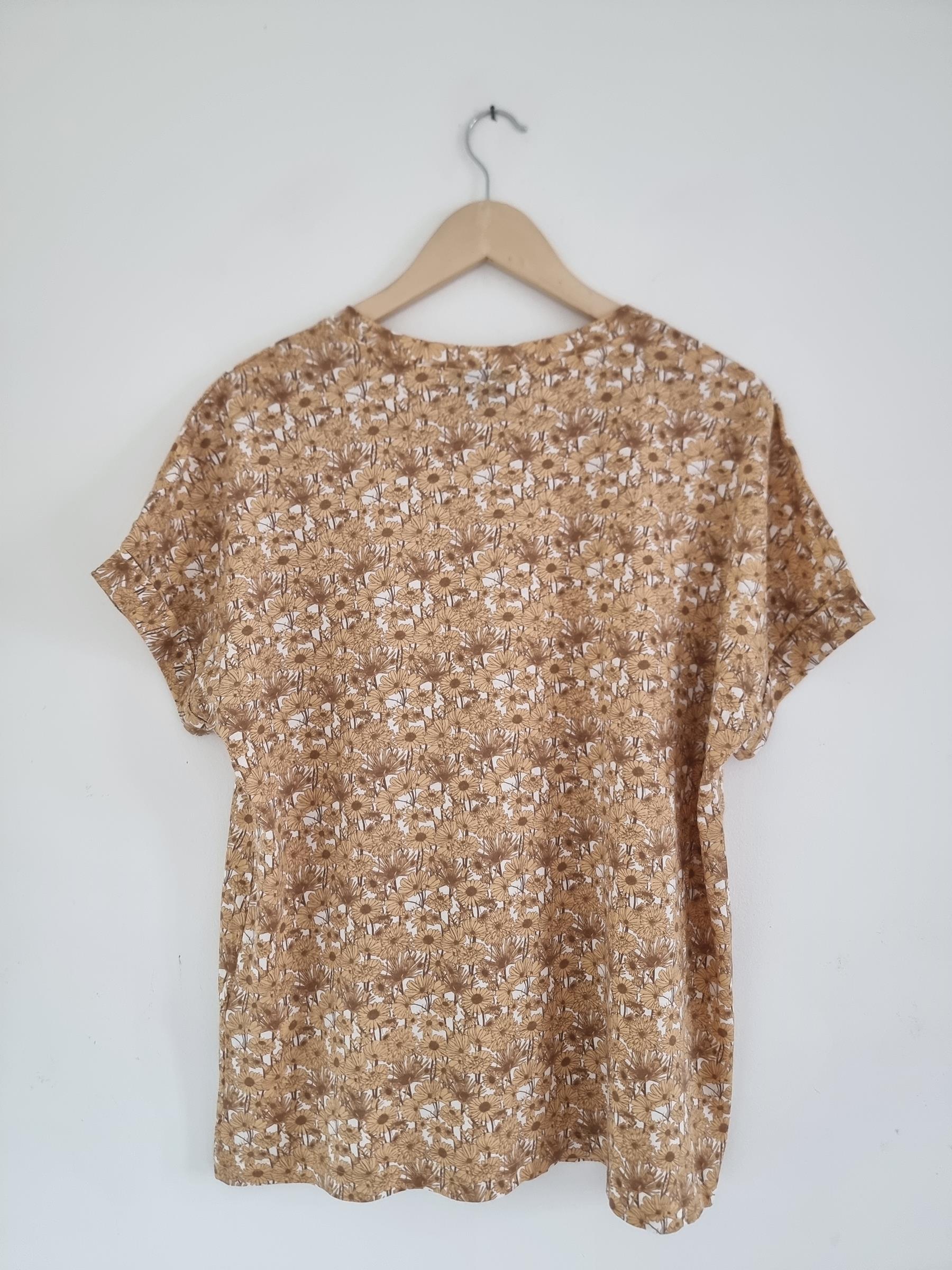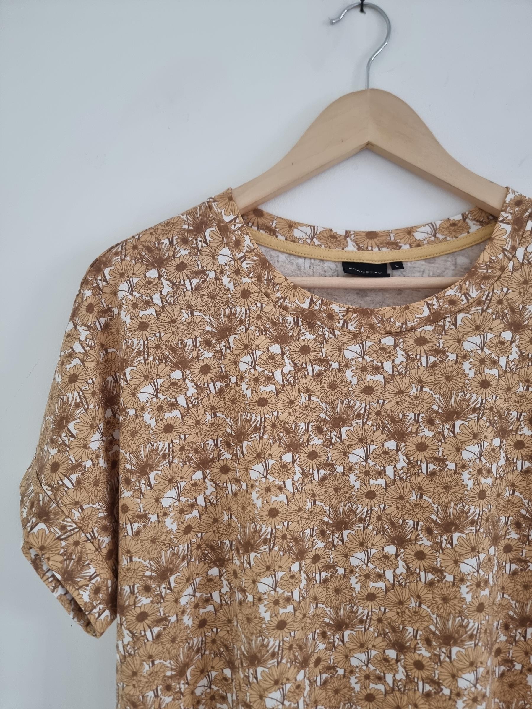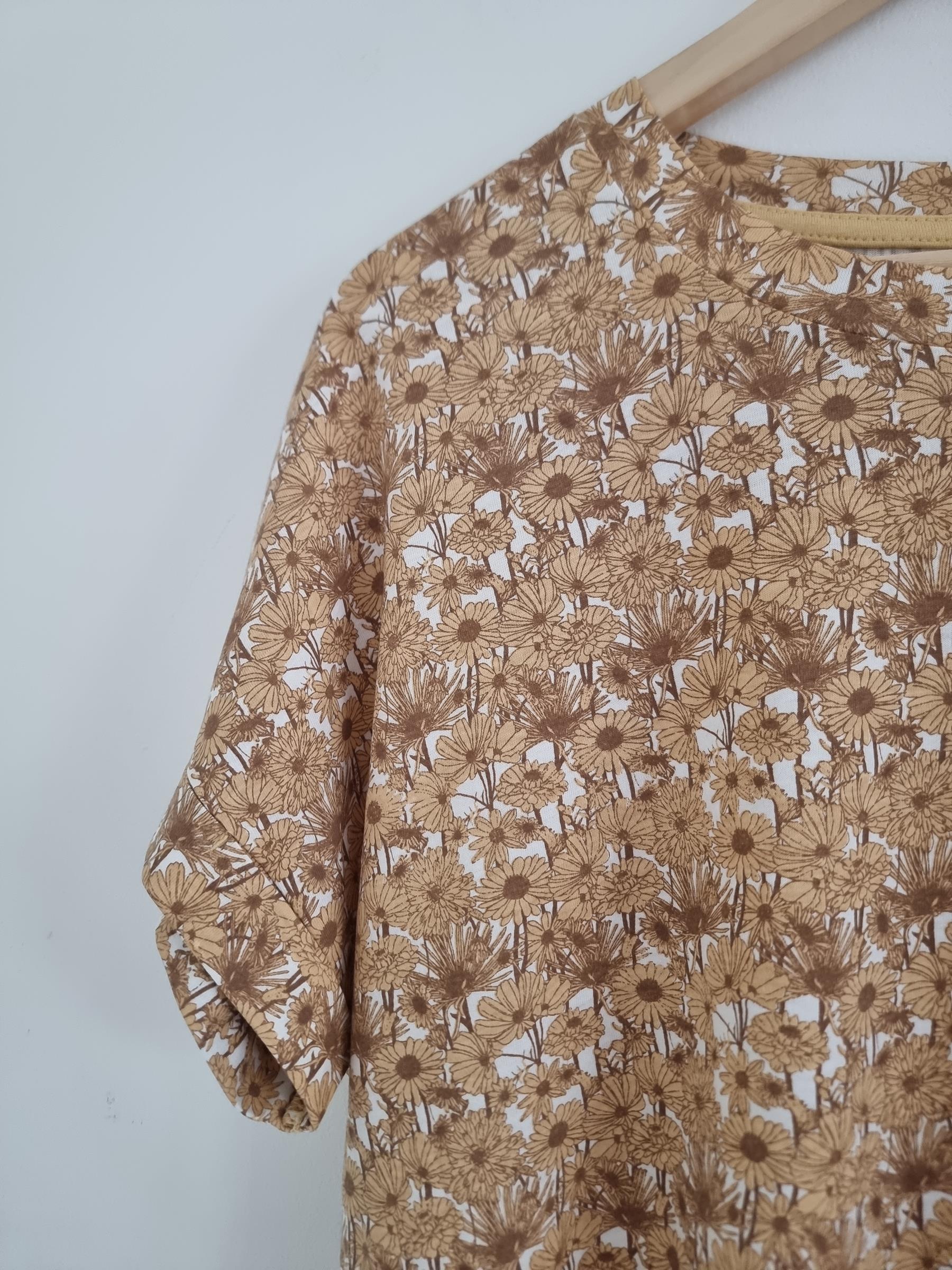 Bluzka z krótkim rękawem motyw kwiatowy. Odcienie bieli, żółtego i jasnego brązu.