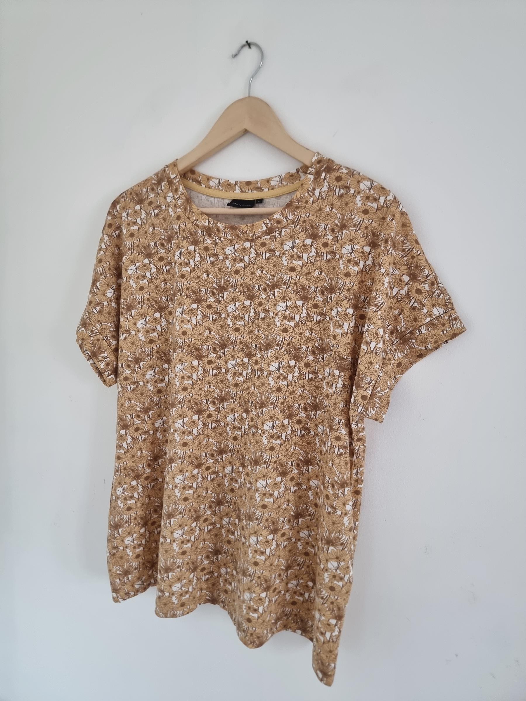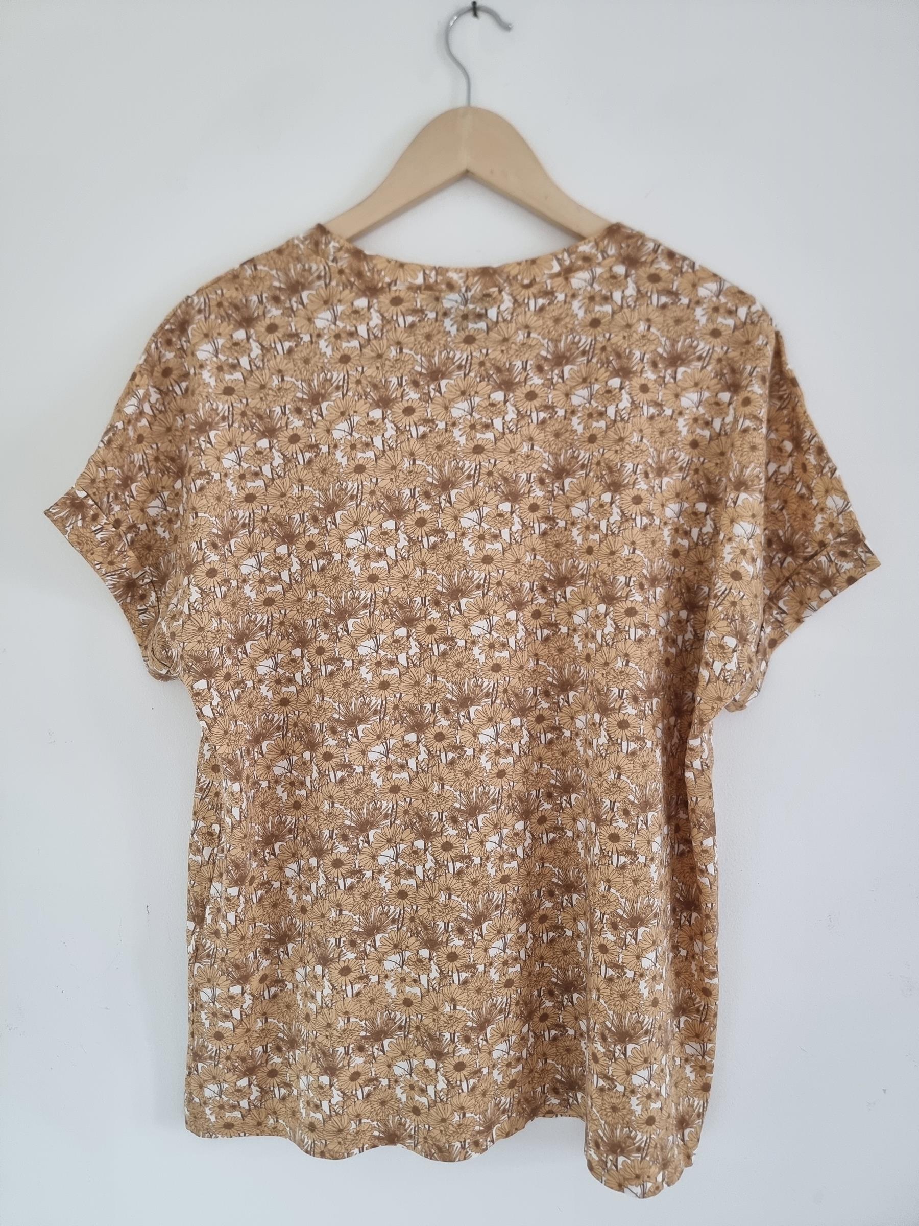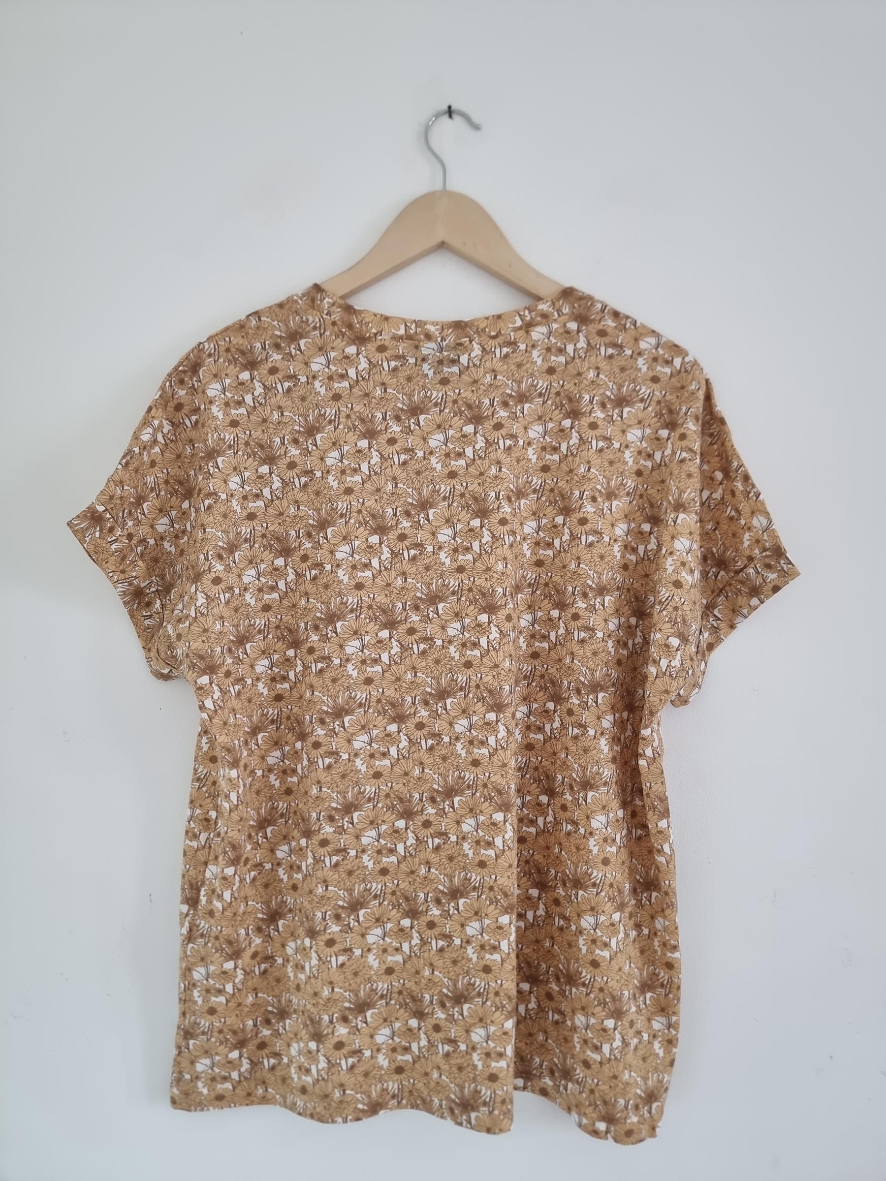 Bluzka z krótkim rękawem motyw kwiatowy. Odcienie bieli, żółtego i jasnego brązu.