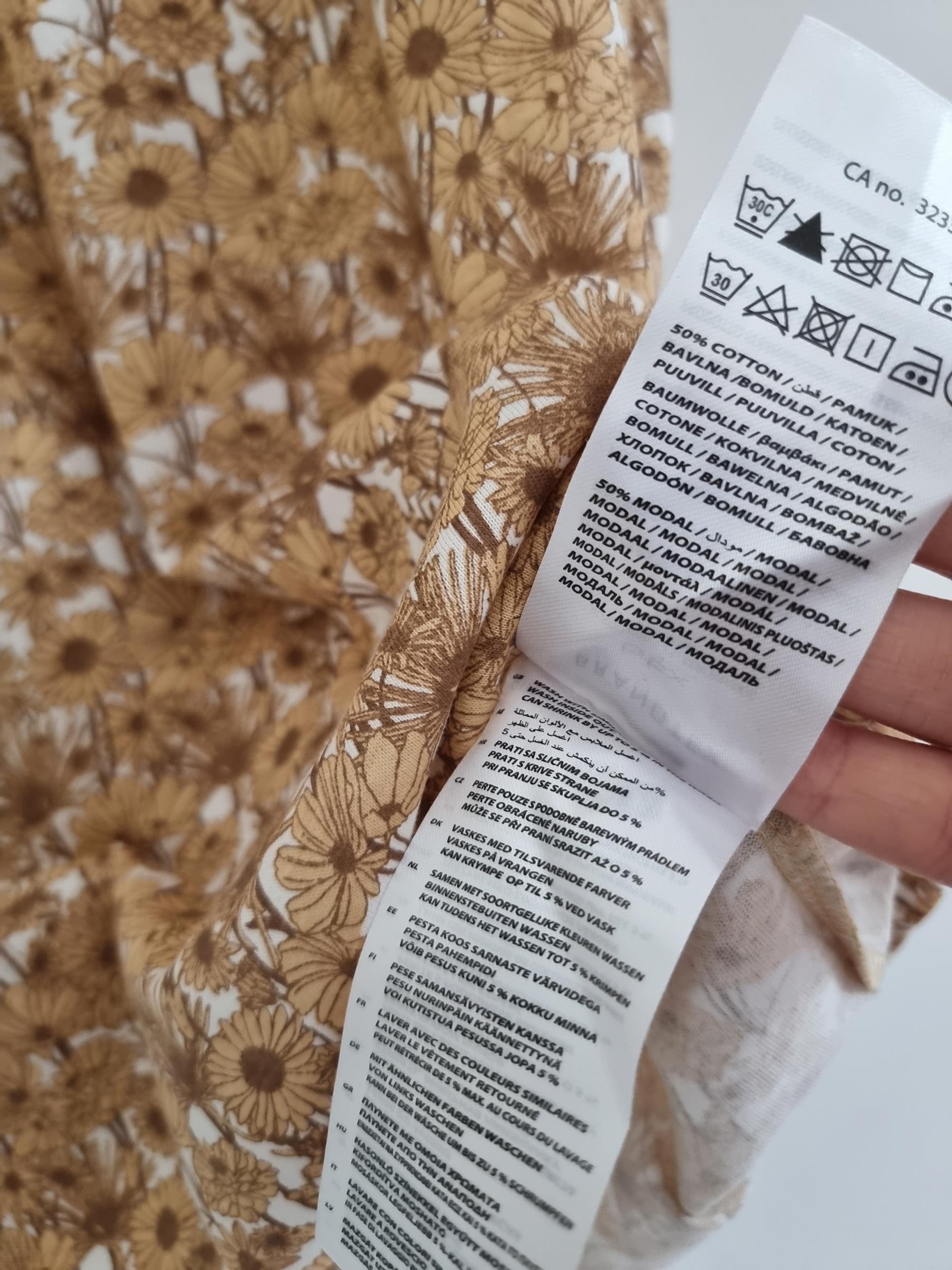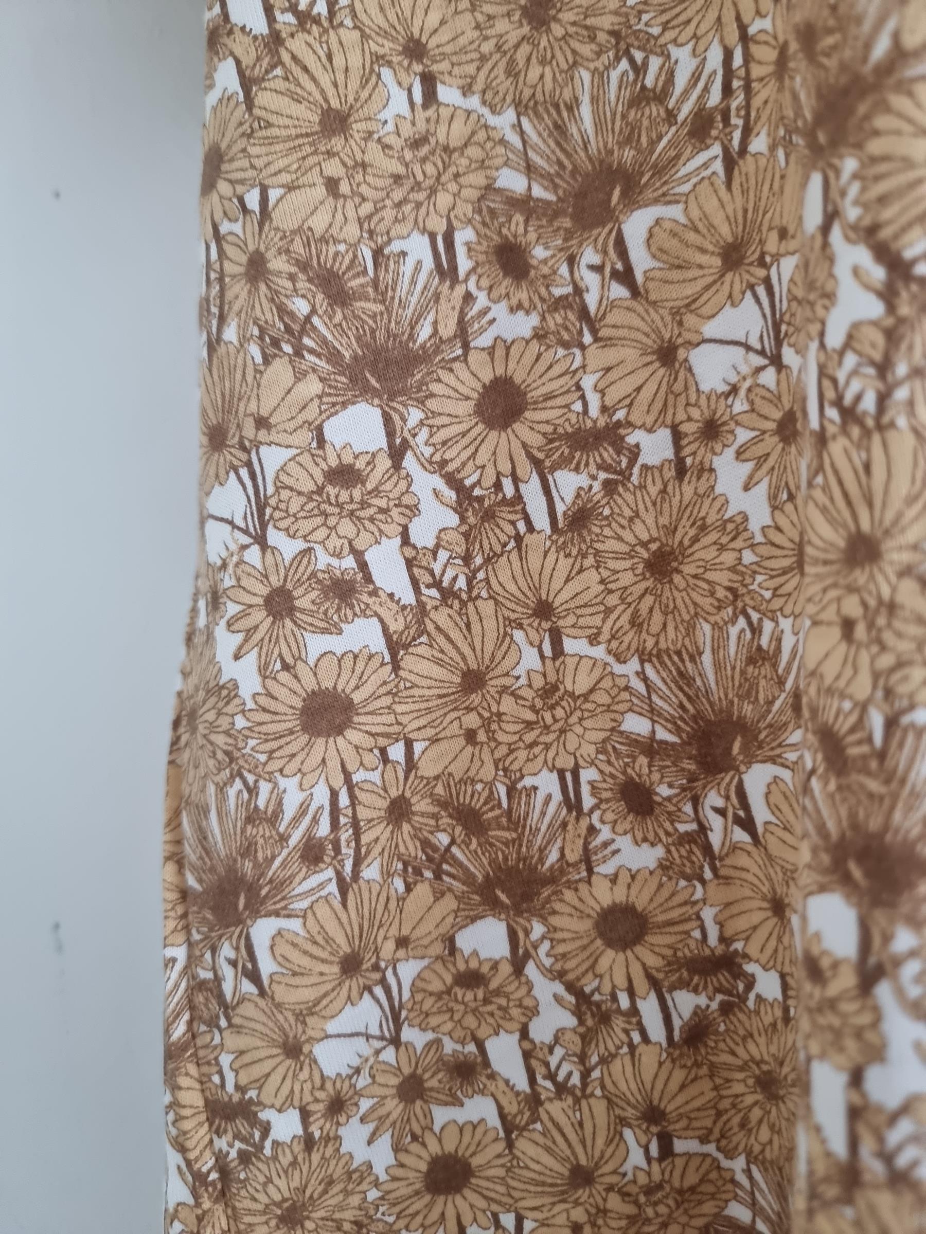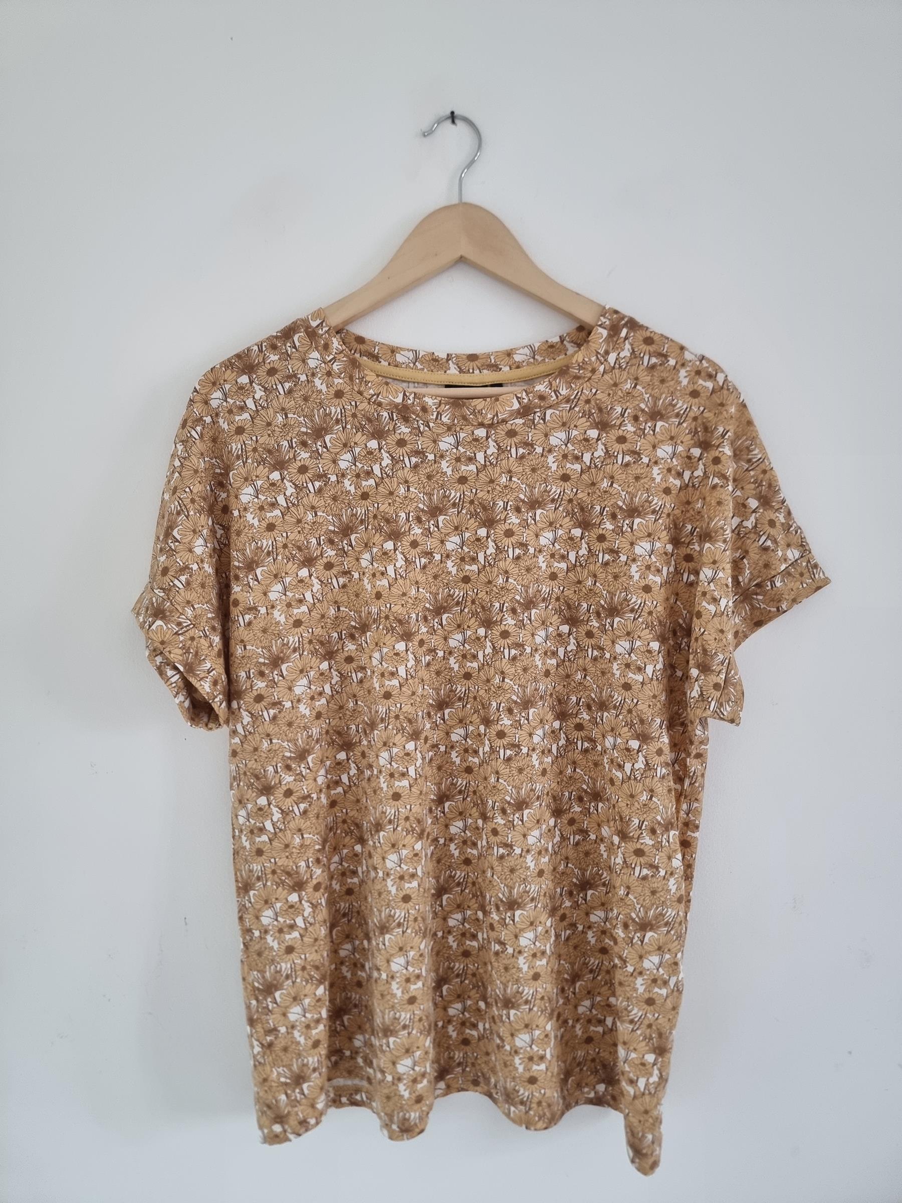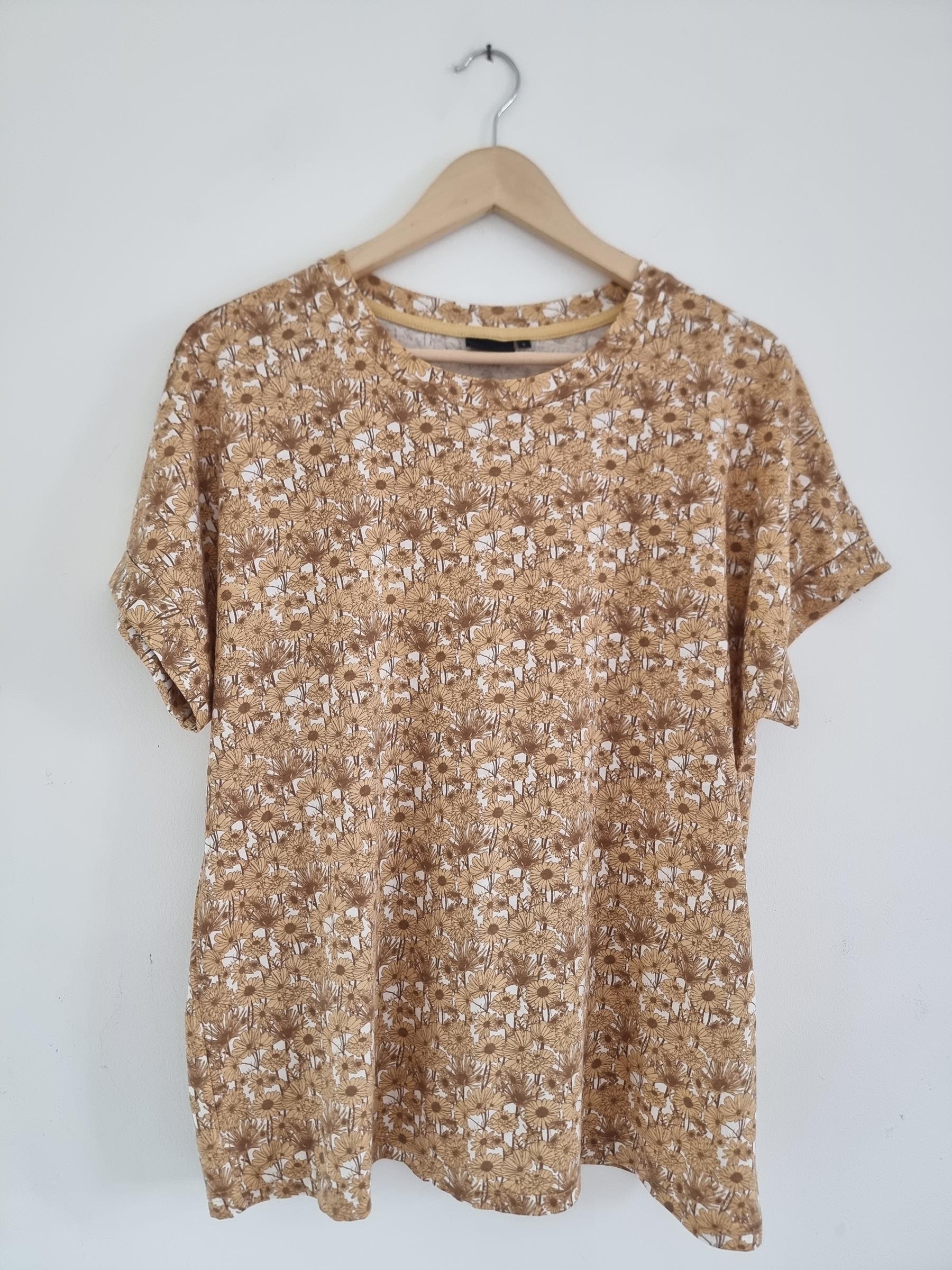Bluzka z krótkim rękawem motyw kwiatowy. Odcienie bieli, żółtego i jasnego brązu.