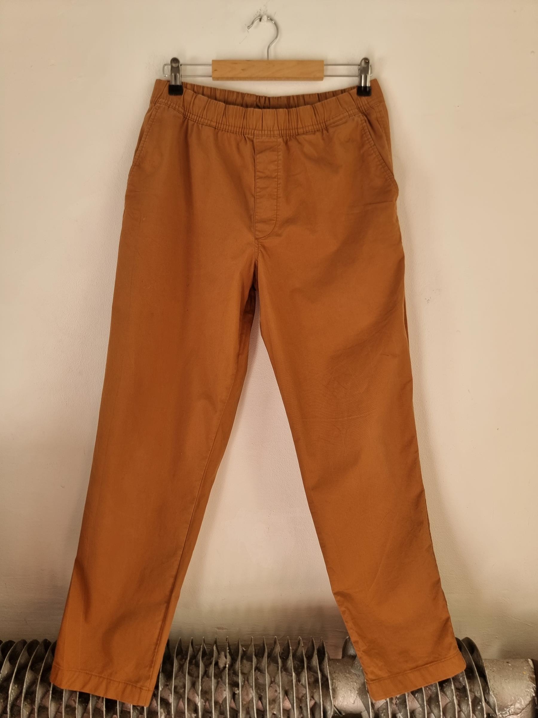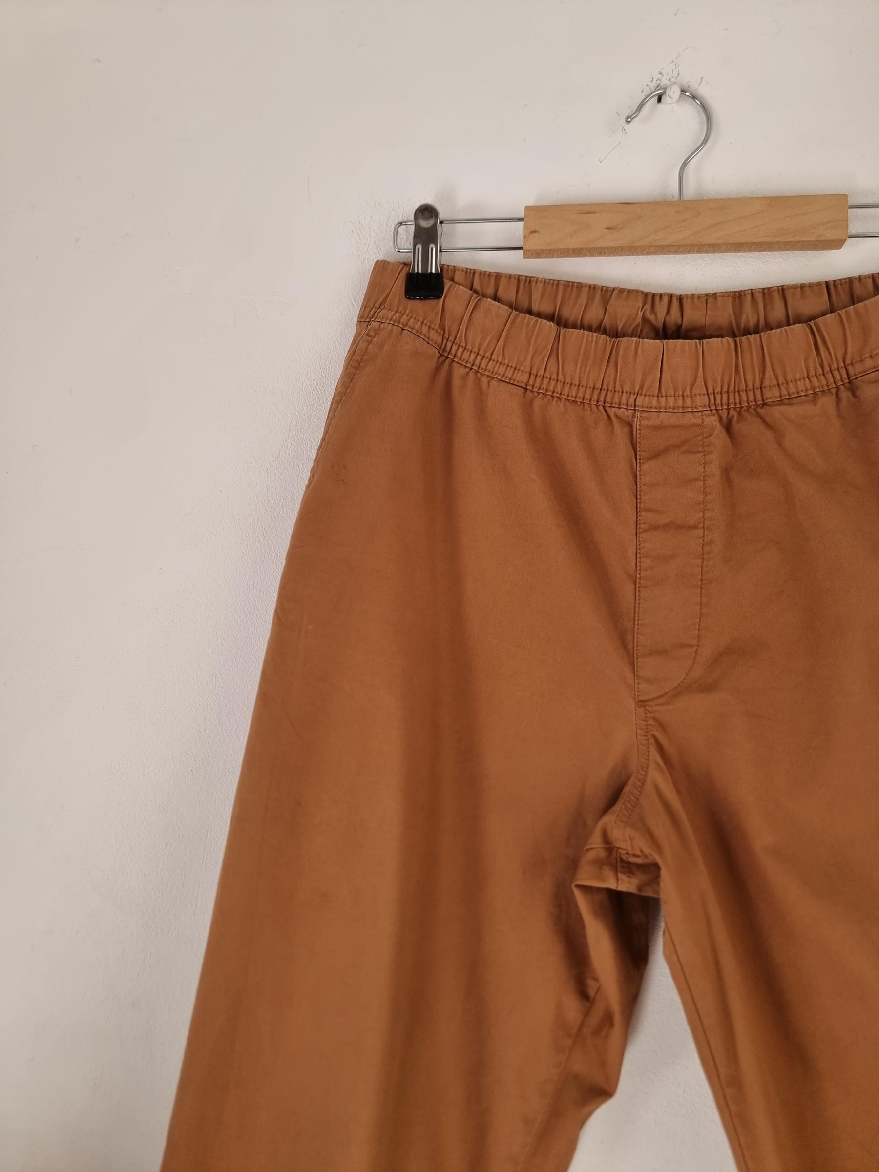 Wygodna para bawełnianych spodni na gumce marki Uniqlo w kolorze jasnego brązu.
